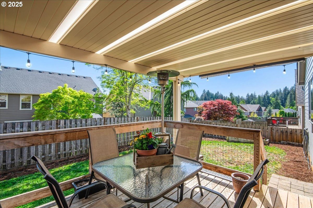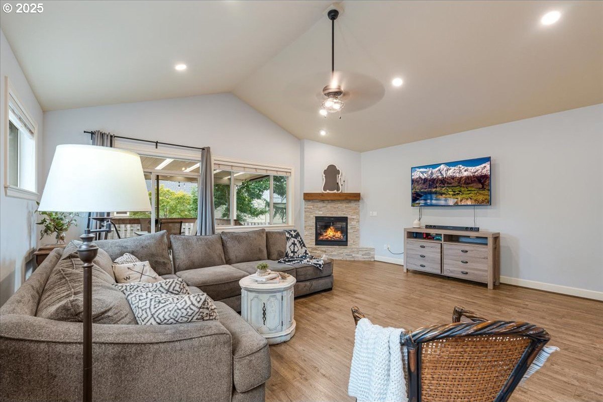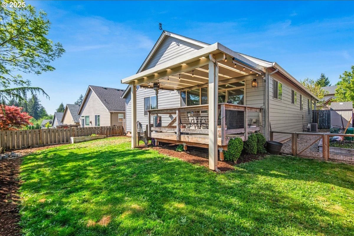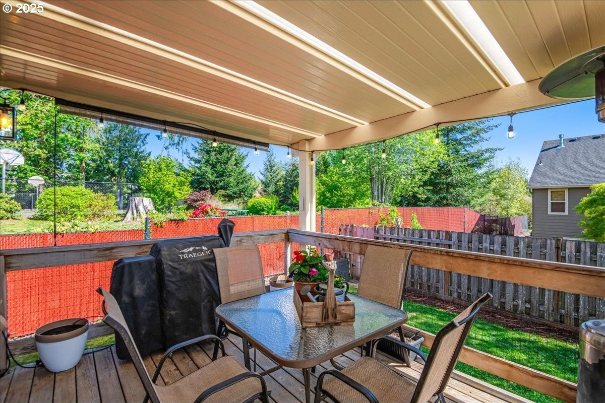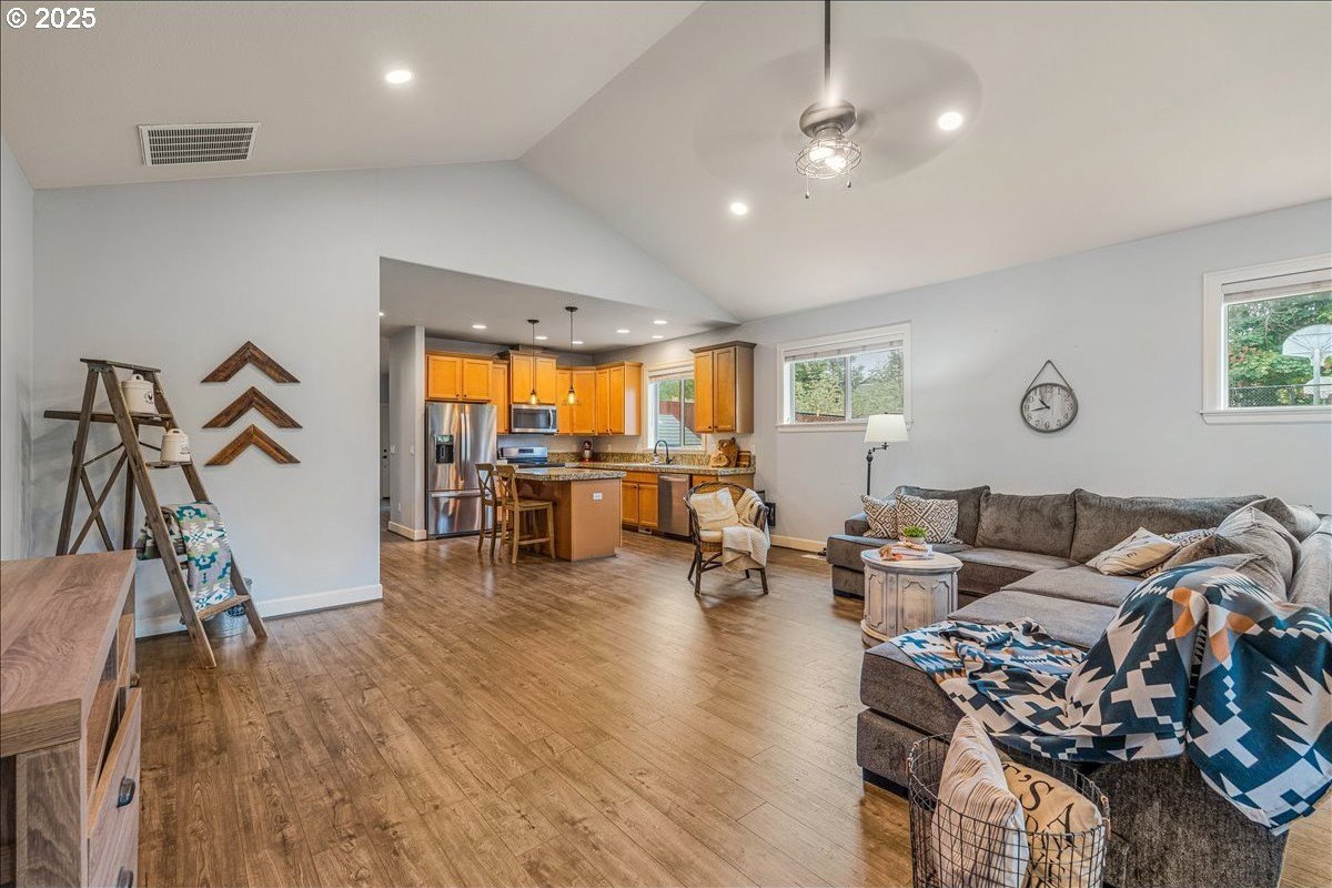 Beautiful single-story home offering 4 bedrooms, 2.5 bathrooms, and 9-foot ceilings throughout, with a vaulted living room that enhances the spacious feel. The open-concept kitchen features granite countertops, a large island, gas appliances, and a built-in pantry—ideal for cooking and entertaining. The adjoining living area includes a custom stone fireplace and vaulted ceilings for added character. The front dining room provides an inviting space for meals or gatherings. The primary suite includes vaulted ceilings, a walk-in closet, and an ensuite bath with dual vanities. Recent updates include new flooring (2021), new light fixtures, new toilets, and interior/exterior paint (2020). Additional highlights include a large laundry room with utility sink and cabinetry, and a garage with overhead storage racks. Outdoor features include fully fenced grounds, a fenced garden area with raised beds, a storage shed, and a covered back deck with shades—perfect for outdoor enjoyment. Prime location next to Timberline Park and minutes from coffee shops, restaurants, and hiking trails. A beautifully maintained one-level home that’s truly move-in ready!