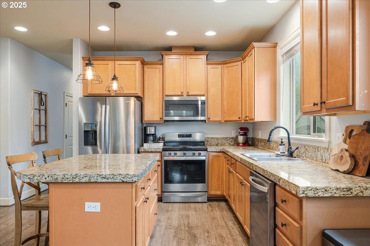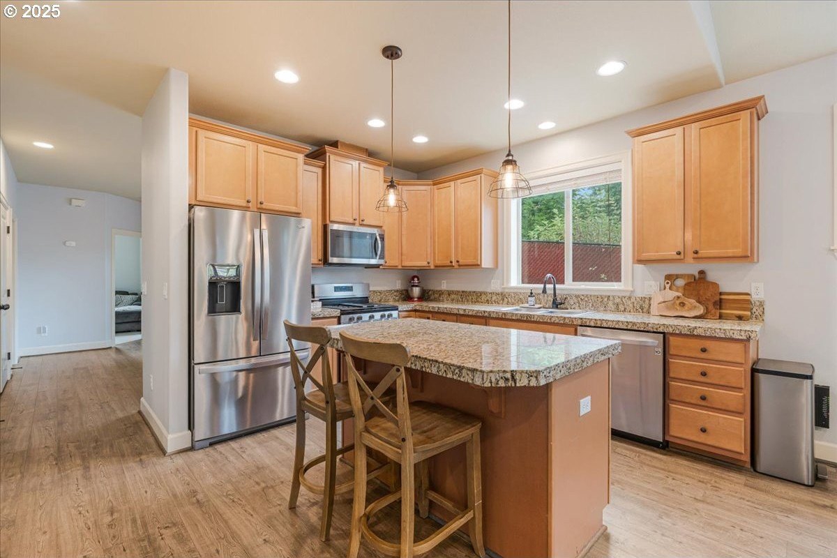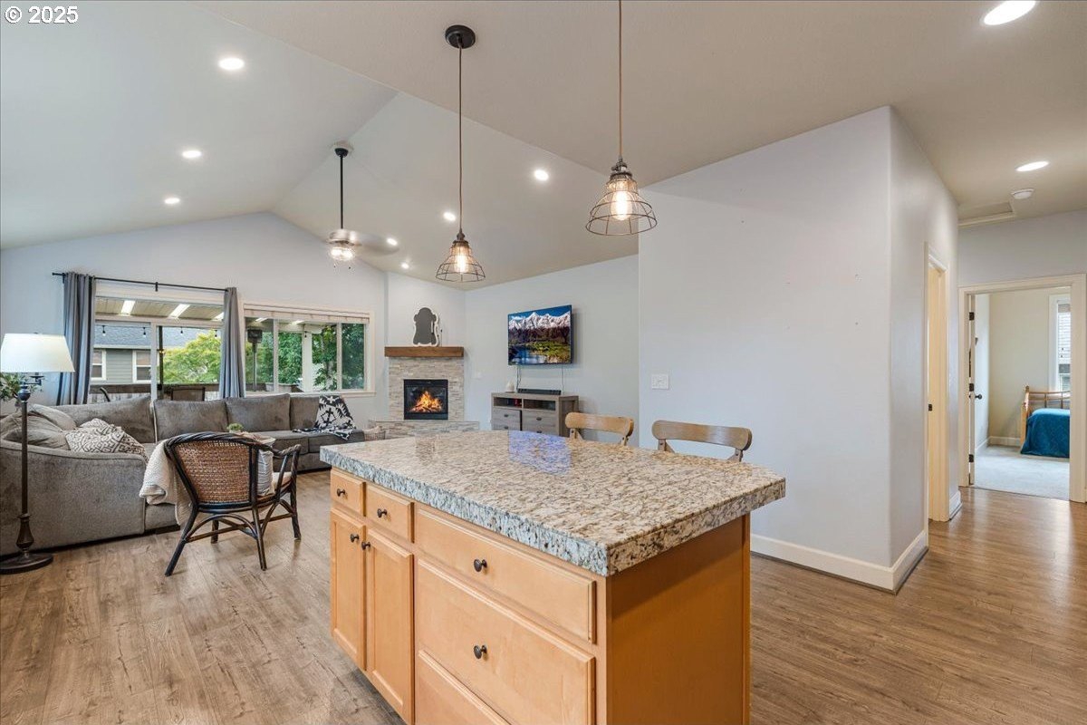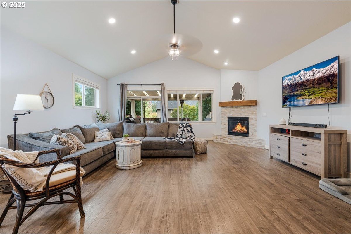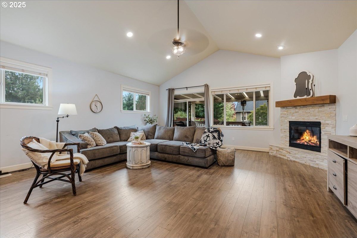 Beautiful single-story home offering 4 bedrooms, 2.5 bathrooms, and 9-foot ceilings throughout, with a vaulted living room that enhances the spacious feel. The open-concept kitchen features granite countertops, a large island, gas appliances, and a built-in pantry—ideal for cooking and entertaining. The adjoining living area includes a custom stone fireplace and vaulted ceilings for added character. The front dining room provides an inviting space for meals or gatherings. The primary suite includes vaulted ceilings, a walk-in closet, and an ensuite bath with dual vanities. Recent updates include new flooring (2021), new light fixtures, new toilets, and interior/exterior paint (2020). Additional highlights include a large laundry room with utility sink and cabinetry, and a garage with overhead storage racks. Outdoor features include fully fenced grounds, a fenced garden area with raised beds, a storage shed, and a covered back deck with shades—perfect for outdoor enjoyment. Prime location next to Timberline Park and minutes from coffee shops, restaurants, and hiking trails. A beautifully maintained one-level home that’s truly move-in ready!