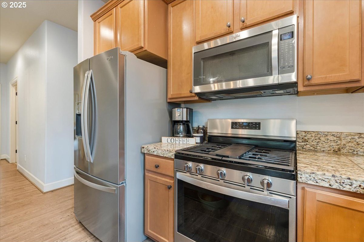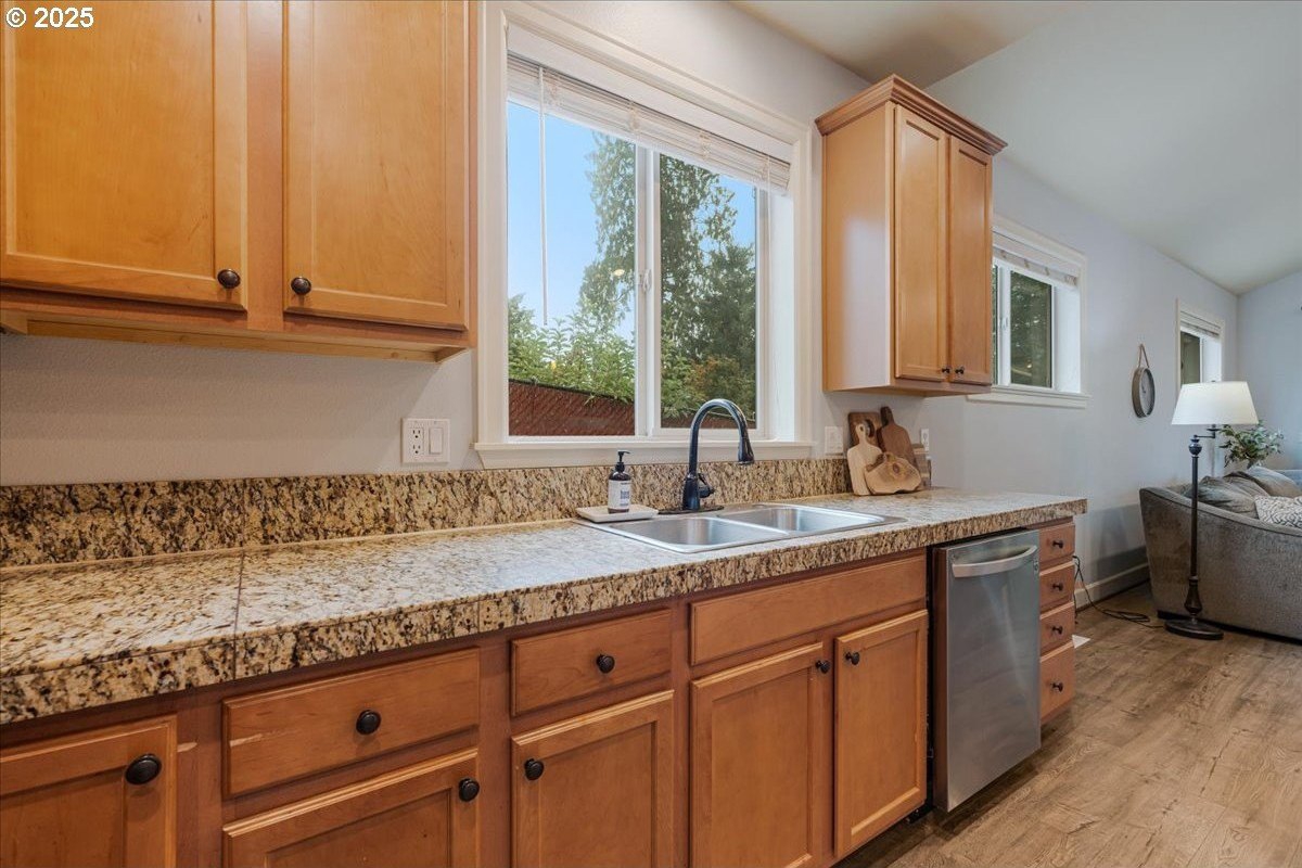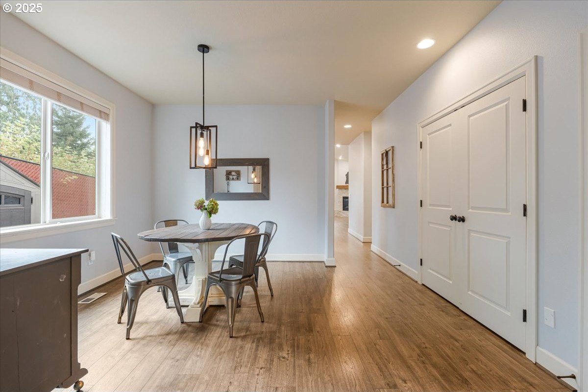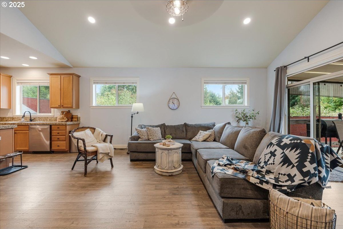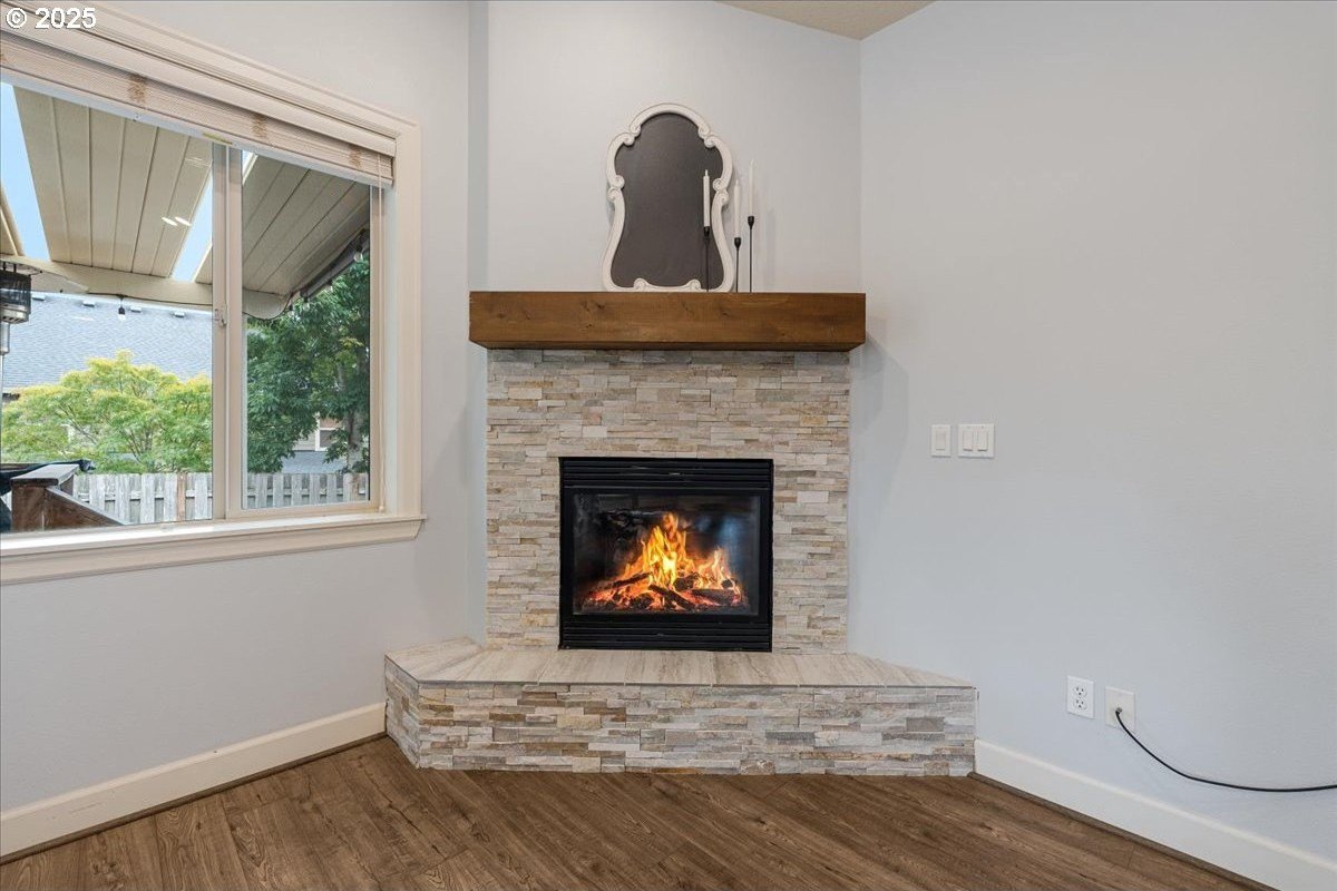 Beautiful single-story home offering 4 bedrooms, 2.5 bathrooms, and 9-foot ceilings throughout, with a vaulted living room that enhances the spacious feel. The open-concept kitchen features granite countertops, a large island, gas appliances, and a built-in pantry—ideal for cooking and entertaining. The adjoining living area includes a custom stone fireplace and vaulted ceilings for added character. The front dining room provides an inviting space for meals or gatherings. The primary suite includes vaulted ceilings, a walk-in closet, and an ensuite bath with dual vanities. Recent updates include new flooring (2021), new light fixtures, new toilets, and interior/exterior paint (2020). Additional highlights include a large laundry room with utility sink and cabinetry, and a garage with overhead storage racks. Outdoor features include fully fenced grounds, a fenced garden area with raised beds, a storage shed, and a covered back deck with shades—perfect for outdoor enjoyment. Prime location next to Timberline Park and minutes from coffee shops, restaurants, and hiking trails. A beautifully maintained one-level home that’s truly move-in ready!