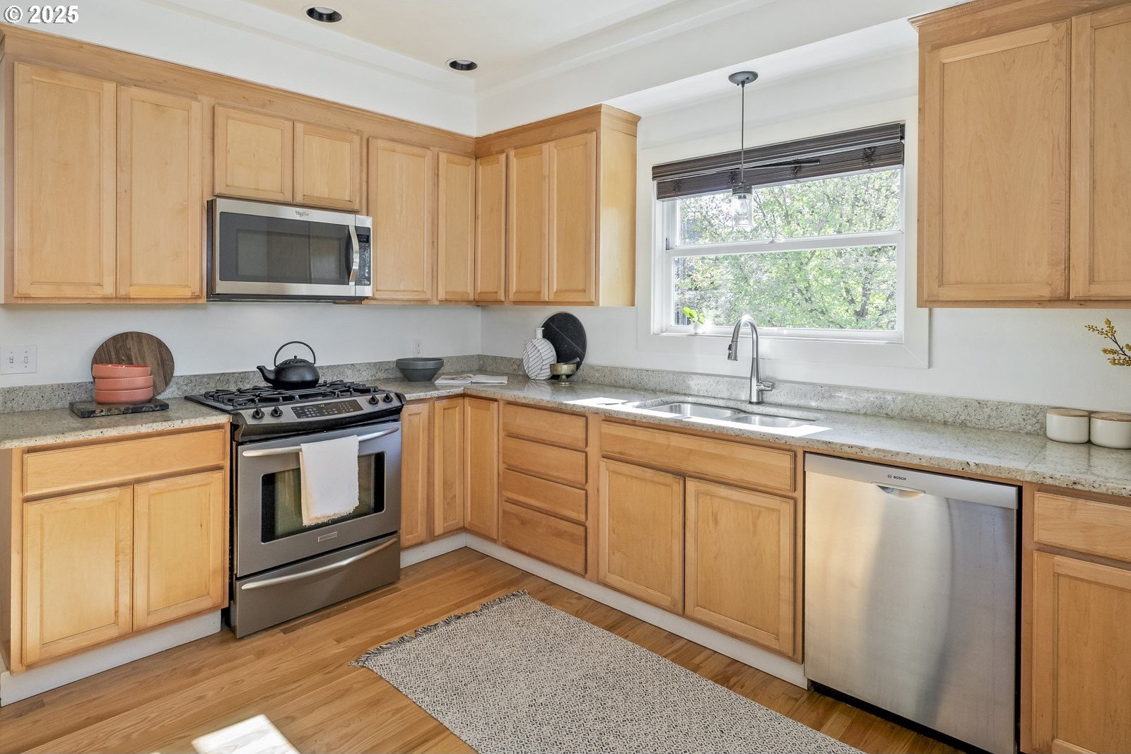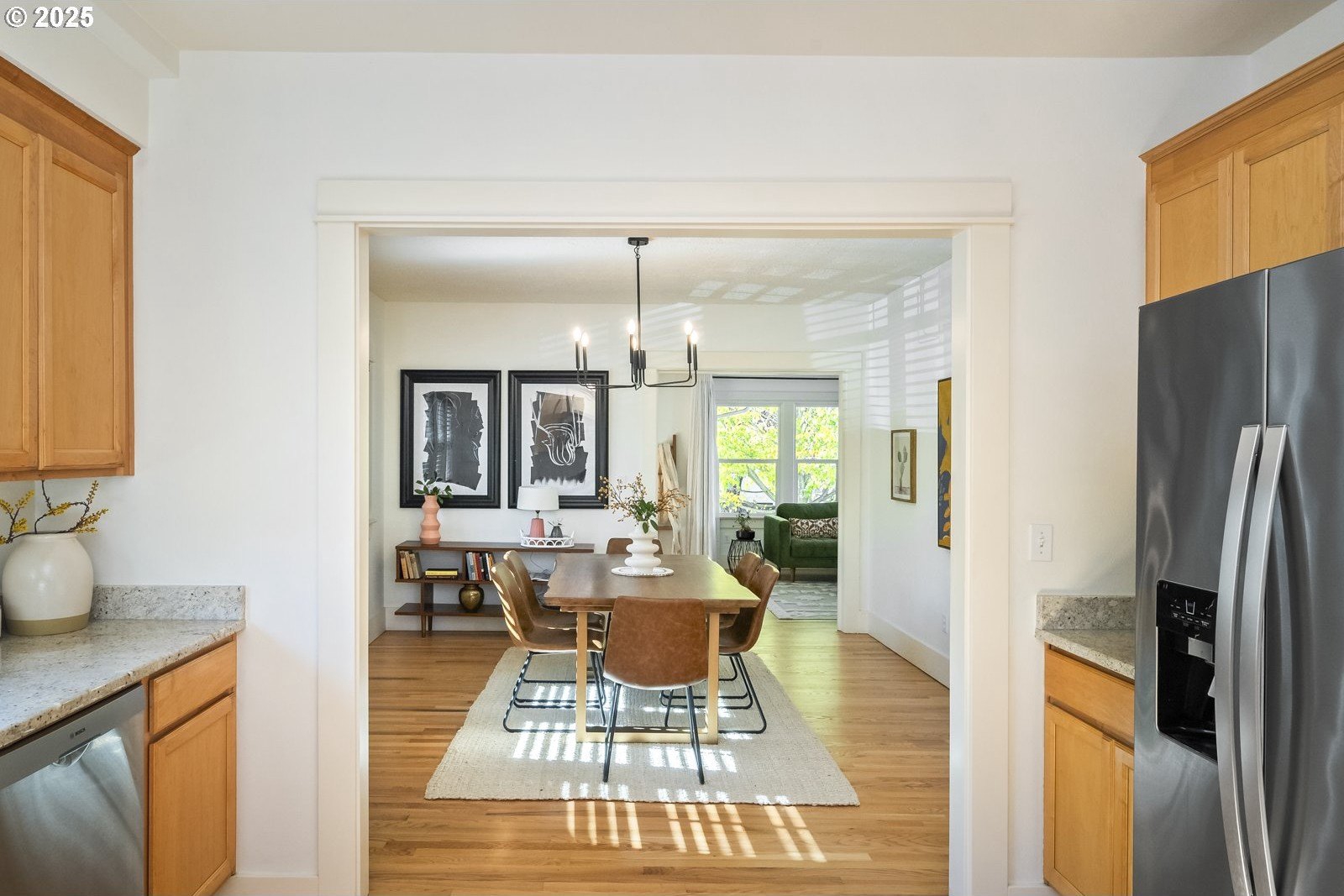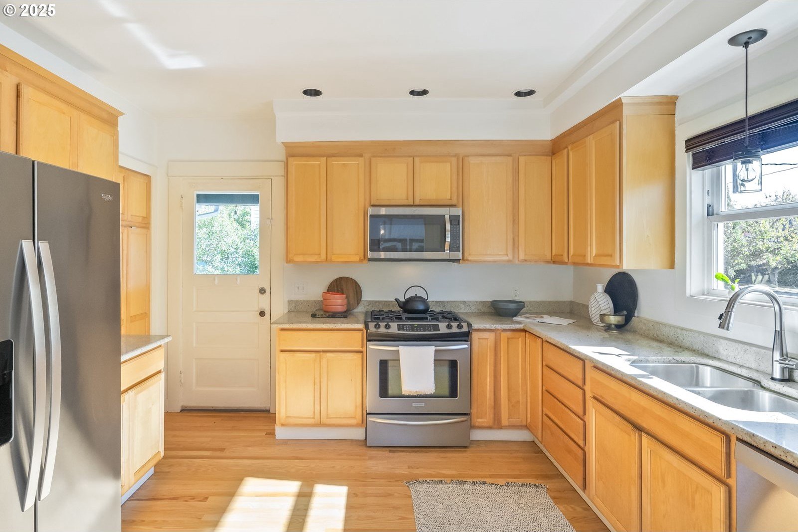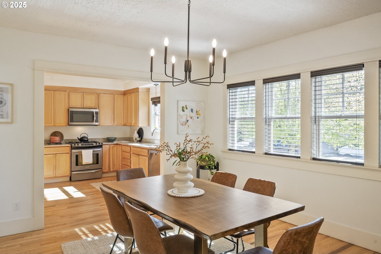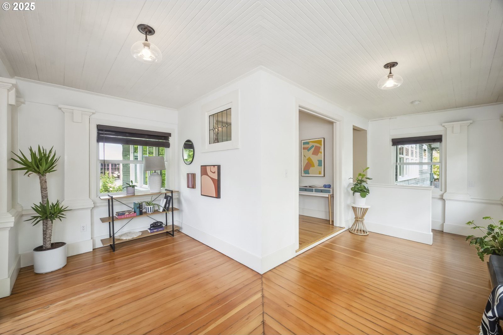 Chic and sunny classic bungalow in the heart of Arbor Lodge combining vintage details with smart updates, a spacious layout, and features that check all the boxes. Inside, you’ll find a flowing floor plan, welcoming foyer, bright sunroom/flex space, classic fireplace, freshly refinished wood floors, large kitchen, and a fully finished lower level. Notice the character throughout: decorative vintage leaded glass, updated lighting, penny tile floors, and Craftsman-style columns. The generous kitchen layout has plenty of room for the chef and the sous with abundant cabinet storage and prep space. It opens to the dining room and flows easily to the backyard for seamless indoor-outdoor living and dining. Downstairs, the fully finished lower level expands the possibilities. There’s a spacious family/rec room, full bathroom, laundry room, and an additional bedroom with egress and a closet. With its own private exterior entrance, this level is ideal for guests, a home office, or a quiet retreat to unwind. Feel confident in systems and mechanical upgrades: including a freshly stabilized foundation by TerraFirma (w/transferrable warranty), drainage improvements, updated windows and ducting, and modern plumbing & electrical. Out back, enjoy chill hangs or lively gatherings under the covered deck surrounded by upgraded landscaping, easy-care turf, and a fully fenced yard wrapped in mature greenery for peace and privacy. All of this in the vibrant Arbor Lodge neighborhood, just blocks from coffee shops, cafes, restaurants, a neighborhood tavern, Arbor Lodge Park, and New Seasons Market.Come see what makes this place feel like home. [Home Energy Score = 6. HES Report at https://rpt.greenbuildingregistry.com/hes/OR10186118]