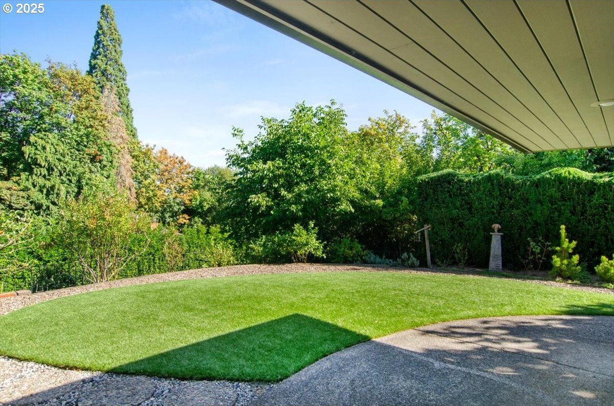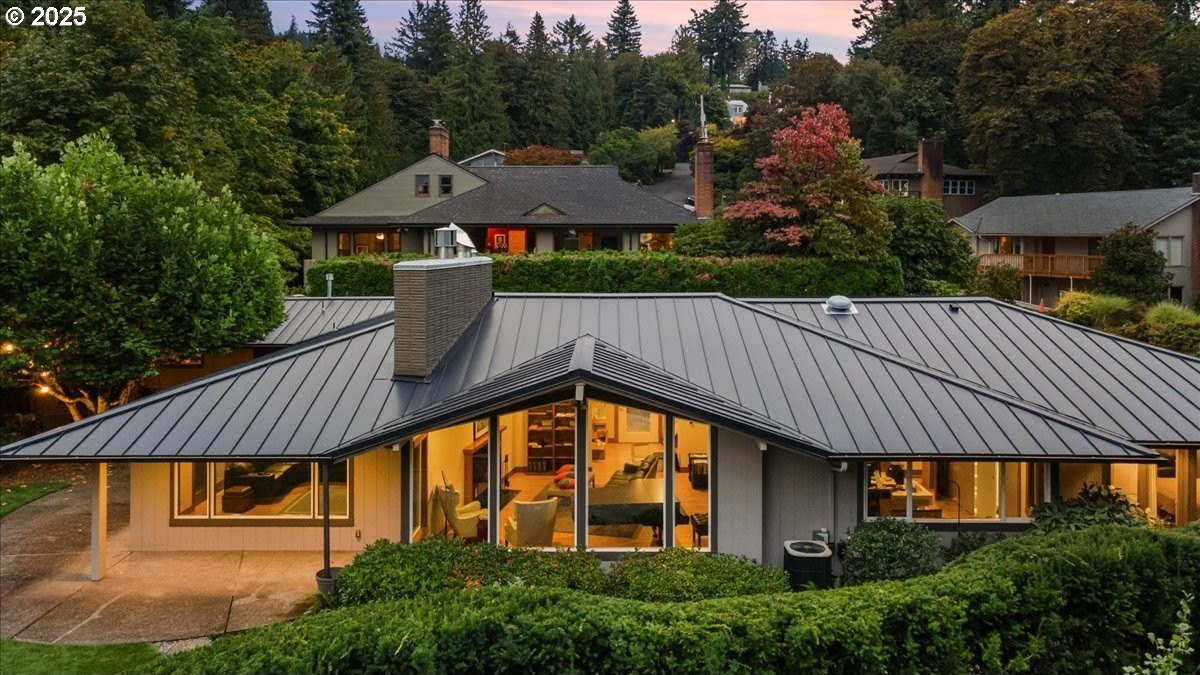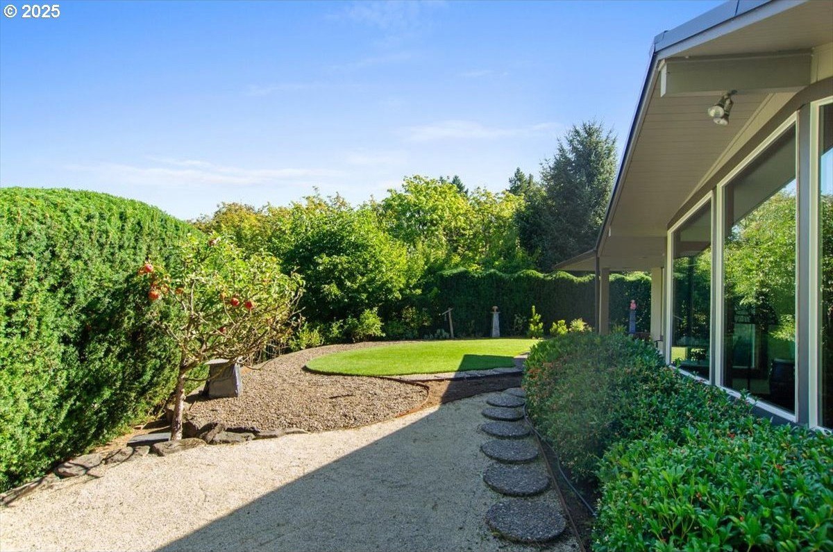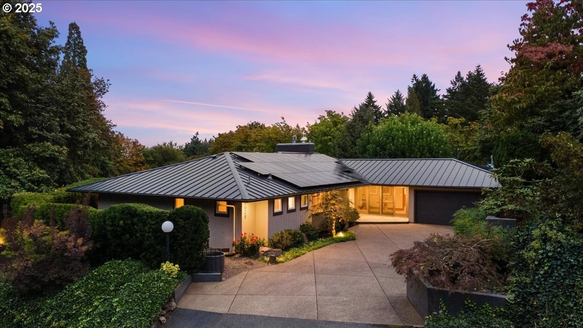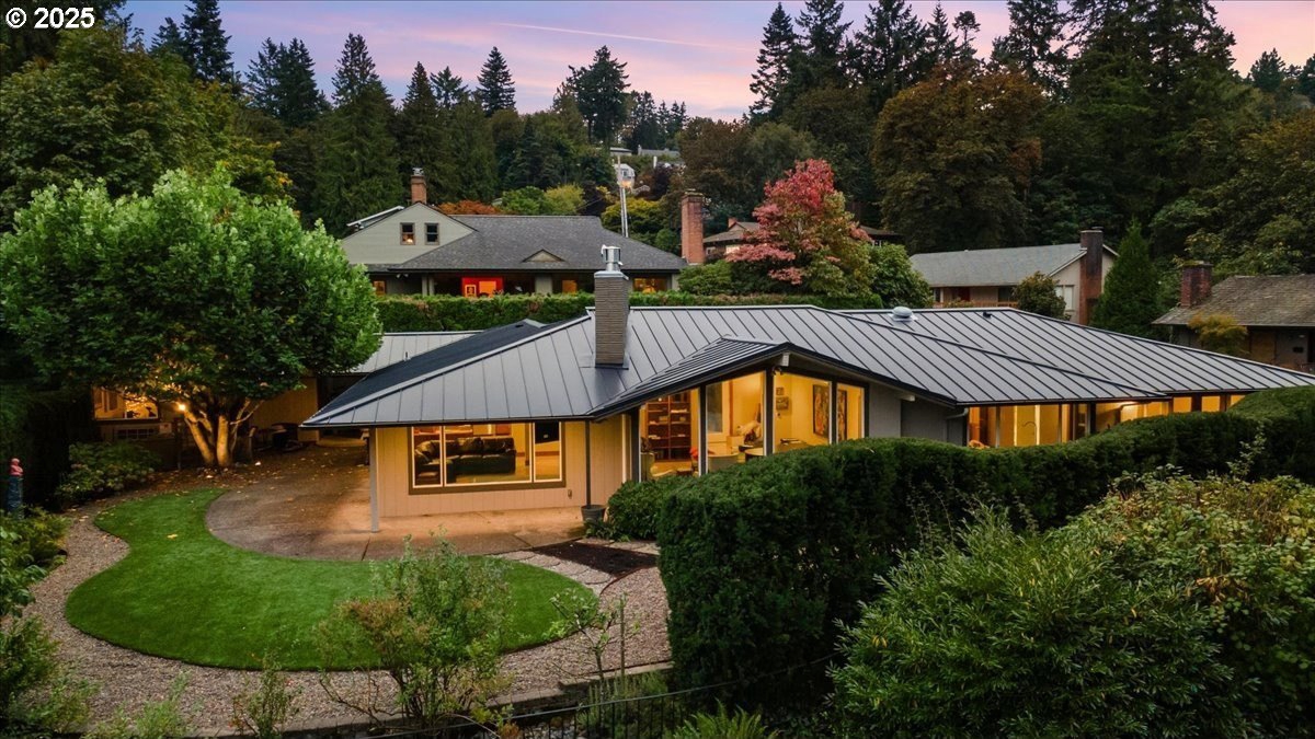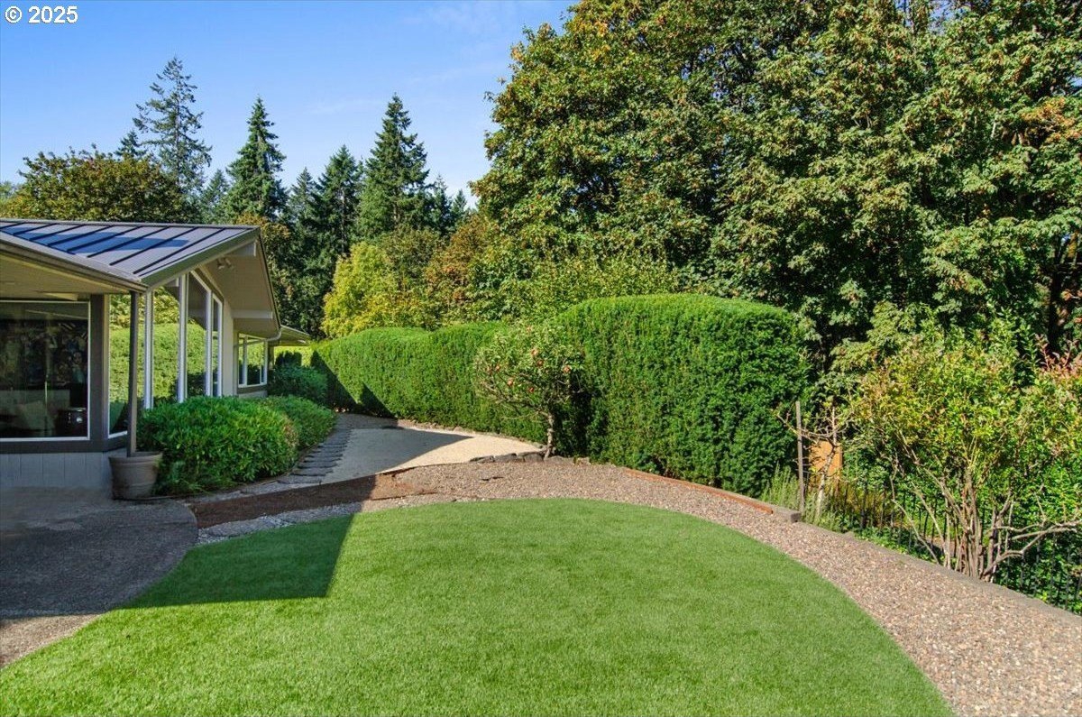 Tucked away on a quiet cul-de-sac in Portland Heights, this thoughtfully updated mid-century featuring main floor living blends classic craftsmanship with modern comfort. Sunlight fills the vaulted living spaces through walls of windows, while rich wood floors, period details, and custom built-ins add warmth throughout. The gourmet kitchen offers granite counters, wood cabinetry, and a connected breakfast area overlooking the family room and garden. The primary suite opens directly to the yard and features a spa-like bathroom with a soaking tub and walk-in shower. Outside, patios, a flat yard with turf and gardens create a private, low maintenance retreat surrounded by mature plantings, a pétanque court, and outdoor lighting for evening entertaining. A separate guest studio with kitchenette and a full bathroom adds flexibility for visitors or work-from-home needs. Designed for both beauty and function, this residence includes solar power, an EV charger, a whole-house generator, and smart climate control — while being only minutes from parks, trails, downtown, hospitals, schools, NW Portland, and the high-tech corridor. [Home Energy Score = 8. HES Report at https://rpt.greenbuildingregistry.com/hes/OR10242142]