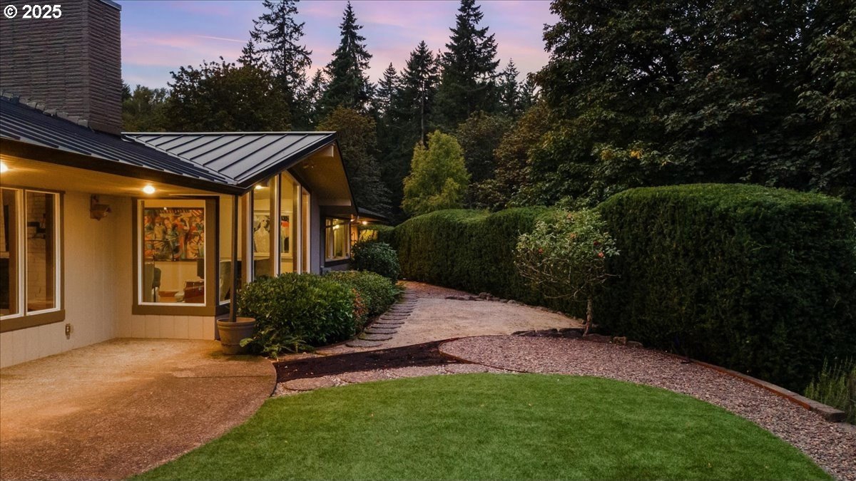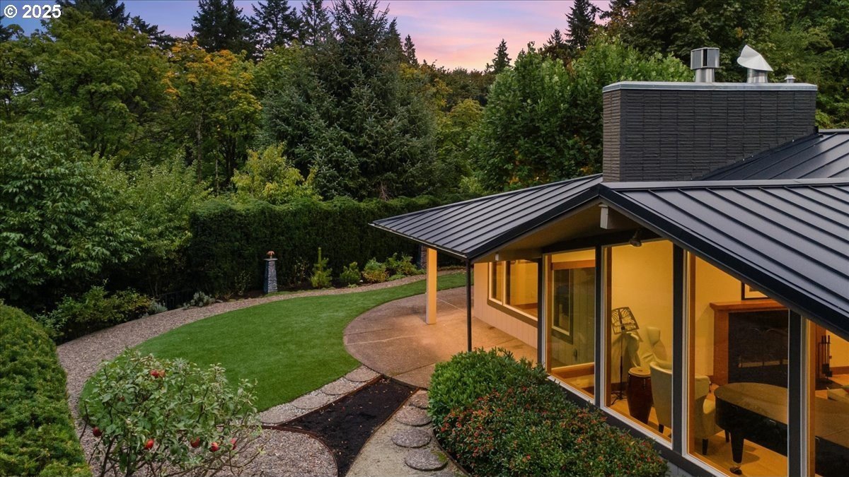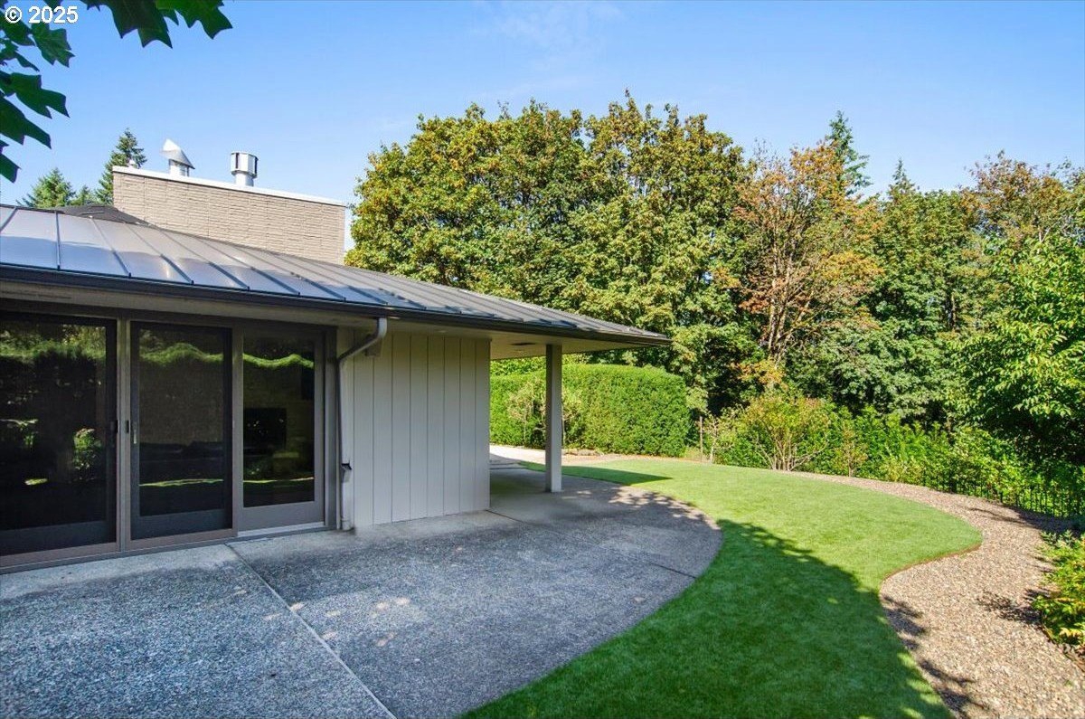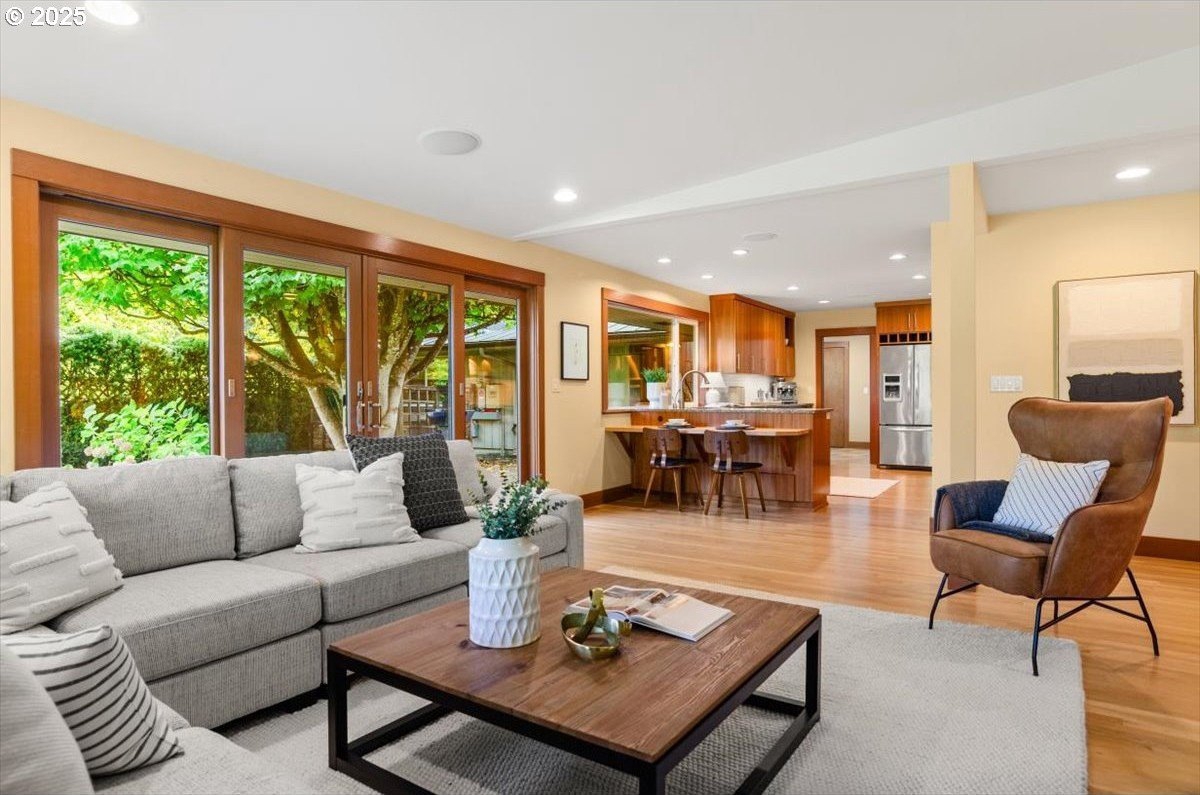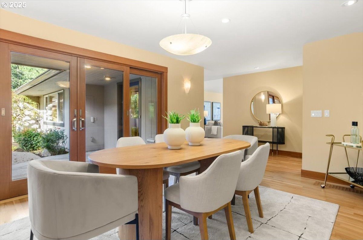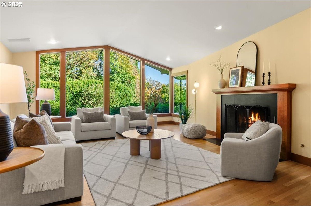 Tucked away on a quiet cul-de-sac in Portland Heights, this thoughtfully updated mid-century featuring main floor living blends classic craftsmanship with modern comfort. Sunlight fills the vaulted living spaces through walls of windows, while rich wood floors, period details, and custom built-ins add warmth throughout. The gourmet kitchen offers granite counters, wood cabinetry, and a connected breakfast area overlooking the family room and garden. The primary suite opens directly to the yard and features a spa-like bathroom with a soaking tub and walk-in shower. Outside, patios, a flat yard with turf and gardens create a private, low maintenance retreat surrounded by mature plantings, a pétanque court, and outdoor lighting for evening entertaining. A separate guest studio with kitchenette and a full bathroom adds flexibility for visitors or work-from-home needs. Designed for both beauty and function, this residence includes solar power, an EV charger, a whole-house generator, and smart climate control — while being only minutes from parks, trails, downtown, hospitals, schools, NW Portland, and the high-tech corridor. [Home Energy Score = 8. HES Report at https://rpt.greenbuildingregistry.com/hes/OR10242142]