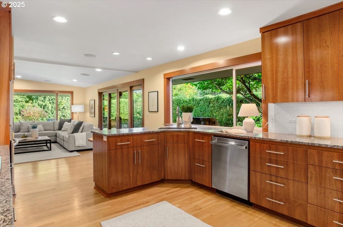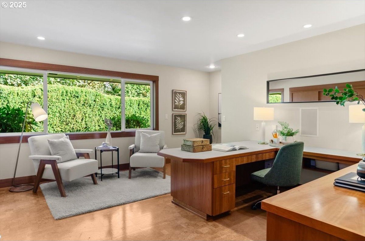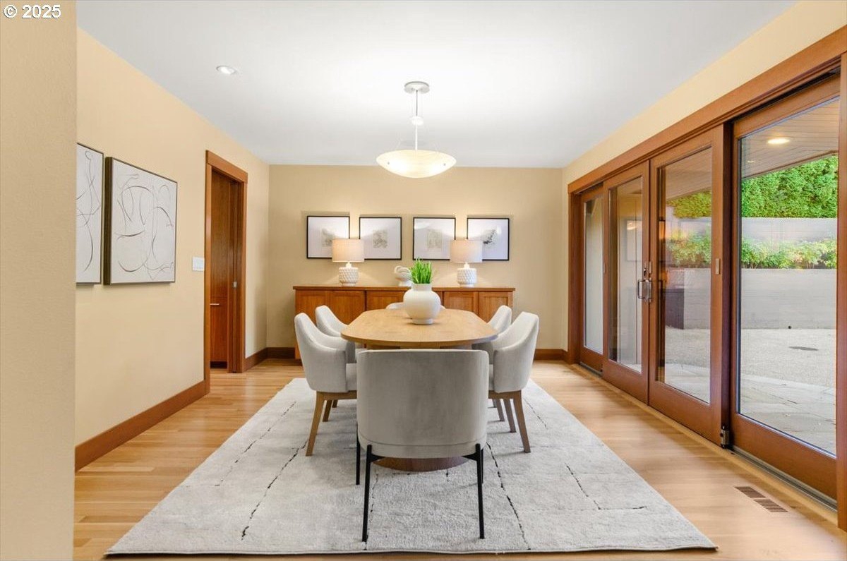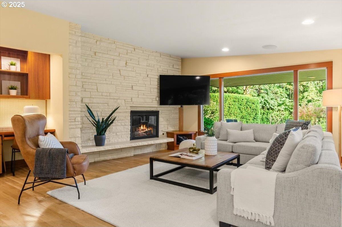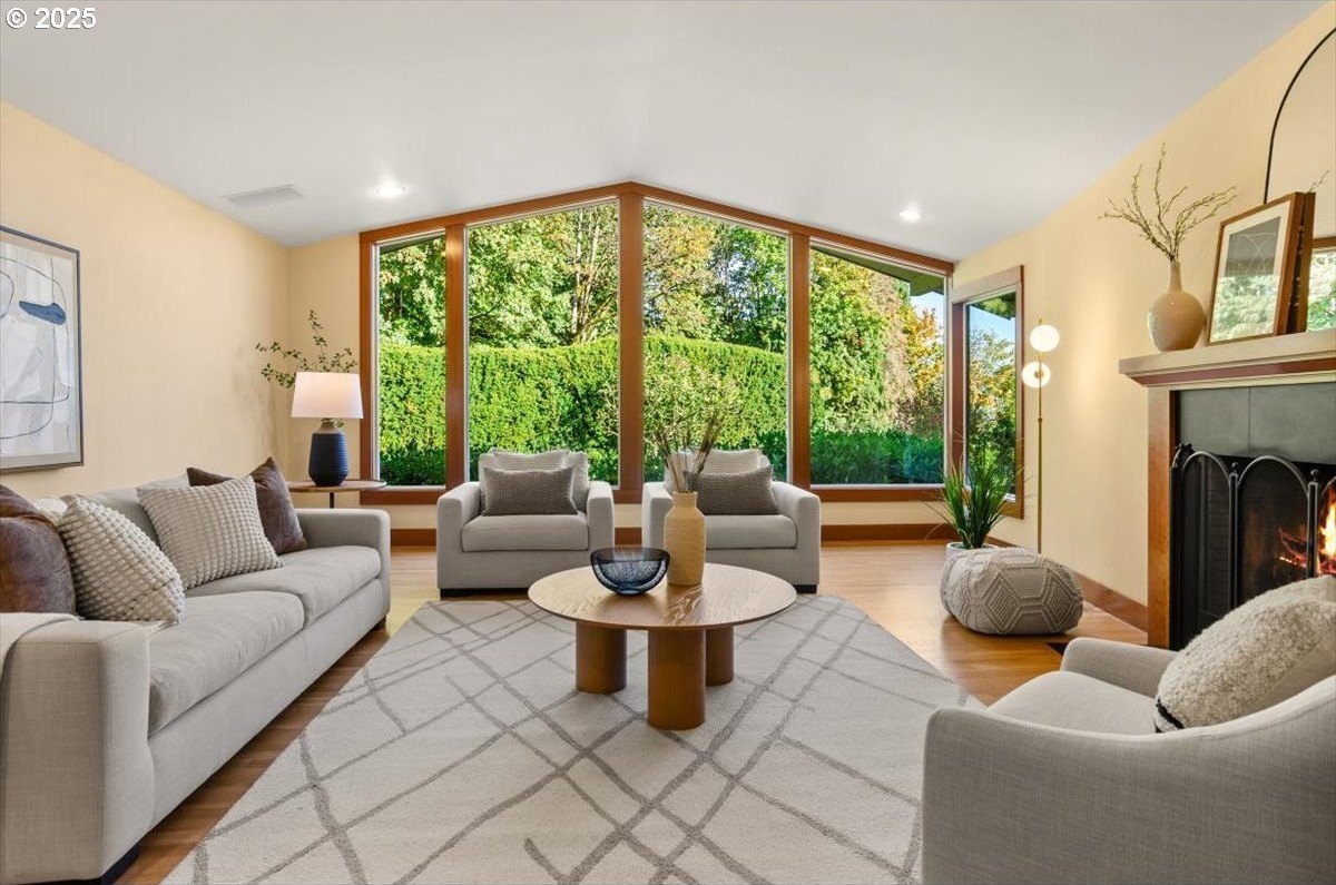 Tucked away on a quiet cul-de-sac in Portland Heights, this thoughtfully updated mid-century featuring main floor living blends classic craftsmanship with modern comfort. Sunlight fills the vaulted living spaces through walls of windows, while rich wood floors, period details, and custom built-ins add warmth throughout. The gourmet kitchen offers granite counters, wood cabinetry, and a connected breakfast area overlooking the family room and garden. The primary suite opens directly to the yard and features a spa-like bathroom with a soaking tub and walk-in shower. Outside, patios, a flat yard with turf and gardens create a private, low maintenance retreat surrounded by mature plantings, a pétanque court, and outdoor lighting for evening entertaining. A separate guest studio with kitchenette and a full bathroom adds flexibility for visitors or work-from-home needs. Designed for both beauty and function, this residence includes solar power, an EV charger, a whole-house generator, and smart climate control — while being only minutes from parks, trails, downtown, hospitals, schools, NW Portland, and the high-tech corridor. [Home Energy Score = 8. HES Report at https://rpt.greenbuildingregistry.com/hes/OR10242142]