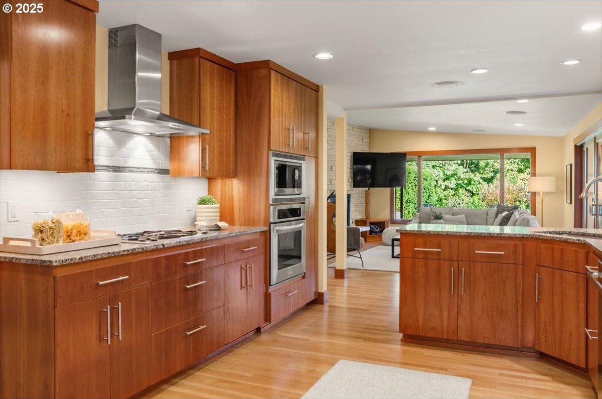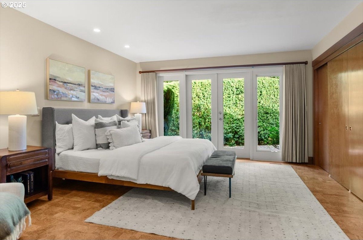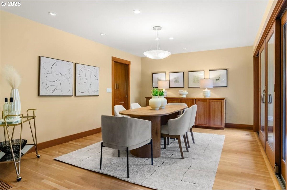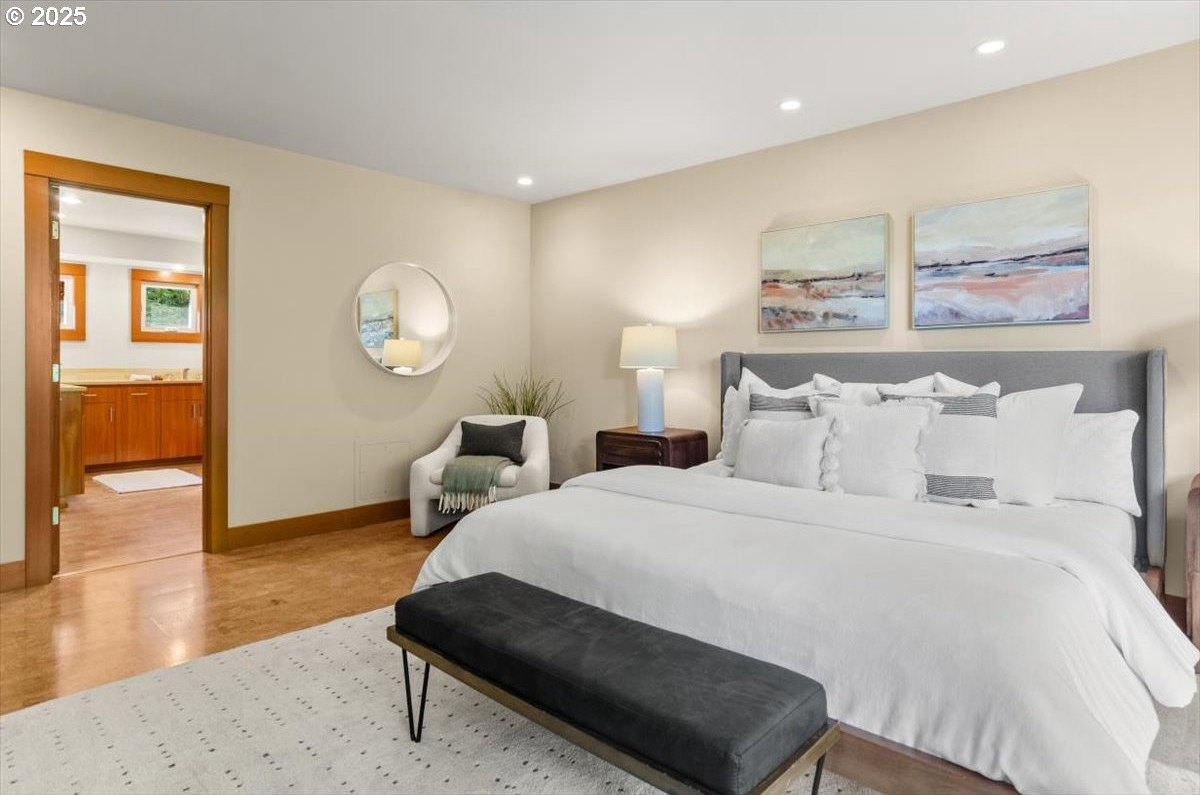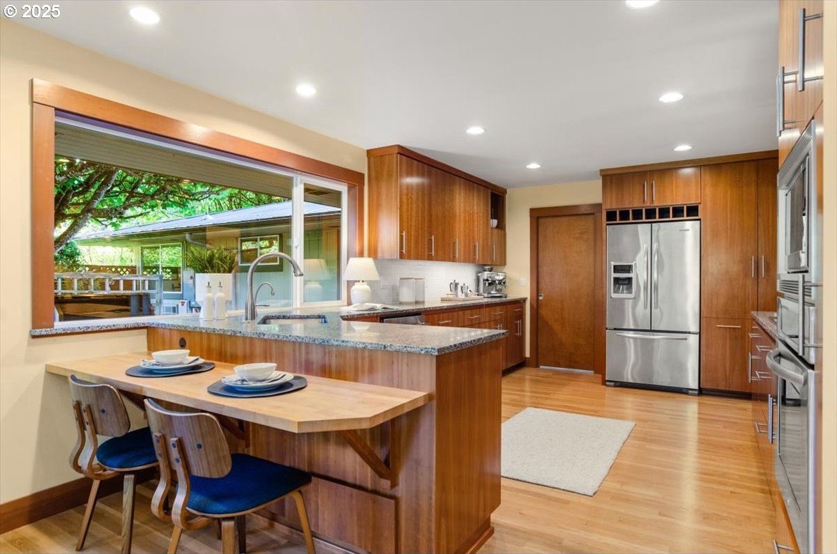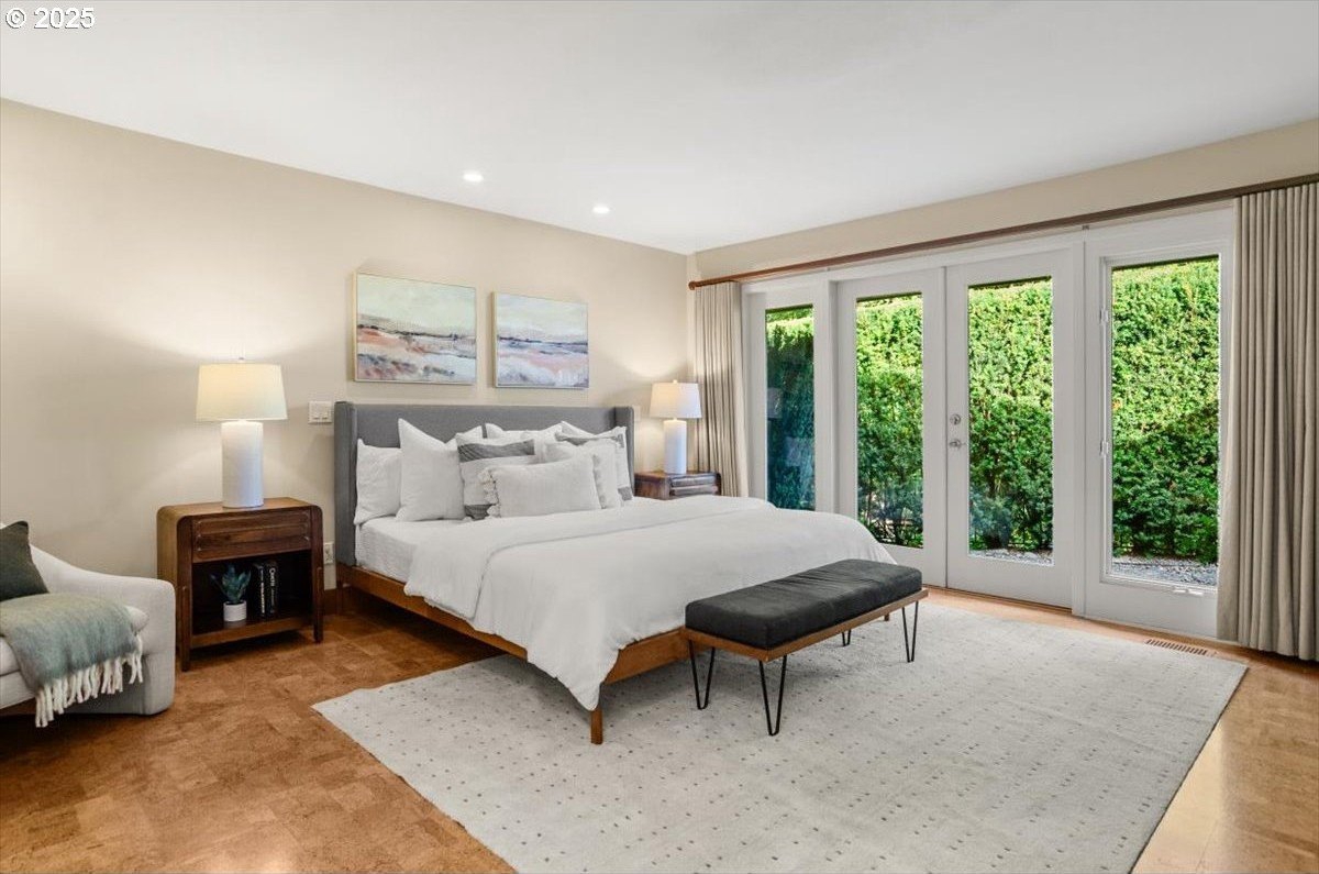 Tucked away on a quiet cul-de-sac in Portland Heights, this thoughtfully updated mid-century featuring main floor living blends classic craftsmanship with modern comfort. Sunlight fills the vaulted living spaces through walls of windows, while rich wood floors, period details, and custom built-ins add warmth throughout. The gourmet kitchen offers granite counters, wood cabinetry, and a connected breakfast area overlooking the family room and garden. The primary suite opens directly to the yard and features a spa-like bathroom with a soaking tub and walk-in shower. Outside, patios, a flat yard with turf and gardens create a private, low maintenance retreat surrounded by mature plantings, a pétanque court, and outdoor lighting for evening entertaining. A separate guest studio with kitchenette and a full bathroom adds flexibility for visitors or work-from-home needs. Designed for both beauty and function, this residence includes solar power, an EV charger, a whole-house generator, and smart climate control — while being only minutes from parks, trails, downtown, hospitals, schools, NW Portland, and the high-tech corridor. [Home Energy Score = 8. HES Report at https://rpt.greenbuildingregistry.com/hes/OR10242142]