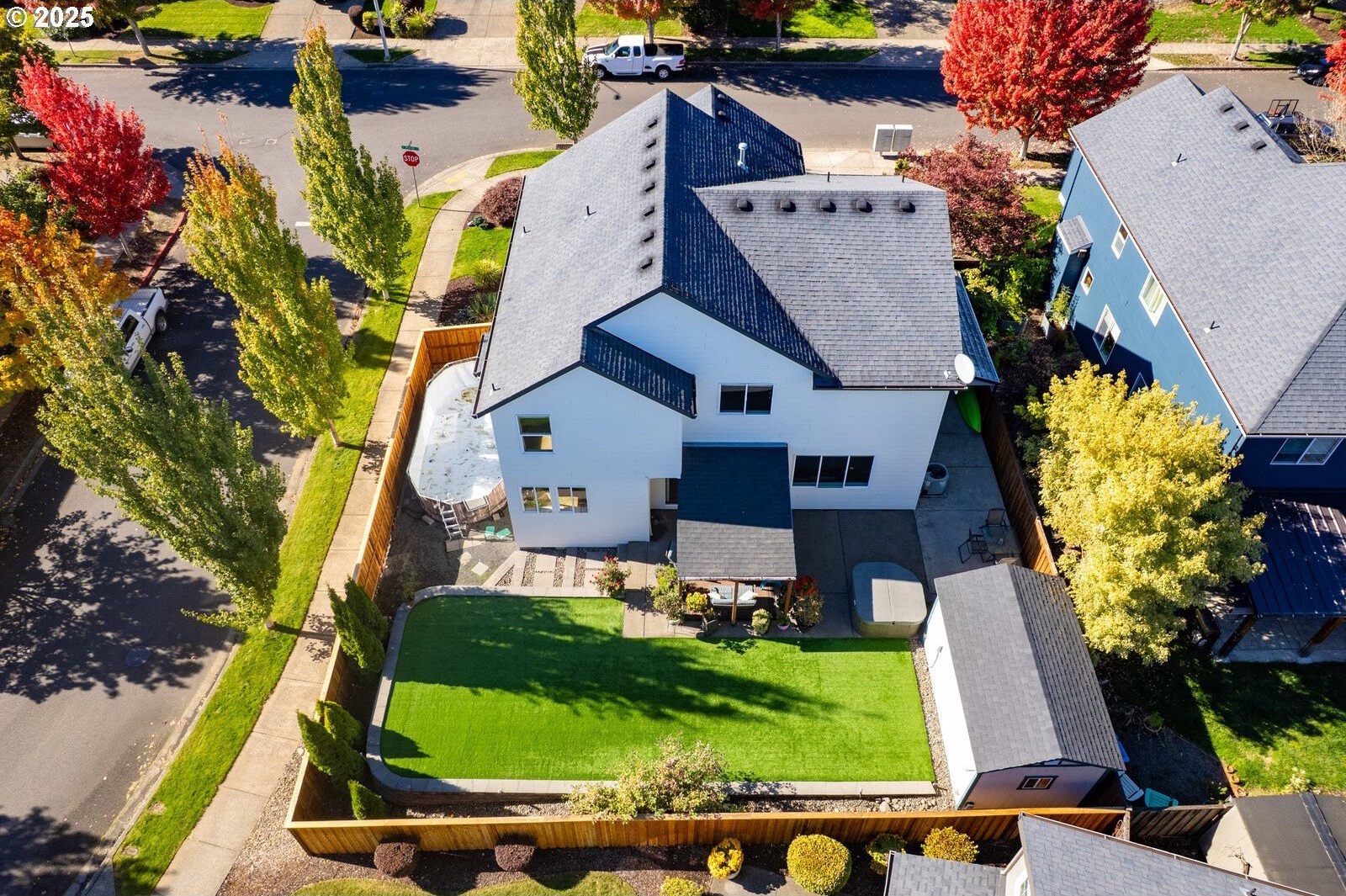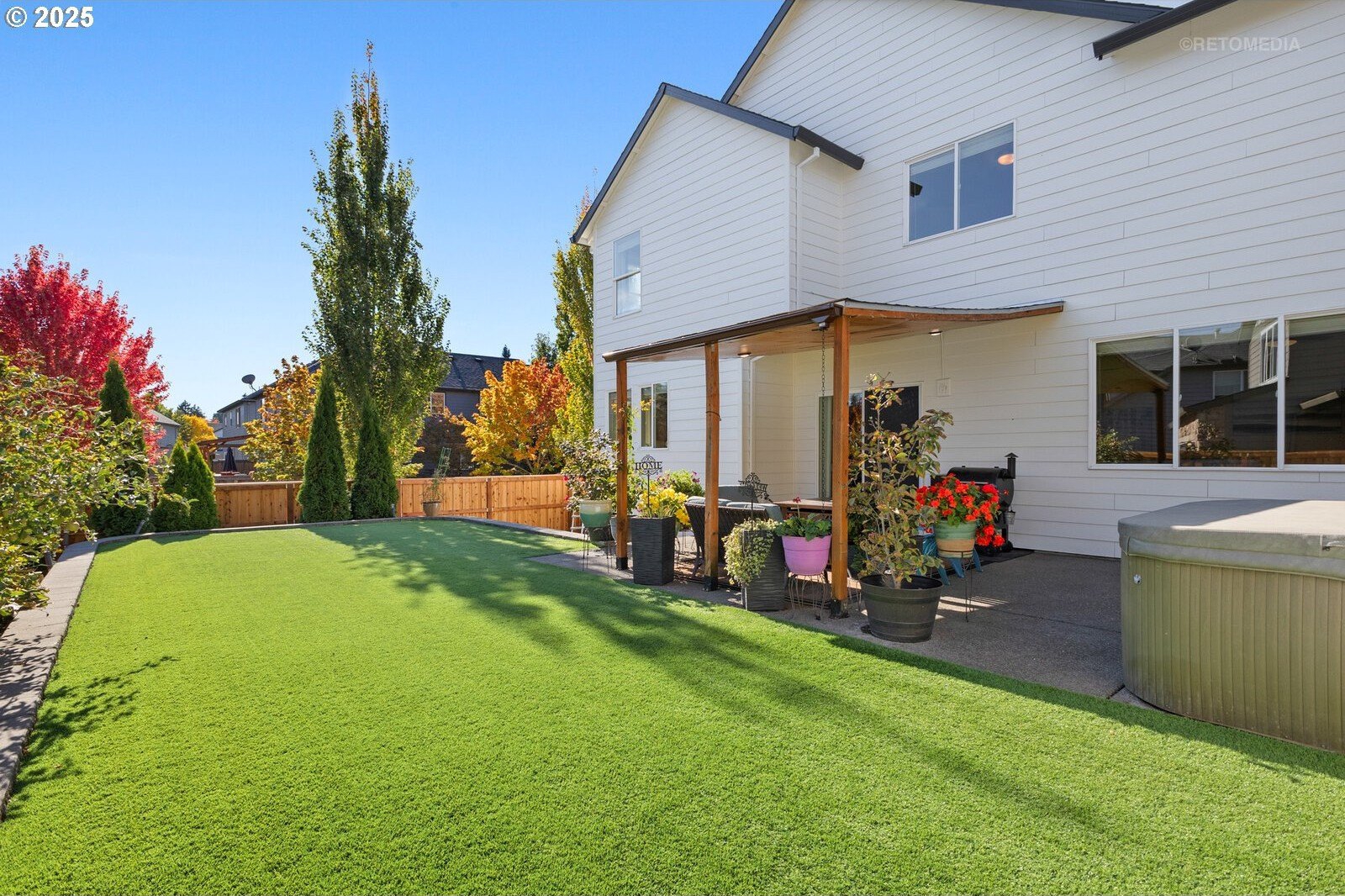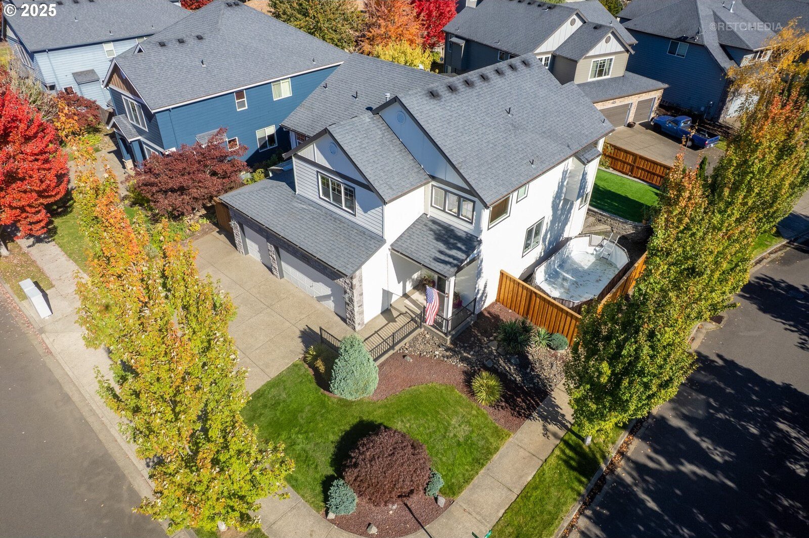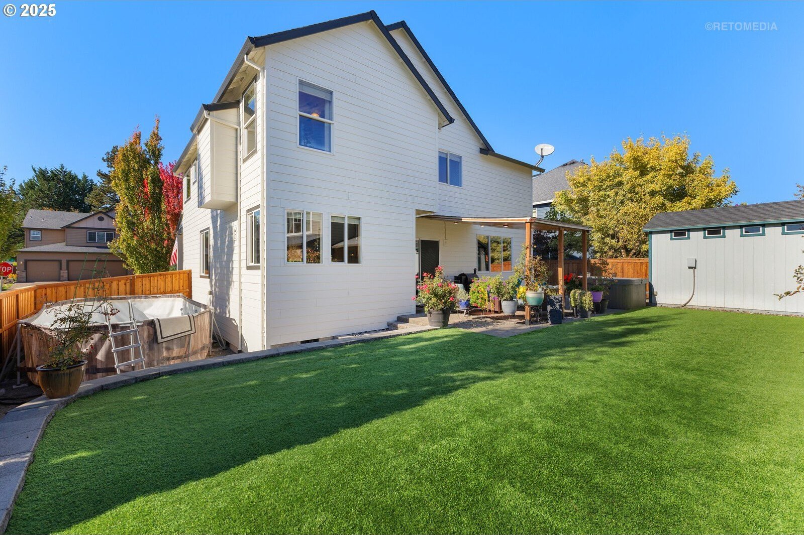 OPEN SATURDAY 10/25, 12:00-3:00! Come home to refined elegance on a corner lot in Jacob Park - Here you'll find a beautifully maintained dwelling with carefully implemented upgrades & improvements. Step into the two-story foyer and take a moment to appreciate the 9' ceilings and new LVT flooring throughout of the main level. French doors reveal a spacious den en-route to an open dining room flanked by kitchen and family room. The timeless appeal of stainless appliances, granite slab countertops, wood grain cabinetry and a full pantry make the kitchen a classic space for cooking, entertaining or both. Rain or shine, the back yard is a wonderland enclosed by new fencing and comprised of covered patio, hot tub, ample all-weather turf, large project shed with power and a covered side-yard pad for RV or boat parking. Upstairs are the private quarters: Four large bedrooms anchored by a primary suite with a bathroom featuring soak tub & separate shower alongside an oversized walk-in closet. Even the three car garage is special, with a separate mini-split unit to cool or heat the space for those who'll use it as shop, gym or crafting area. Perfectly located for a Portland commuter or a work from home professional, the neighborhood is replete with pride of ownership and feeds to the renowned educational chain of Peterson elementary to Scappoose middle & high schools. With new furnace, new water heater, new garage door opener, new fence and new exterior paint, the systems are all pristine, so you can buy with confidence. Imagine how it would blend with & broaden your life to plant your flag on Porter Street!