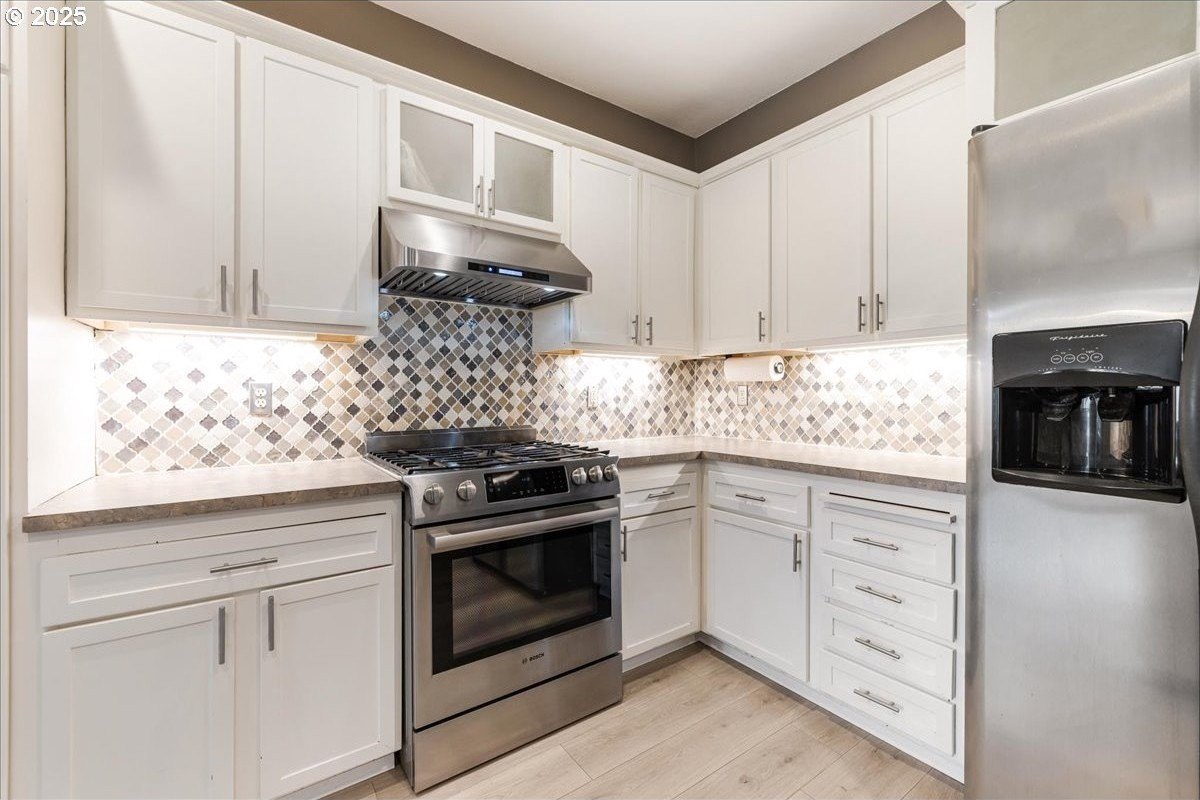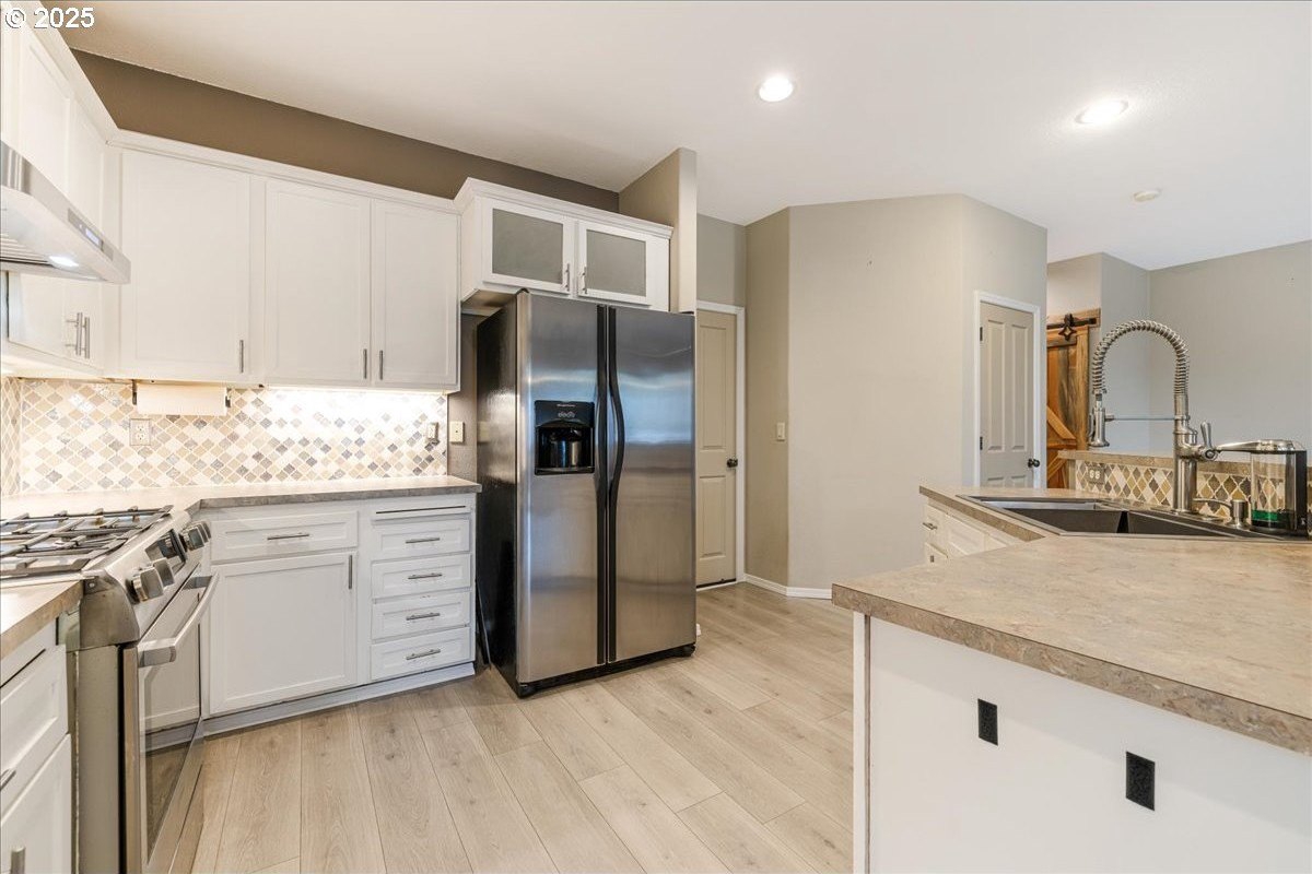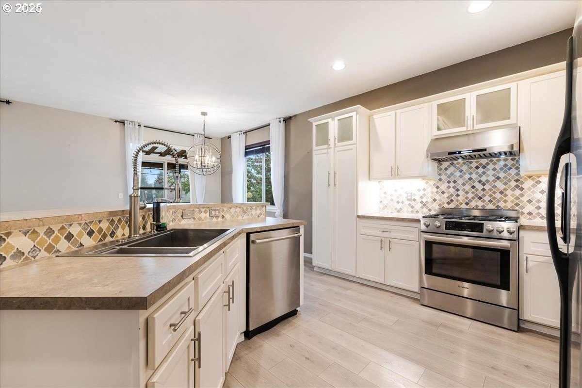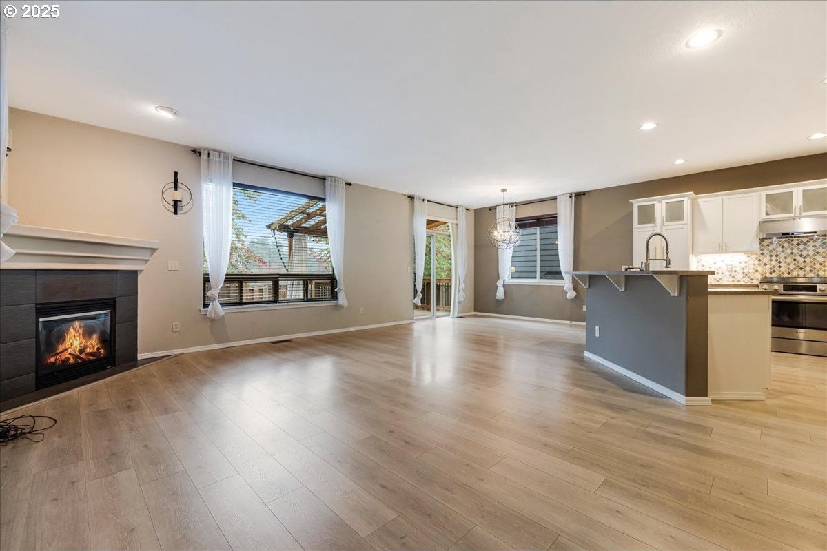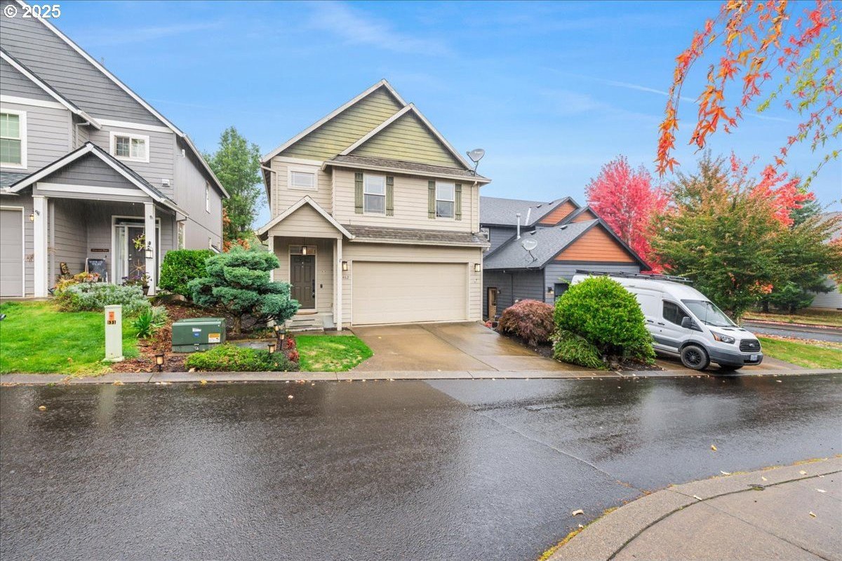 Darling 4-bedroom, 2.5 bath home! You’ll love the easy flow of this home’s open layout with 9-foot ceilings and laminate floors throughout the main level. The living room has a cozy corner gas fireplace, and the dining area opens to a covered back deck, perfect for year-round grilling or morning coffee. The kitchen offers plenty of workspace with a center island, classic white cabinets, and stainless-steel appliances, including the fridge, gas range, and dishwasher, which are all included with the home. A half bath and attached two-car garage complete the main level. Upstairs you'll find four bedrooms, two full baths, and a laundry closet with washer and dryer included. The primary suite feels spacious and bright with vaulted ceilings, dual closets (one walk-in), and a private bath featuring a double-sink vanity and walk-in shower. Outside, the fully fenced backyard and covered deck make it easy to enjoy the outdoors in any season. This one’s move-in ready and ready for it's next chapter. Come take a look!