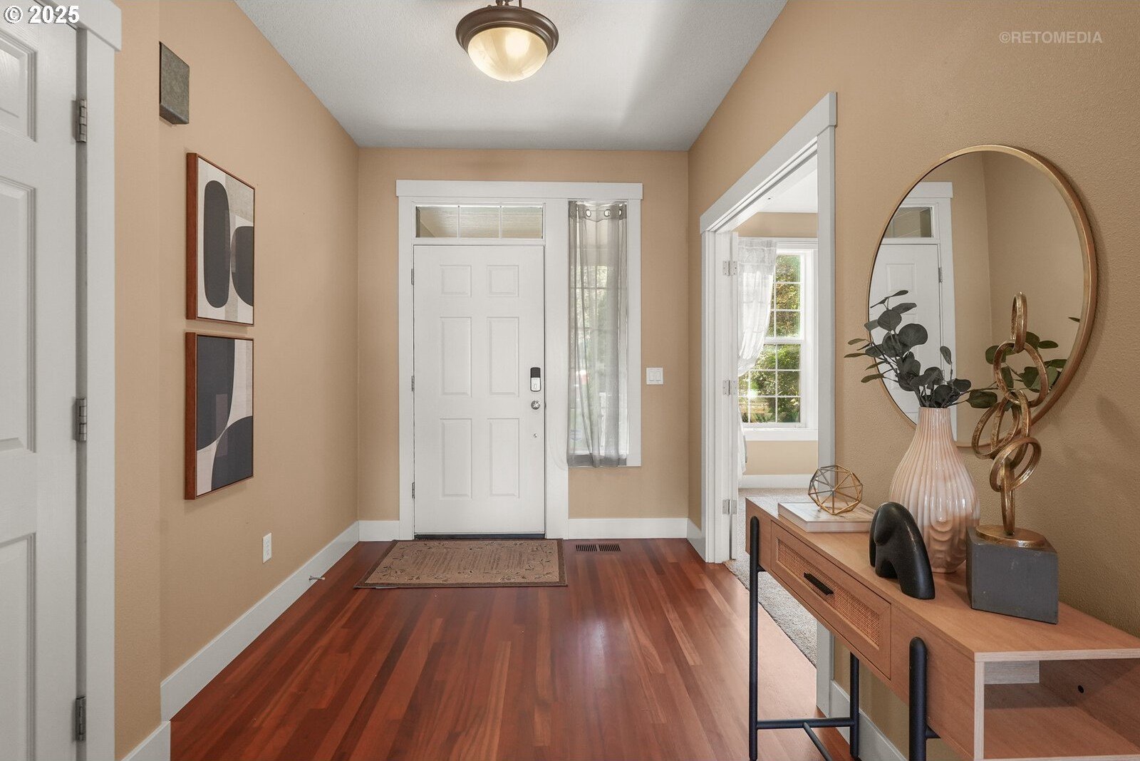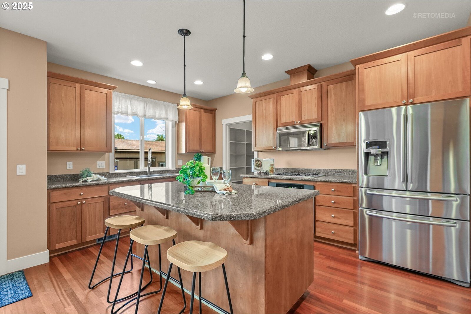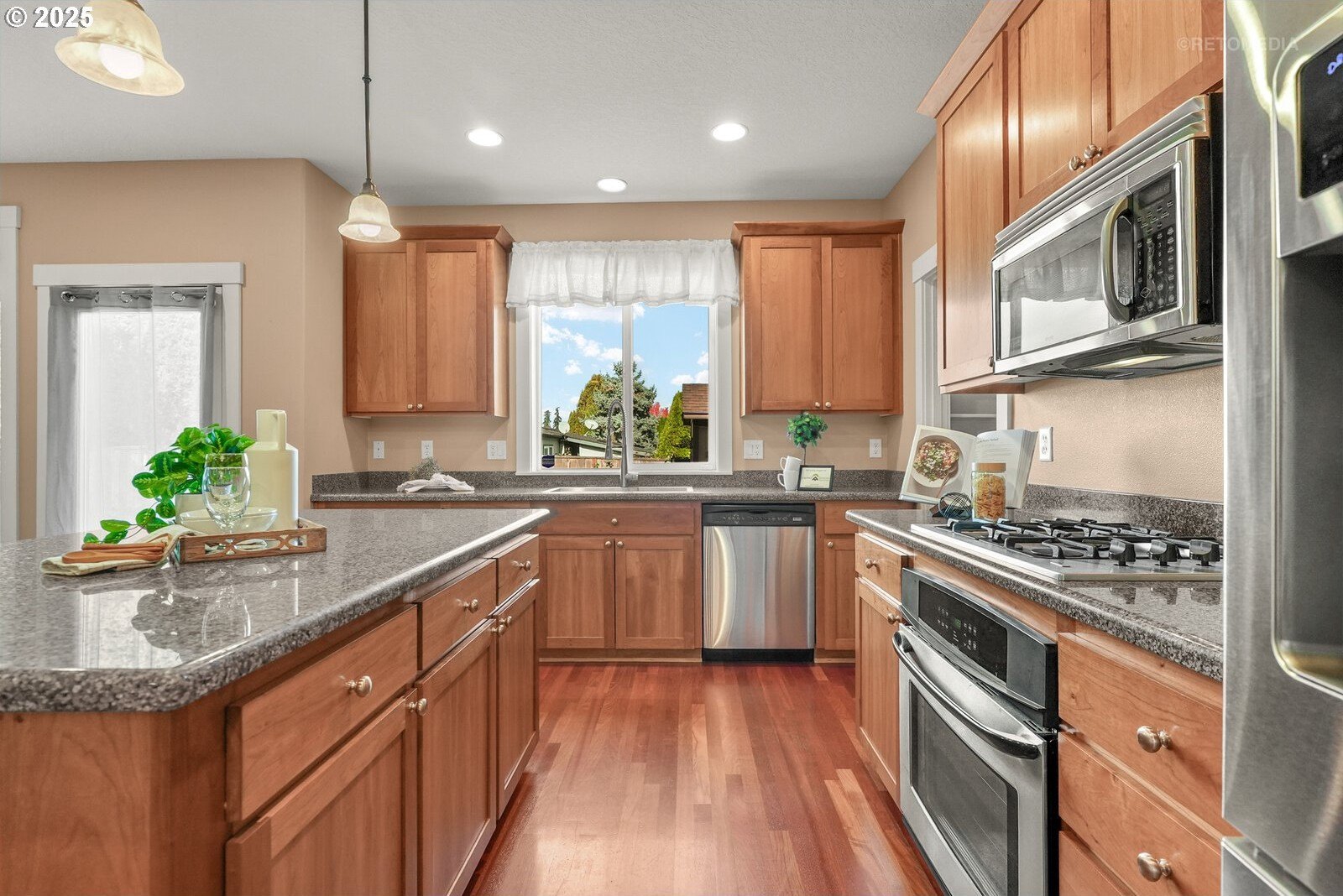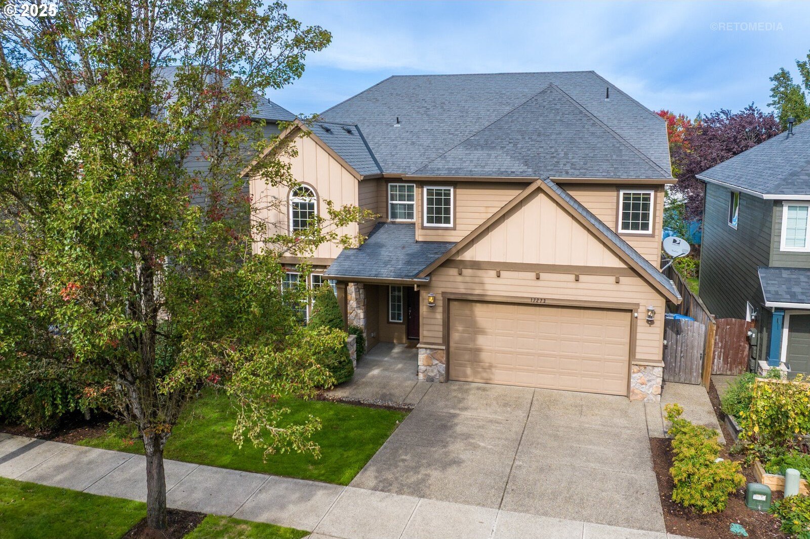Beautifully designed and ideally located, this Sherwood home offers a functional and versatile floor plan with room for everyone. Featuring 4 bedrooms upstairs, plus a large bonus (or 5th bedroom), an open loft, and a main-level office or guest suite, the layout provides exceptional flexibility. The kitchen shines with cherry cabinetry, rich-toned hardwoods, slab granite countertops, stainless steel appliances, a walk-in pantry, and a large island that flows into the dining and great room with access to the paved outdoor living area... perfect for easy maintenance and year-round enjoyment. Upstairs, an open bonus loft leads to additional rooms. The spacious primary suite features tray ceilings, dual vanity bath, soaking tub, and walk-in closet with built-ins. Just steps to Sherwood Middle School, wine bar, local salon, gym, parks, walking paths, and Old Town Sherwood, offering dining and local amenities for all ages, you’ll quickly see why you’ll love living here!
