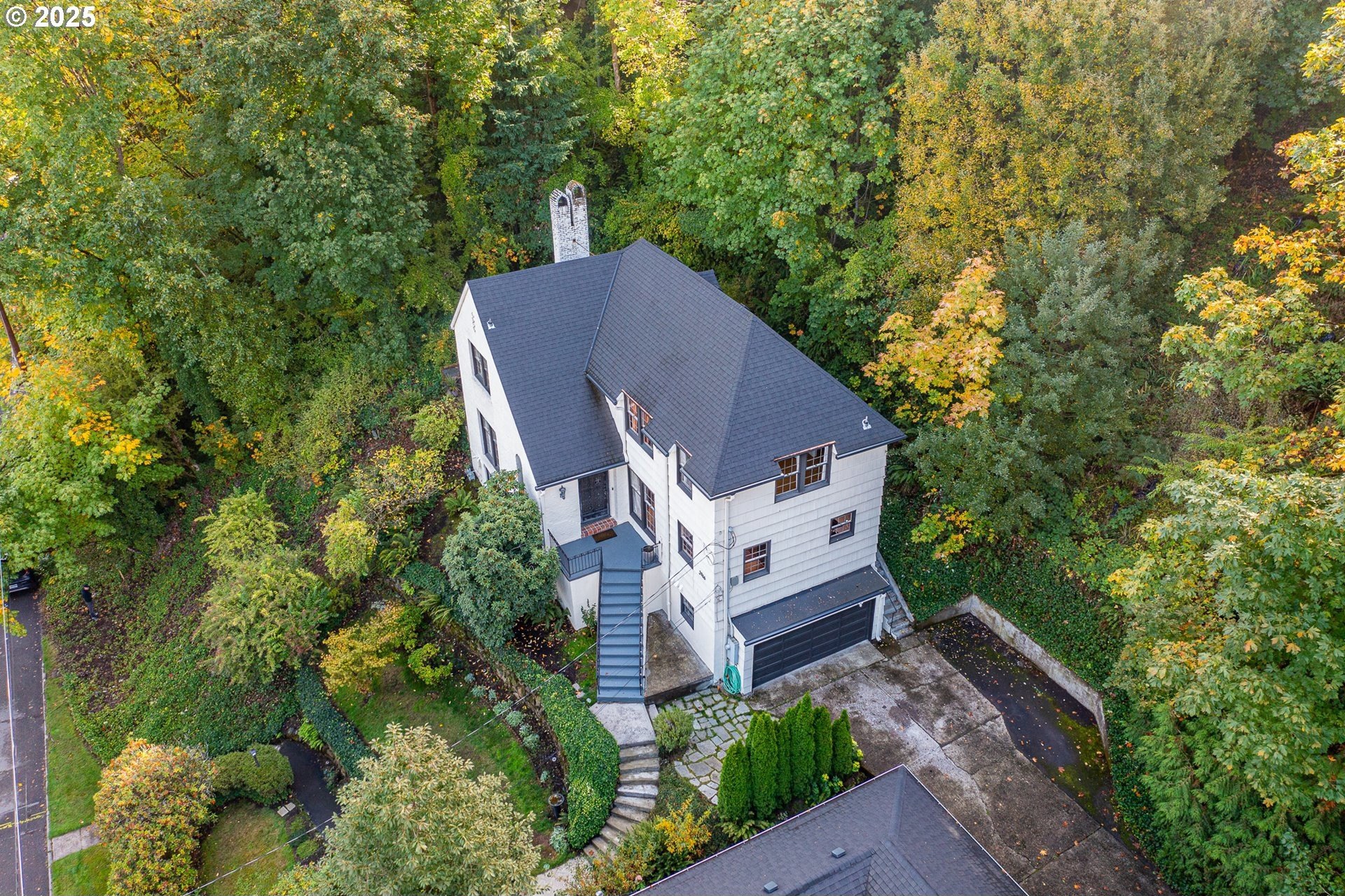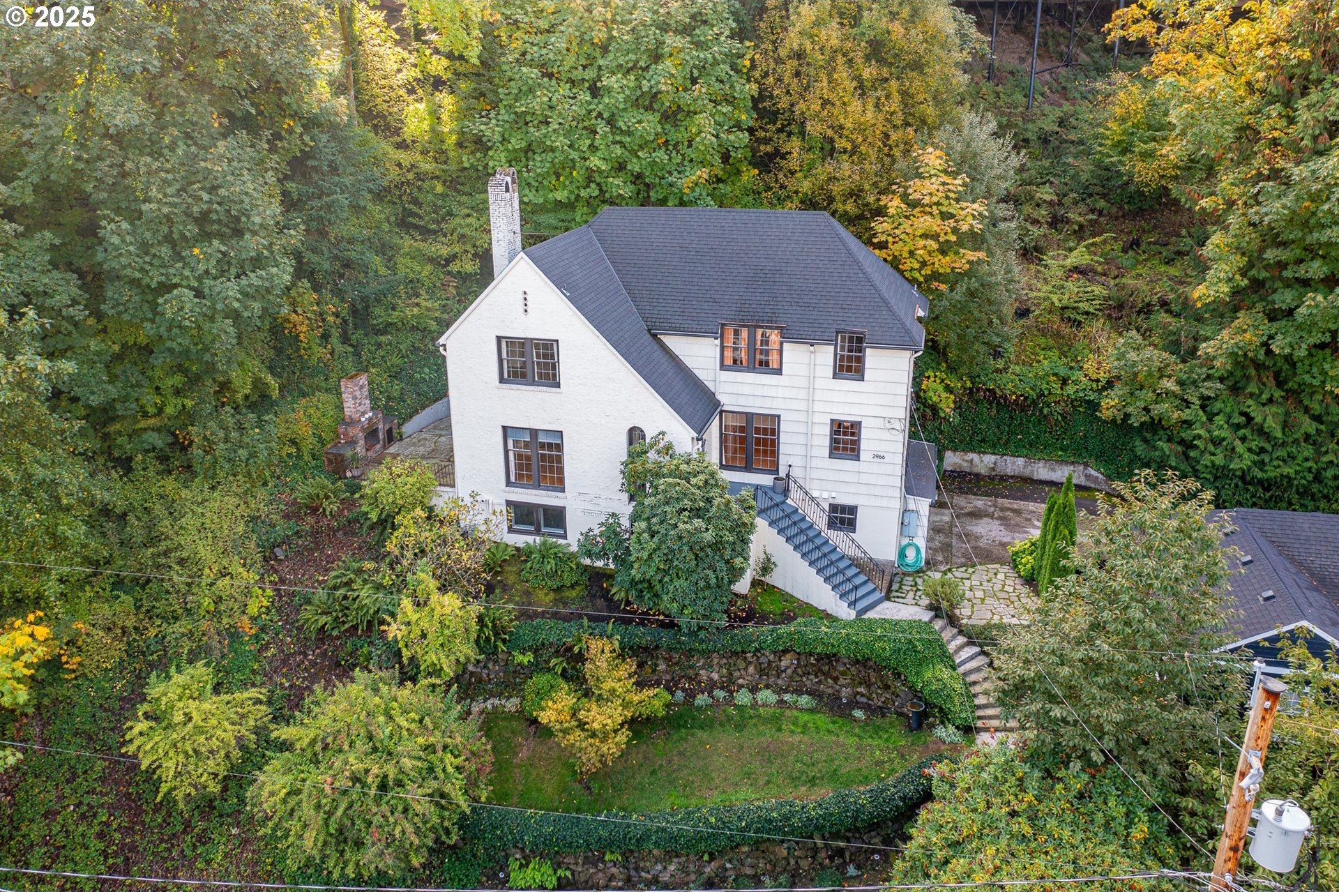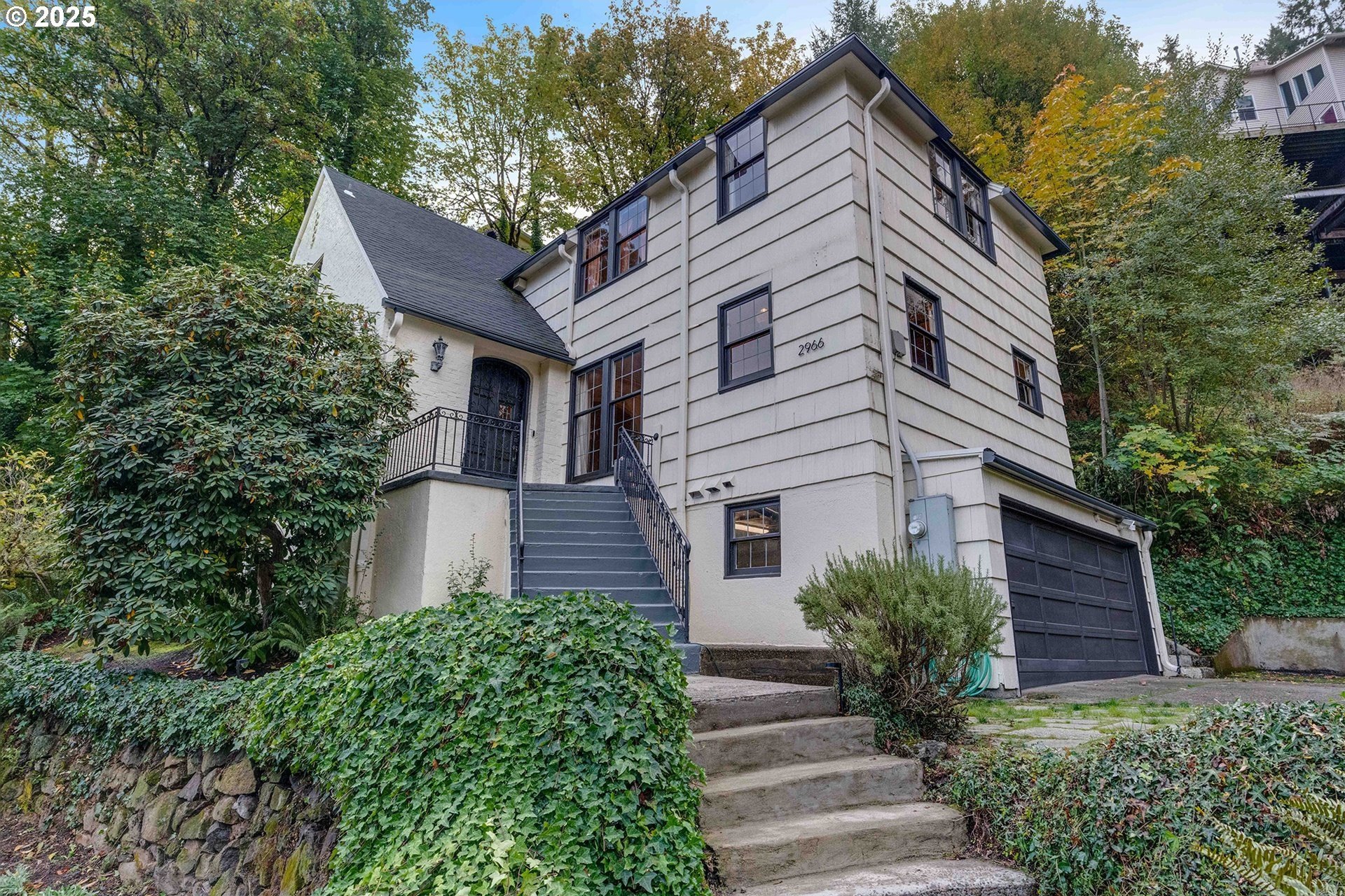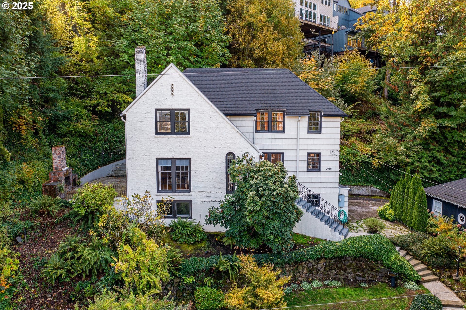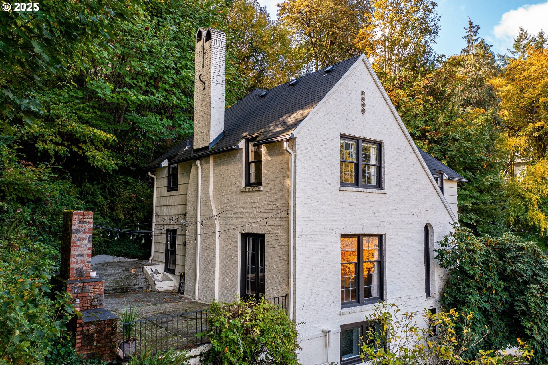 Perched on a picturesque Portland hillside with sweeping views, this modernized Tudor Revival home perfectly blends timeless charm with refined updates. A welcoming foyer opens to a gracious living room featuring a classic fireplace and elegant arched pass-throughs, highlighting the home’s character and craftsmanship. The updated kitchen is a showpiece with stainless steel appliances, an island for casual dining, and direct access to a private patio—complete with the original brick wood-burning fireplace for cozy outdoor entertaining. A dining area off the kitchen and a convenient half bath complete the main floor. Upstairs, three light-filled bedrooms include an expansive primary suite, with a beautifully updated full bath in the hallway. The lower level offers a guest bedroom with en suite bath, a spacious laundry room, generous storage and utility area, and direct entry to the attached garage. Combining historic appeal with modern livability, this hillside retreat is truly one of Portland’s hidden gems. [Home Energy Score = 4. HES Report at https://rpt.greenbuildingregistry.com/hes/OR10099864]