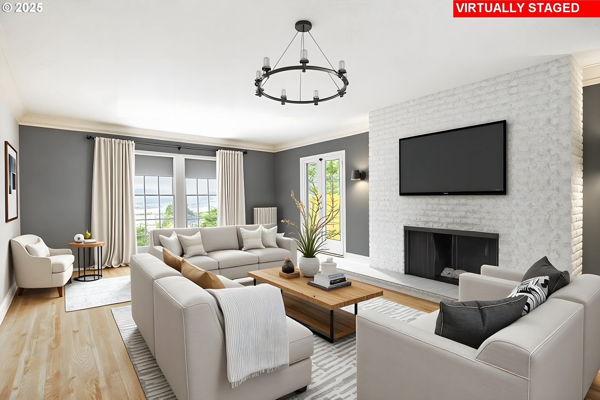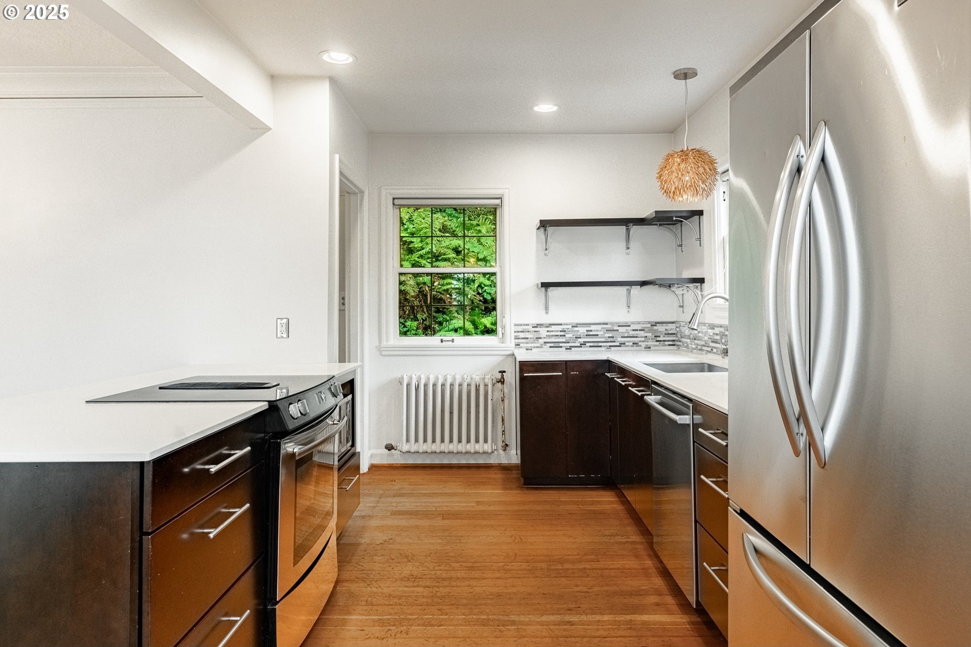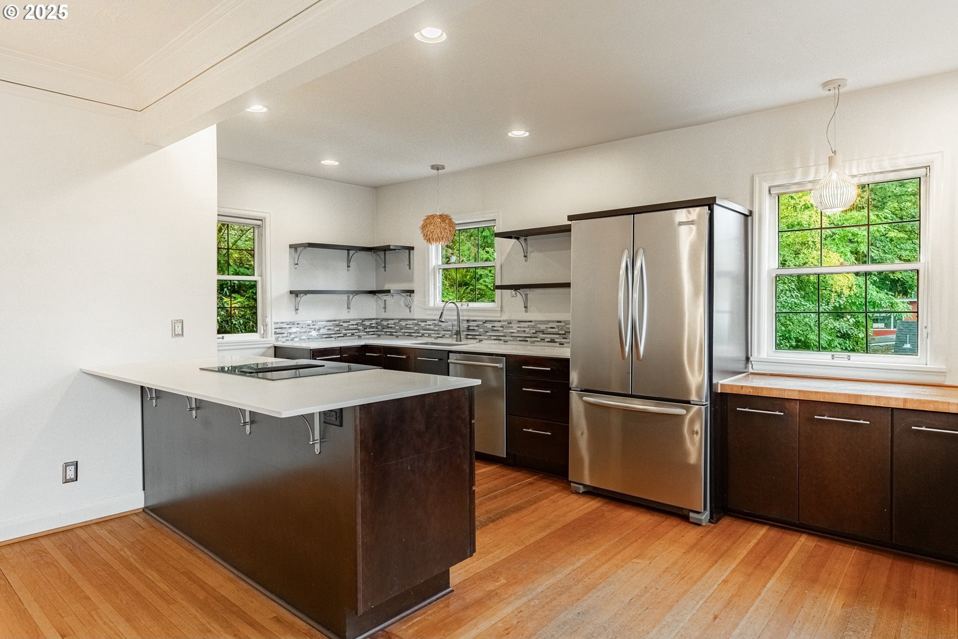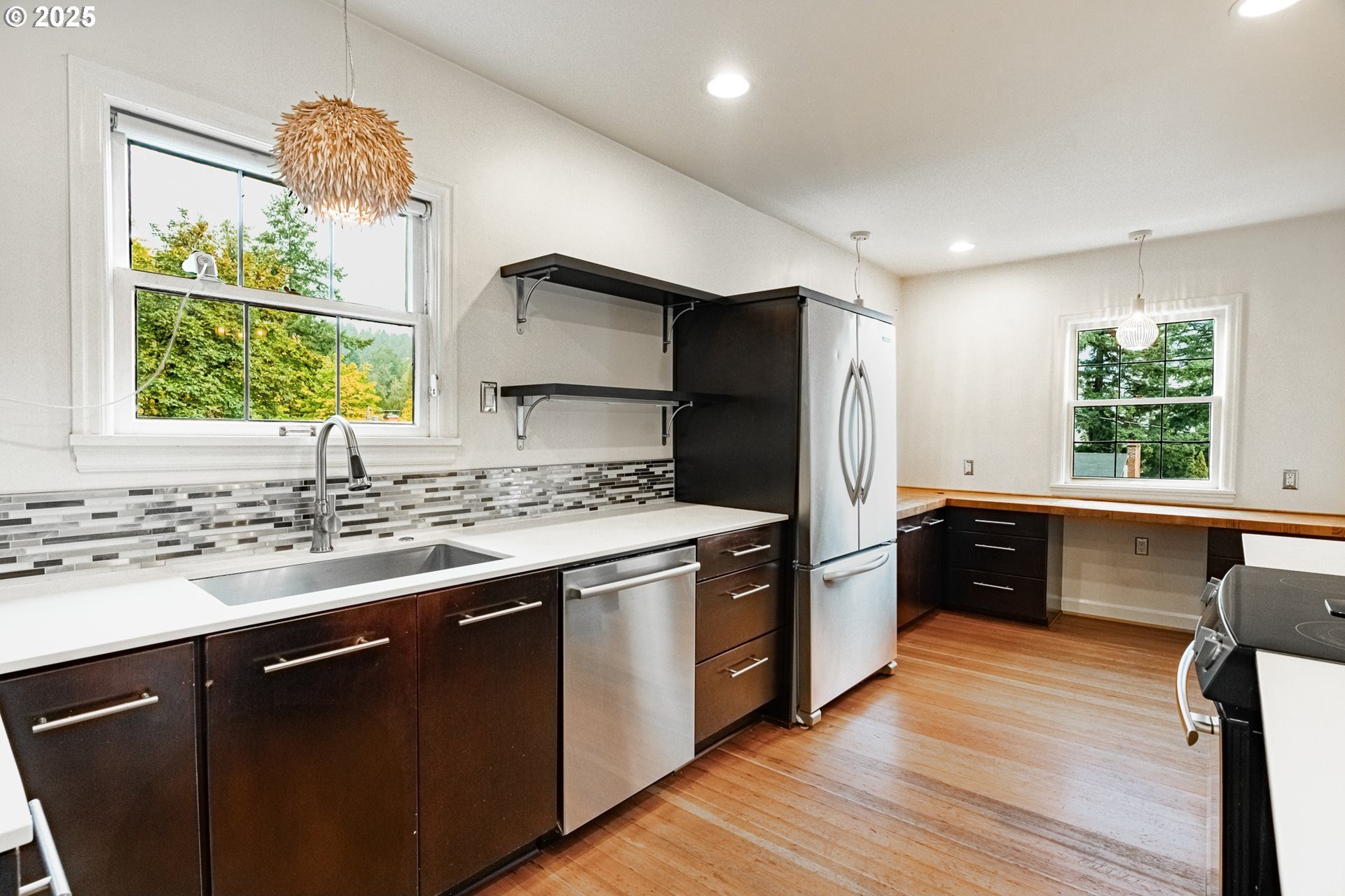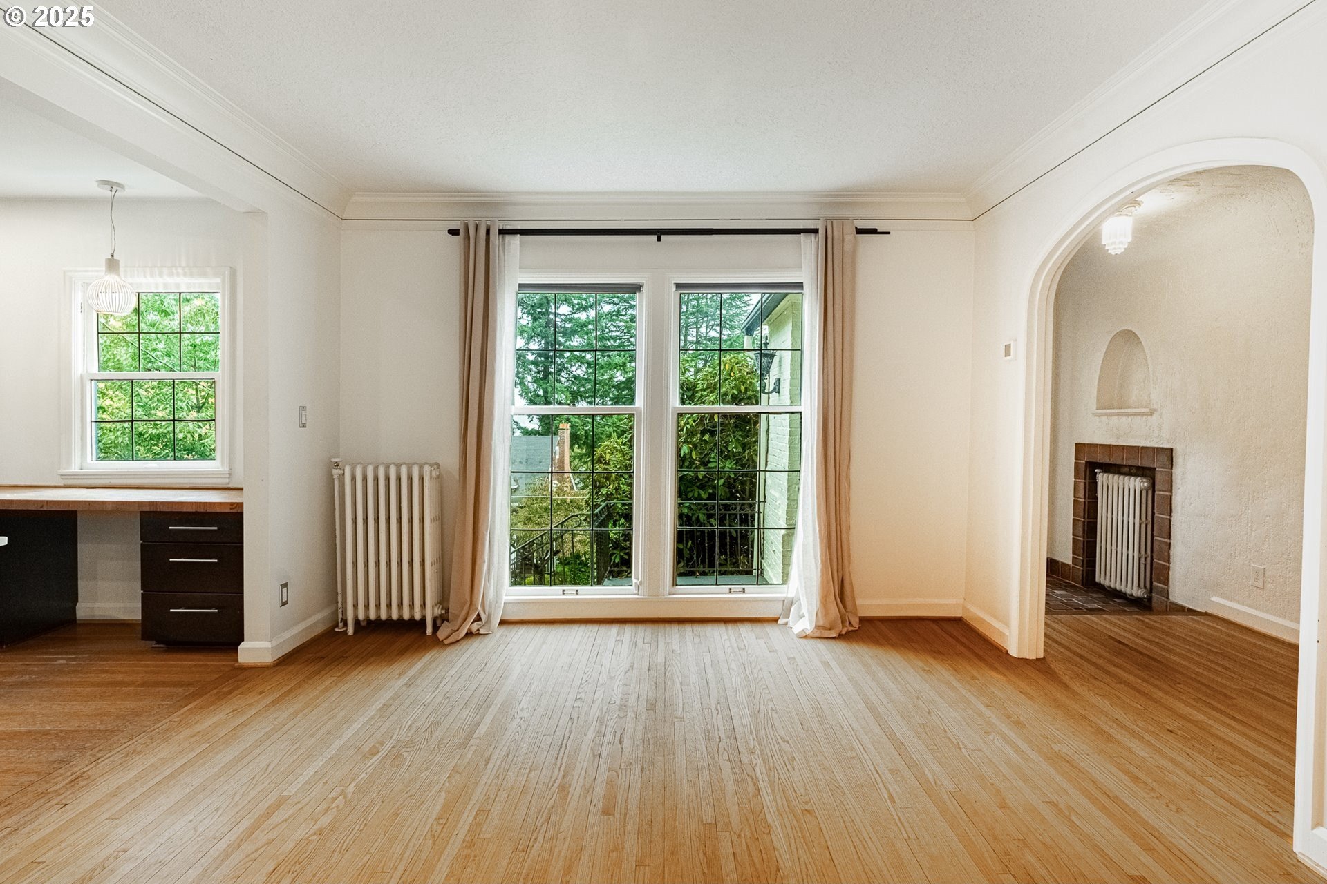 Perched on a picturesque Portland hillside with sweeping views, this modernized Tudor Revival home perfectly blends timeless charm with refined updates. A welcoming foyer opens to a gracious living room featuring a classic fireplace and elegant arched pass-throughs, highlighting the home’s character and craftsmanship. The updated kitchen is a showpiece with stainless steel appliances, an island for casual dining, and direct access to a private patio—complete with the original brick wood-burning fireplace for cozy outdoor entertaining. A dining area off the kitchen and a convenient half bath complete the main floor. Upstairs, three light-filled bedrooms include an expansive primary suite, with a beautifully updated full bath in the hallway. The lower level offers a guest bedroom with en suite bath, a spacious laundry room, generous storage and utility area, and direct entry to the attached garage. Combining historic appeal with modern livability, this hillside retreat is truly one of Portland’s hidden gems. [Home Energy Score = 4. HES Report at https://rpt.greenbuildingregistry.com/hes/OR10099864]