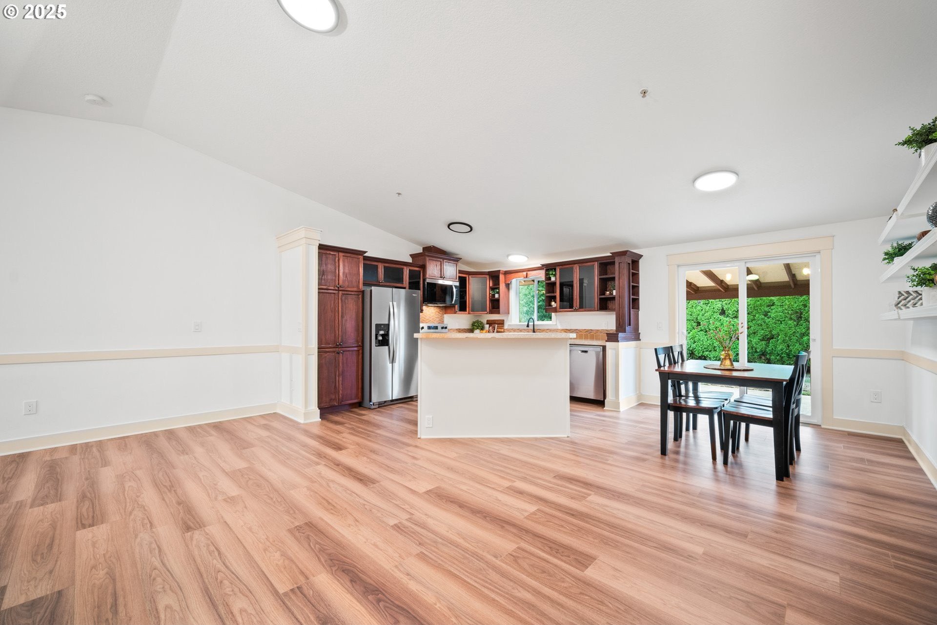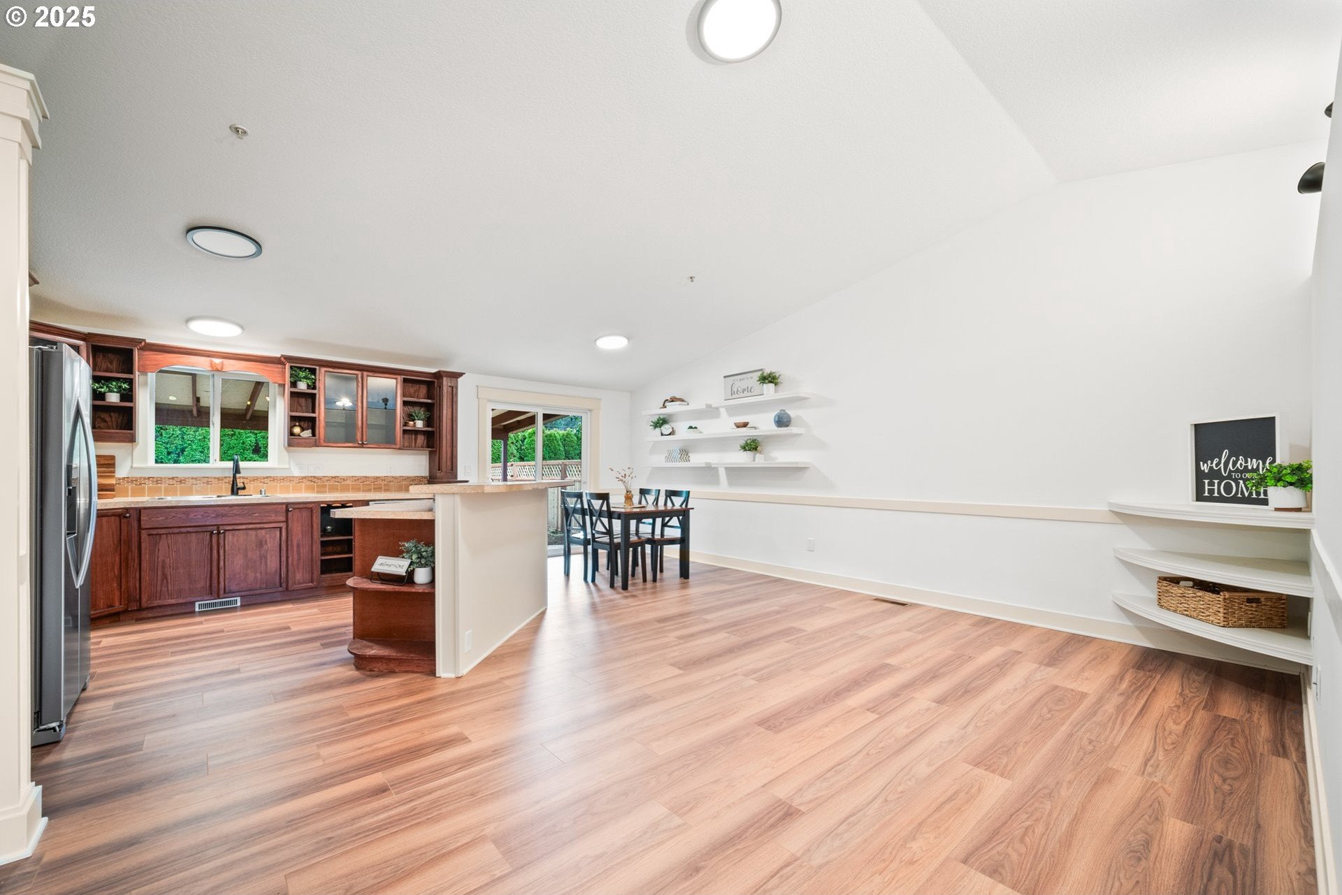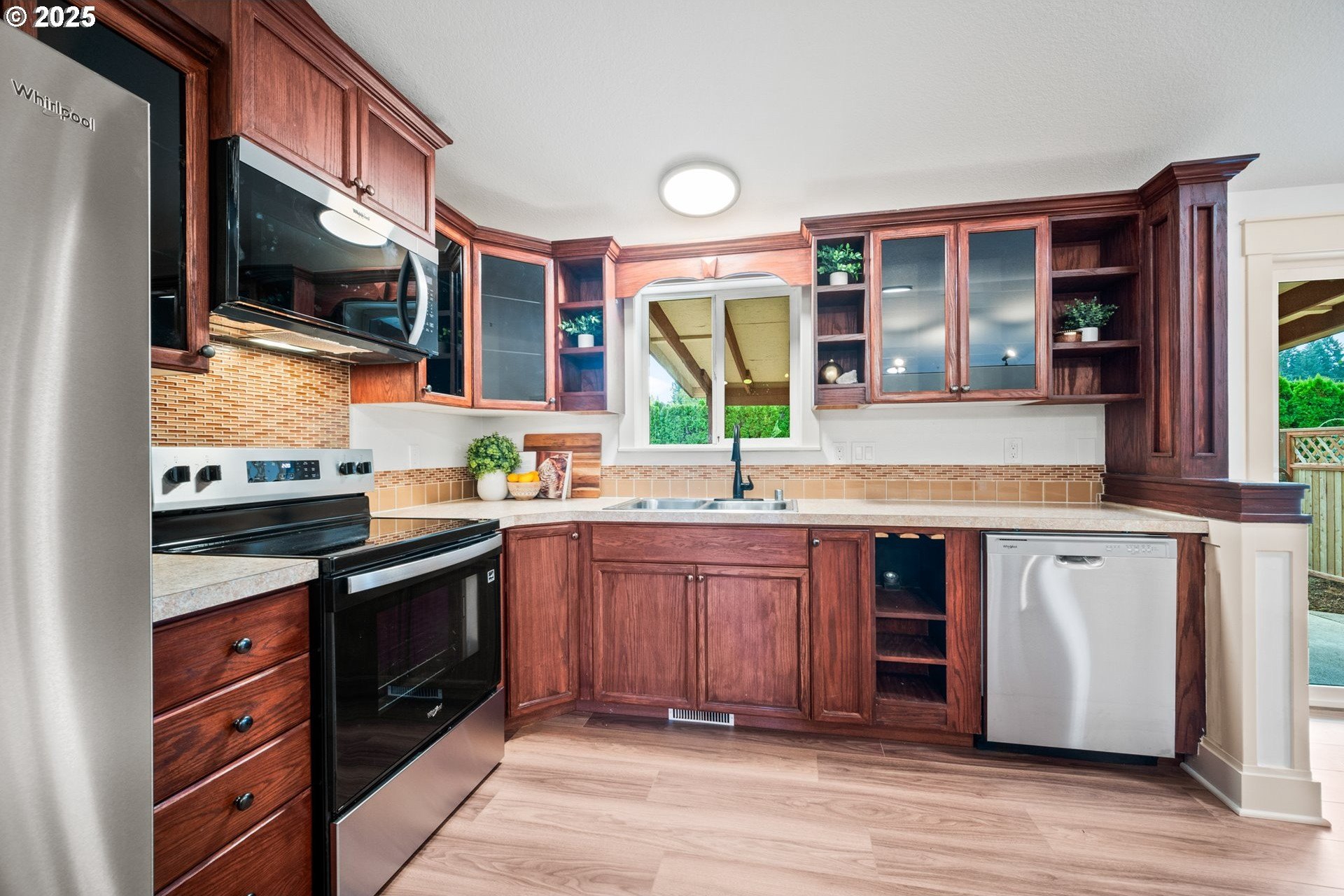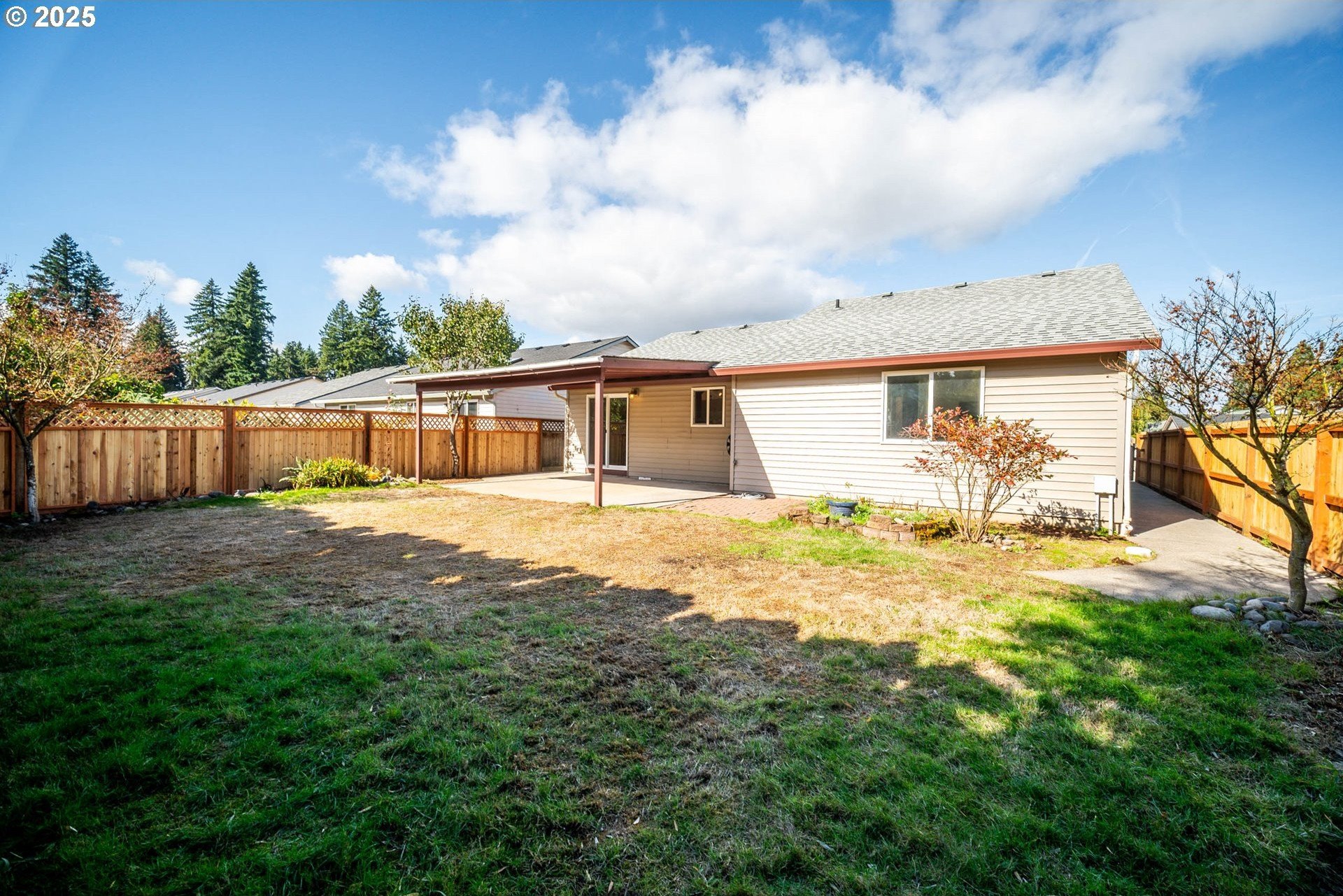 Welcome home to this light and bright single-level charmer! Step inside to find fresh interior paint, vaulted ceilings in the main living areas, and brand-new luxury vinyl flooring throughout. The kitchen features rich cabinetry with ample storage and all new stainless-steel appliances — including a refrigerator, range, microwave, and dishwasher. You’ll love the beautifully updated bathrooms, complete with new vanities, light fixtures, flooring, and toilets. The furnace has been recently serviced, and the home has a built-in interior sprinkler system that provides an added layer of safety. Enjoy the spacious backyard — perfect for entertaining, gardening, or play — featuring a covered patio for year-round enjoyment. The roof was replaced in 2015, offering peace of mind for years to come. With a washer and dryer included, this home is truly move-in ready. This one has it all — comfort, style, and value. Don’t wait — it’s priced to sell and sure to go quickly!