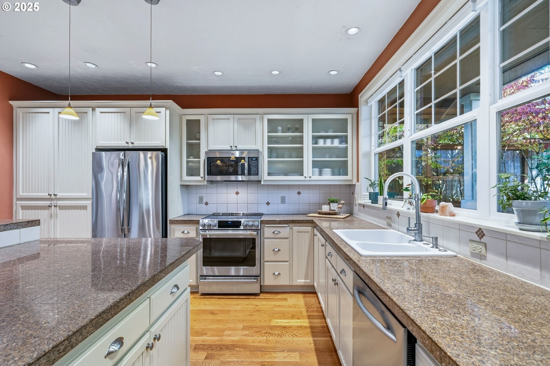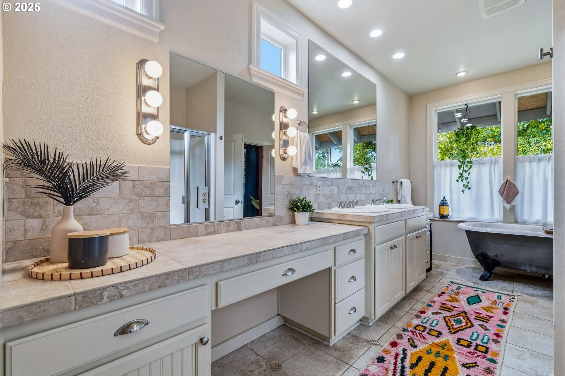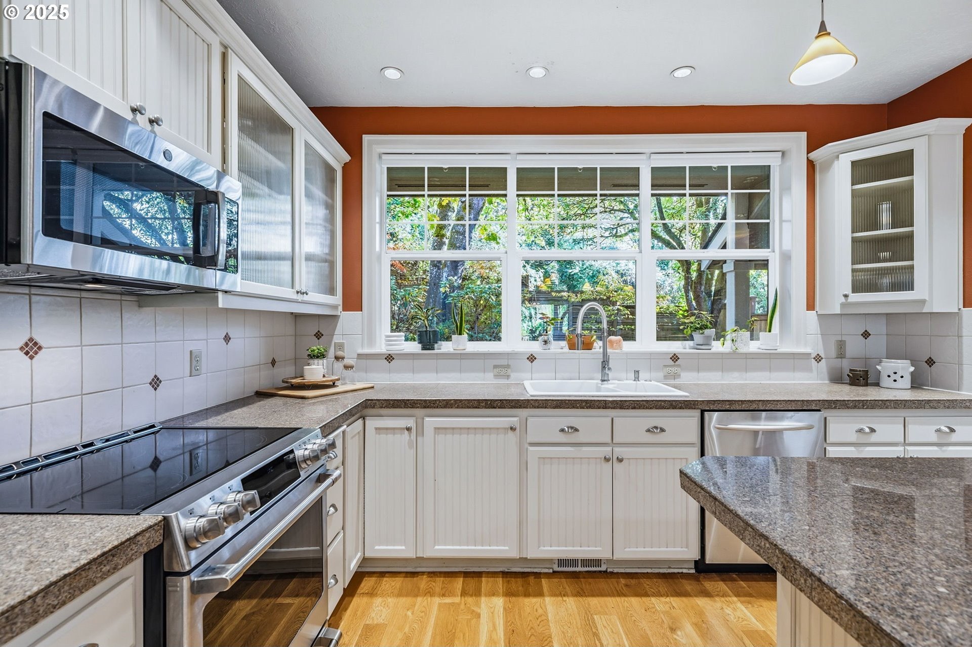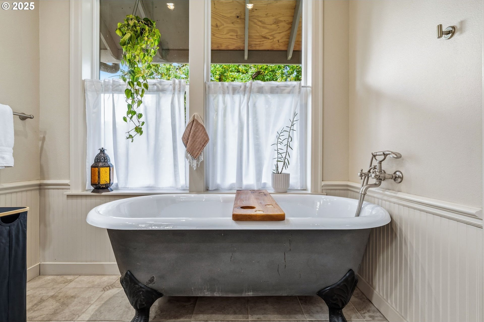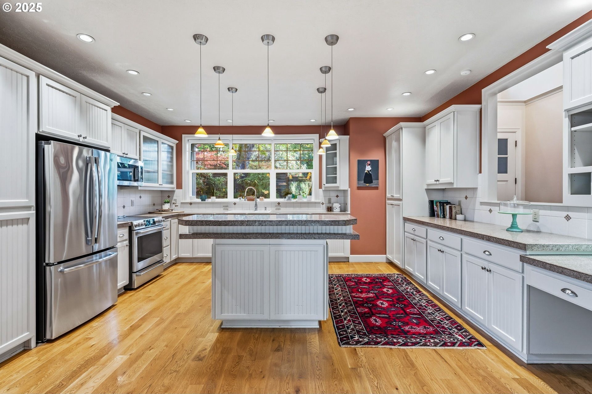 Just blocks to the heart of Multnomah Village! This contemporary craftsman offers equal parts modern convenience and classic charm on an enchanting fenced lot. Thoughtful touches throughout include intricate millwork, large windows, and lustrous hardwoods. The generous open kitchen welcomes cooking and conversation with an island, breakfast bar, built-in desk, modern appliances, and lots of light. The airy formal dining room leads to an impressive great room with soaring vaulted ceilings, gas fireplace, and slider out to the spacious deck. Deluxe primary suite on the main floor! The plush bedroom offers more vaulted ceilings, stylish design, a private door out to the deck, and dream en suite bathroom with double sinks, vanity, clawfoot tub, and walk-in closet. Endless possibilities for work and play upstairs with two additional bedrooms, open loft, bonus room, flex space, and lots of storage. Beautifully tiered backyard that flows from deck to patio to flat grassy area, all surrounded by established landscaping. Attached two-car garage. Just minutes to the best dining, shopping, and entertainment in Multnomah Village. Ask for features list! Updated HVAC, roof, water heater, appliances! [Home Energy Score = 5. HES Report at https://rpt.greenbuildingregistry.com/hes/OR10144915]