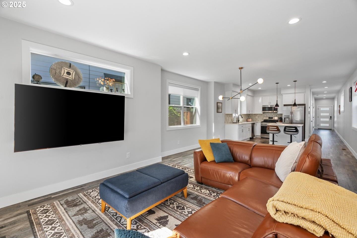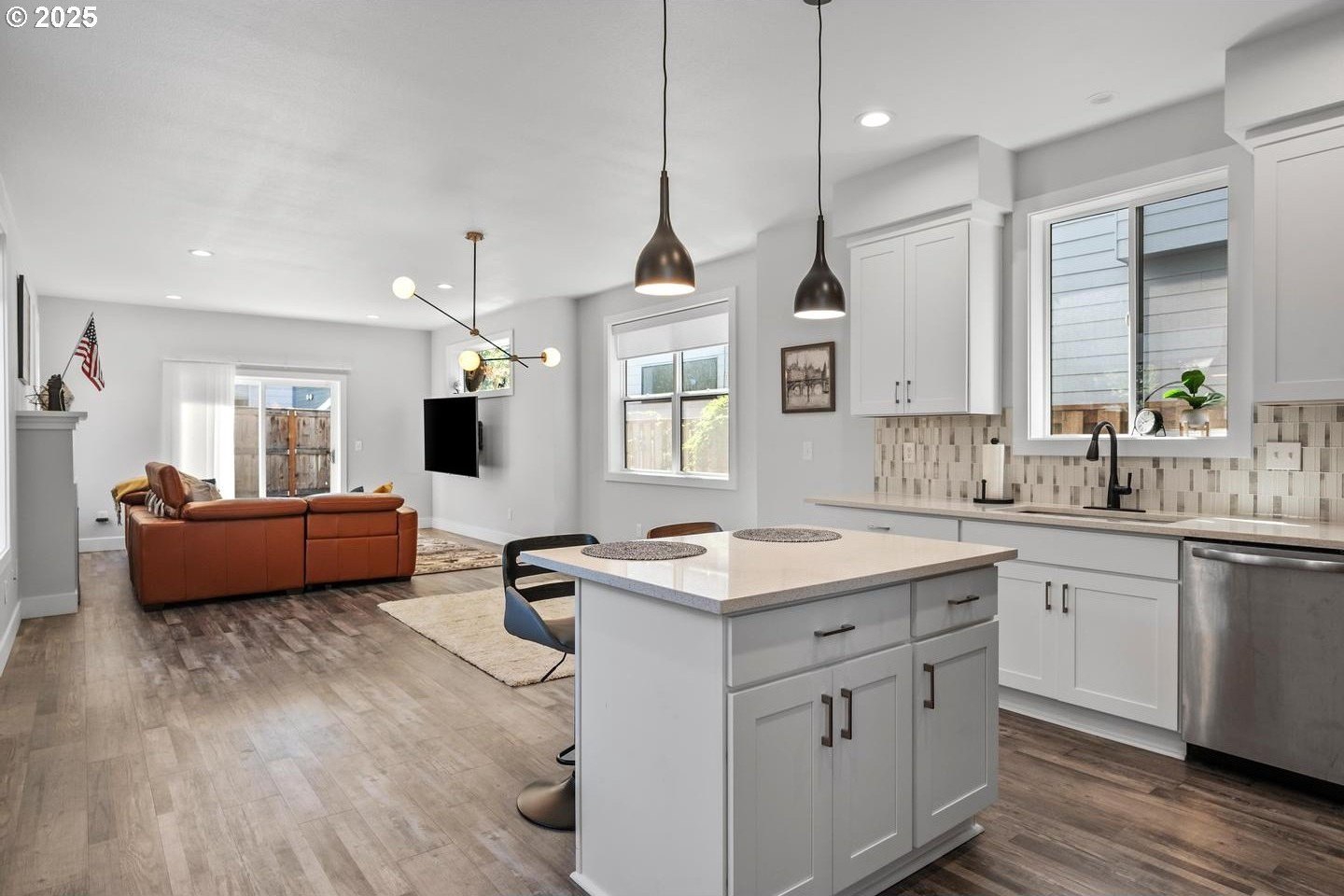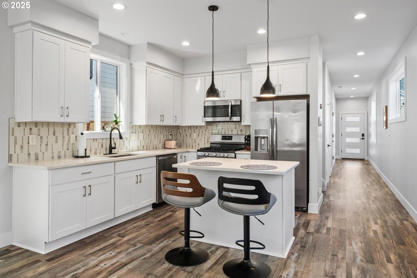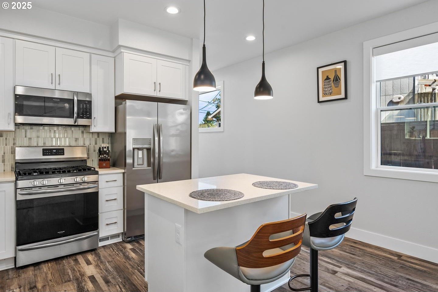 Step into elevated Portland living: thoughtfully designed, beautifully maintained, and perfectly placed in the heart of Brentwood-Darlington. Welcome home to 5424 SE Knapp Street—a light-filled retreat where modern comfort meets vibrant community.From the moment you enter, soaring ceilings and an open floor plan create a sense of space and ease. Natural light pours through oversized windows, highlighting fresh landscaping in both the front and back yards, while a cozy fireplace adds warmth and charm to the living area. The seamless flow from the kitchen to dining to living spaces makes this home as functional as it is inviting—ideal for both everyday living and entertaining.The kitchen features a generous island, quartz countertops, stainless steel appliances, and stylish fixtures, designed to bring people together in the heart of the home. Upstairs, the spacious primary suite offers a peaceful retreat with vaulted ceilings, a walk-in closet, and an en suite bathroom with dual vanities. Two additional bedrooms, a full guest bath, and convenient upstairs laundry add flexibility for family, guests, or a home office.Step outside to enjoy your private fenced backyard—perfect for summer BBQs, gardening, or simply unwinding in your own outdoor oasis. Professional landscaping ensures beauty and curb appeal year-round.Located in one of Portland’s most connected neighborhoods, this home boasts a 96 Bike Score and puts you just blocks from Woodstock shops, coffee houses, restaurants, parks, and community amenities. With quick access to downtown and nearby nature escapes like Mt. Tabor and Oaks Bottom Wildlife Refuge, you’ll enjoy the best of both urban convenience and outdoor lifestyle.Don’t miss this one—5424 SE Knapp Street offers the unbeatable blend of style, comfort, and community you’ve been searching for.