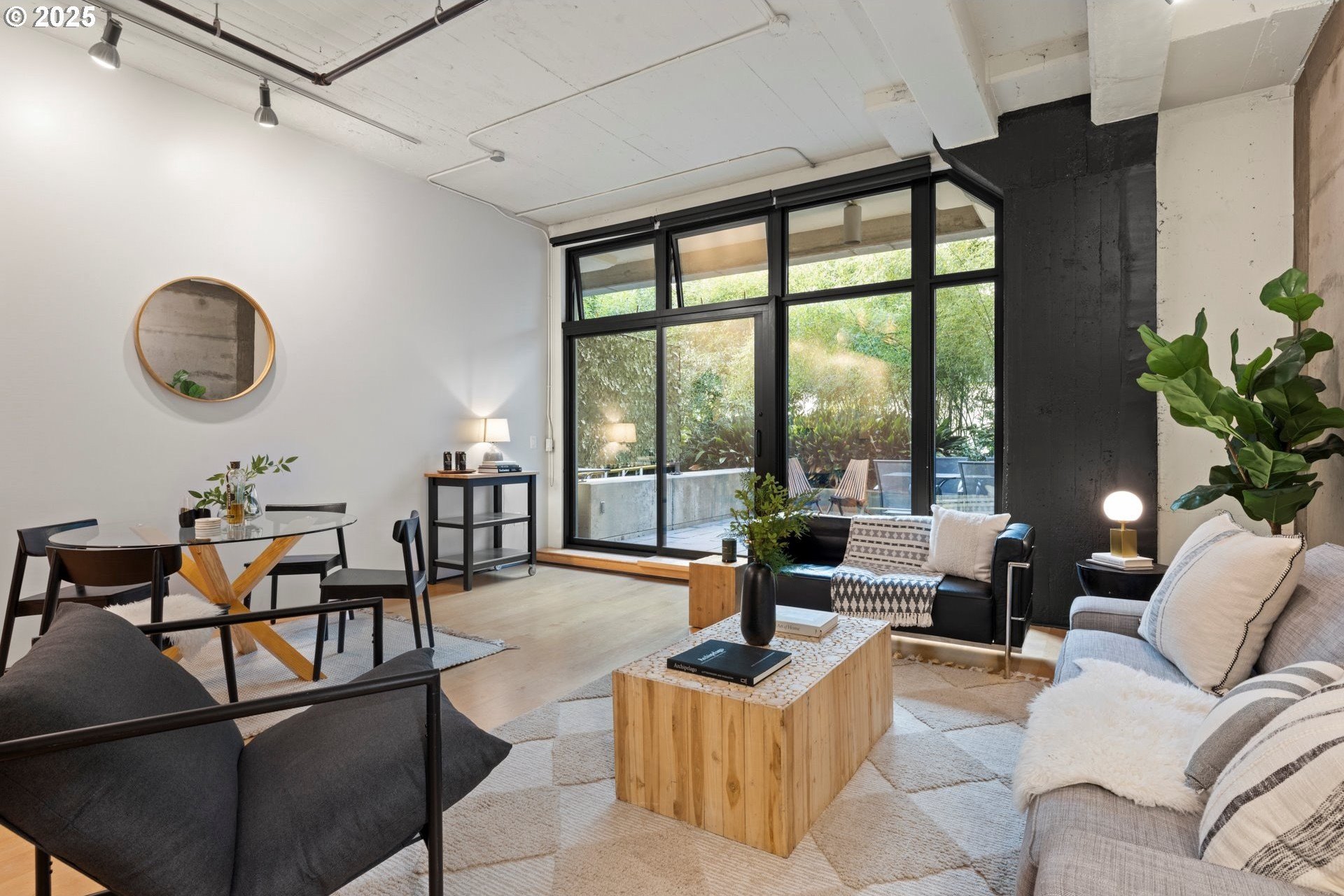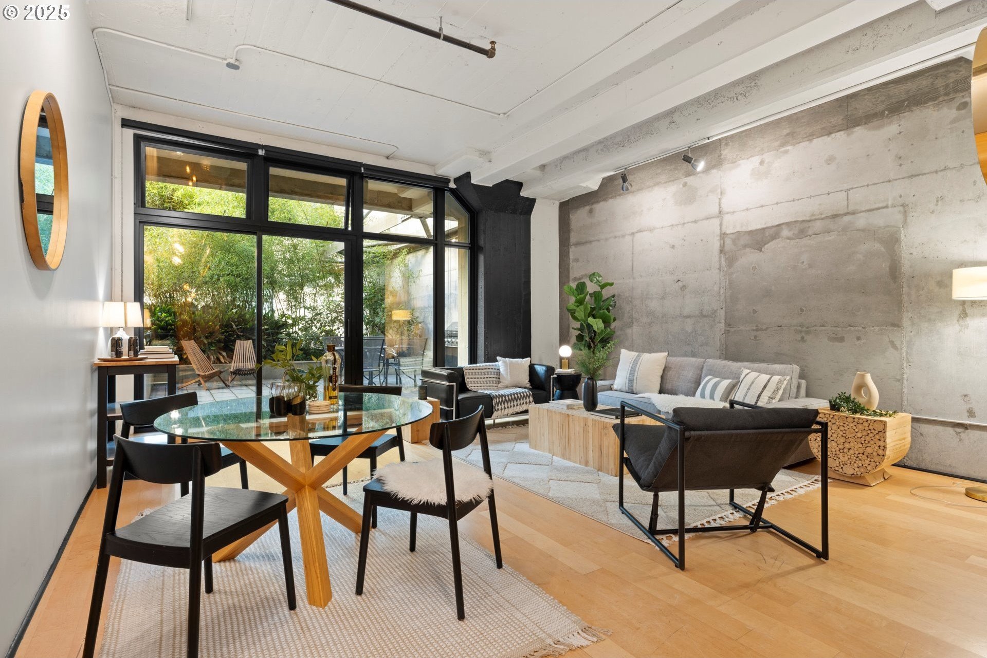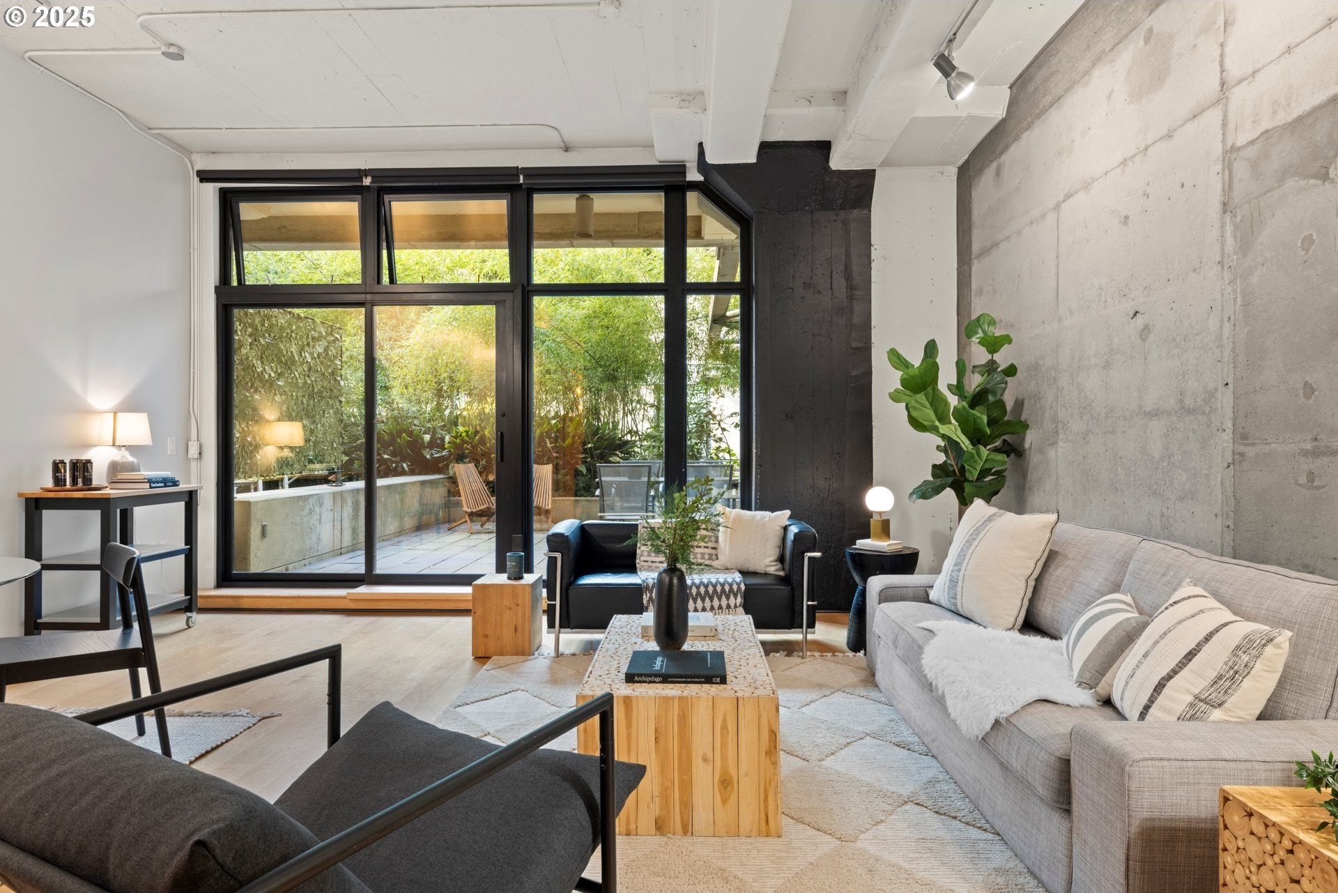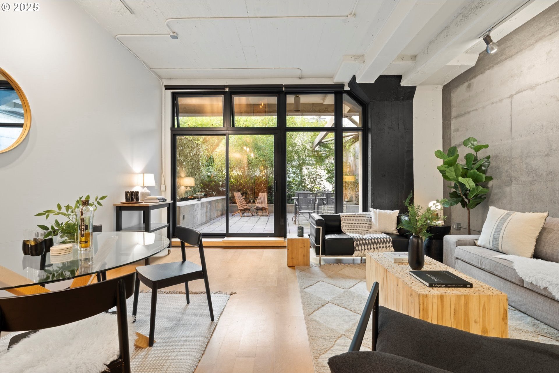Stylish condo blends industrial character with contemporary comfort. Gorgeous hardwood floors, soaring ceilings, and a dramatic floor-to-ceiling window fill the space with light and open to a private 300-square-foot patio, ideal for entertaining or relaxing under the city sky. The bedroom’s reclaimed old-growth hardwood detailing adds warmth and craftsmanship, while the 2024 bathroom renovation impresses with a custom vanity, abundant storage, Calacatta marble folding station with drying rack, newer washer and dryer and custom-tiled bath surround that makes the most of every inch. Deeded parking and a spacious storage unit complete the package. Ask your agent about kitchen tile backsplash and Blazer ticket incentive! Damian Lillard is back, and so is your chance to live stylishly in the heart of the Pearl! Scoot, bike, walk, ride to shopping, and all the best of city life—this is Portland living at its finest.