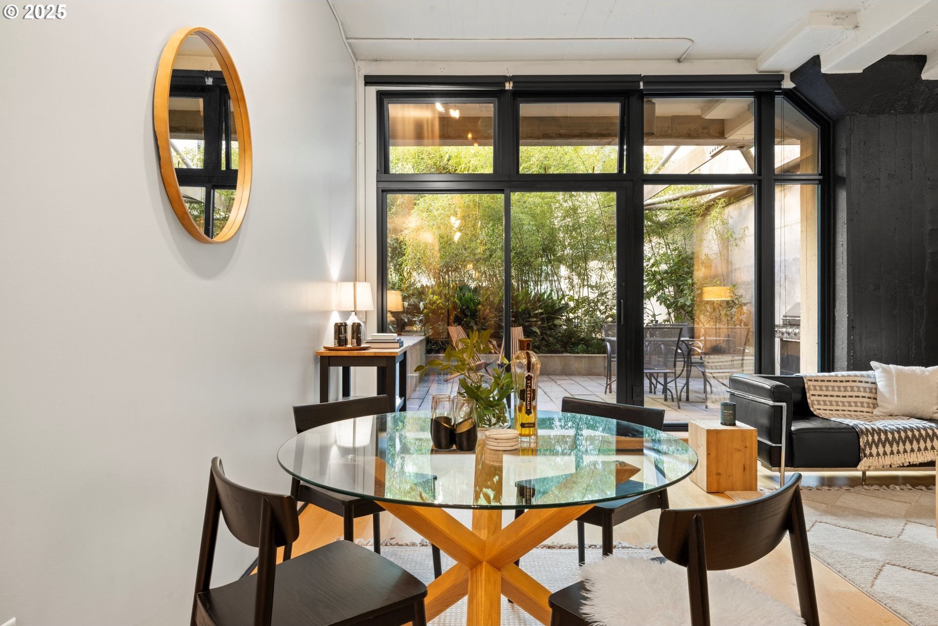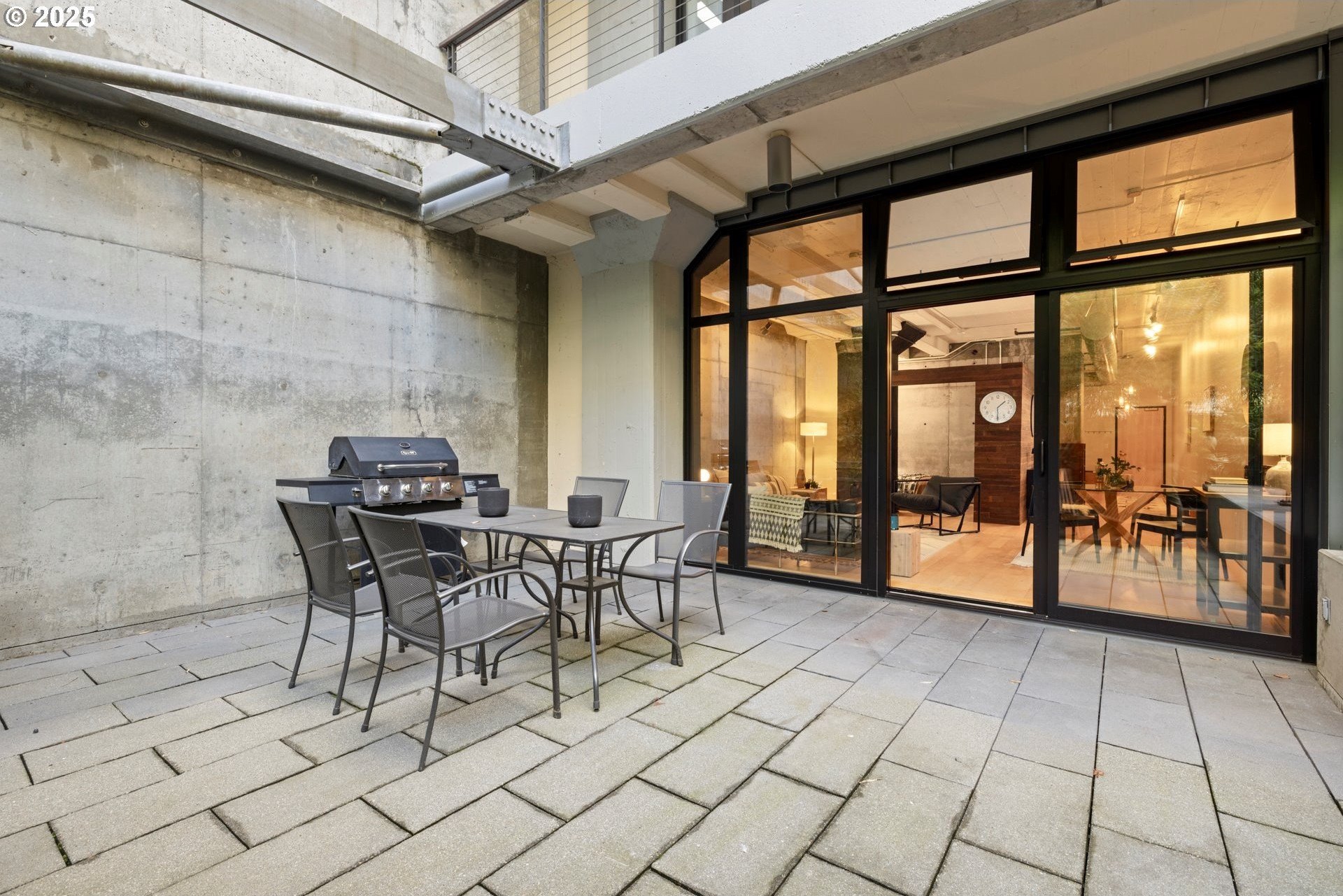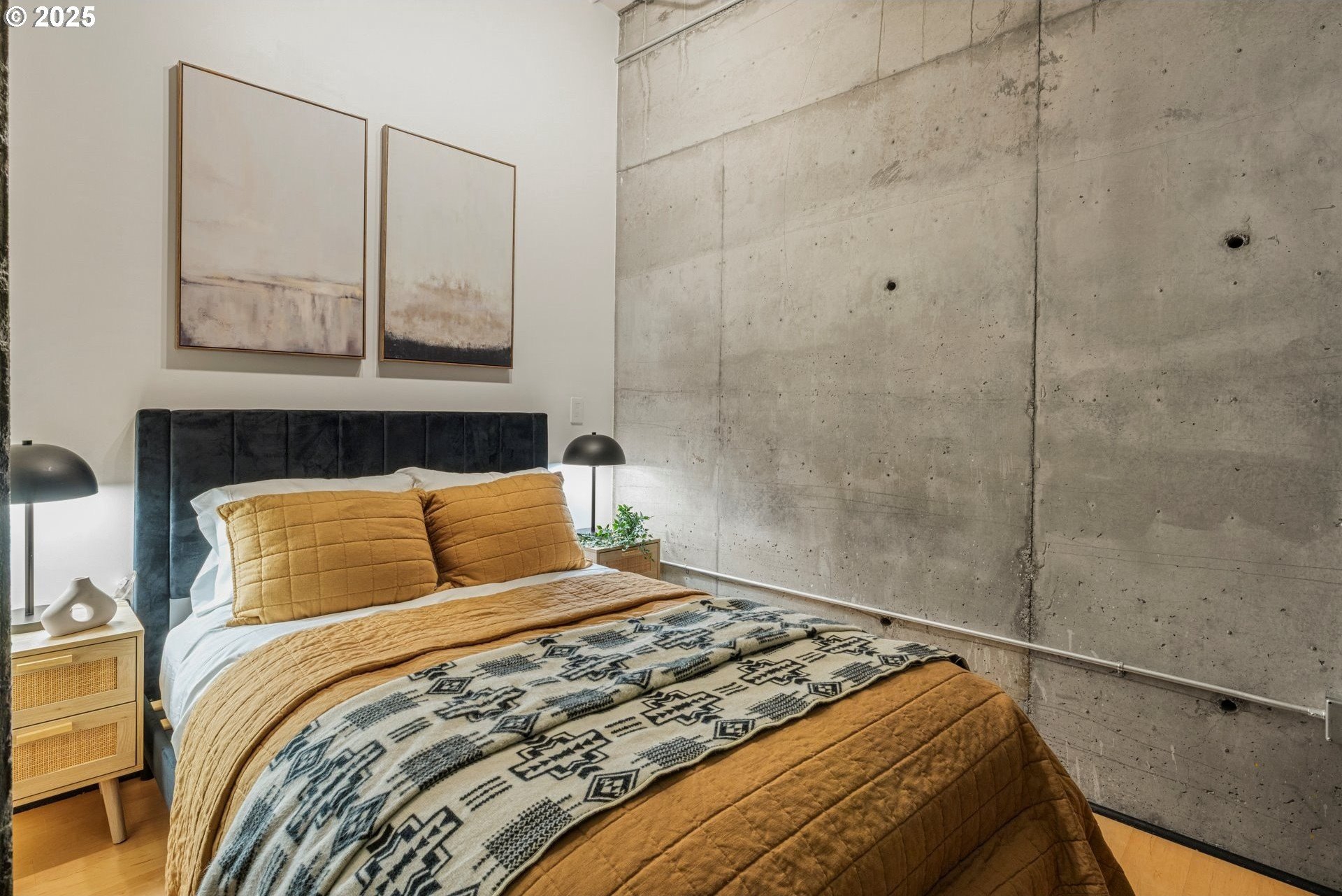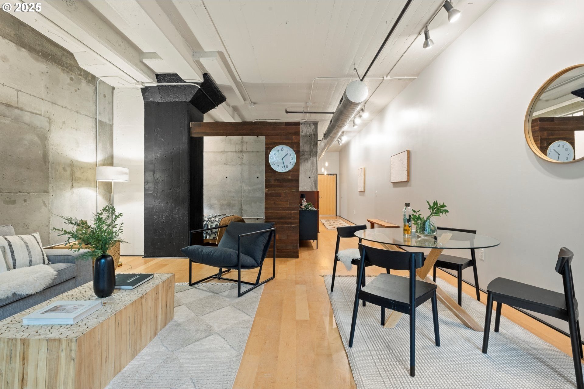 Stylish condo blends industrial character with contemporary comfort. Gorgeous hardwood floors, soaring ceilings, and a dramatic floor-to-ceiling window fill the space with light and open to a private 300-square-foot patio, ideal for entertaining or relaxing under the city sky. The bedroom’s reclaimed old-growth hardwood detailing adds warmth and craftsmanship, while the 2024 bathroom renovation impresses with a custom vanity, abundant storage, Calacatta marble folding station with drying rack, newer washer and dryer and custom-tiled bath surround that makes the most of every inch. Deeded parking and a spacious storage unit complete the package. Ask your agent about kitchen tile backsplash and Blazer ticket incentive! Damian Lillard is back, and so is your chance to live stylishly in the heart of the Pearl! Scoot, bike, walk, ride to shopping, and all the best of city life—this is Portland living at its finest.
