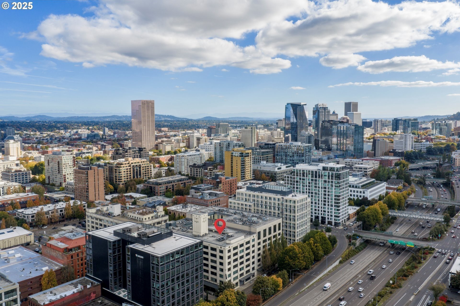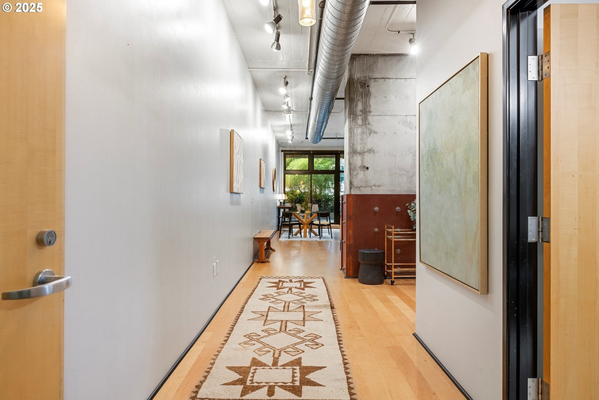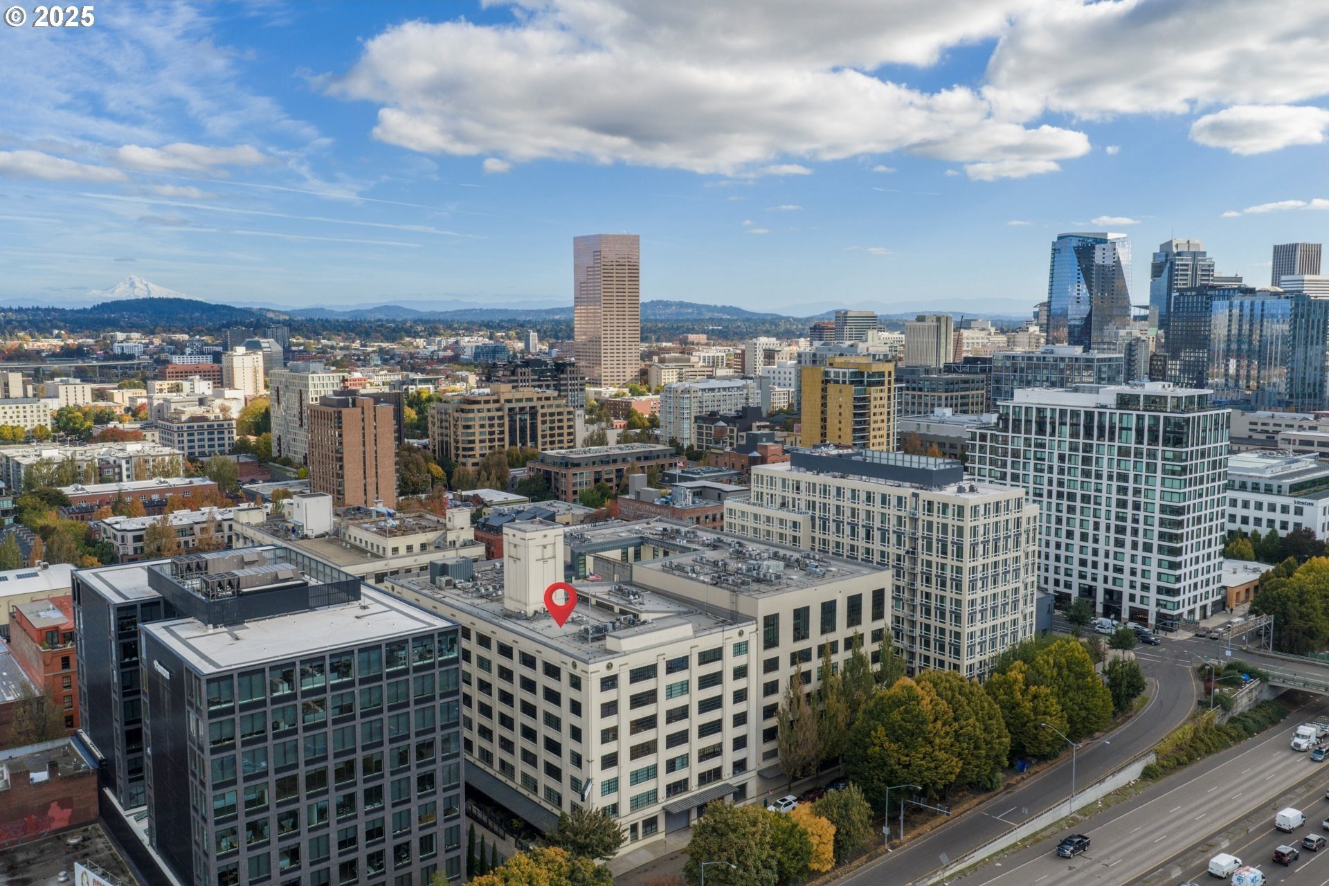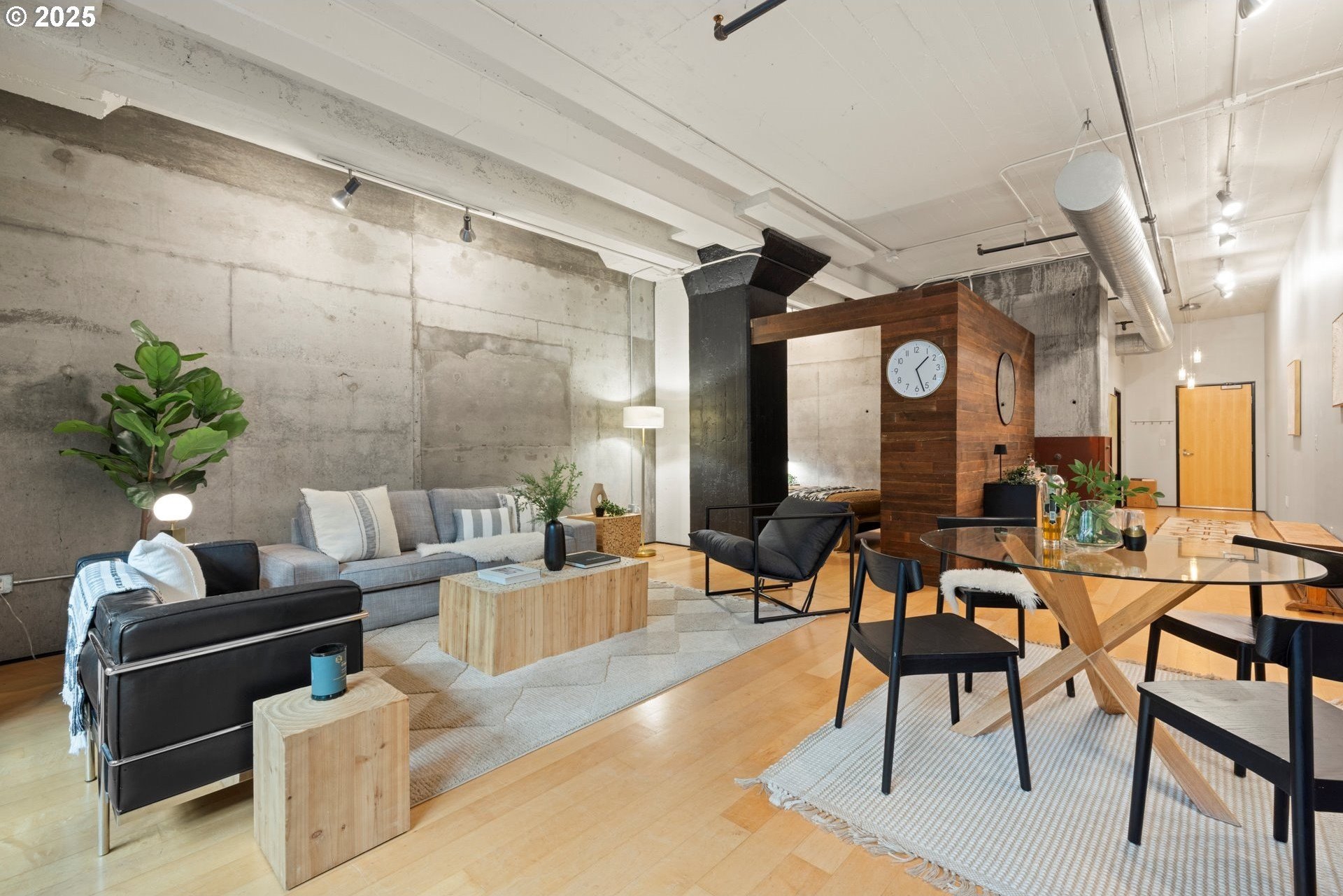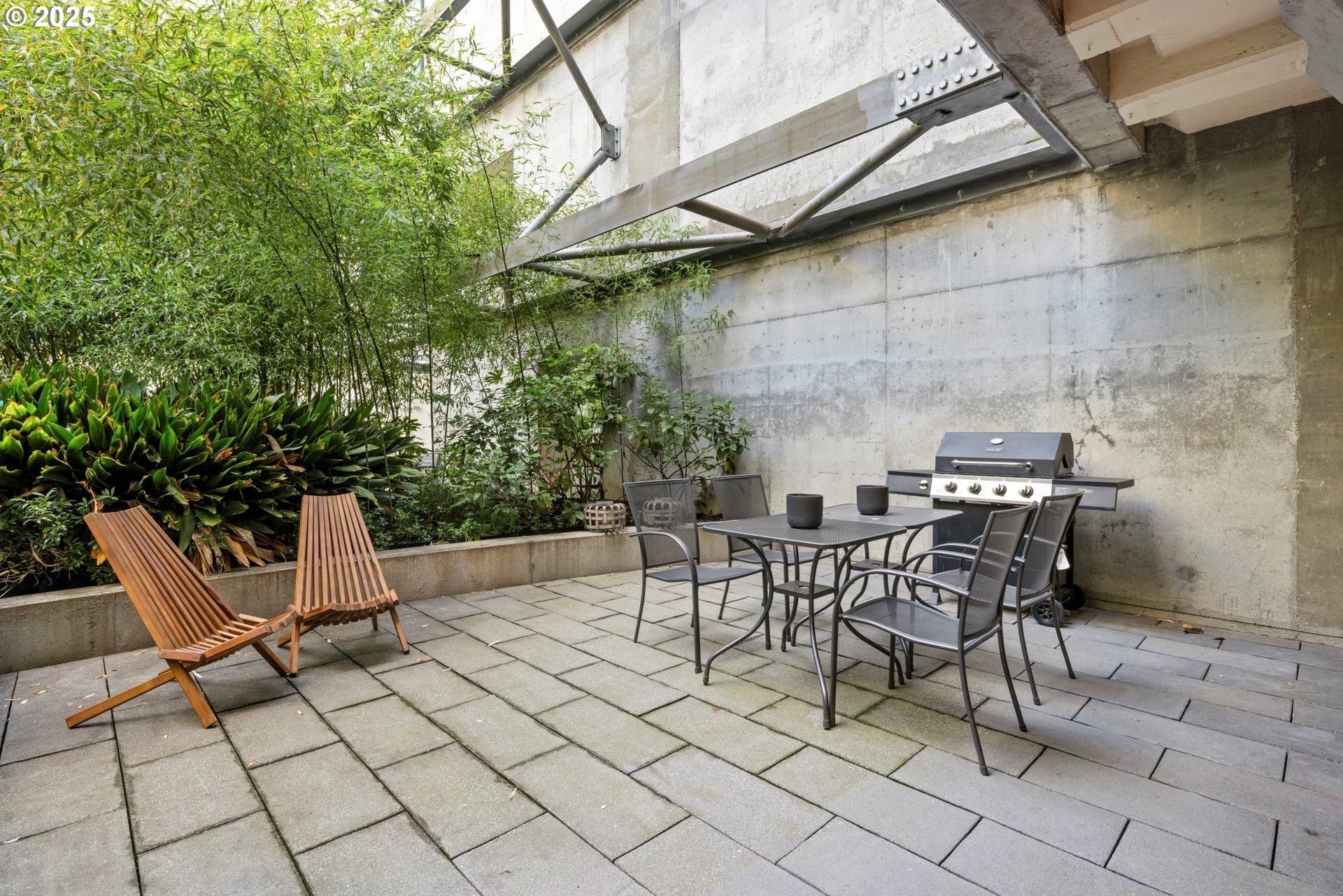 Stylish condo blends industrial character with contemporary comfort. Gorgeous hardwood floors, soaring ceilings, and a dramatic floor-to-ceiling window fill the space with light and open to a private 300-square-foot patio, ideal for entertaining or relaxing under the city sky. The bedroom’s reclaimed old-growth hardwood detailing adds warmth and craftsmanship, while the 2024 bathroom renovation impresses with a custom vanity, abundant storage, Calacatta marble folding station with drying rack, newer washer and dryer and custom-tiled bath surround that makes the most of every inch. Deeded parking and a spacious storage unit complete the package. Ask your agent about kitchen tile backsplash and Blazer ticket incentive! Damian Lillard is back, and so is your chance to live stylishly in the heart of the Pearl! Scoot, bike, walk, ride to shopping, and all the best of city life—this is Portland living at its finest.