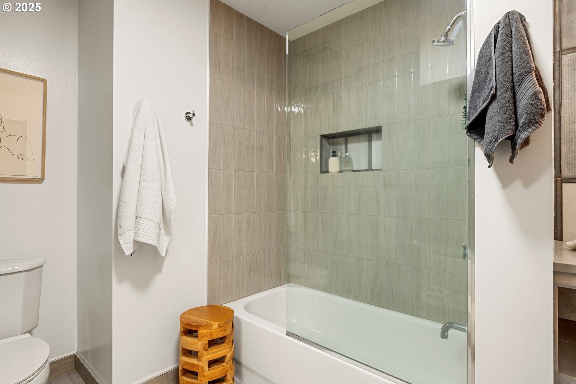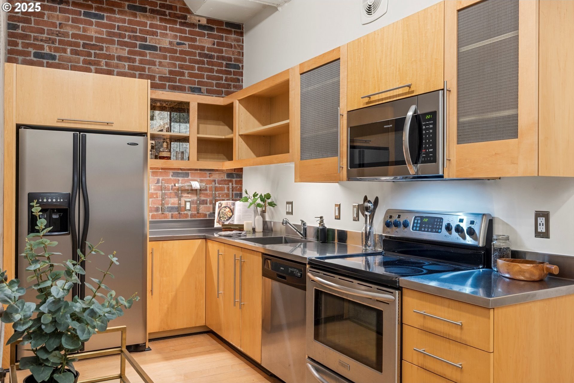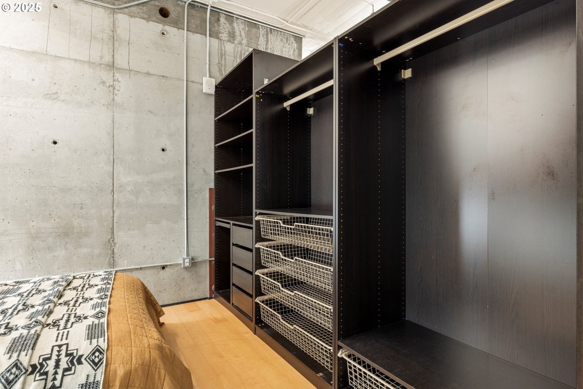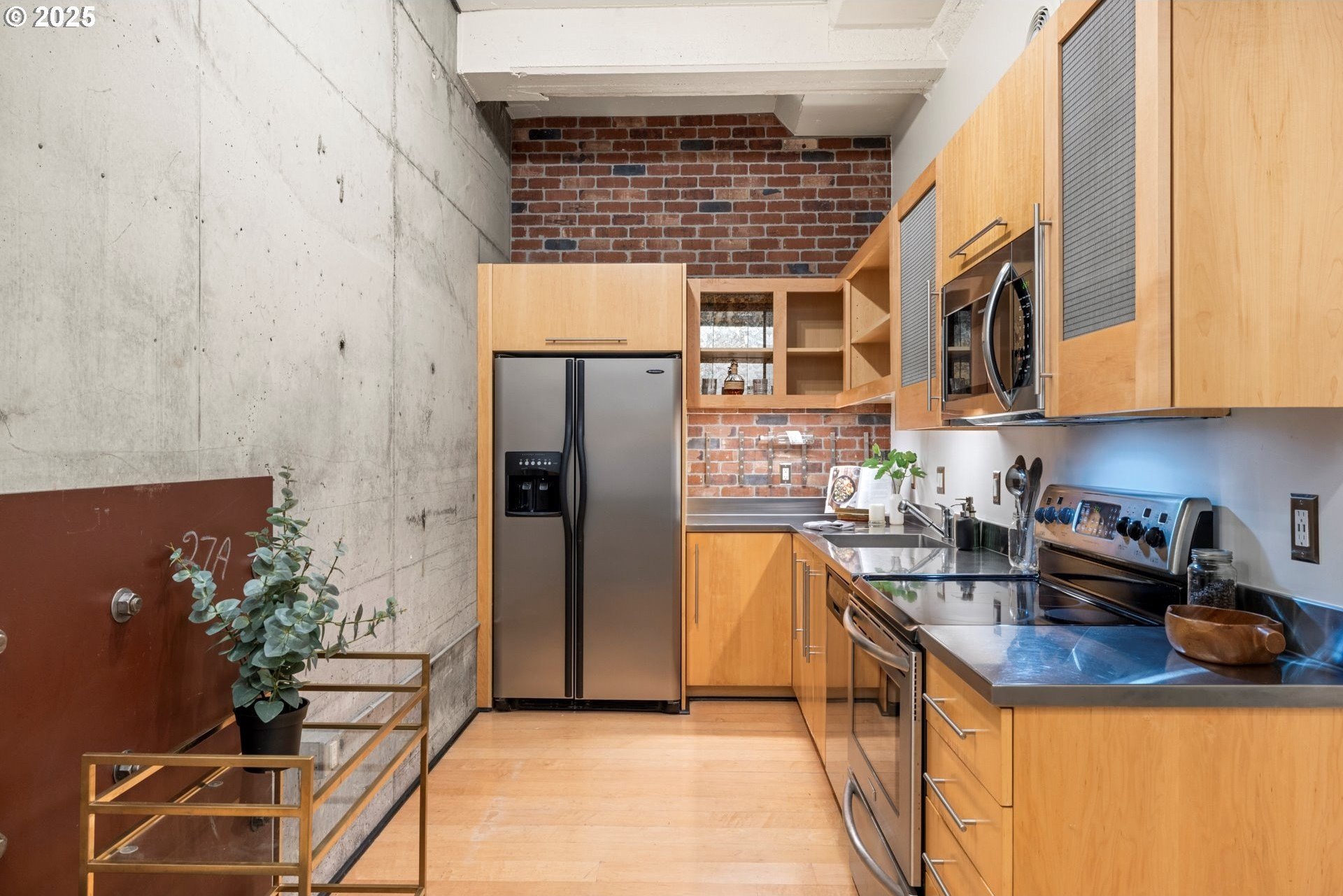 Stylish condo blends industrial character with contemporary comfort. Gorgeous hardwood floors, soaring ceilings, and a dramatic floor-to-ceiling window fill the space with light and open to a private 300-square-foot patio, ideal for entertaining or relaxing under the city sky. The bedroom’s reclaimed old-growth hardwood detailing adds warmth and craftsmanship, while the 2024 bathroom renovation impresses with a custom vanity, abundant storage, Calacatta marble folding station with drying rack, newer washer and dryer and custom-tiled bath surround that makes the most of every inch. Deeded parking and a spacious storage unit complete the package. Ask your agent about kitchen tile backsplash and Blazer ticket incentive! Damian Lillard is back, and so is your chance to live stylishly in the heart of the Pearl! Scoot, bike, walk, ride to shopping, and all the best of city life—this is Portland living at its finest.