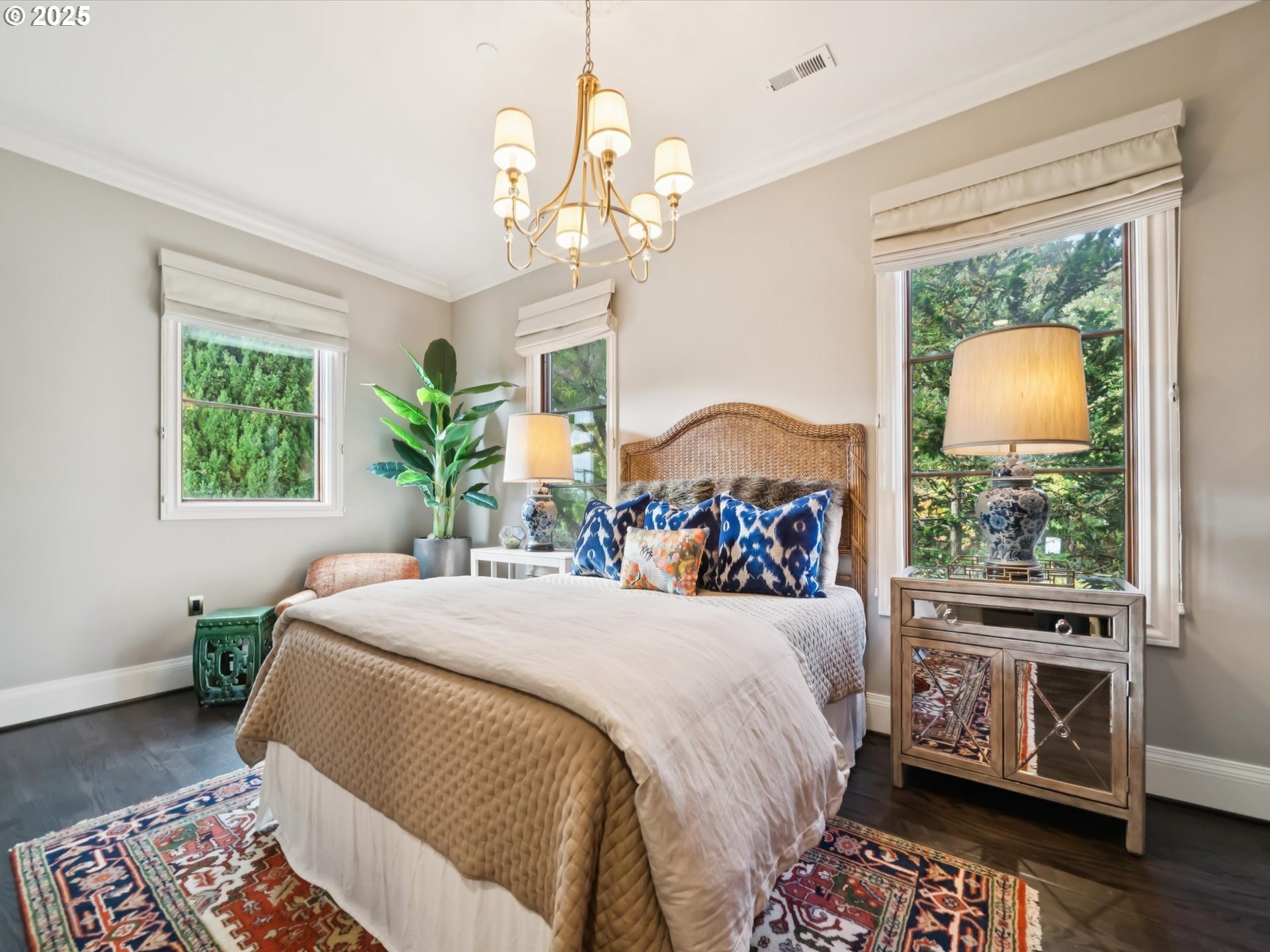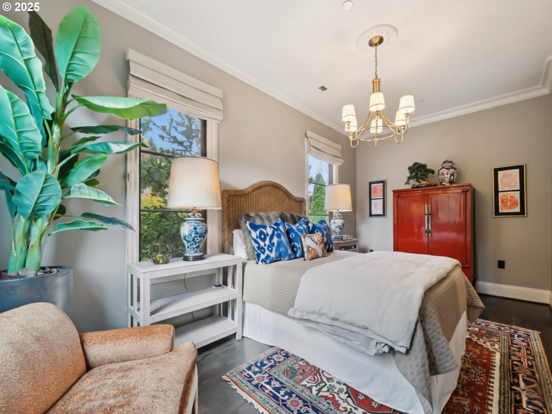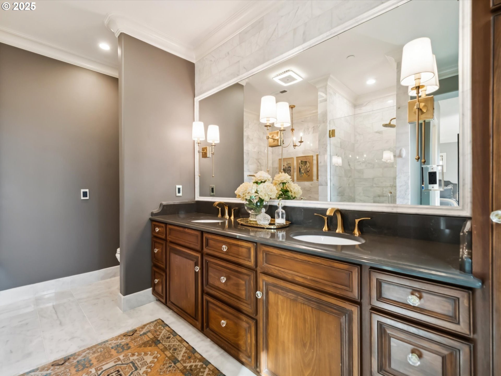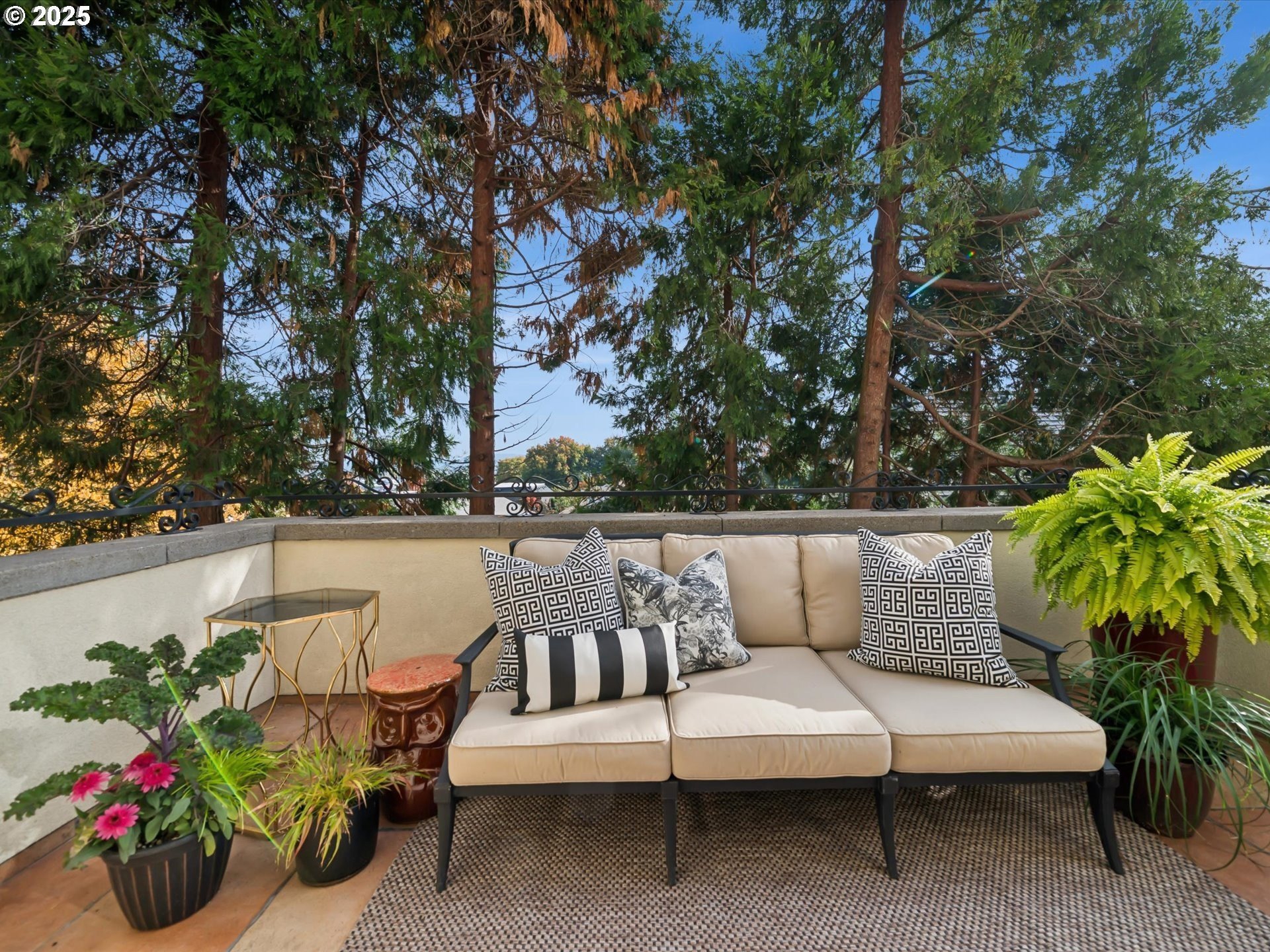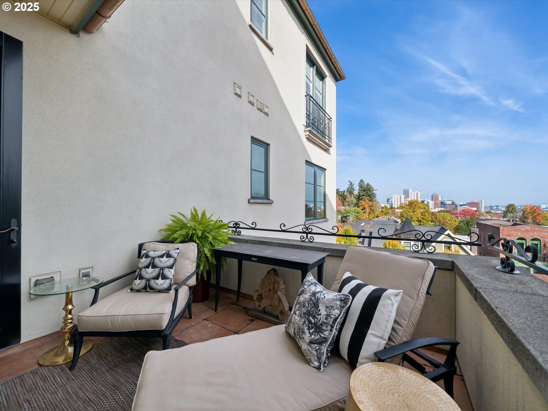 Must see rare remodeled Mediterranean luxury condominium located in the historic Lair Hill neighborhood. Experience exceptional craftsmanship, privacy, and beautiful city views in this stunning residence. This single level home features an open floor plan with vaulted 9 foot ceilings, heated travertine tile floors, custom wood cabinetry, soapstone marble, solid wood doors and windows. The gourmet kitchen is an entertainer’s dream, showcasing walnut cabinets with pullouts, a large island, a new Wolf five burner gas cooktop, Sub Zero built-in refrigerator, double oven with warming drawer, and a beverage fridge. The formal dining area opens through French doors to a north facing balcony with city views. The living room features a custom built solid travertine mantle with a gas fireplace and serene east facing tree views. The primary suite includes hardwood floors, double closets, a private balcony, and a custom built-in walk-in closet. The luxurious primary bath offers a marble tiled design with a double quartz vanity, a tiled walk-in shower, and a large jetted tub. The second suite also features hardwood floors, dual closets, a granite vanity, and a marble tiled walk-in shower. A dedicated office space includes built-ins, a soapstone desktop, and a beverage cooler—perfect for work or exercise. The Lair Hill House HOA is an exclusive community of just six units and two separate townhomes. Shared amenities include a guest house, gated entry with elevator, wine cellar with assigned lockers, pool table, gym, assigned storage unit, and a secured heated parking garage with two reserved spaces plus five guest spots. Additional features include a heated driveway, backup generator, and included water, sewer, and garbage. Located in the heart of Lair Hill, this exceptional home offers access to the Gibbs Street pedestrian bridge connecting you to the shops and restaurants of the South Waterfront District. You’re also just minutes from OHSU, downtown Portland, and major freeways