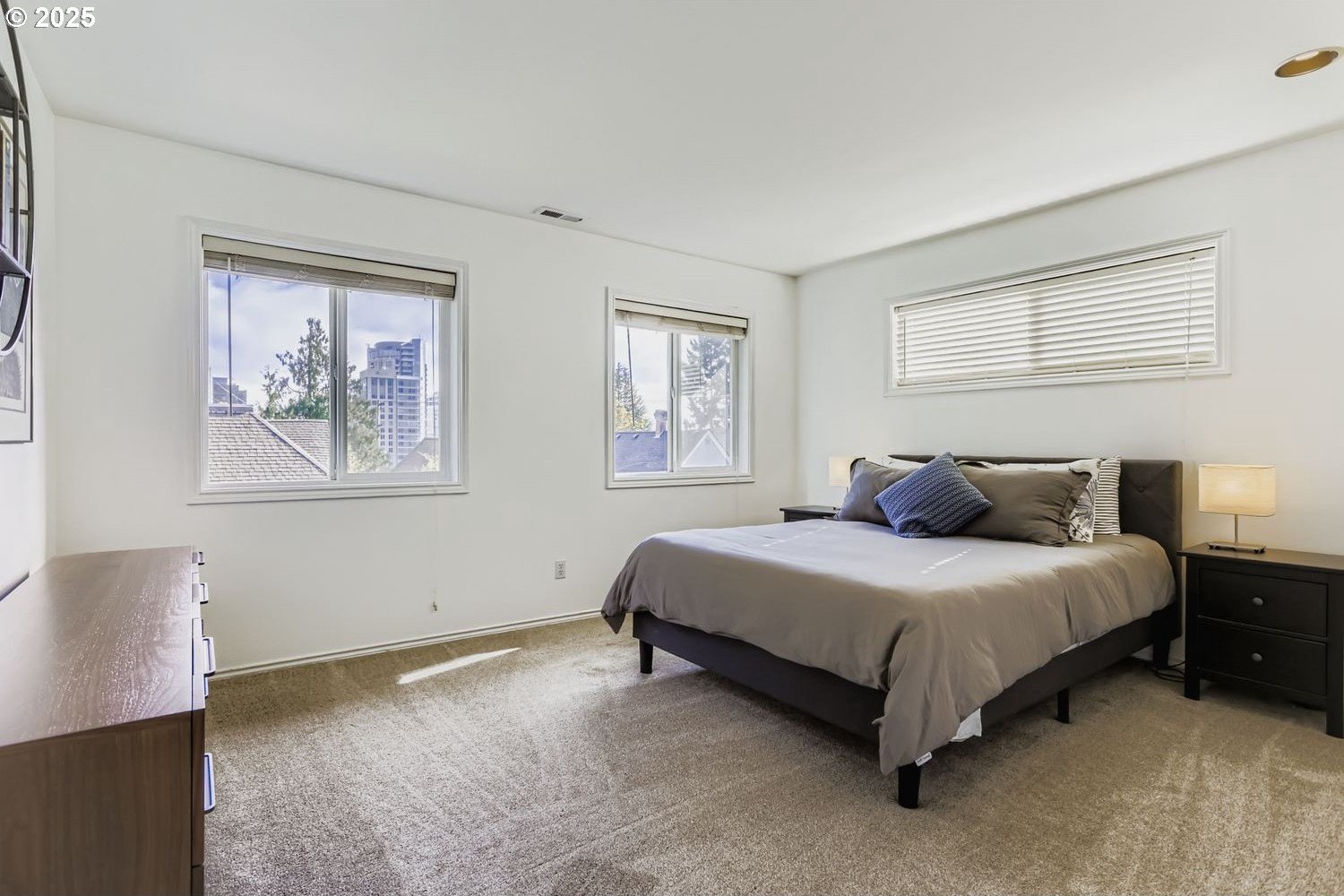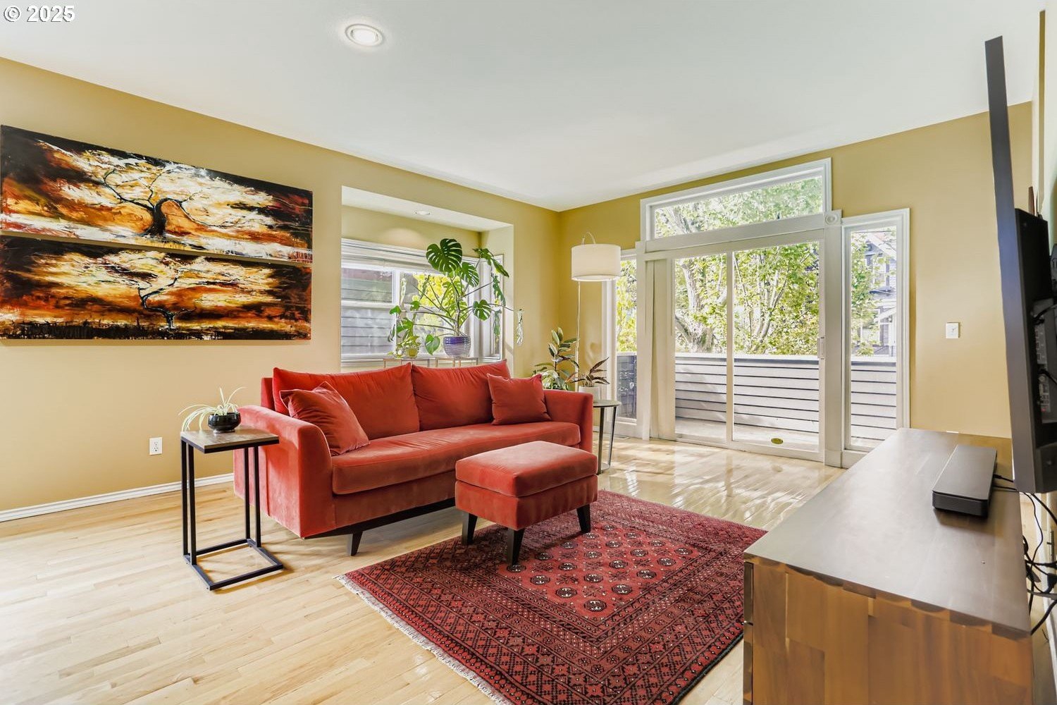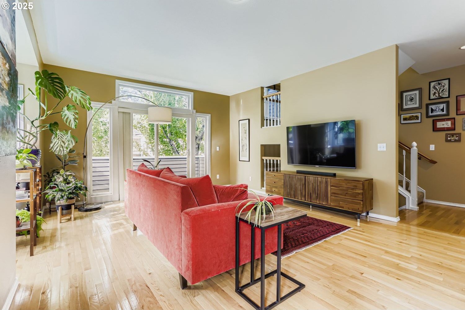 Desirable end-unit townhome in charming Lair Hill historic district. Main level has and open floor plan with lofty highceilings, hardwood floors, southern-exposed windows make a light filled living room/dining room space, and balcony area. Spacious kitchen features stainless steel appliances, eating area, and covered deck. Upper-level features primary-suite with double closet/vanity, steam shower with jetted-bath. Two additional bedrooms are also upstairs, one vaulted ceiling guest bedroom, and a third bedroom or office/bonus room. The lower level has an additional bonus room/office space/entertainment room. Tandem garage with access to private backyard, paver patio, and space for raised beds or other options to envision. Exterior of townhome was painted last year, and has newer furnace & AC. Convenient to OHSU, Southwater Front shopping and restaurants, OHSU tram, and waterfront!