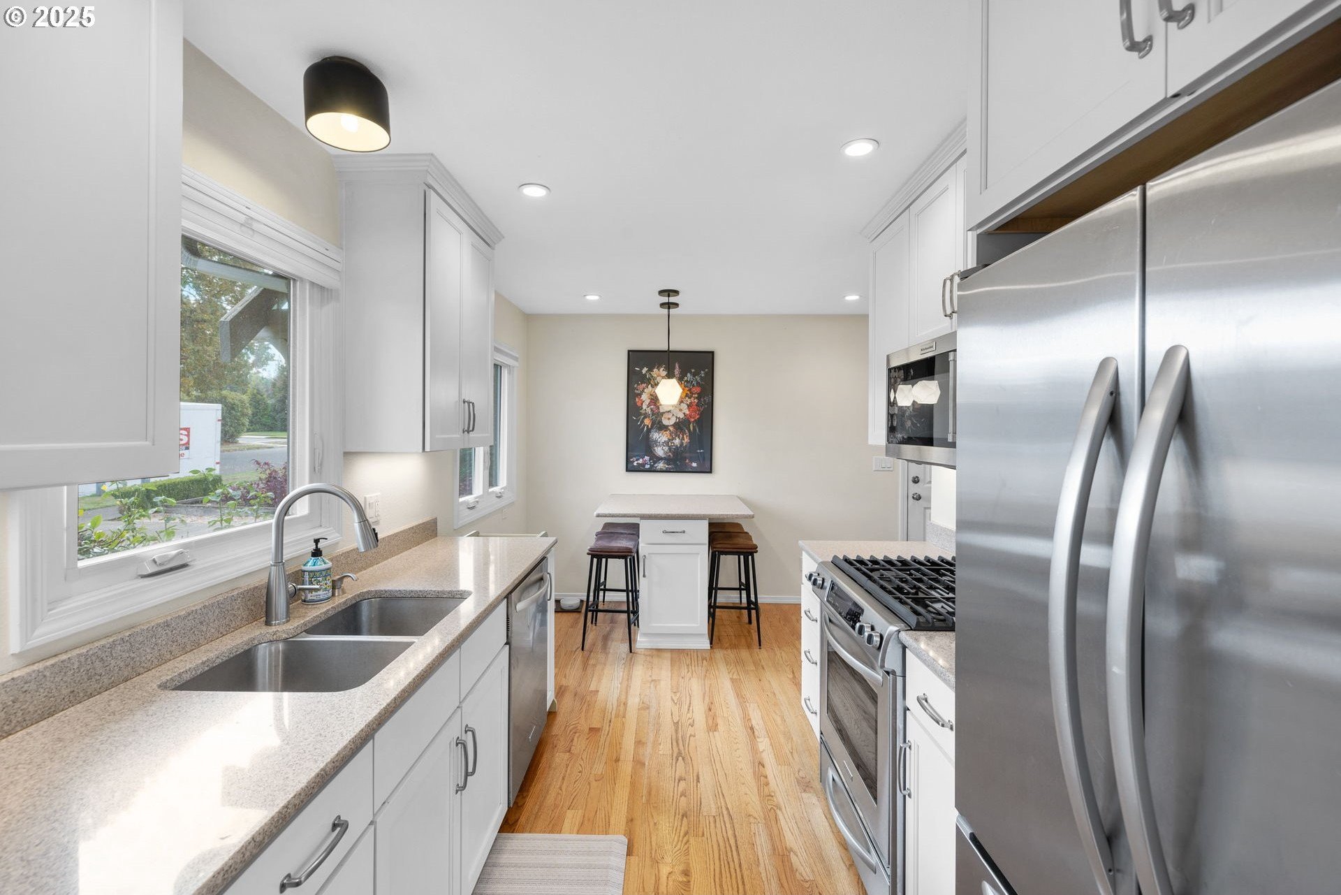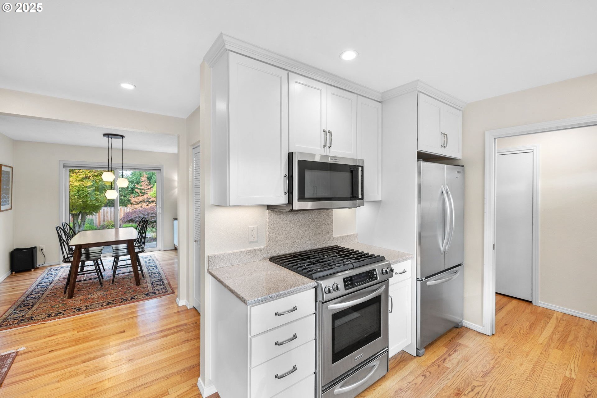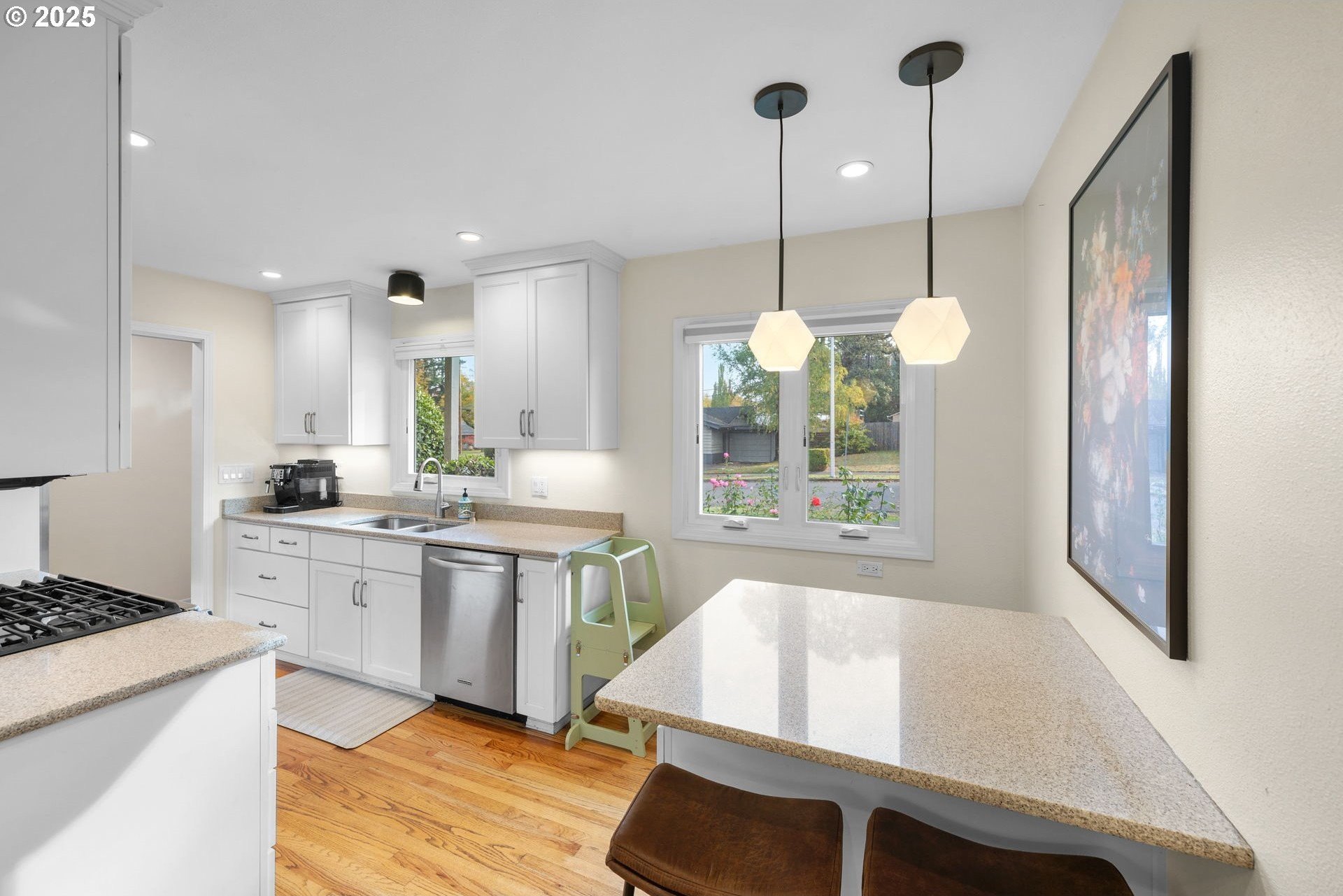 Love the home you live in! Welcome to this beautifully updated and modern one level home in an established neighborhood with access to great schools, parks, shopping, restaurants and walking trails- all within walking distance! Walk through your front door into sundrenched rooms with a view overlooking your private and serene backyard. The updated kitchen has quartz countertops, stainless steel gas appliances and a beautiful island, the showstopper is the unexpected huge, organized pantry. You will love cooking in this well thought out kitchen! The kitchen opens into the dining room with modern lighting and room for a family Thanksgiving dinner. The dining room opens into the living room, with a cozy gas fireplace, a wall of windows, and access to the backyard. It is a perfect place to sit with a good book and contemplate life. The private oasis of a backyard is fully fenced with paths that meander through patios and planting areas. Down the hall from the living/dining room are 3 spacious bedrooms, one is being used as a home office as well as an additional bedroom and the primary bedroom. The primary bedroom has 2... count them 2... oversized closets with organizers and an ensuite bath which has been fully remodeled with a beautiful walk-in shower. The hall bath has a tub/shower combo and has also been remodeled. Hardwood floors throughout, no carpet here! You have laundry? well, enjoy your beautifully remodeled laundry inside the home with open shelving and a storage closet. Speaking of storage- this home has STORAGE! inside there are plenty of closets, but wait-- the garage has a third bay that can be used for exercise equipment, storage or even a workshop! Don't forget the EV charger in the garage for your electric car. This home is mere blocks from parks, shopping, restaurants, Foothills Lake and park, walking trails, close to schools, Nike, Intel and easy access to freeways. You will love what you see! Visit us today!