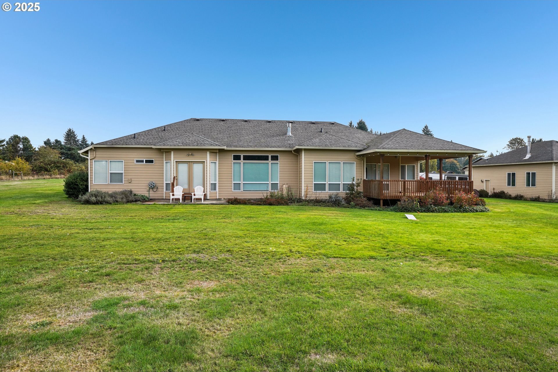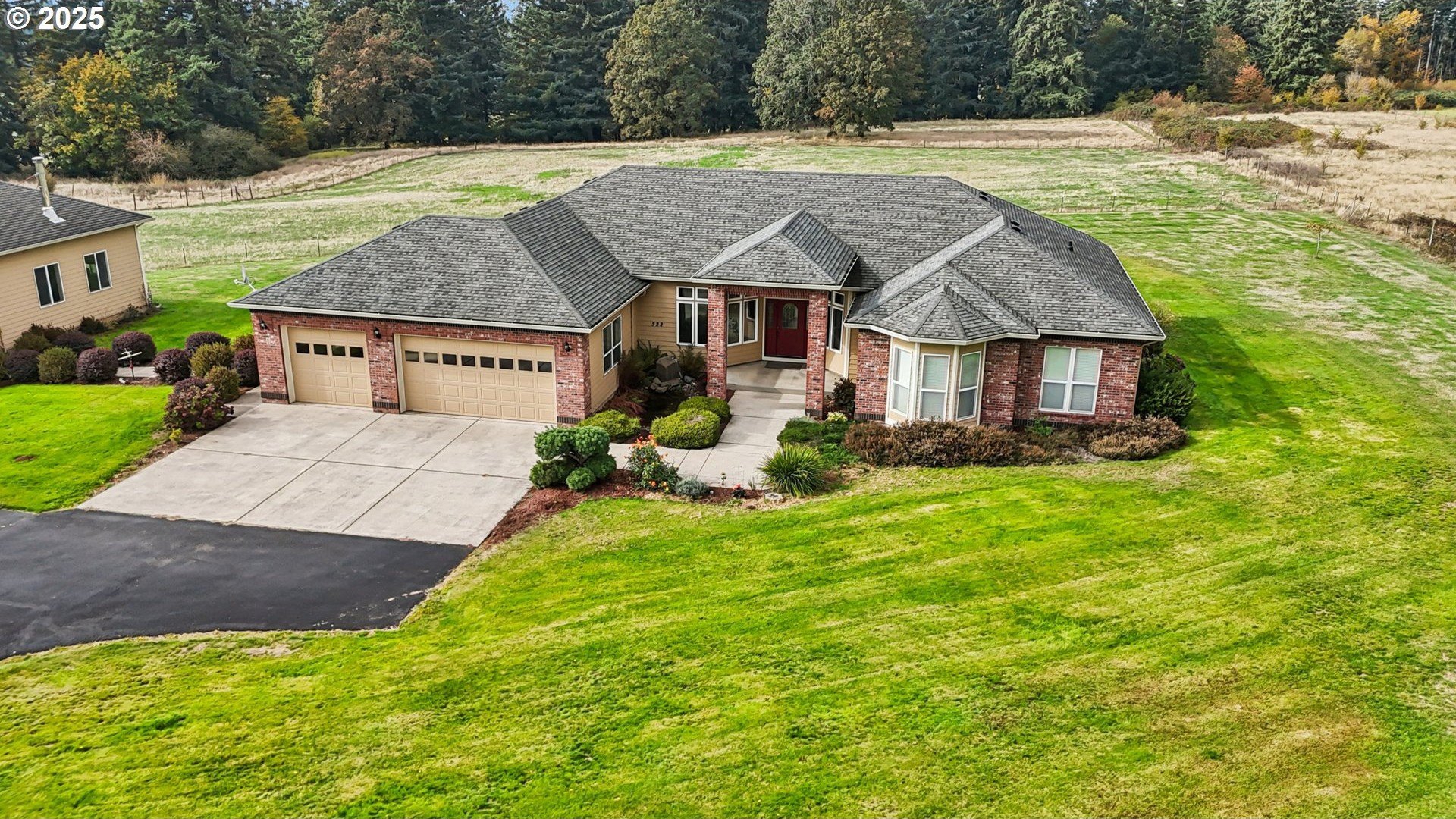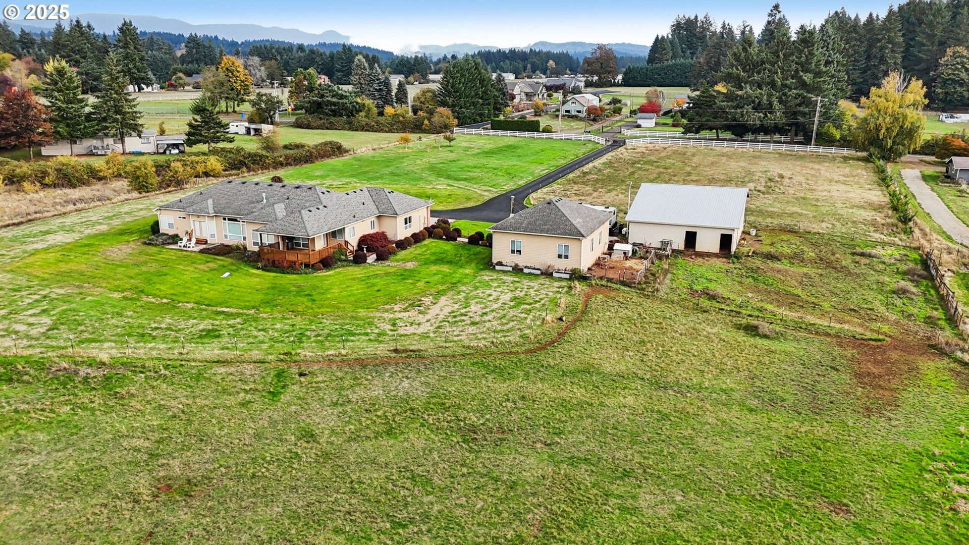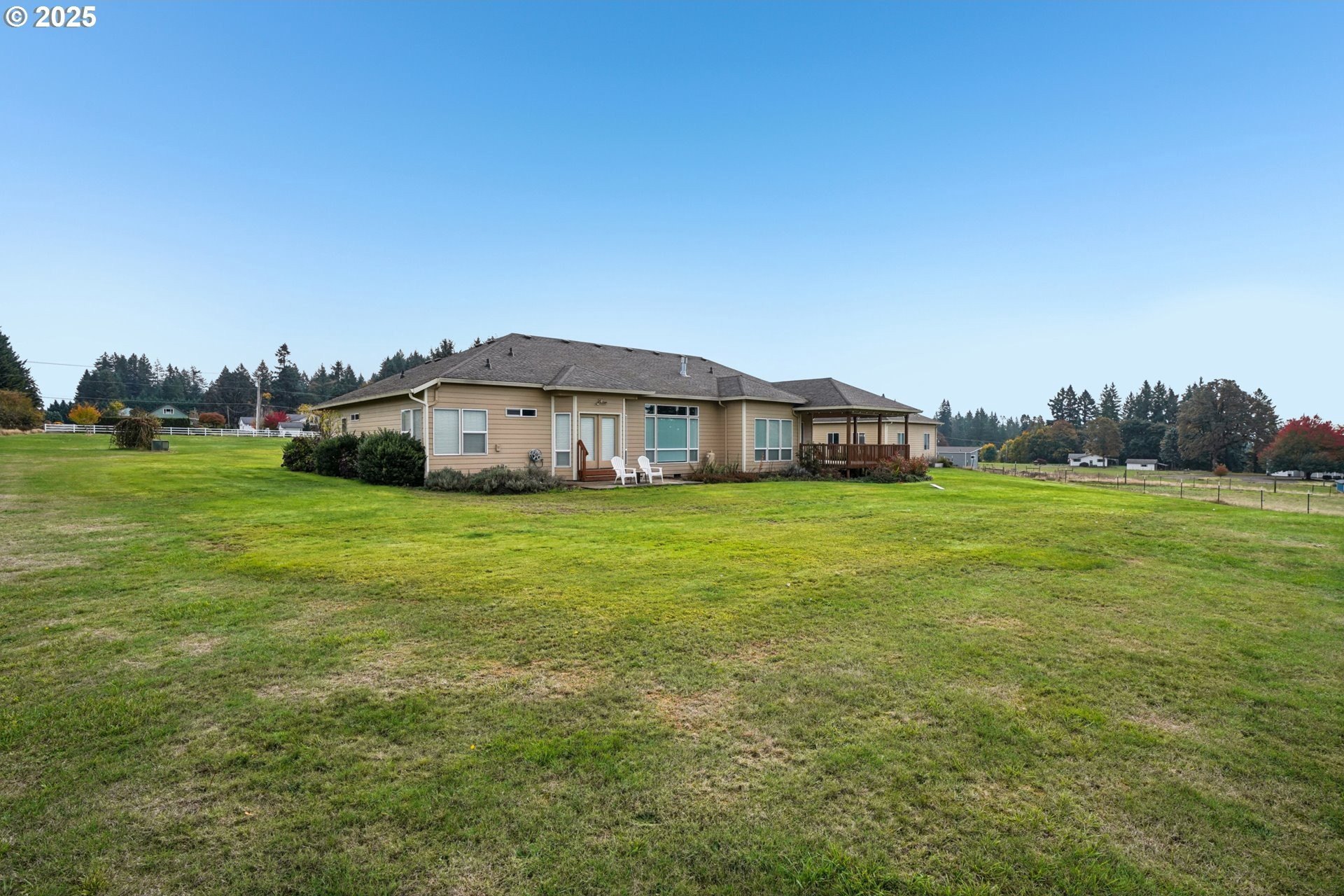 Discover the perfect blend of comfort and country living in this beautiful single-level home set on 5.66 peaceful acres. This spacious property features a 3-car attached garage, a large detached shop/garage, and a barn with 2 12x12 stalls—ideal for horses or hobby farming. The land is cross-fenced, with electric Horse fencing. The home welcomes you with tall ceilings and expansive rooms designed for both everyday living and entertaining. Enjoy the open layout, abundant natural light, and seamless flow to the covered deck—perfect for relaxing or taking in the serene views of the property. With an RV hookup and plenty of room to spread out, this property offers exceptional versatility for equestrian enthusiasts, hobbyists, or anyone seeking space and tranquility just minutes from town.