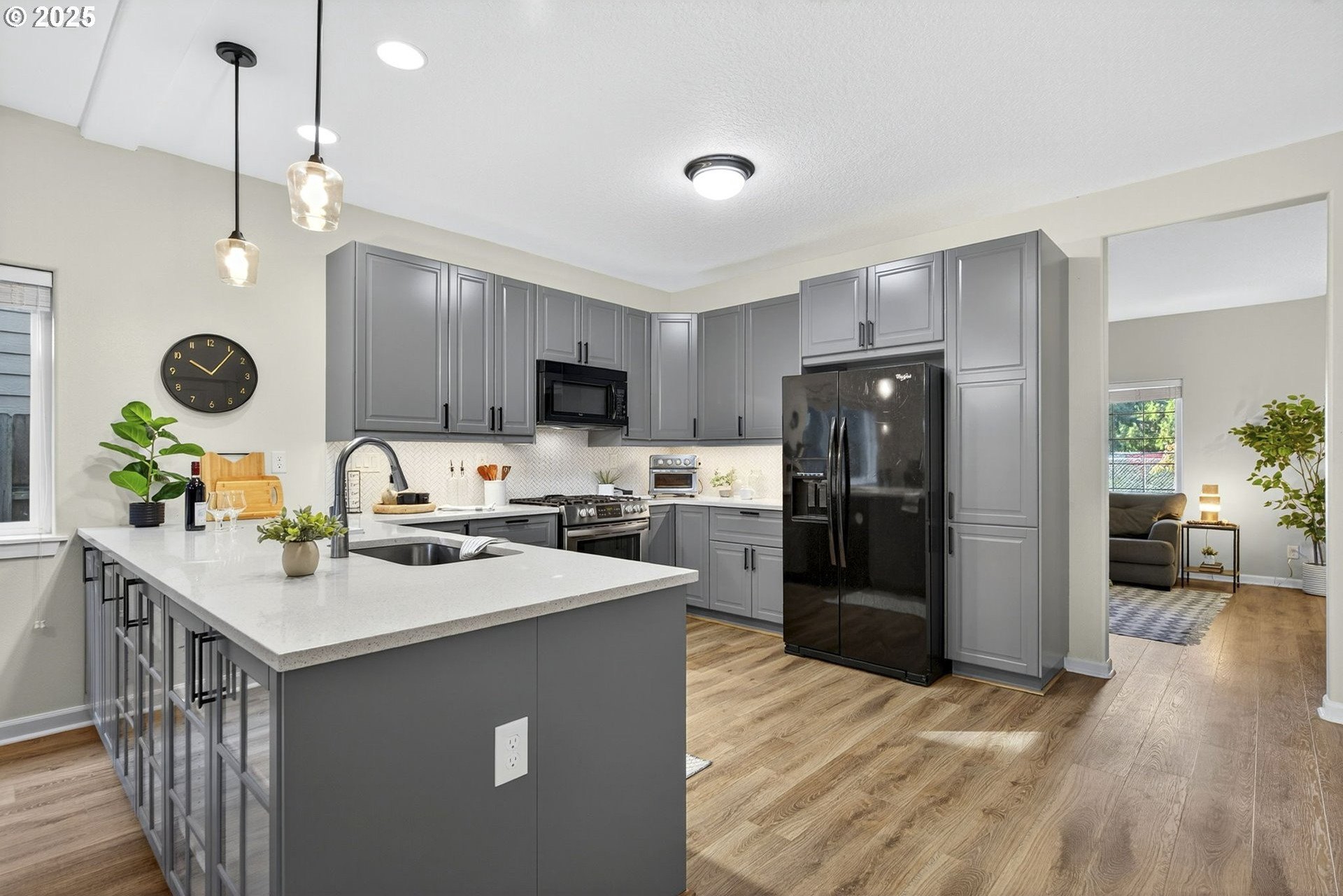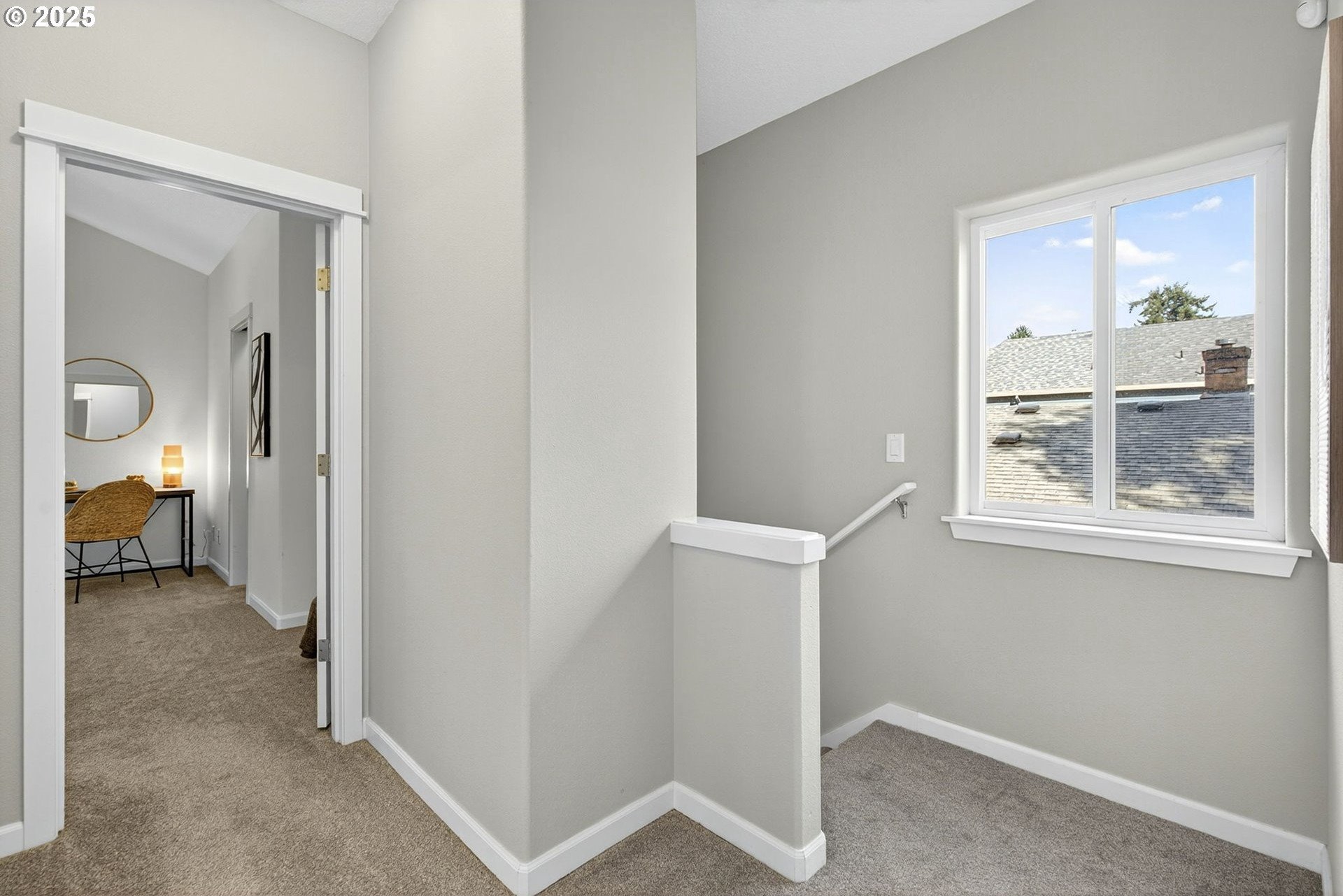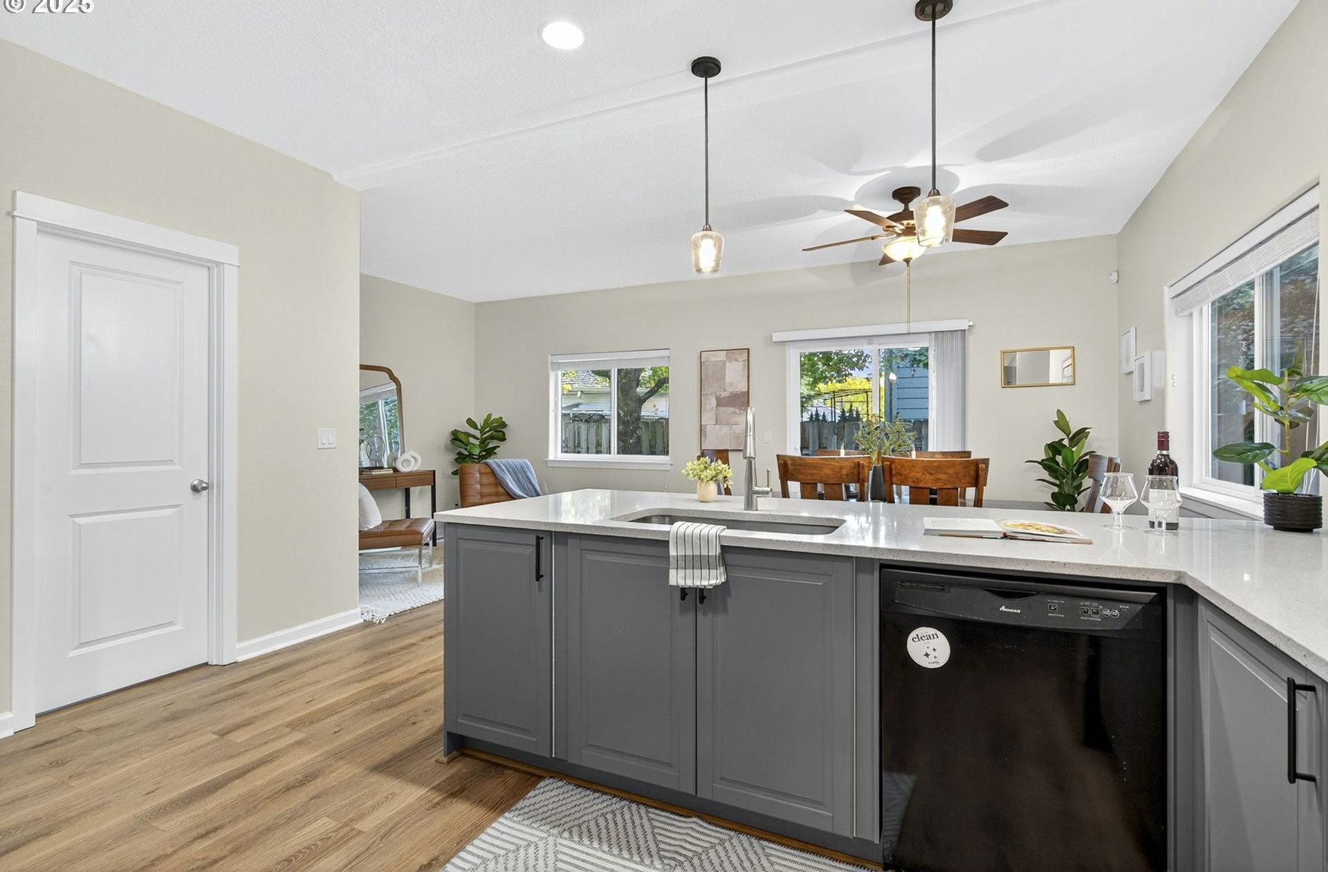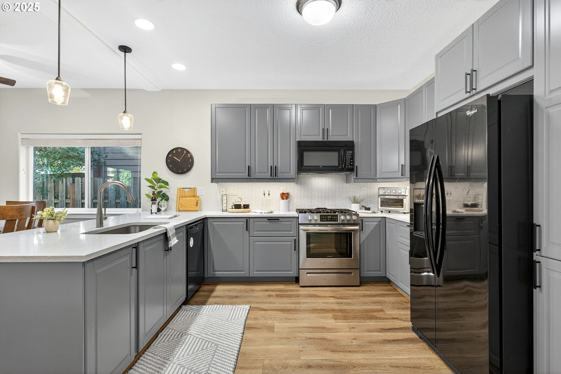 Tucked back off of Duke in a quiet community of 4 homes (without an HOA) this easy-to-love 3 bed/ 2.5 bath contemporary makes modern living feel inviting. From the moment you spot the pop of red trim and bold front door, you know this home has personality and practicality. Step inside to find high ceilings that make the home feel larger than its sq footage. In the living room sunshine streams through a large picture window and then flows to the open kitchen/dining and a charming nook/home office/playroom space. Style meets function in the kitchen, with sleek gray cabinetry, quartz countertops, and stainless-steel appliances ready for anything from Sunday pancakes to full-blown dinner parties. There’s plenty of prep space, smart storage, and a roomy breakfast bar that naturally draws everyone together. The adjacent dining area opens to the backyard, making it easy to keep the conversation flowing indoors and out. Laundry room with included large-capacity washer/dryer is also on the main.Upstairs is your large primary suite with a walk-in closet that overlooks the park. Two additional bedrooms are upstairs as well as a shared bath. Outside, the private fenced patio and side yard also offer a storage shed and just enough space for the dog, the BBQ and a bit of outdoor living. Each home has a its own front yard space too. Steps to Brentwood City Park, 14 acres of soccer and football fields, dog park and more. Blocks to schools, shops, restaurants. Biker's Paradise score = 93. [Home Energy Score = 6. HES Report at https://rpt.greenbuildingregistry.com/hes/OR10185658]