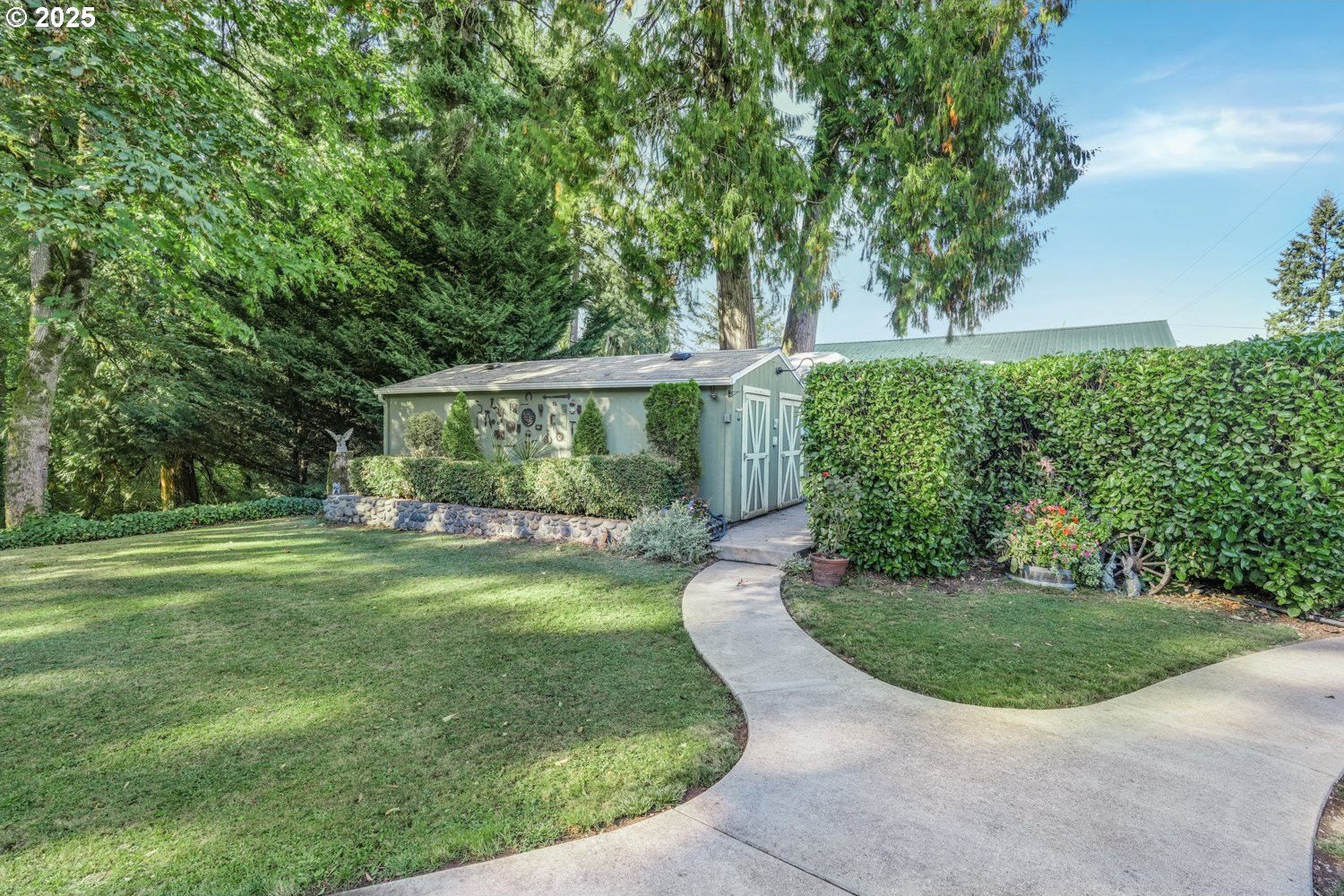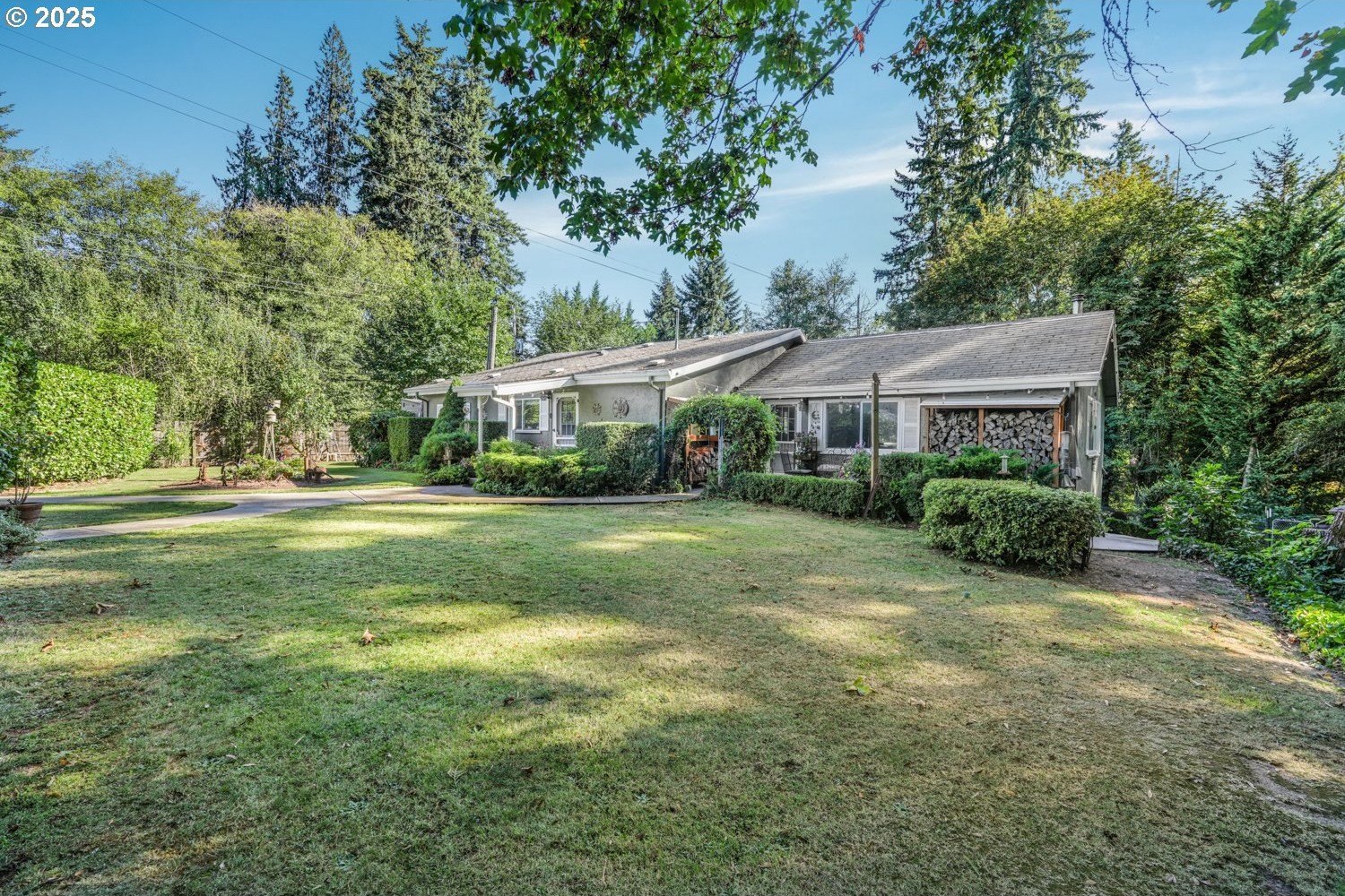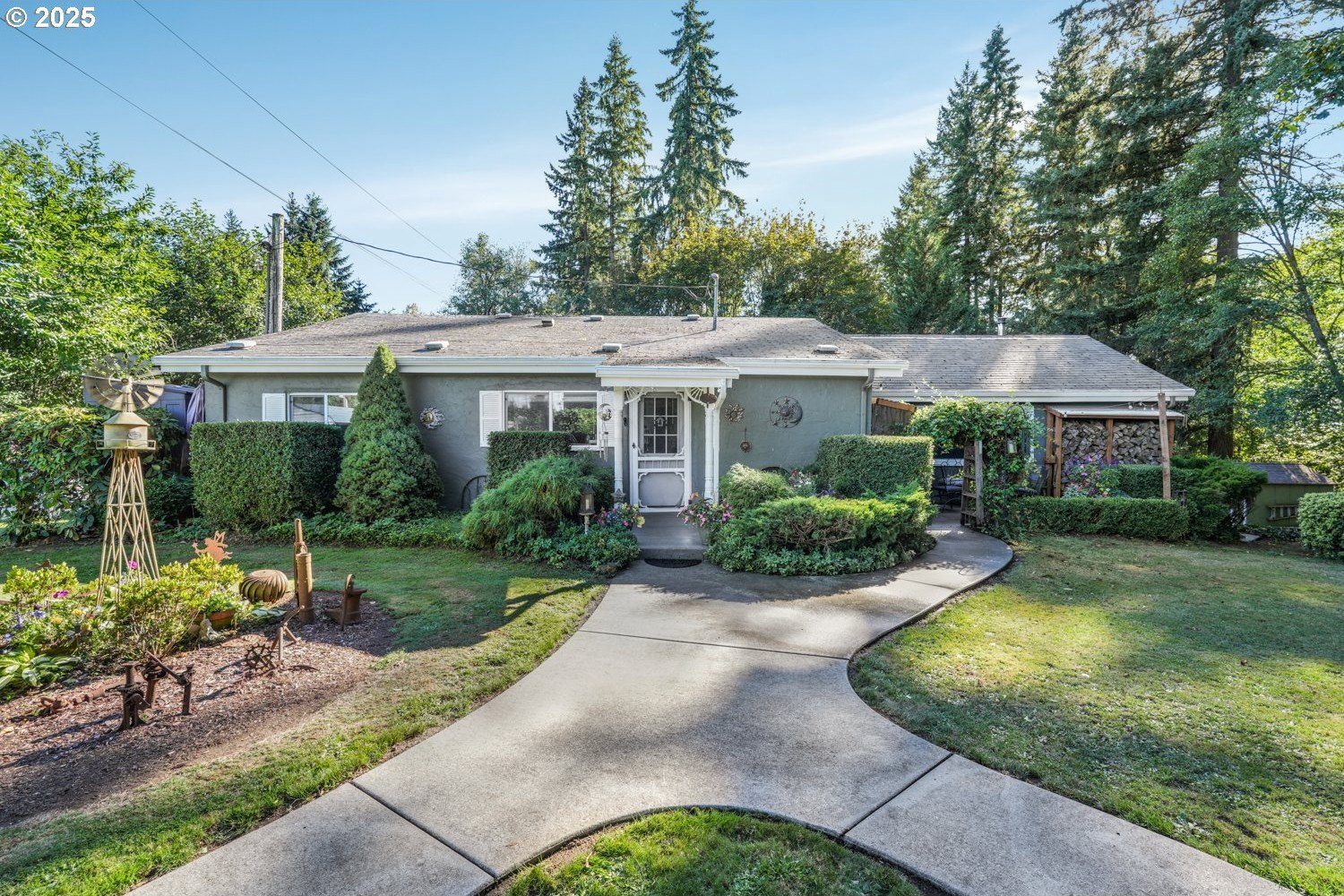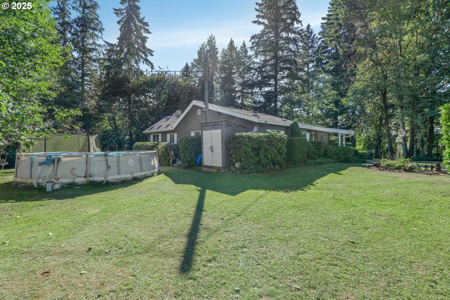 Experience peaceful country living at its finest in this beautiful 4-bedroom, 2-bath home on 2.5 serene acres surrounded by majestic shade trees. The immaculately maintained grounds feature meandering walking trails, a seasonal creek that runs through the property in winter, and a charming footbridge that adds to the picturesque setting. Enjoy outdoor living with a spacious deck and patio, raised garden beds, two storage sheds, and an above-ground pool that all stay with the home. There’s plenty of room to roam, relax, and watch the local wildlife in this peaceful natural retreat. Inside, the home offers a large living room with vaulted, beamed ceilings and a cozy wood-burning stove. The dining area opens to the deck through sliding doors, creating a seamless indoor-outdoor flow perfect for entertaining. The kitchen sits at the heart of the home, and a dedicated office provides space for remote work or hobbies. The primary suite includes a private bath and double closets, while three additional bedrooms, a full hall bath, and a laundry room complete the interior layout. An RV parking pad with plug-in adds convenience, and despite the country setting, you’re just 10 minutes to shopping, dining, and I-5 access. Private, peaceful, and move-in ready, this property truly offers the best of Northwest living!