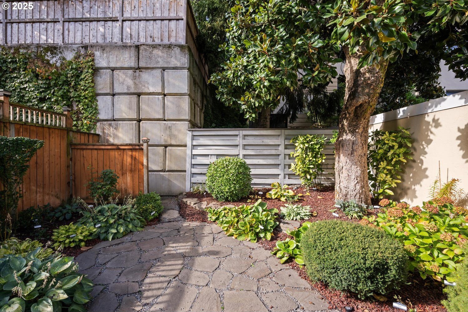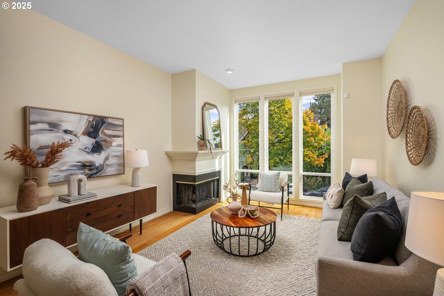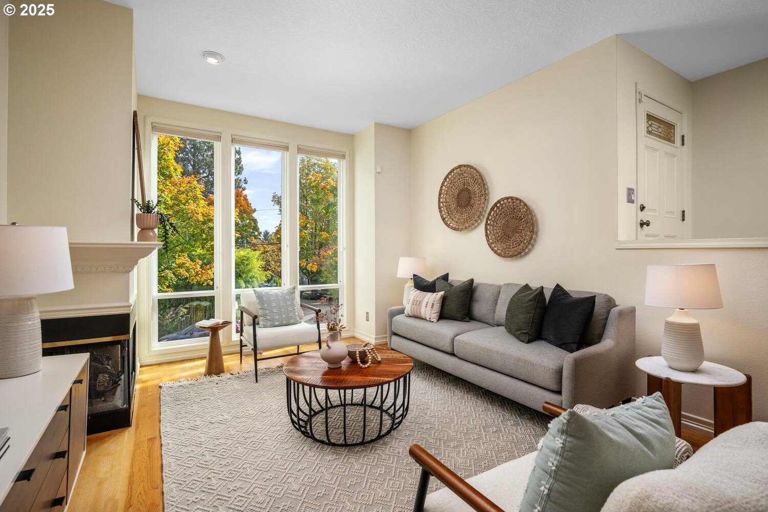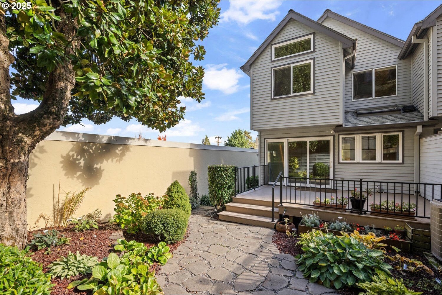 HOSTED OPEN Tues 10/28, 11-1. Rarely available end-unit at the Joann’s Place Rowhomes in NW Portland’s Nob Hill and just blocks from vibrant NW 23rd Avenue. This exceptional home features expansive walls of windows, a fully fenced private backyard with easy care Trex deck and an extra deep garage that accommodates two tandem cars in addition to driveway parking. With its brick and cedar façade, these townhomes pay homage to the character of the century-old neighborhood. The inviting, open layout features red oak hardwood floors that transition to the sunken living room with 11'8" ceiling and oversized window frame the neighboring historic homes and stately trees. The warm glow of the gas fireplace creates a cozy living space on a crisp Autumn evening. The living and dining room seamlessly connect and flow into each other for easy entertaining. The well appointed kitchen includes stainless appliances: Bosch dishwasher, GE refrigerator, 4 burner gas Maytag range with Braun hood that vents out, a double sink with Insta hot and Insinkerator disposal. A main floor family room is conveniently located off the kitchen and sliding doors offer pleasant garden views of the thoughtfully landscaped backyard including a majestic magnolia tree. The upper level primary bedroom, with dramatic cathedral ceiling, is a full suite with a private bathroom and walk-in closet. Oversized East facing windows allow sunrise views from bed, glimpses of Mt St Helens and Mt Adams as well as the surrounding historic neighborhood. Rounding out the 2nd floor are two additional bedrooms with red oak floors, a walk-in linen closet and a hall bath with tub/shower. A fully finished and permitted bonus room is off the garage and ideal as an office, media room, workout or yoga space. Located on the cusp of the NW Alphabet District, Slabtown, and the Pearl District - endless opportunities are minutes from your front door. Street car, MAX line and bus stops are nearby or use your feet- walk score is 92! [Home Energy Score = 7. HES Report at https://rpt.greenbuildingregistry.com/hes/OR10242077]