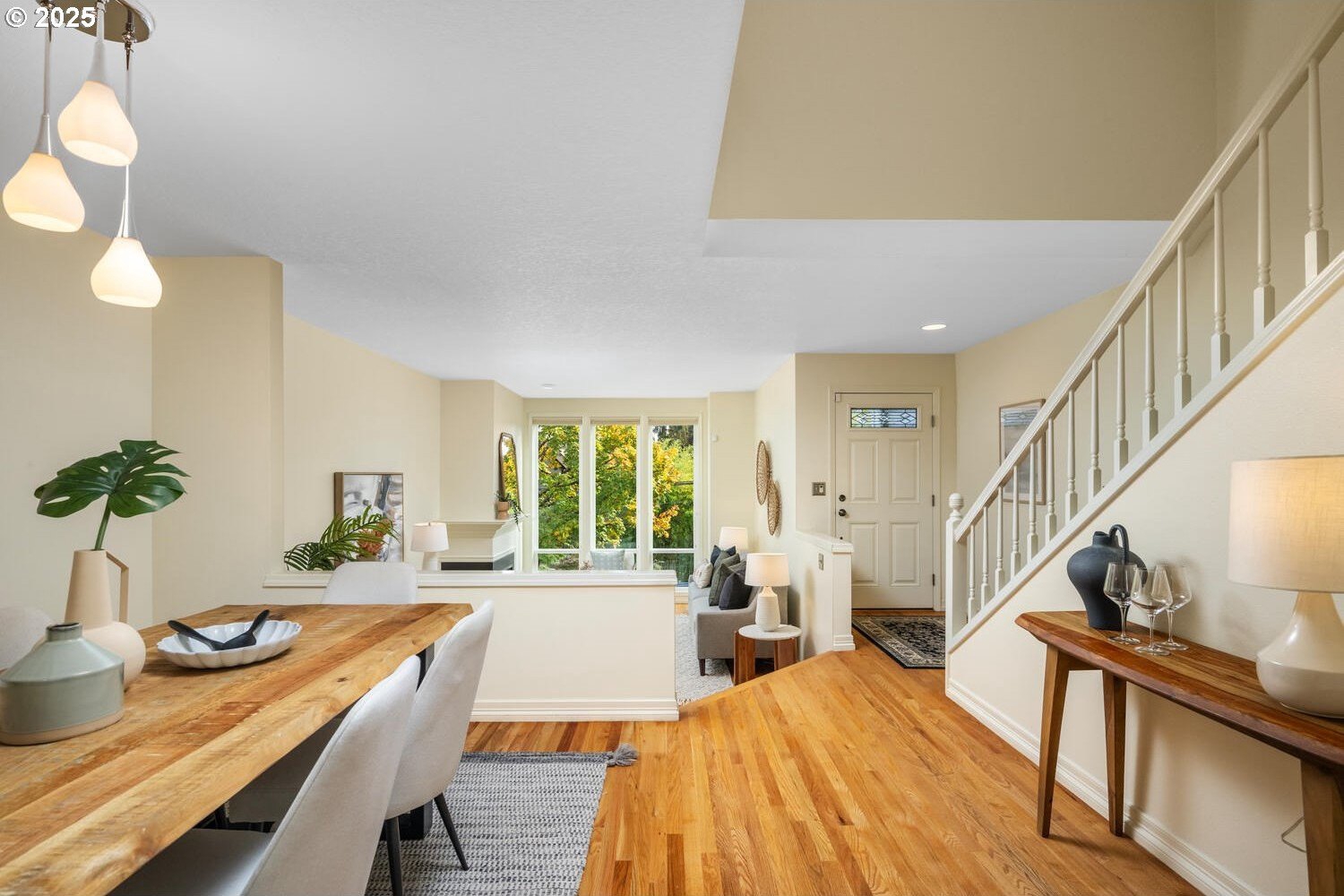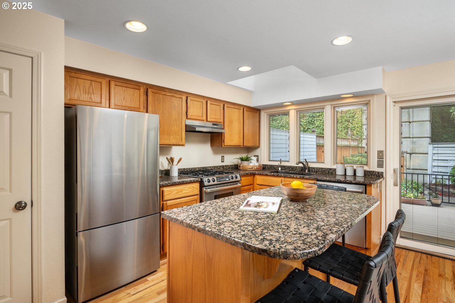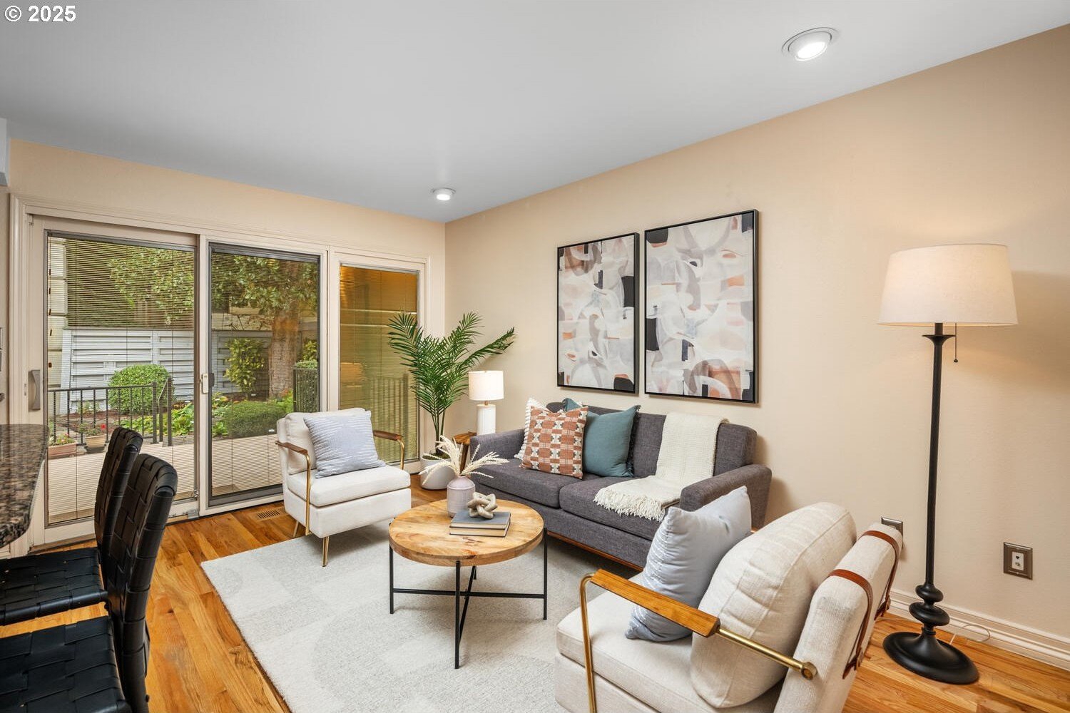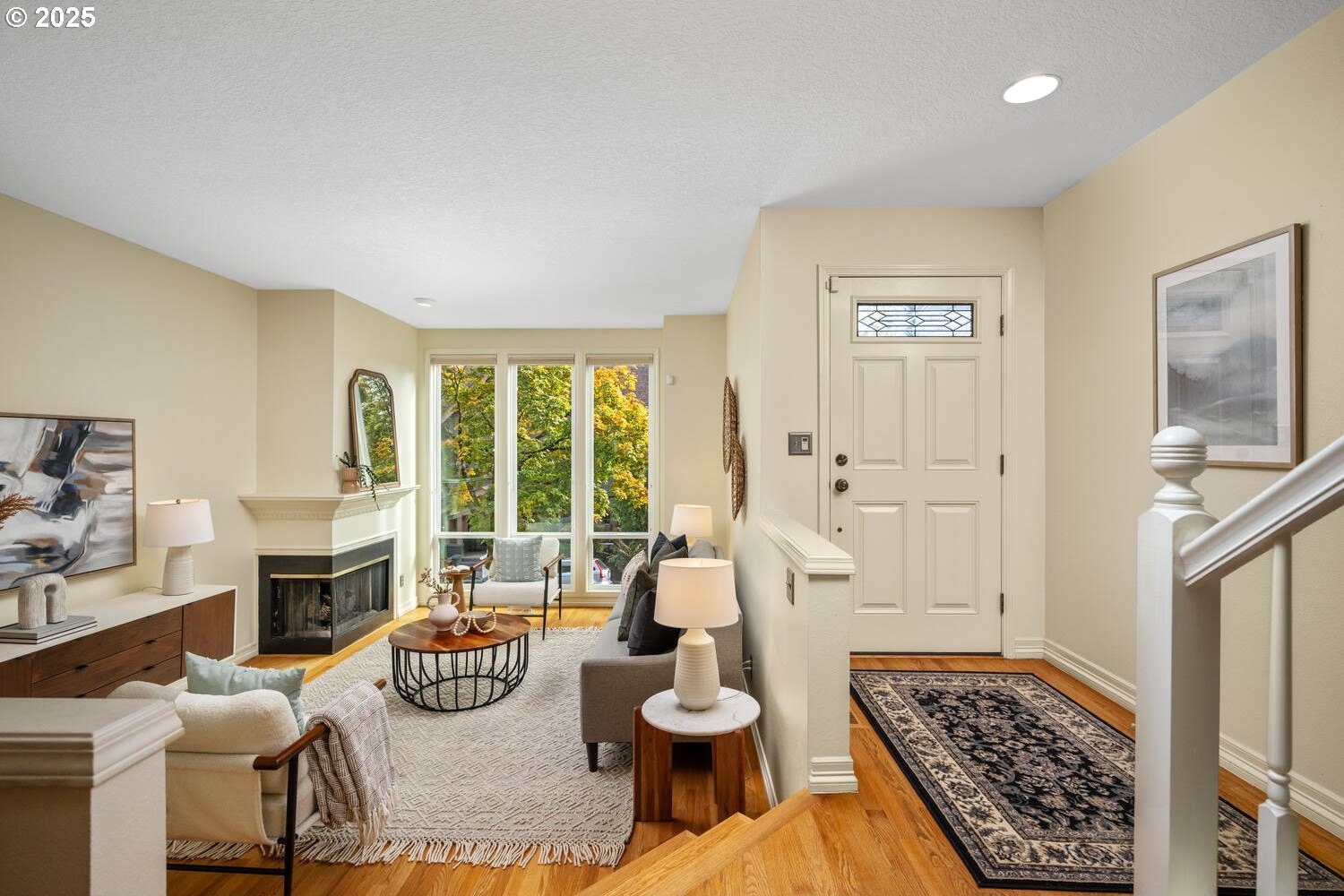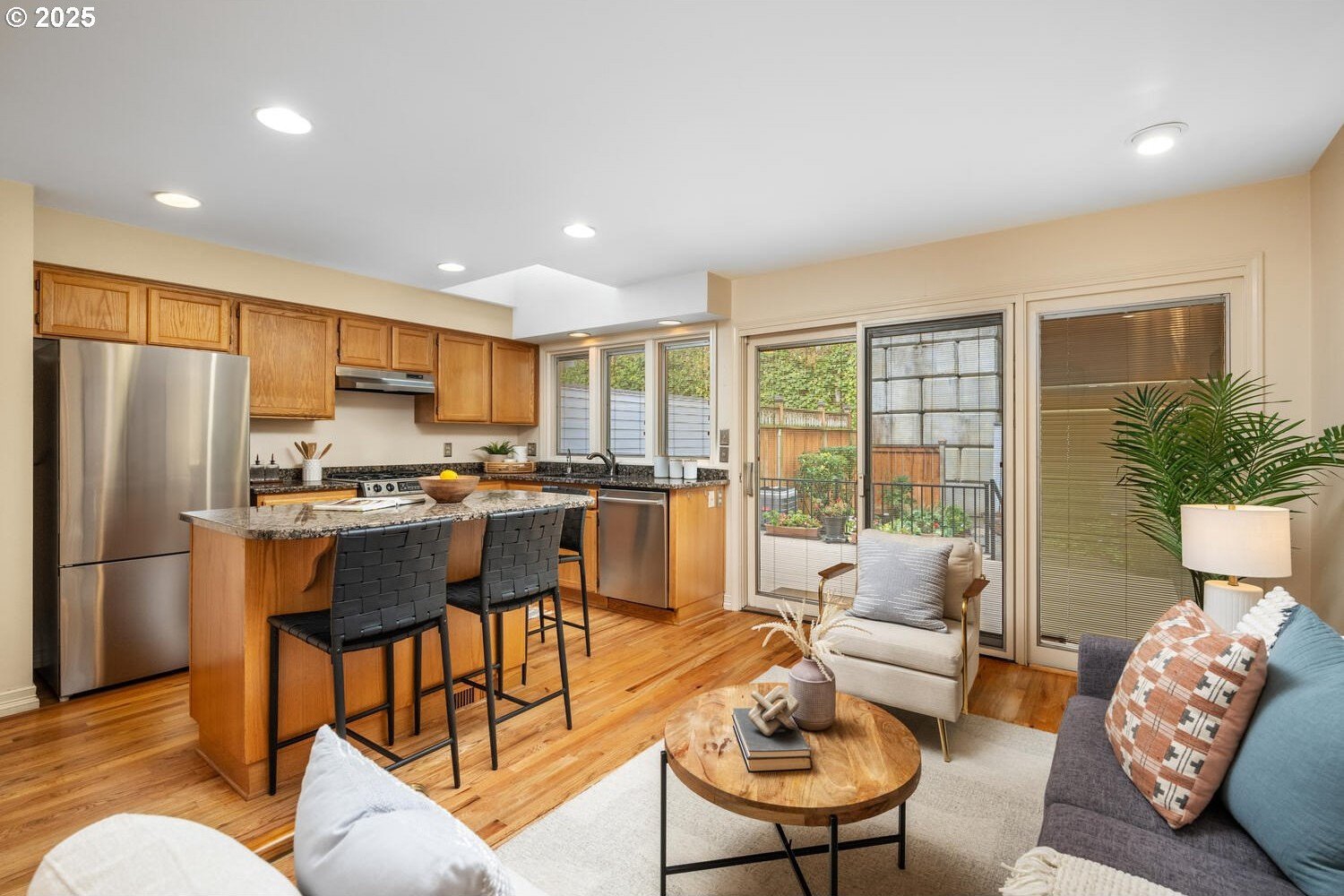 HOSTED OPEN Tues 10/28, 11-1. Rarely available end-unit at the Joann’s Place Rowhomes in NW Portland’s Nob Hill and just blocks from vibrant NW 23rd Avenue. This exceptional home features expansive walls of windows, a fully fenced private backyard with easy care Trex deck and an extra deep garage that accommodates two tandem cars in addition to driveway parking. With its brick and cedar façade, these townhomes pay homage to the character of the century-old neighborhood. The inviting, open layout features red oak hardwood floors that transition to the sunken living room with 11'8" ceiling and oversized window frame the neighboring historic homes and stately trees. The warm glow of the gas fireplace creates a cozy living space on a crisp Autumn evening. The living and dining room seamlessly connect and flow into each other for easy entertaining. The well appointed kitchen includes stainless appliances: Bosch dishwasher, GE refrigerator, 4 burner gas Maytag range with Braun hood that vents out, a double sink with Insta hot and Insinkerator disposal. A main floor family room is conveniently located off the kitchen and sliding doors offer pleasant garden views of the thoughtfully landscaped backyard including a majestic magnolia tree. The upper level primary bedroom, with dramatic cathedral ceiling, is a full suite with a private bathroom and walk-in closet. Oversized East facing windows allow sunrise views from bed, glimpses of Mt St Helens and Mt Adams as well as the surrounding historic neighborhood. Rounding out the 2nd floor are two additional bedrooms with red oak floors, a walk-in linen closet and a hall bath with tub/shower. A fully finished and permitted bonus room is off the garage and ideal as an office, media room, workout or yoga space. Located on the cusp of the NW Alphabet District, Slabtown, and the Pearl District - endless opportunities are minutes from your front door. Street car, MAX line and bus stops are nearby or use your feet- walk score is 92! [Home Energy Score = 7. HES Report at https://rpt.greenbuildingregistry.com/hes/OR10242077]