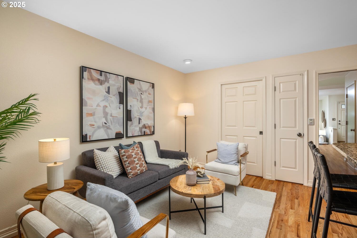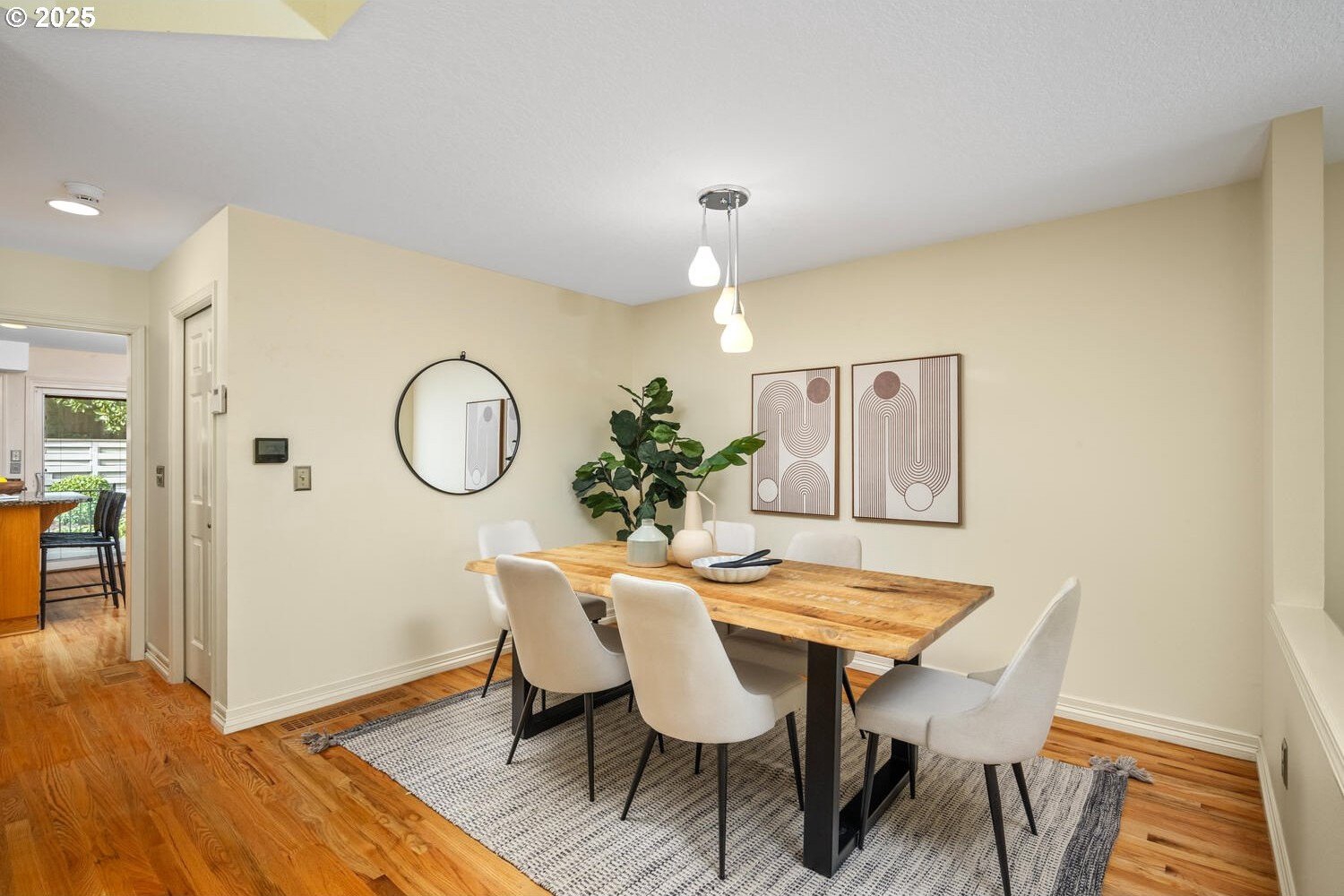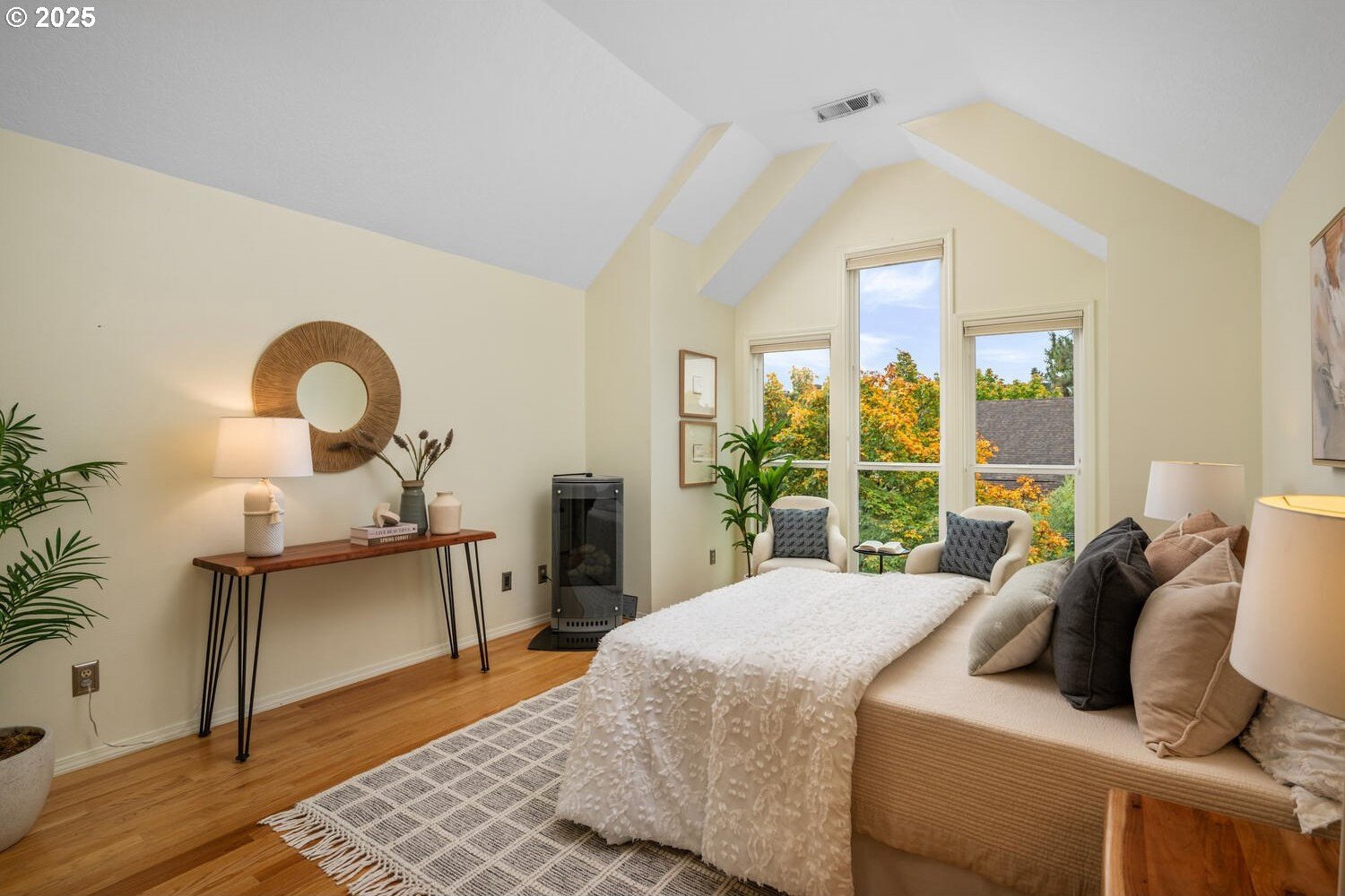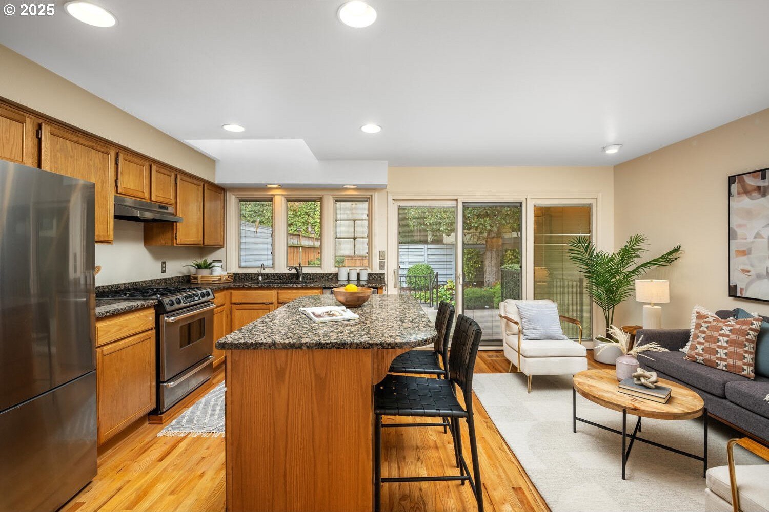 HOSTED OPEN Tues 10/28, 11-1. Rarely available end-unit at the Joann’s Place Rowhomes in NW Portland’s Nob Hill and just blocks from vibrant NW 23rd Avenue. This exceptional home features expansive walls of windows, a fully fenced private backyard with easy care Trex deck and an extra deep garage that accommodates two tandem cars in addition to driveway parking. With its brick and cedar façade, these townhomes pay homage to the character of the century-old neighborhood. The inviting, open layout features red oak hardwood floors that transition to the sunken living room with 11'8" ceiling and oversized window frame the neighboring historic homes and stately trees. The warm glow of the gas fireplace creates a cozy living space on a crisp Autumn evening. The living and dining room seamlessly connect and flow into each other for easy entertaining. The well appointed kitchen includes stainless appliances: Bosch dishwasher, GE refrigerator, 4 burner gas Maytag range with Braun hood that vents out, a double sink with Insta hot and Insinkerator disposal. A main floor family room is conveniently located off the kitchen and sliding doors offer pleasant garden views of the thoughtfully landscaped backyard including a majestic magnolia tree. The upper level primary bedroom, with dramatic cathedral ceiling, is a full suite with a private bathroom and walk-in closet. Oversized East facing windows allow sunrise views from bed, glimpses of Mt St Helens and Mt Adams as well as the surrounding historic neighborhood. Rounding out the 2nd floor are two additional bedrooms with red oak floors, a walk-in linen closet and a hall bath with tub/shower. A fully finished and permitted bonus room is off the garage and ideal as an office, media room, workout or yoga space. Located on the cusp of the NW Alphabet District, Slabtown, and the Pearl District - endless opportunities are minutes from your front door. Street car, MAX line and bus stops are nearby or use your feet- walk score is 92! [Home Energy Score = 7. HES Report at https://rpt.greenbuildingregistry.com/hes/OR10242077]