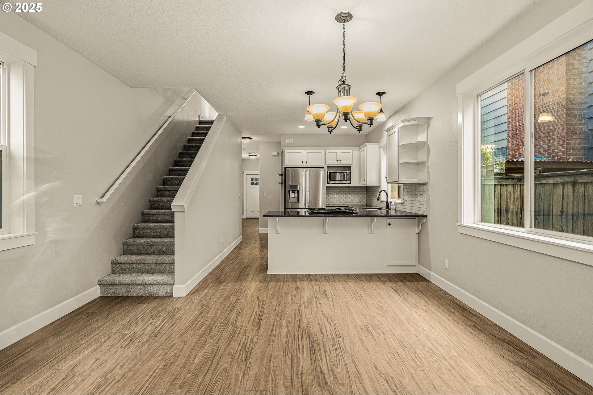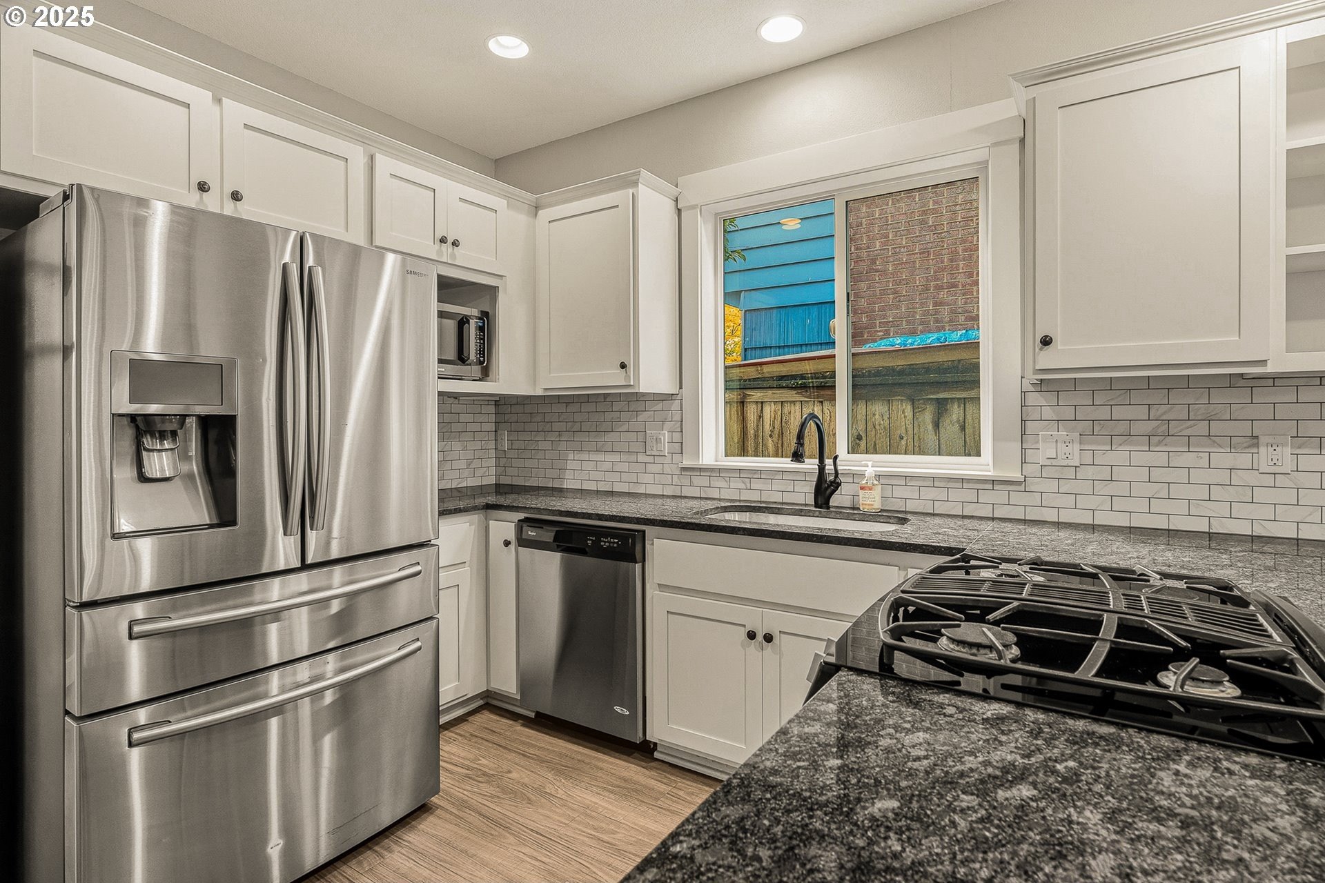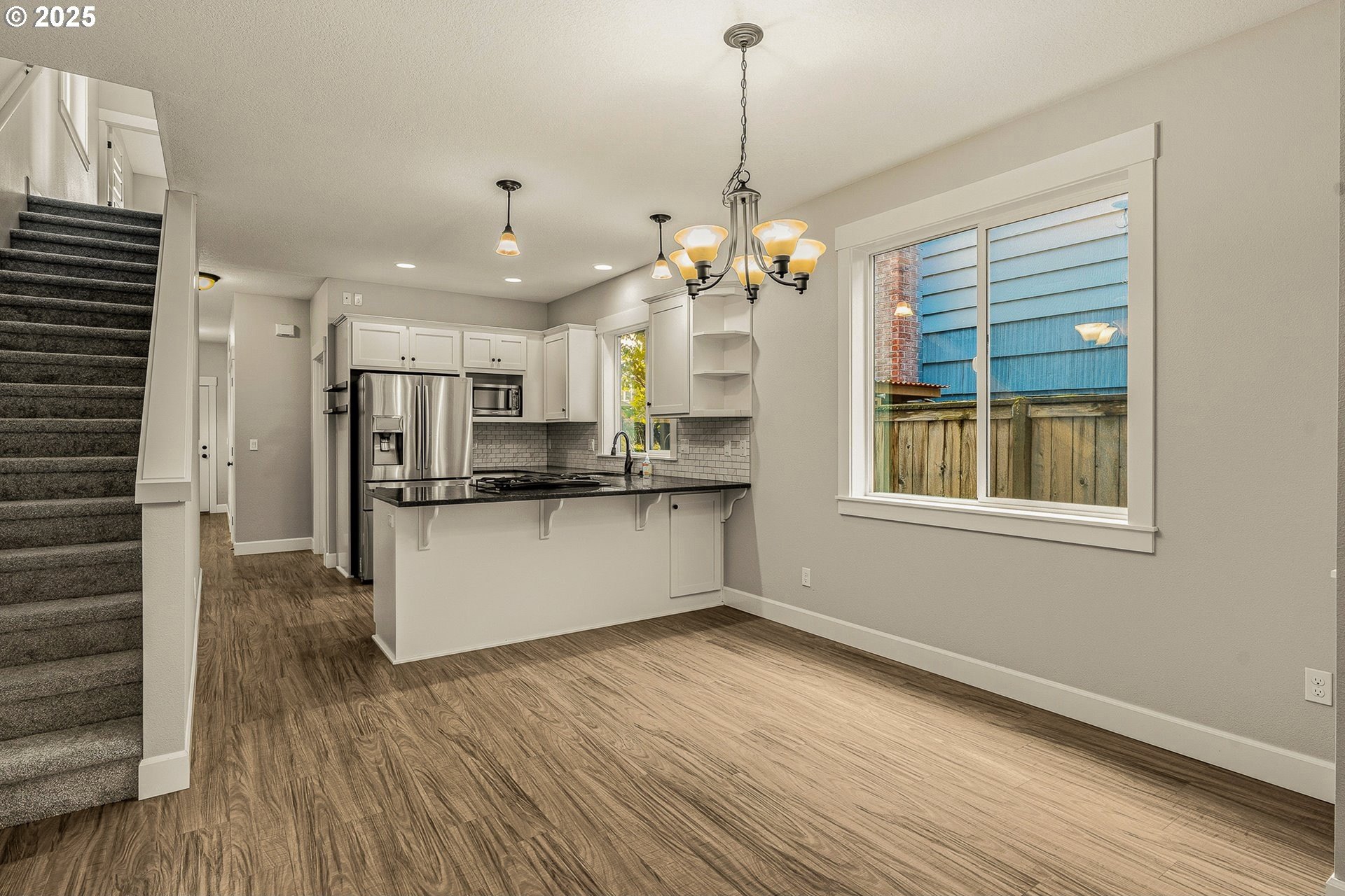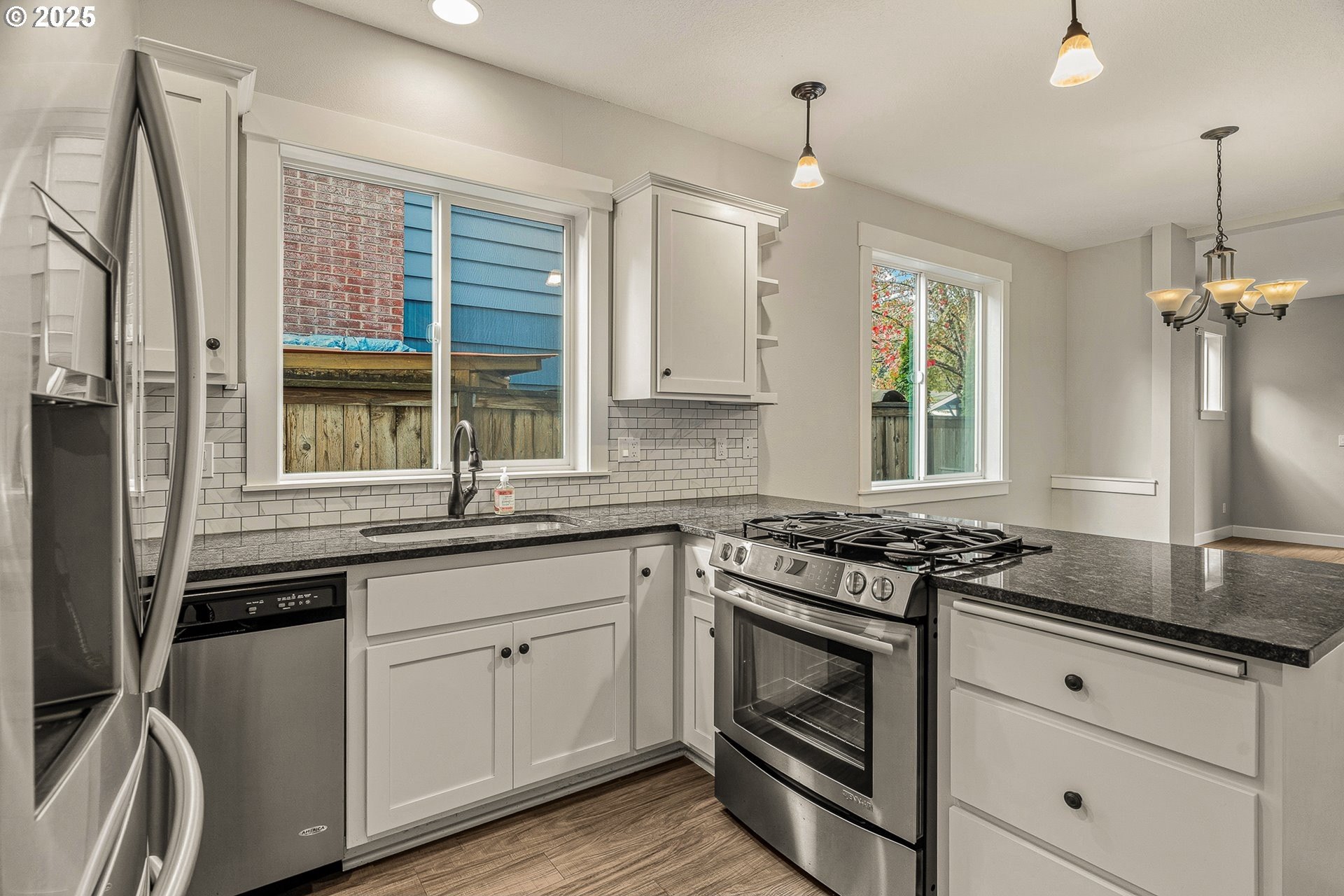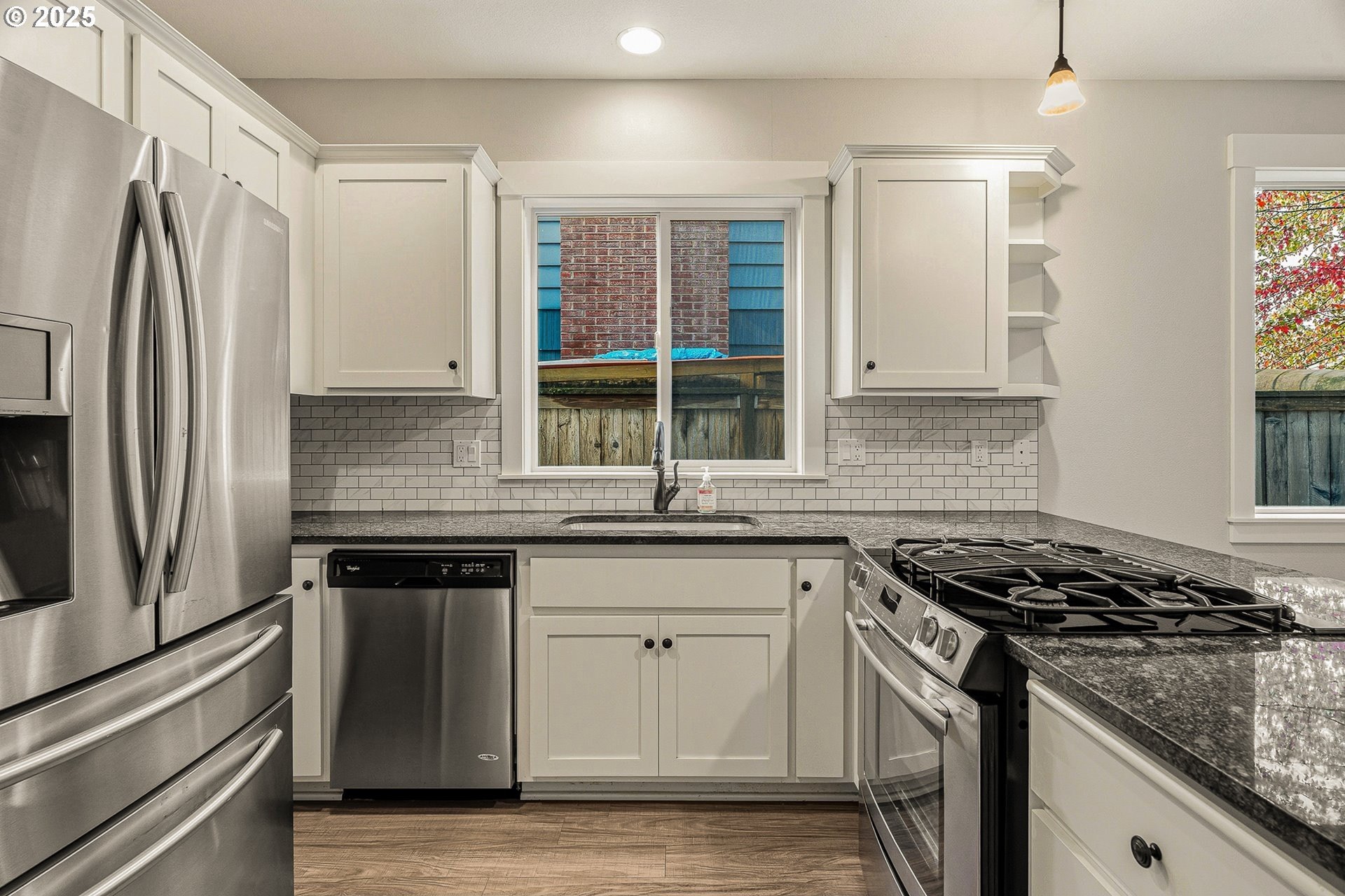 Tucked along a charming tree-lined street in Beaverton, this stylish 4-bedroom home blends comfort and personality at every turn! Step under the covered entrance into a cozy entry nook, then flow into the open-concept main level featuring a spacious living room with a gas fireplace, a dining area, and a gorgeous kitchen with a large island, stainless steel appliances, tiled backsplash, and tons of cabinet space. A sliding door off the dining area opens to a fully fenced, private backyard—ideal for BBQs, pets, or lazy weekend lounging. Upstairs, all four bedrooms and the laundry room keep things convenient, while the primary suite steals the show with vaulted ceilings and a private en suite. With an attached garage and a bright, inviting layout, this home has all the right vibes for easy living and effortless entertaining!