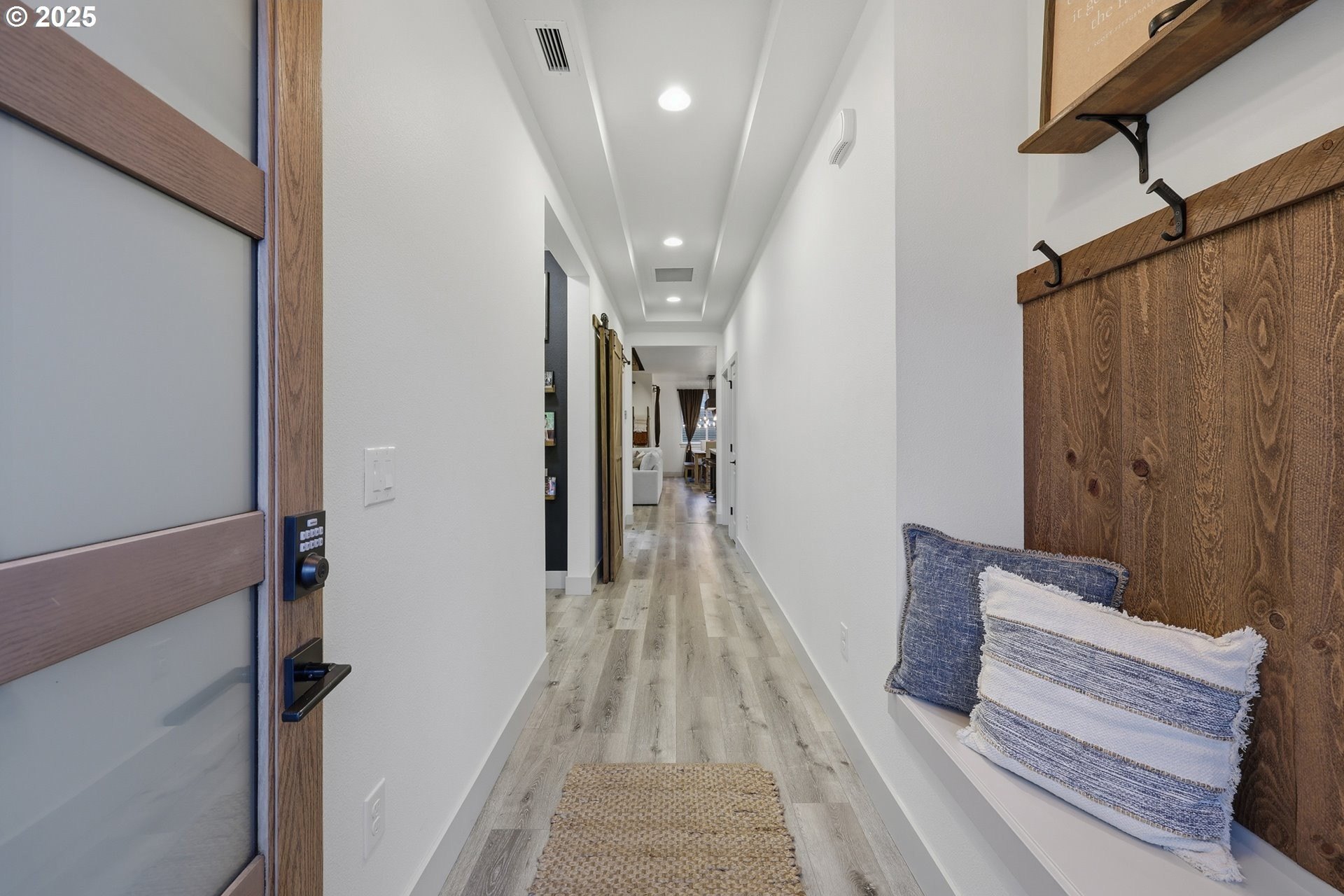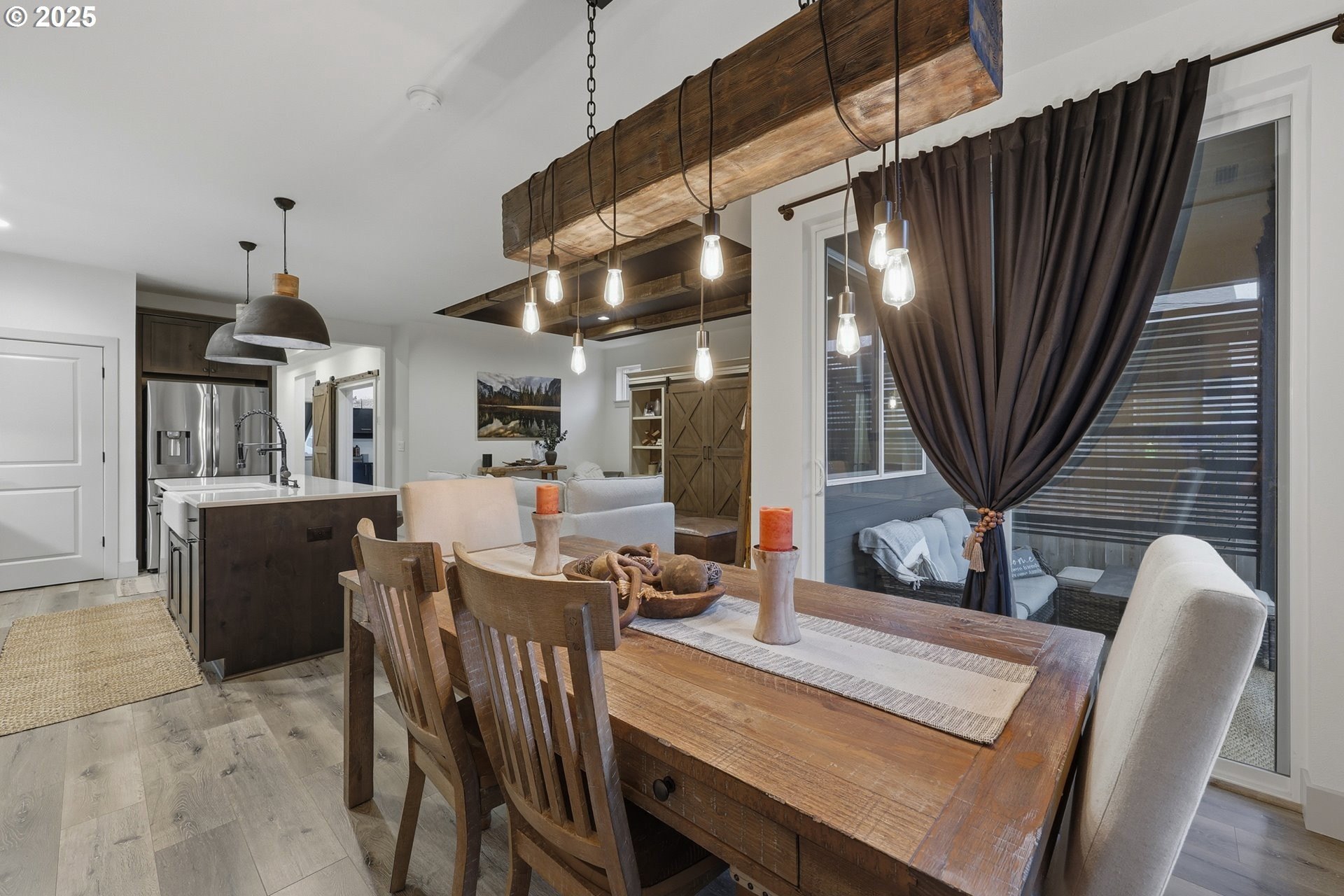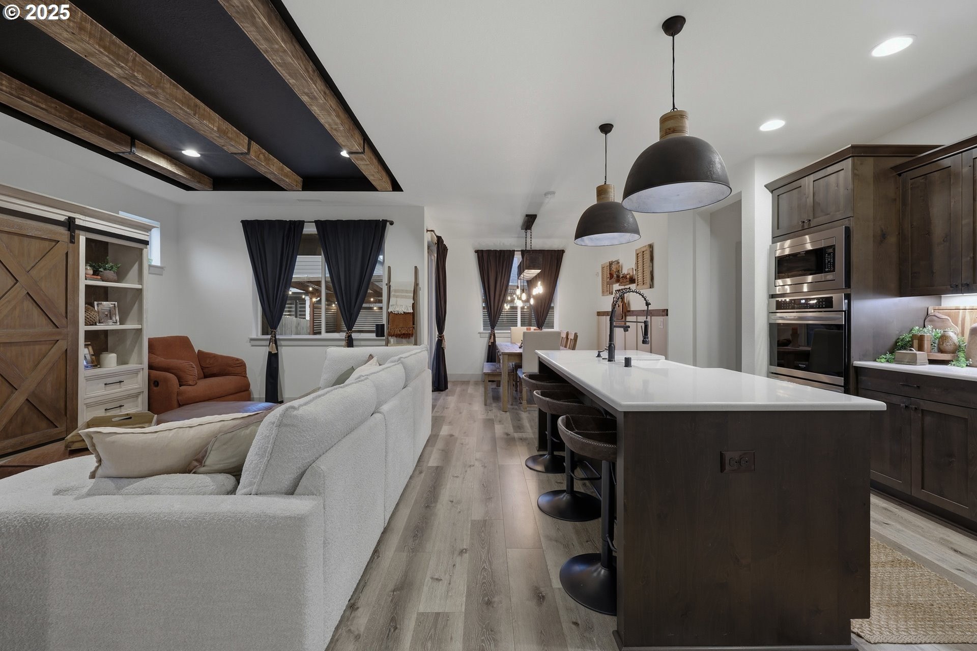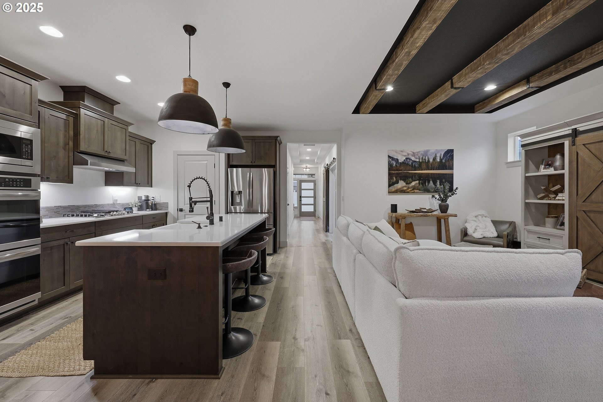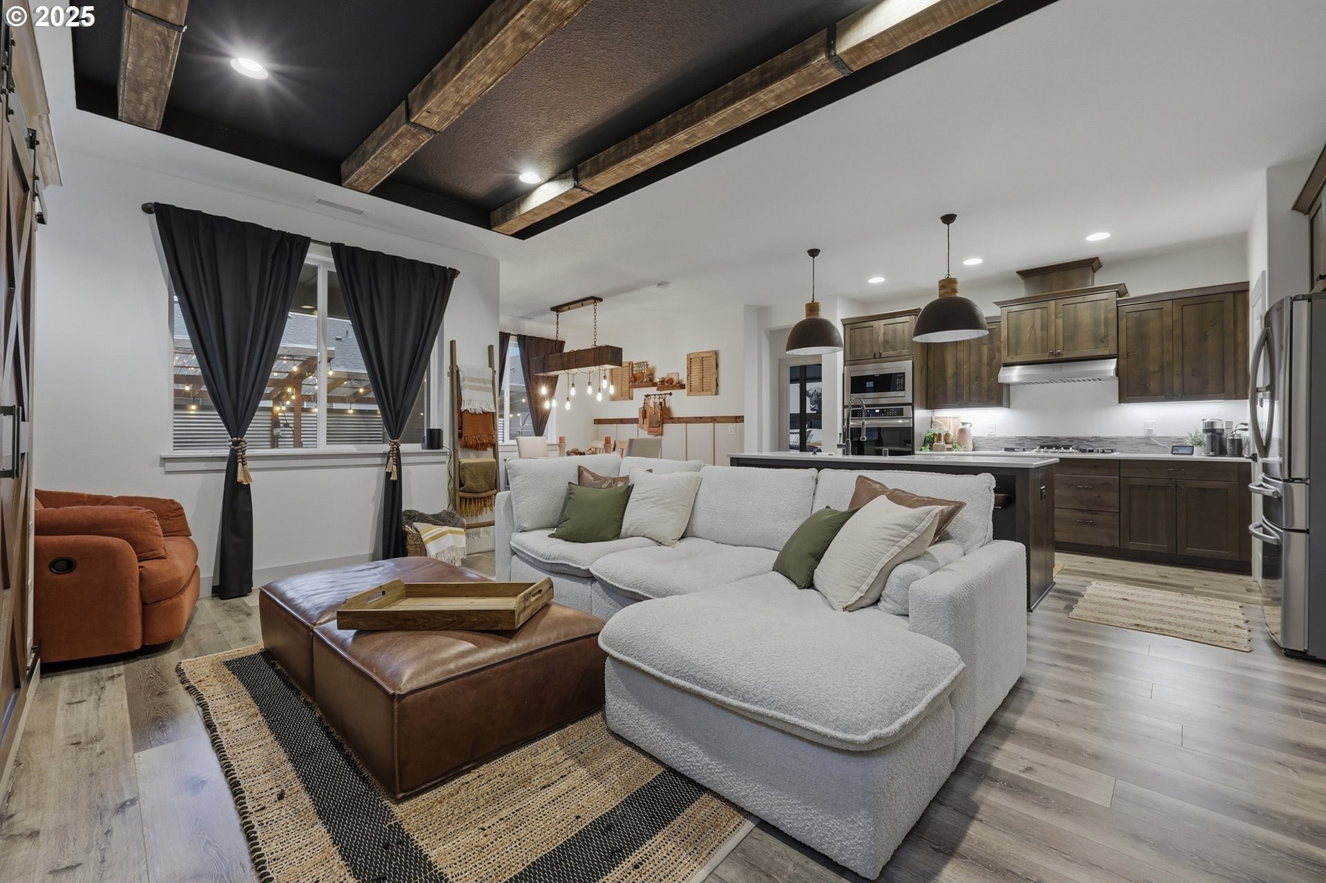 Stunning one-level home that truly stands out from new construction! Every detail has been thoughtfully upgraded, offering luxury, comfort, and functionality throughout. Step inside to an inviting open floor plan featuring custom faux wood beams, barn doors leading to both the den and primary suite, and designer lighting in every room. The chef’s kitchen is a showstopper — complete with double ovens, a 5-burner gas cooktop, farmhouse sink, and elegant quartz countertops — perfect for everyday living or entertaining in style. Relax in the primary suite featuring a water softener system in the shower, and unwind in total comfort thanks to the upgraded high-efficiency HVAC system with variable speed air handler, heat pump, electronic air filter, and in-duct air scrubber air purifier — all controlled by a ComfortLink smart thermostat for ideal climate control year-round. Love to work from home, this home includes a professionally designed salon! Outside, enjoy an extended covered back porch and a private covered deck, perfect for relaxing or hosting gatherings. Additional upgrades include extra power outlets in the backyard and garage, plus 220 power on the back deck — ideal for tools, a hot tub, or future outdoor projects. This home is truly move-in ready and better than new — every upgrade has been done for you!