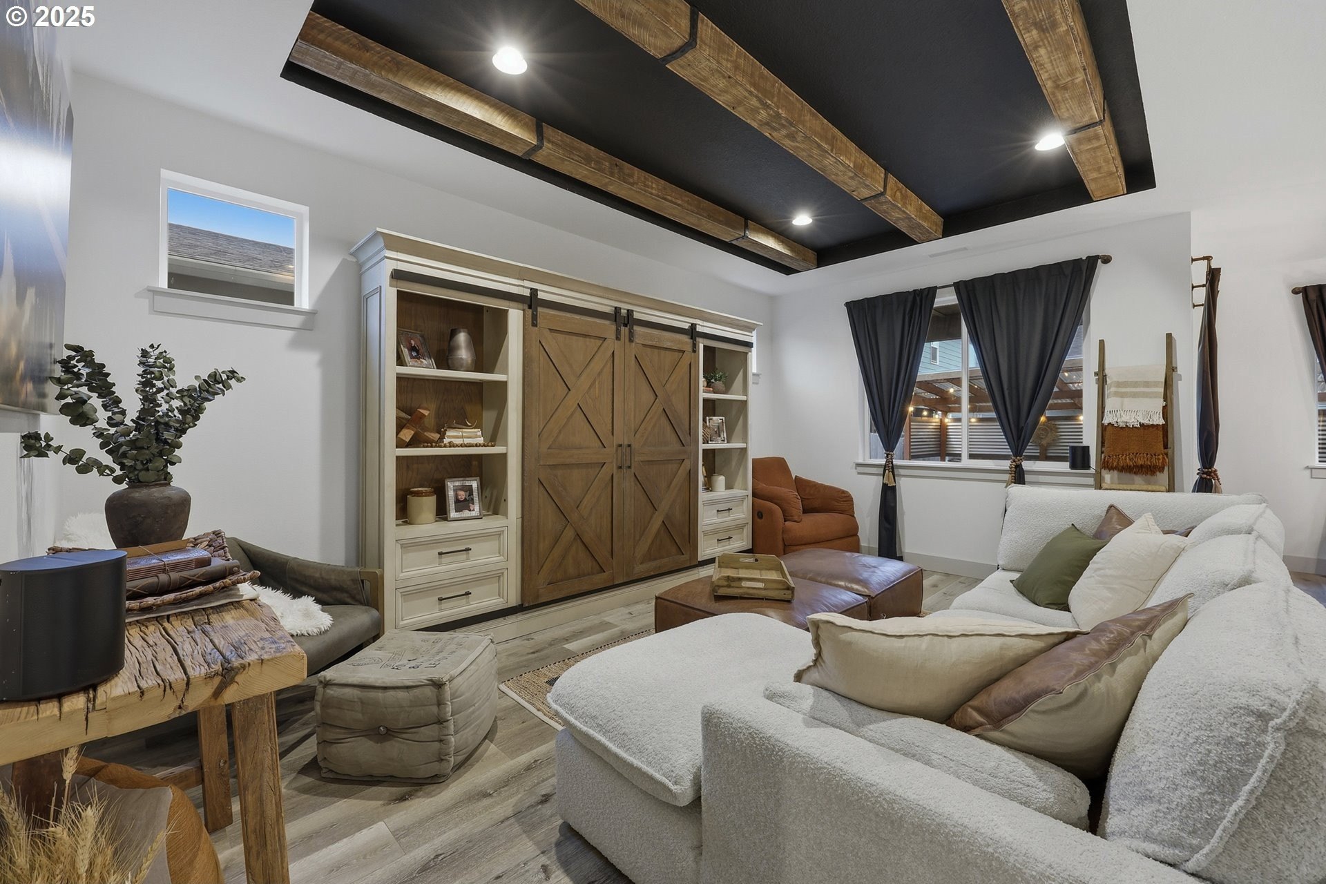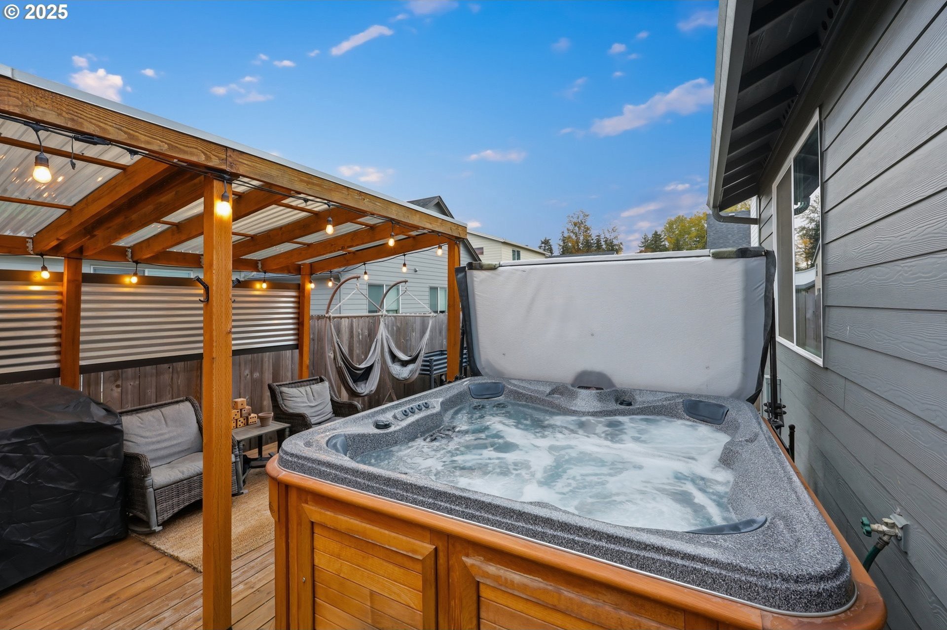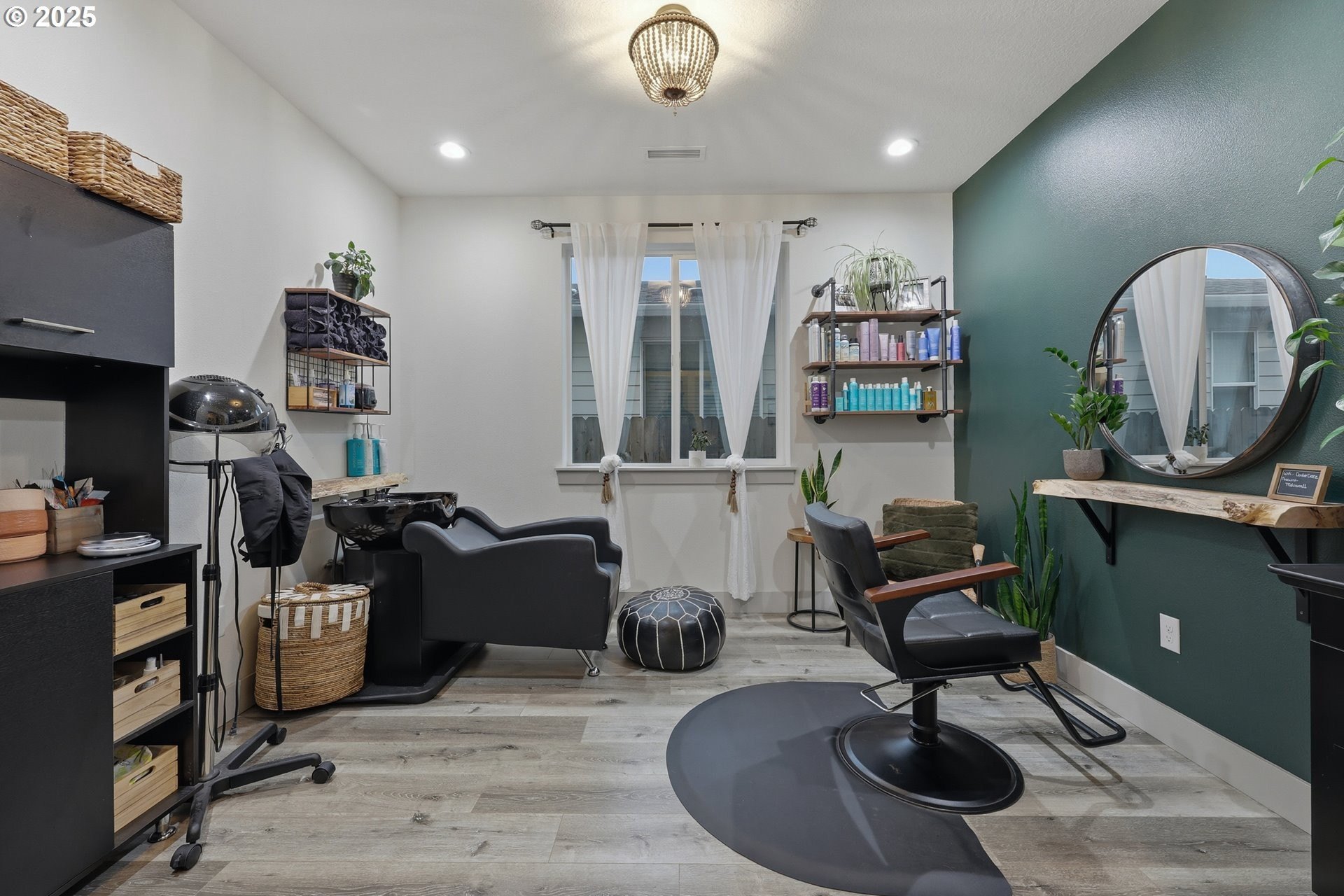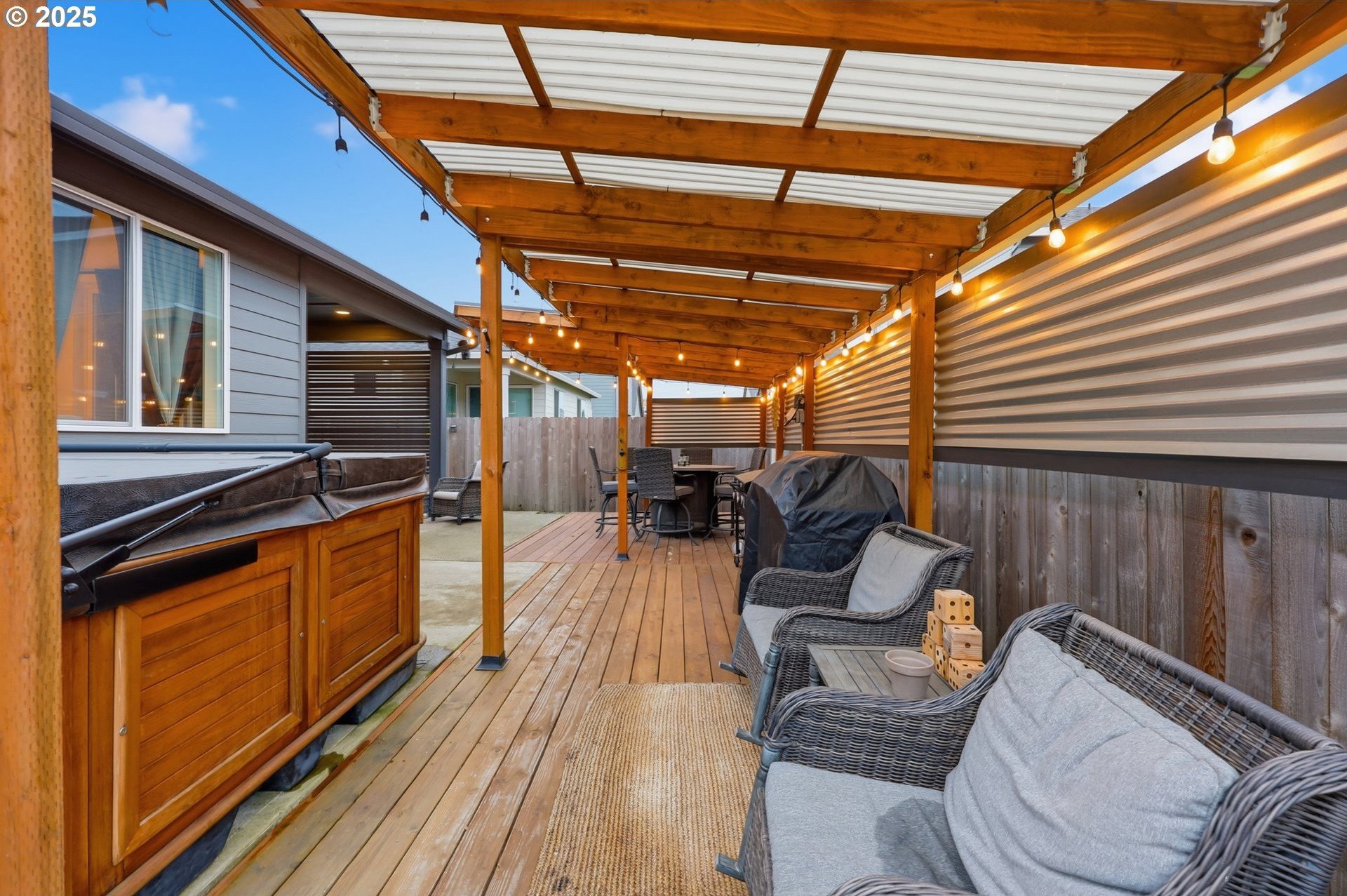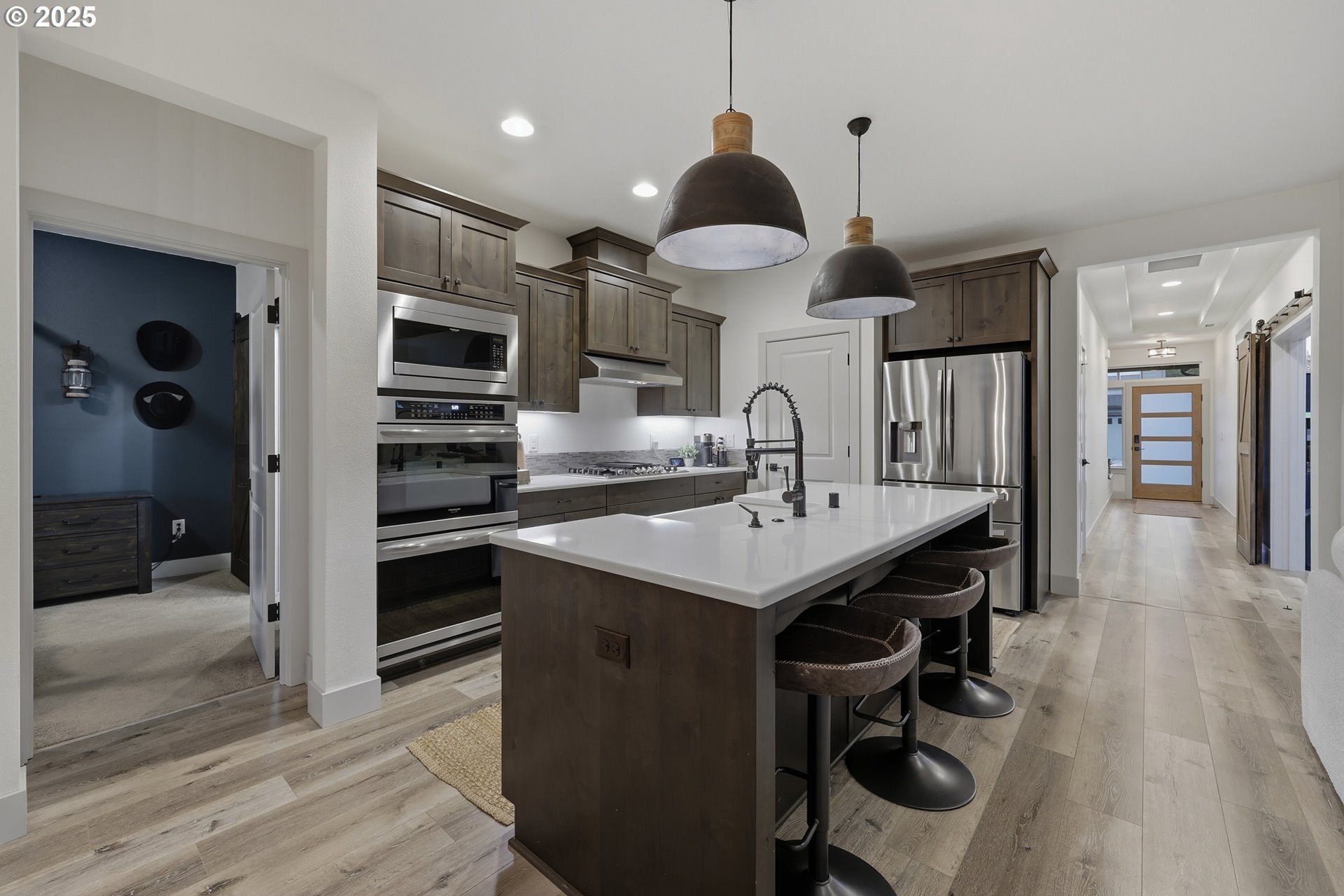 Stunning one-level home that truly stands out from new construction! Every detail has been thoughtfully upgraded, offering luxury, comfort, and functionality throughout. Step inside to an inviting open floor plan featuring custom faux wood beams, barn doors leading to both the den and primary suite, and designer lighting in every room. The chef’s kitchen is a showstopper — complete with double ovens, a 5-burner gas cooktop, farmhouse sink, and elegant quartz countertops — perfect for everyday living or entertaining in style. Relax in the primary suite featuring a water softener system in the shower, and unwind in total comfort thanks to the upgraded high-efficiency HVAC system with variable speed air handler, heat pump, electronic air filter, and in-duct air scrubber air purifier — all controlled by a ComfortLink smart thermostat for ideal climate control year-round. Love to work from home, this home includes a professionally designed salon! Outside, enjoy an extended covered back porch and a private covered deck, perfect for relaxing or hosting gatherings. Additional upgrades include extra power outlets in the backyard and garage, plus 220 power on the back deck — ideal for tools, a hot tub, or future outdoor projects. This home is truly move-in ready and better than new — every upgrade has been done for you!