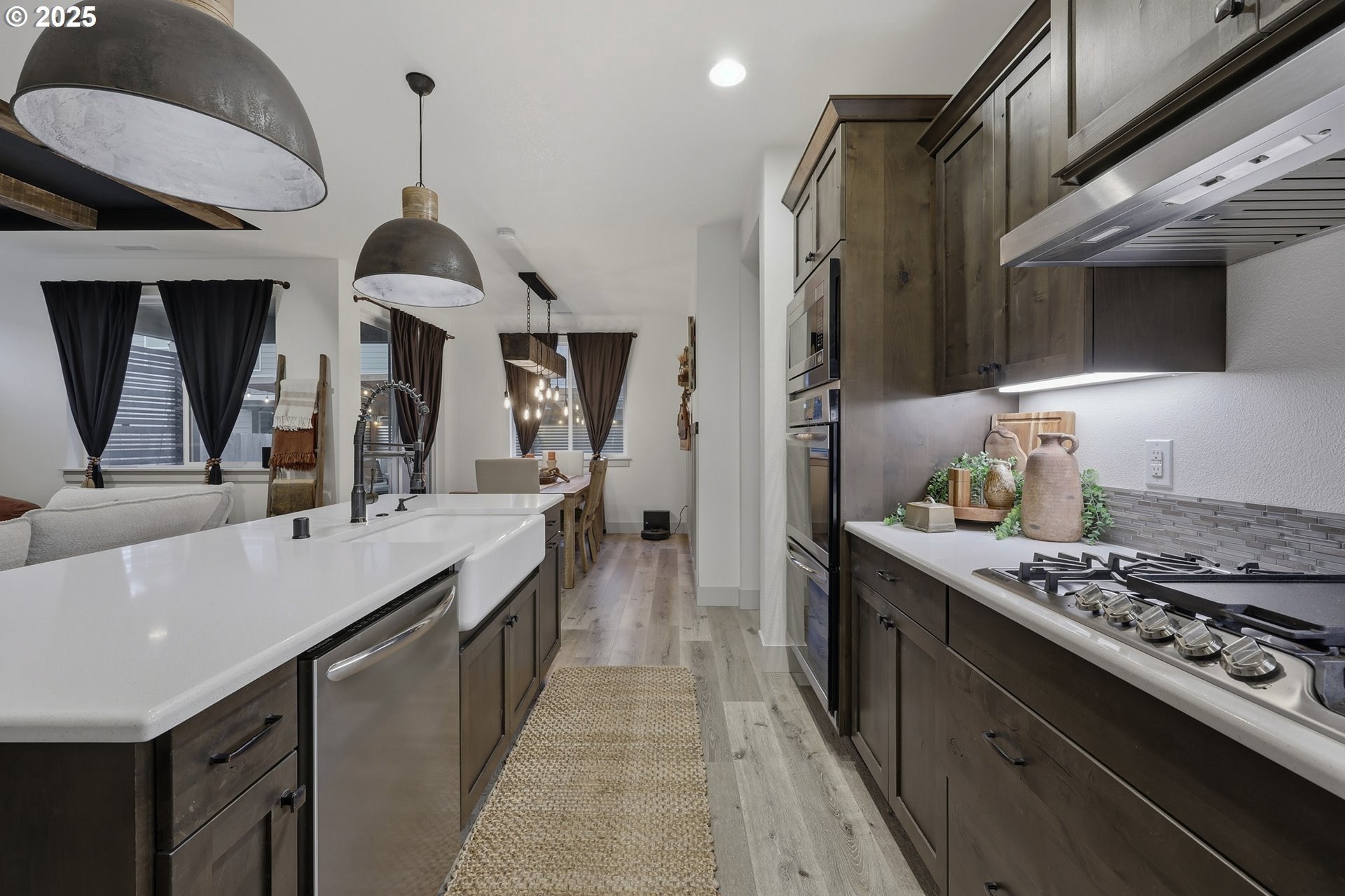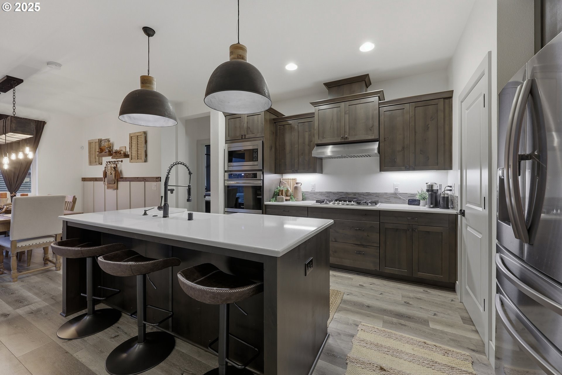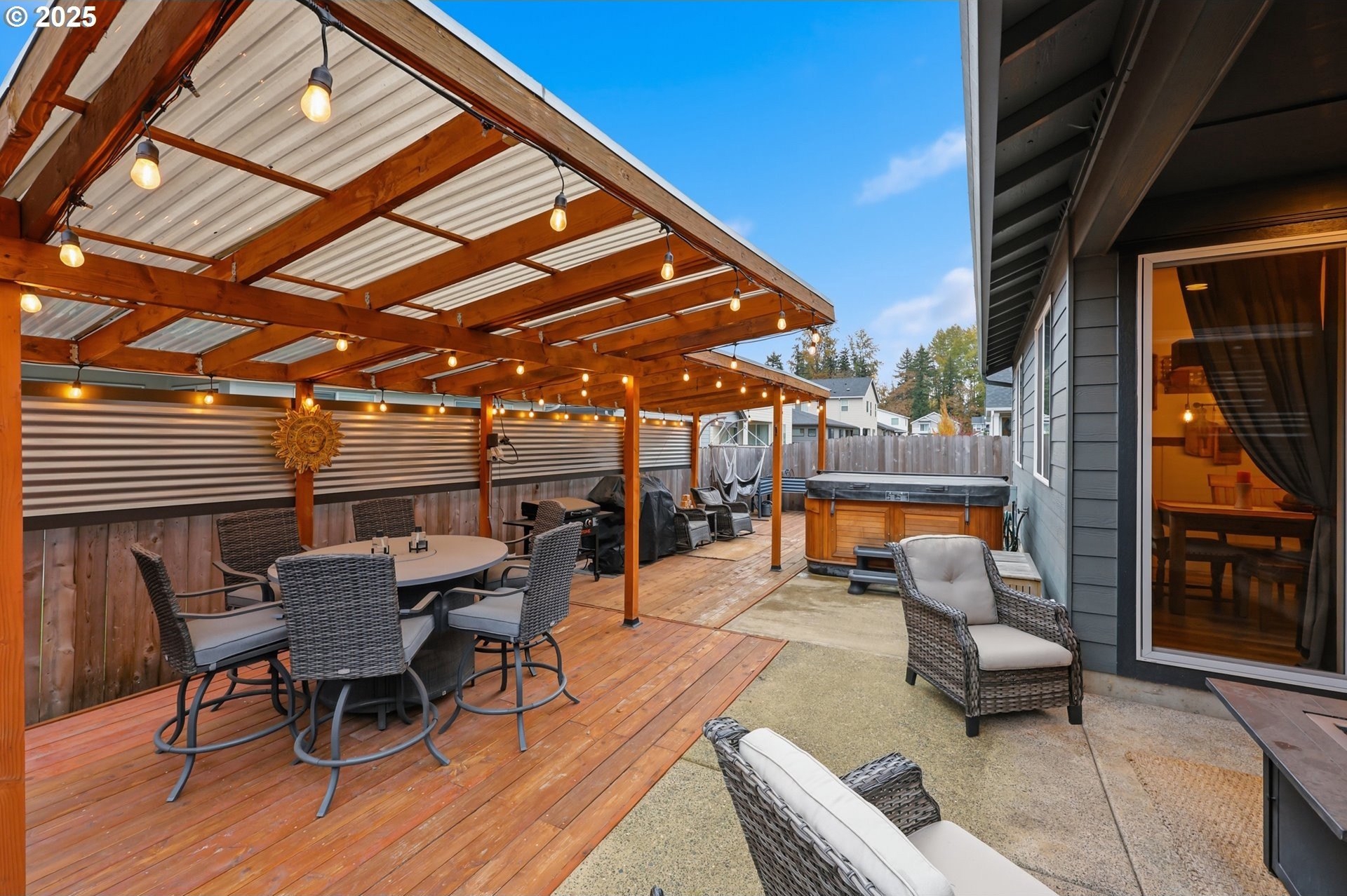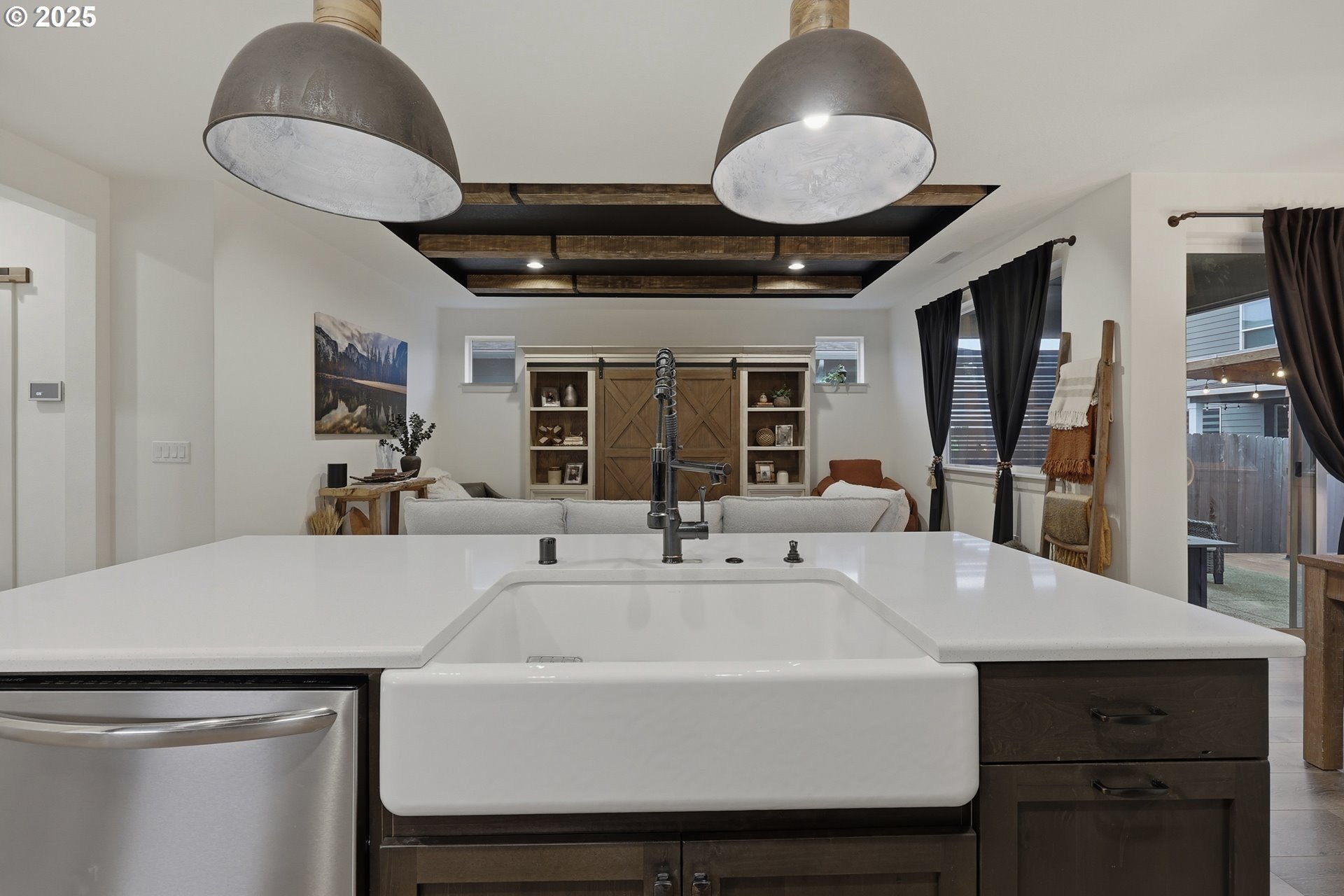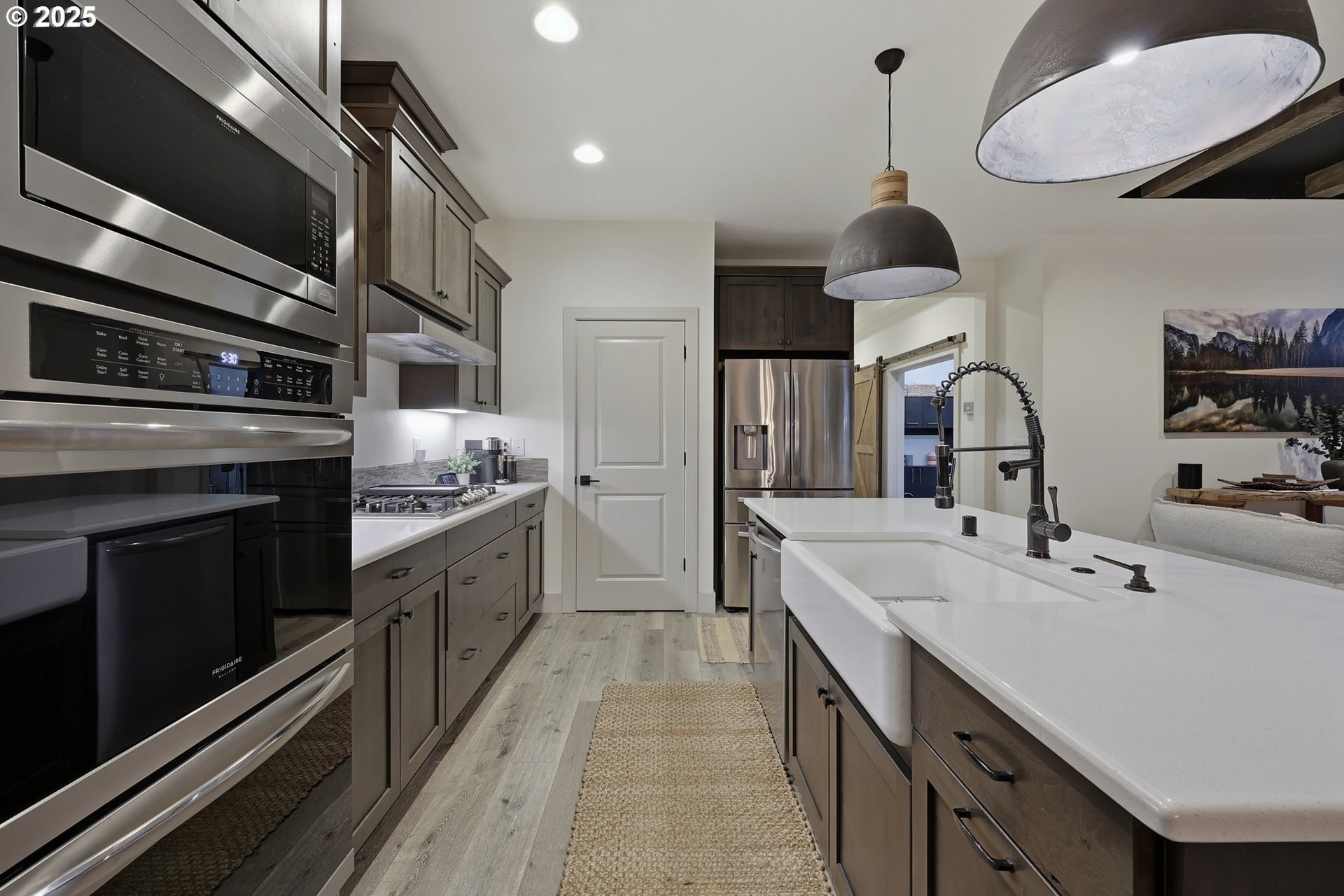 Stunning one-level home that truly stands out from new construction! Every detail has been thoughtfully upgraded, offering luxury, comfort, and functionality throughout. Step inside to an inviting open floor plan featuring custom faux wood beams, barn doors leading to both the den and primary suite, and designer lighting in every room. The chef’s kitchen is a showstopper — complete with double ovens, a 5-burner gas cooktop, farmhouse sink, and elegant quartz countertops — perfect for everyday living or entertaining in style. Relax in the primary suite featuring a water softener system in the shower, and unwind in total comfort thanks to the upgraded high-efficiency HVAC system with variable speed air handler, heat pump, electronic air filter, and in-duct air scrubber air purifier — all controlled by a ComfortLink smart thermostat for ideal climate control year-round. Love to work from home, this home includes a professionally designed salon! Outside, enjoy an extended covered back porch and a private covered deck, perfect for relaxing or hosting gatherings. Additional upgrades include extra power outlets in the backyard and garage, plus 220 power on the back deck — ideal for tools, a hot tub, or future outdoor projects. This home is truly move-in ready and better than new — every upgrade has been done for you!