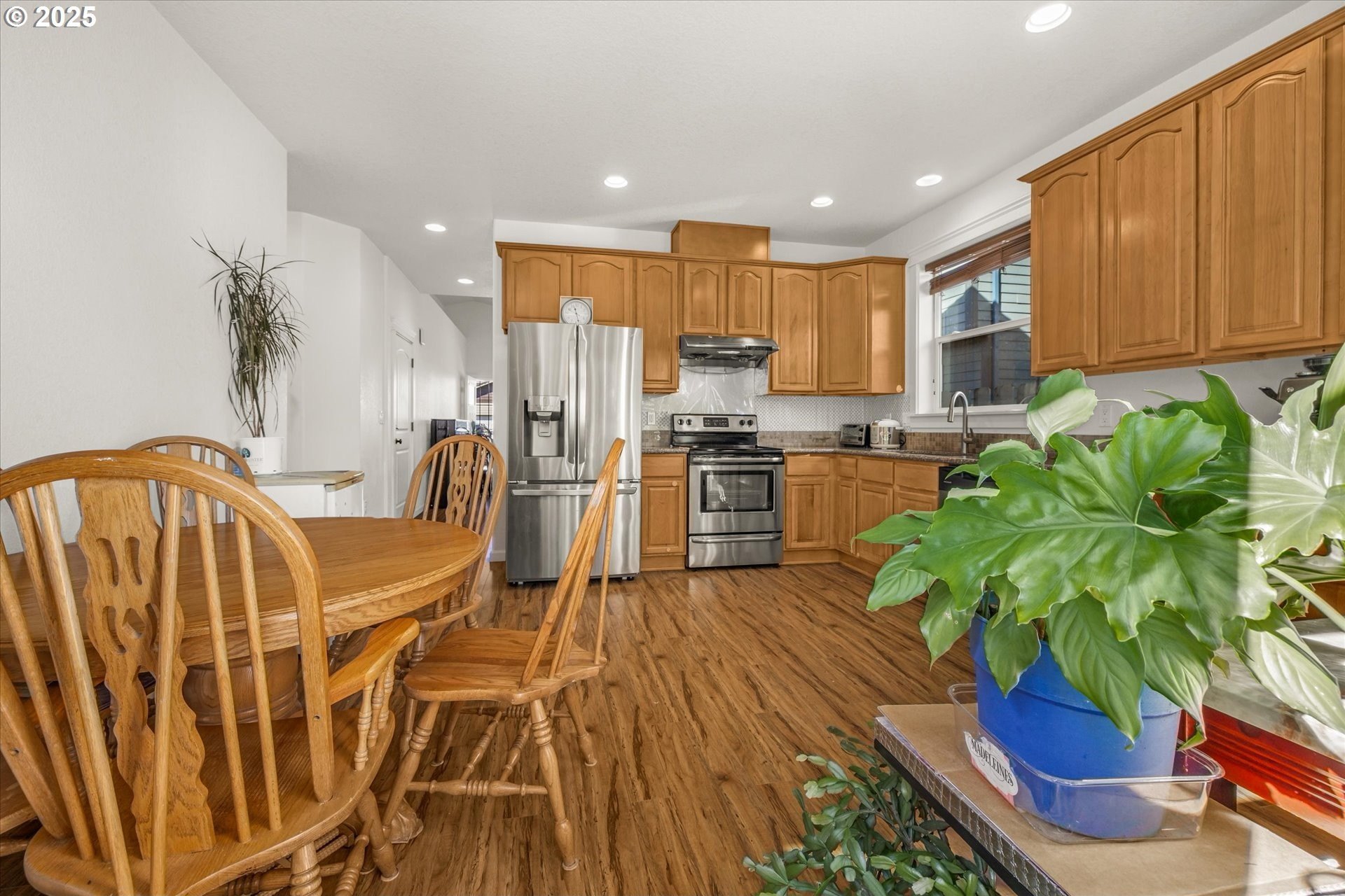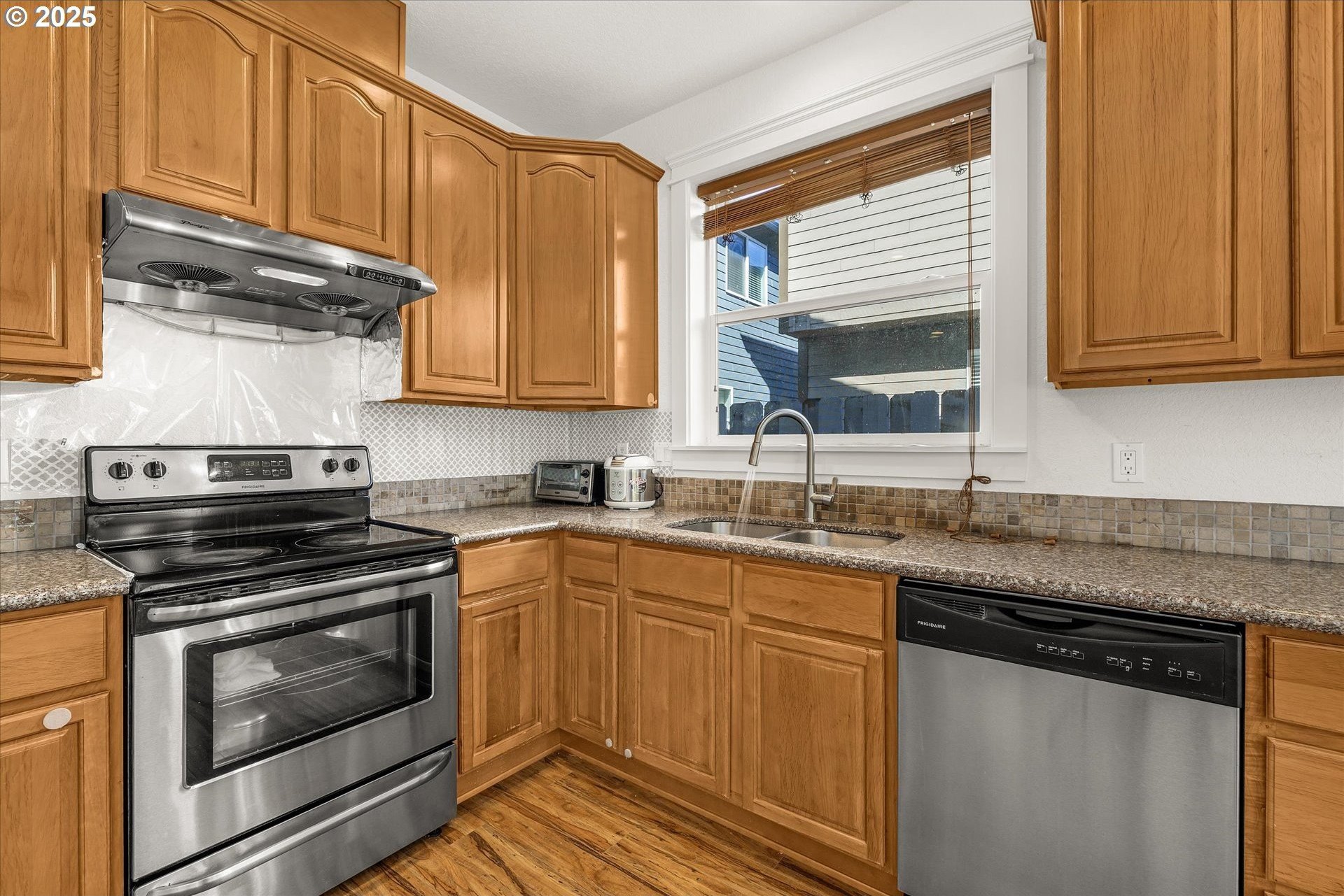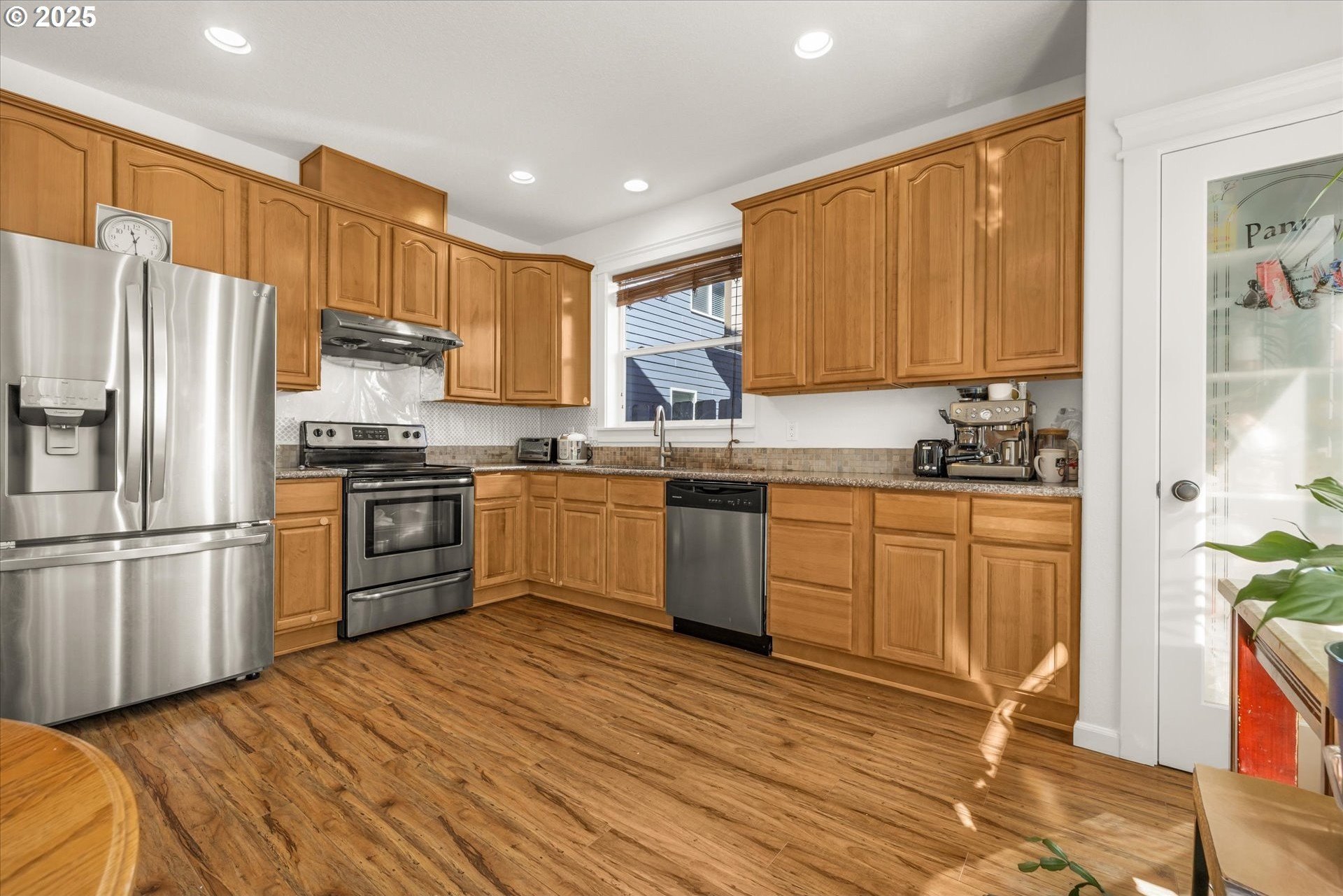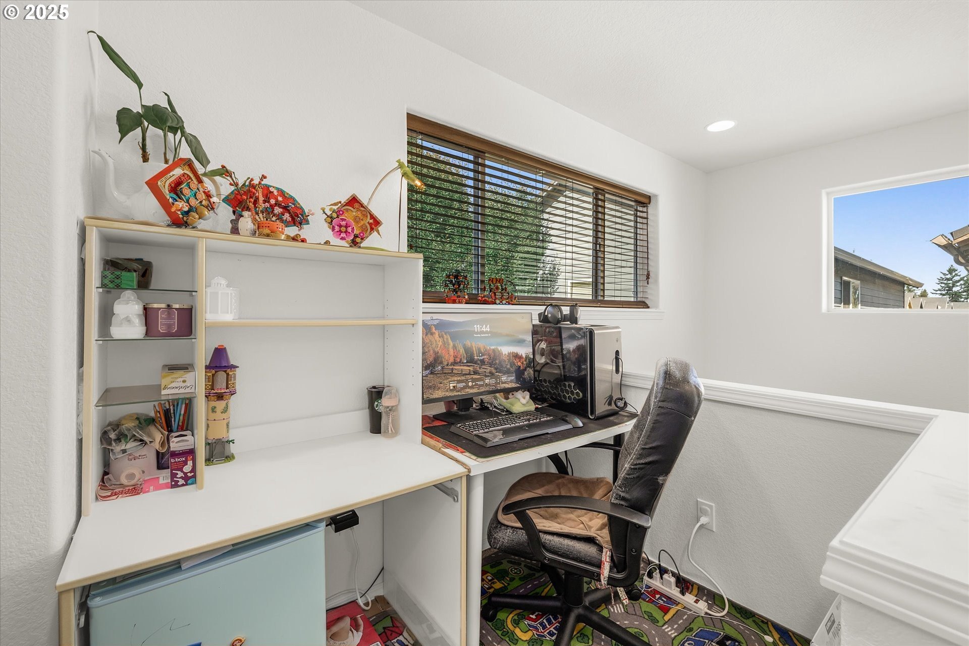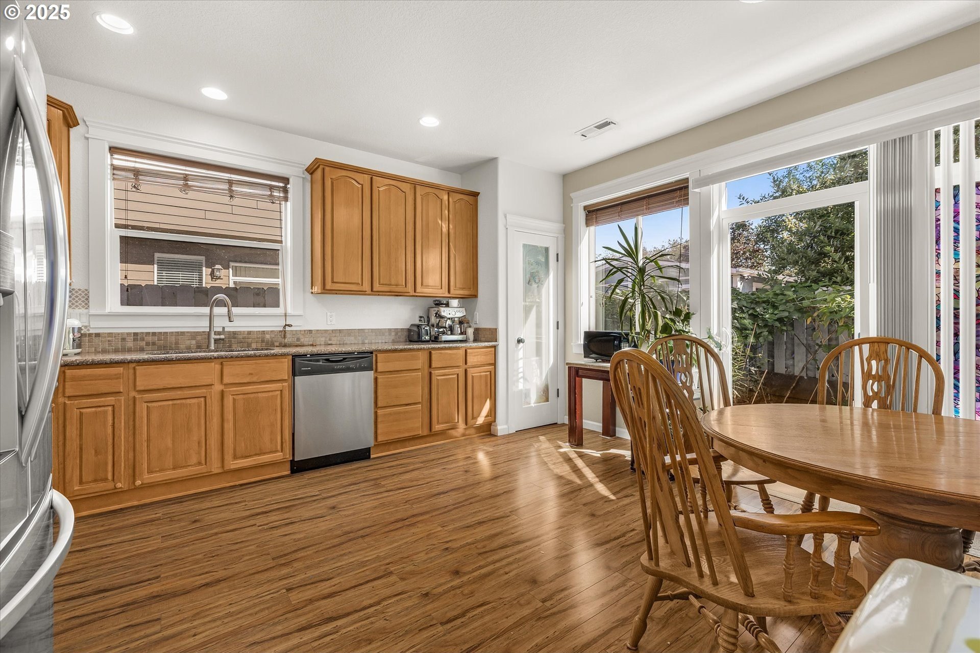 Tucked in a quiet pocket of newer homes, this 2011-built gem offers 3 beds + DEN w/ 3 full baths, soaring 9’ ceilings, and abundant natural light through oversized double-pane windows. Open-concept living flows effortlessly from kitchen—stainless appliances, stone counters, pantry—to dining and great room, ideal for gatherings.Upstairs includes a vaulted primary suite and additional bedroom, plus full bath with enclosed laundry. Main level features a bedroom room with closet and full bath—perfect for guests or home office.Enjoy a fully fenced, low-maintenance yard with slab patio. Luxury plank flooring downstairs, move-in ready. NO HOA. Must see and price to sell.