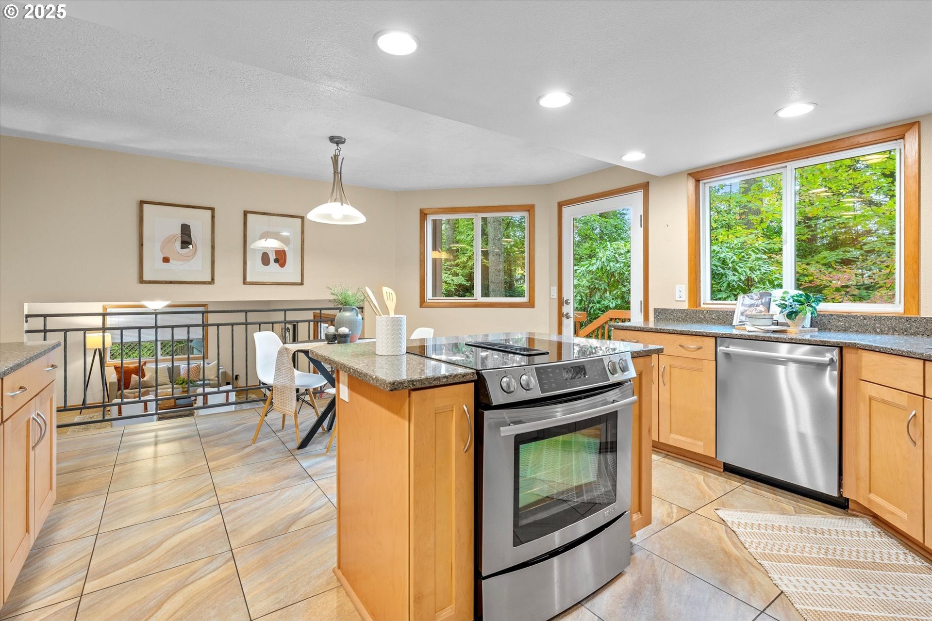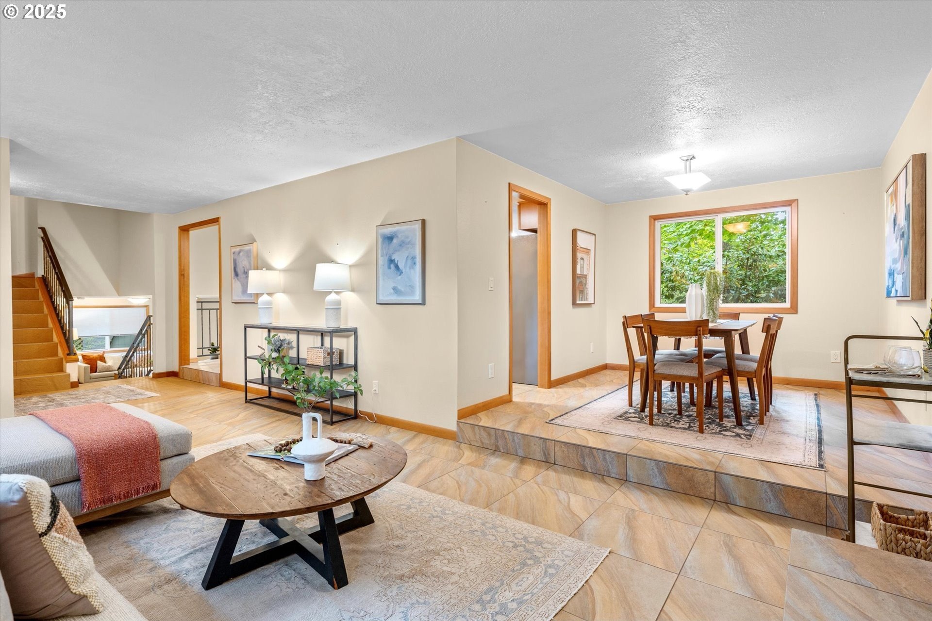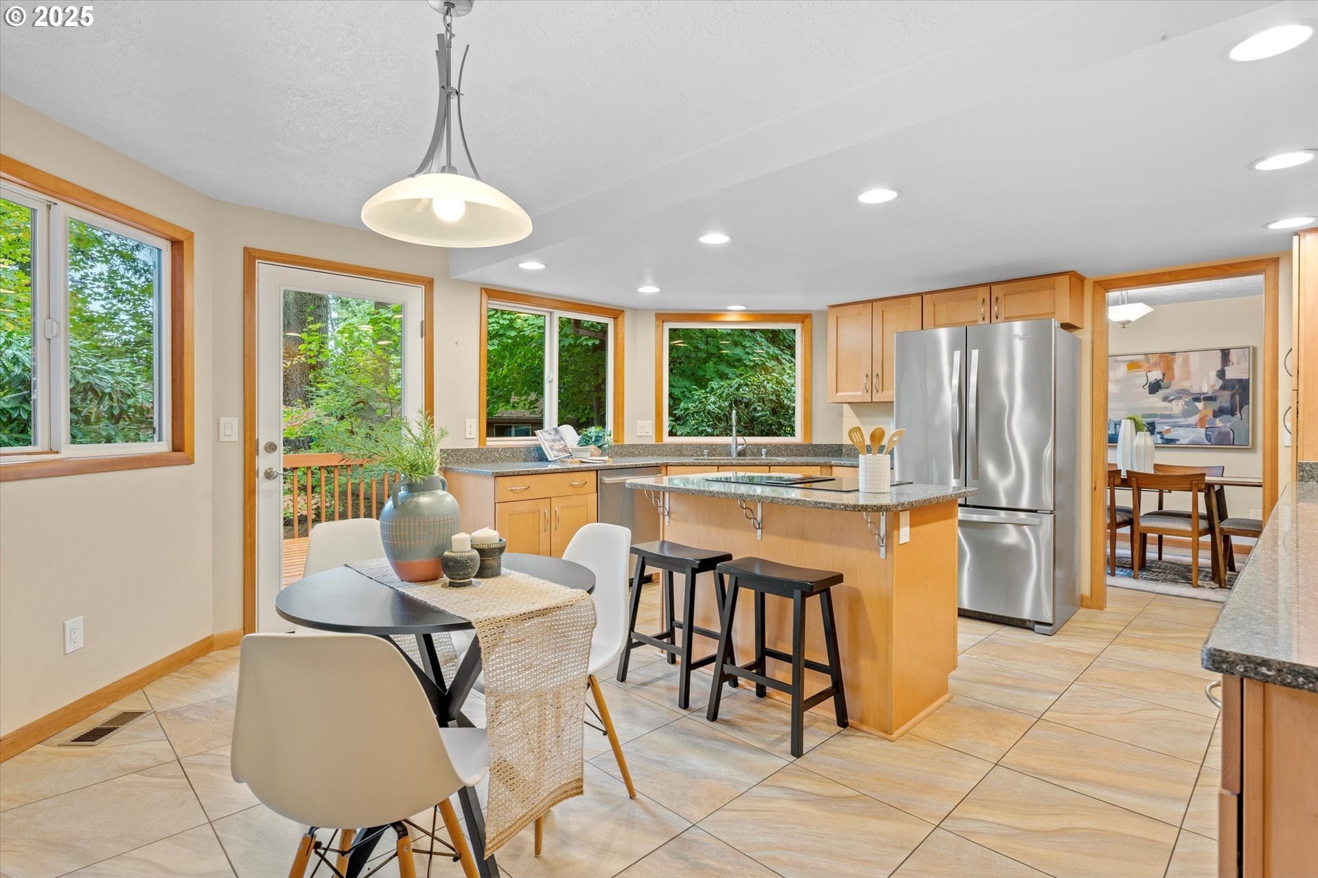 Beautiful park like setting in an established Tualatin neighborhood, this tri-level home delivers the kind of everyday comfort and livability that works beautifully. Classic features meet thoughtful updates, creating a home that feels cared-for, warm, and easy to move into.A welcoming entry leads to a cozy living room centered around a wood-burning brick fireplace — the kind of space that instantly slows the day down. The kitchen blends function and style with quartz countertops, porcelain tile floors, stainless steel appliances, a Jenn-Air ceramic cooktop, and maple wood cabinetry with pull-outs for smart storage. An eat-in nook with backyard access makes casual meals easy, while the formal dining room is ready for holidays and larger gatherings.The lower level offers a spacious family room with French doors to the backyard — great for movie nights, homework zones, or office space — plus a convenient half bath for guests.Upstairs, the primary suite includes a walk-in closet, tiled shower, and quartz vanity. Two additional bedrooms share an updated hallway bath.The backyard feels like a quiet retreat with 2 cedar decks for morning coffee, mature trees providing shade and privacy, and a 12×16 shed with windows and power (110 & 220amp) — an easy fit for a workshop, art space, or well-organized storage. The home has been genuinely cared for and gives you the freedom to add your own style without starting from scratch. Come see the comfort, the calm, and the potential to make it yours.