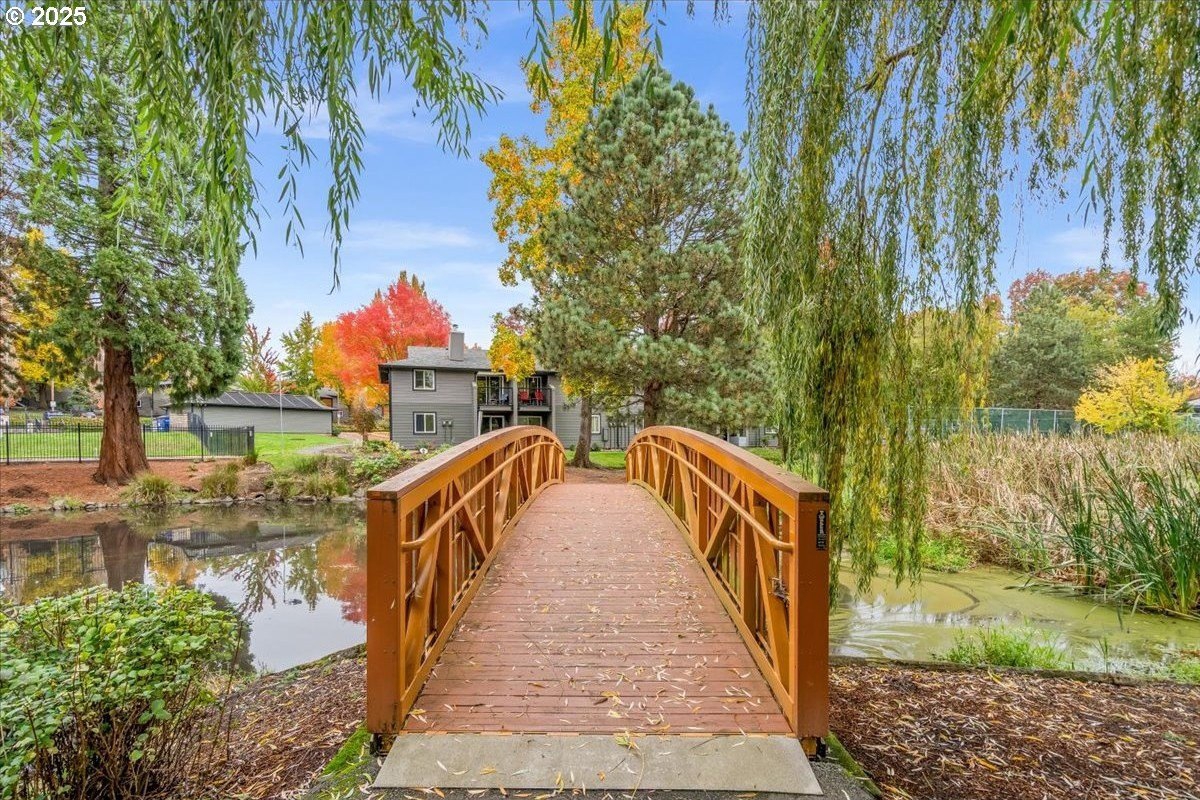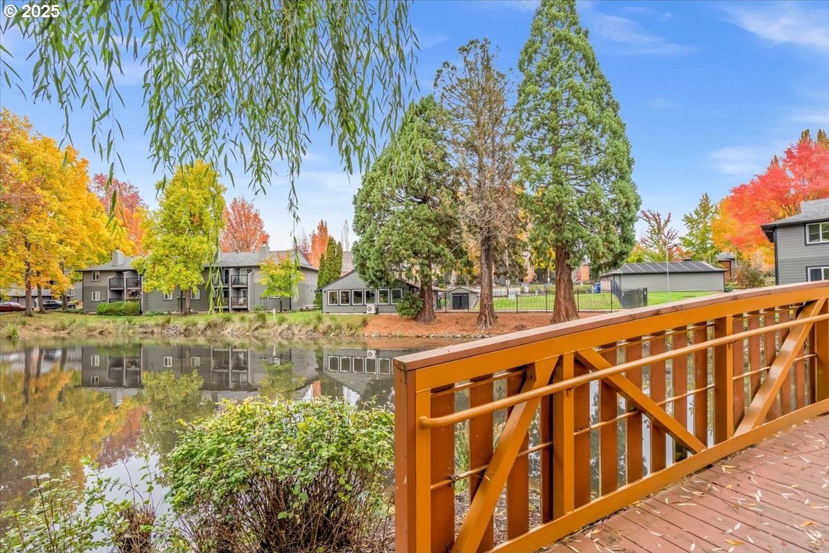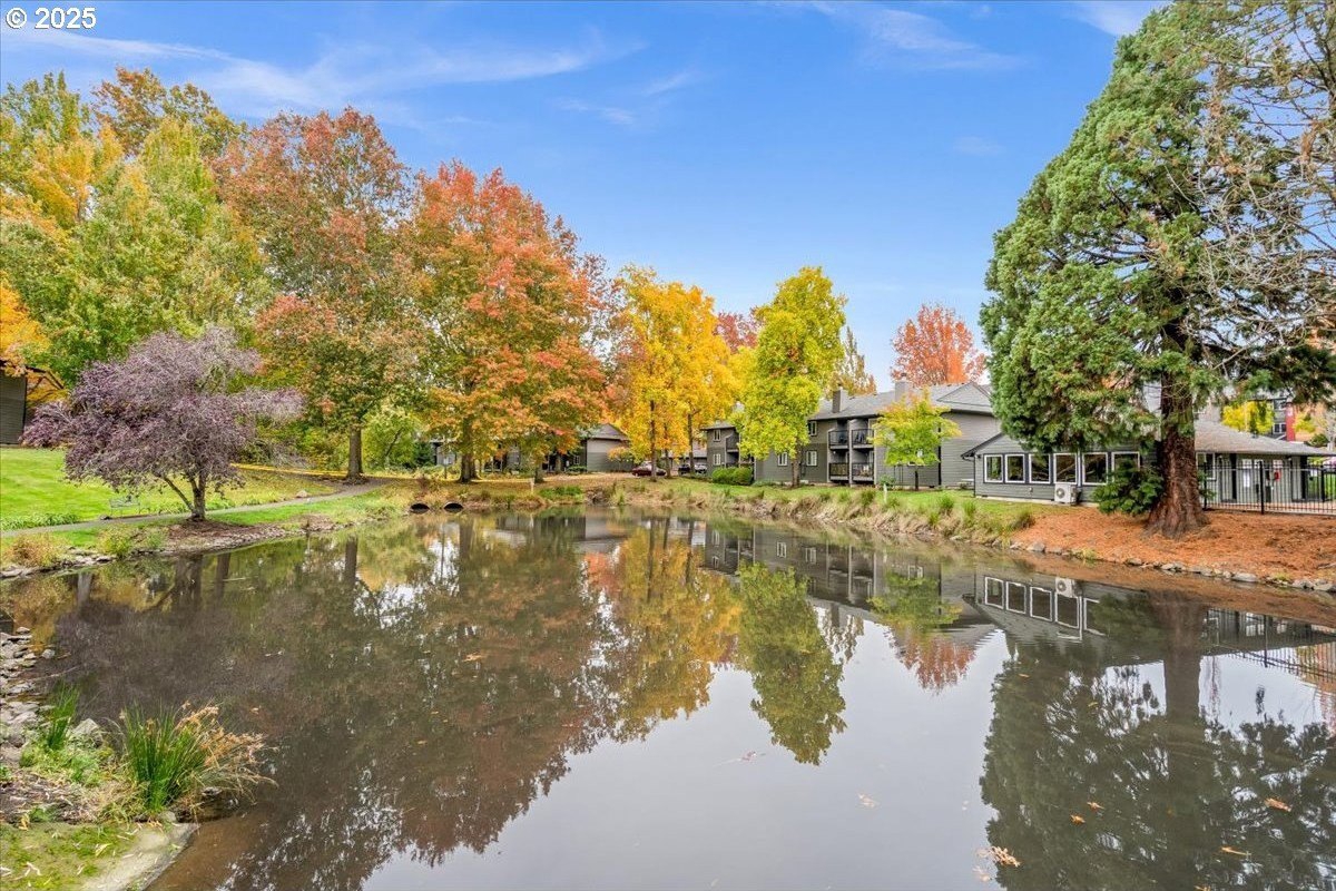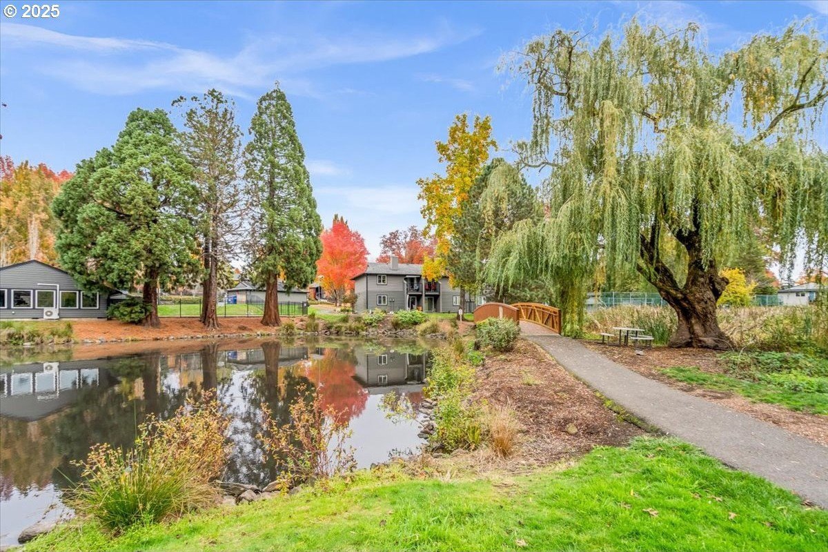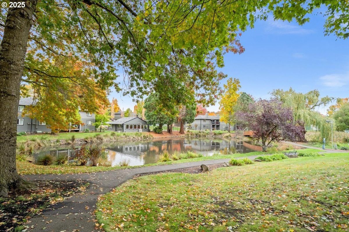 Lovingly updated condo with a cute vintage style! Nestled in a quiet nook of the community, this delightful 2-bedroom home features a nearly brand-new exterior envelope thanks to a well cared for community. A nice ground-level unit with a reserved parking space just steps from the entry. It boasts a private back patio that opens directly to a lush lawn and community green space—an ideal spot for morning coffee, fresh air, and quiet relaxation. Inside, enjoy the ease of two in-unit laundry options, a bedroom with a convenient half-bath ensuite, plus a full bathroom. Large windows invite natural light and offer tranquil views of the greenspace and shimmering pond. Updated flooring and paint throughout. The HOA has completed extensive exterior renovations including new siding, windows, doors, paint, paving, stairwells, and more. Your dues cover water, sewer, garbage, exterior maintenance, and access to fantastic amenities—pool, recreation room, tennis courts, walking trails, and scenic pond views.Perfectly situated minutes from tons of amenities-Market of Choice, Home Depot, Grand Central Bakery, Laughing planet, Hwy 217 & 26, and the MAX line, this home offers low-maintenance living in a peaceful natural setting with unbeatable convenience.