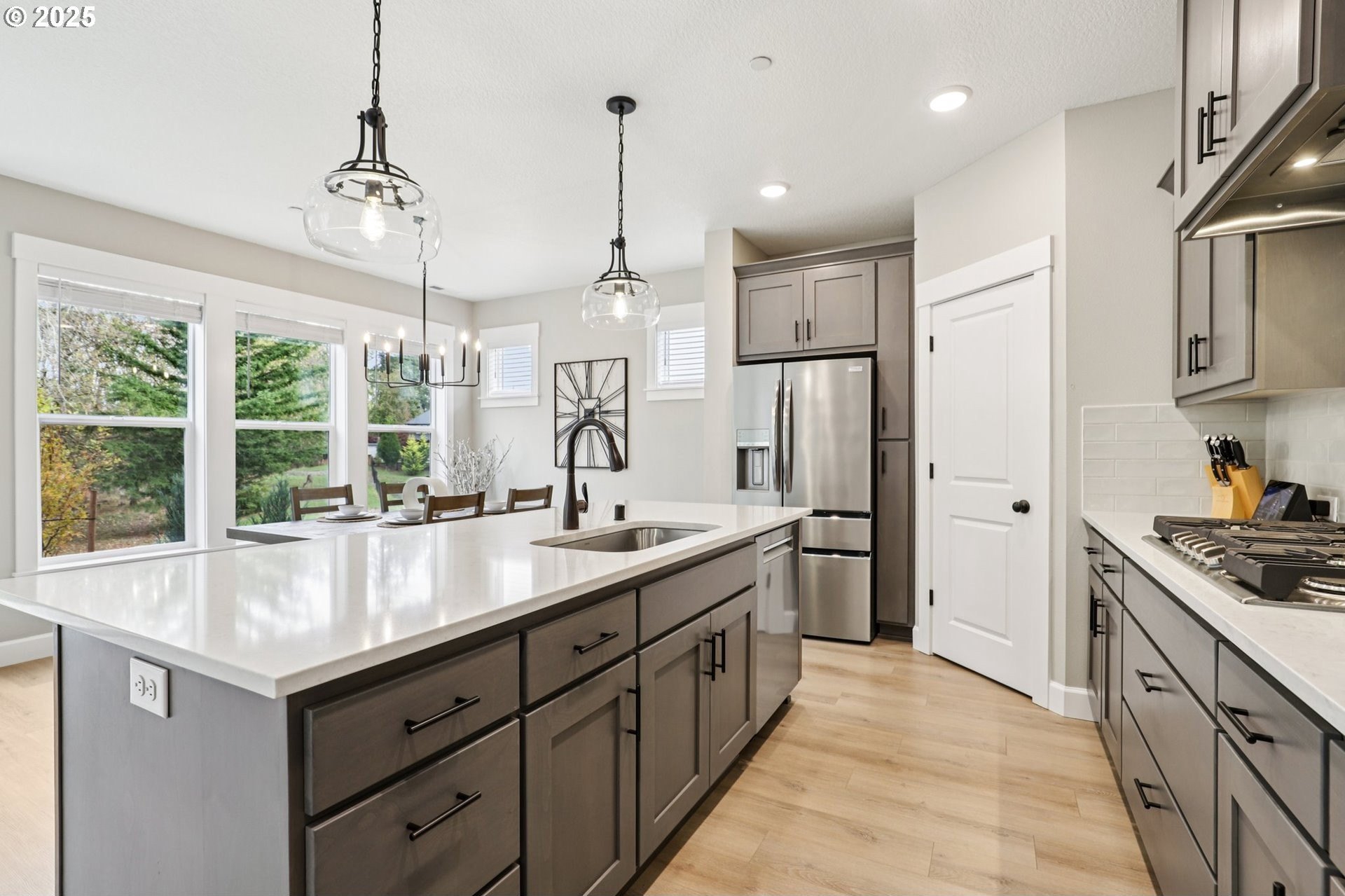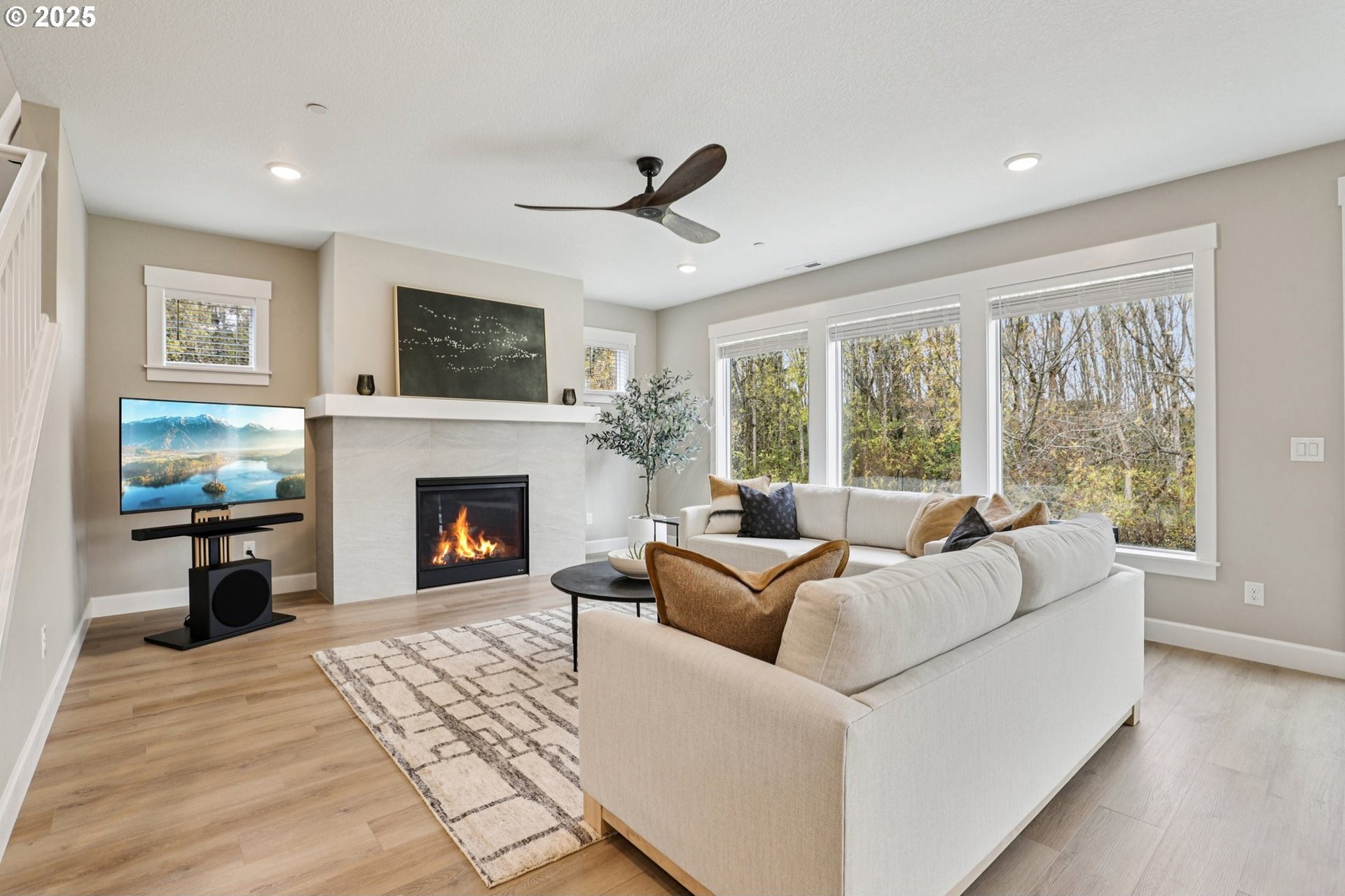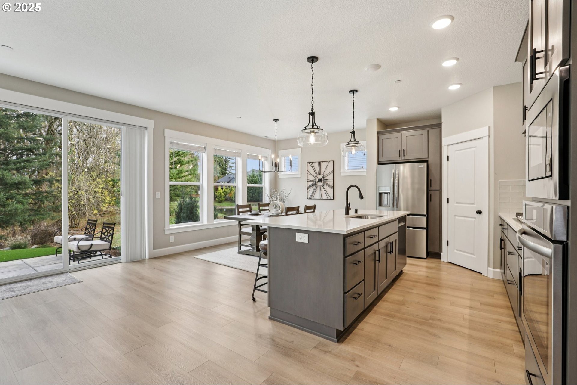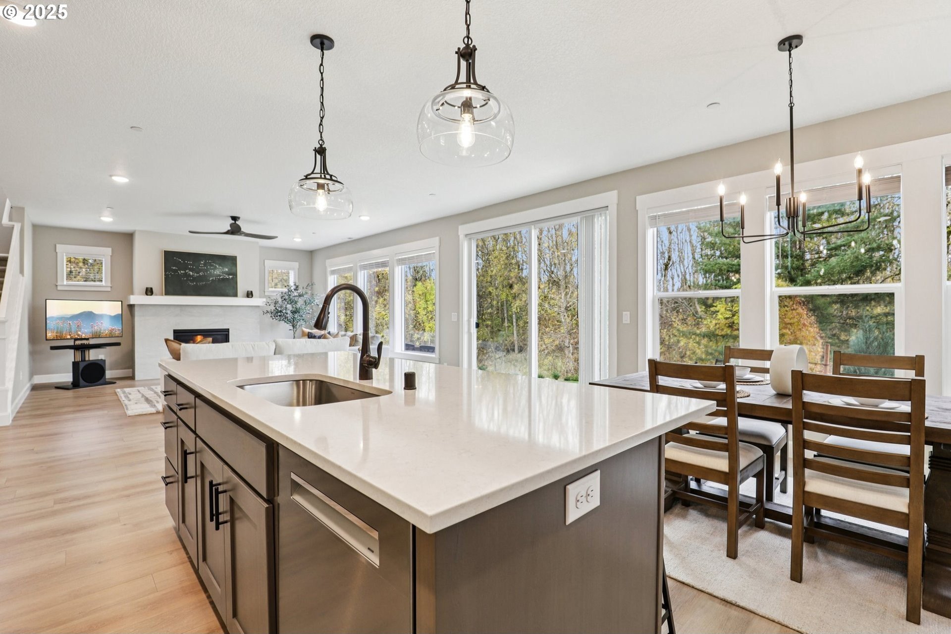 Immaculate Camas home backing to protected greenspace offers the perfect blend of sophistication, comfort, and natural beauty. Enjoy beautiful sight lines, exceptional privacy, peaceful presence of mature trees and the occasional family of deer. The home’s freshly painted interior, upgraded lighting, and newly installed EV charger reflect thoughtful care and modern convenience. The open-concept main floor features a spacious dining area, a large quartz island perfect for gatherings, and a welcoming living room with a gas fireplace. A private office on the main level provides an ideal space for work or quiet reflection. Oversized windows throughout the home invite abundant natural light, enhancing the home’s airy ambiance. Upstairs, a stylish loft with a custom feature wall serves beautifully as a second living area. The primary suite impresses with expansive windows, an elegantly updated ensuite, and a meticulously organized walk-in closet. Two additional bedrooms and a conveniently located laundry room complete the upper level.Outside, the extended patio with concrete and turf creates an inviting setting for outdoor relaxation and entertaining. Don’t miss the side yard - perfect for additional guests or play!