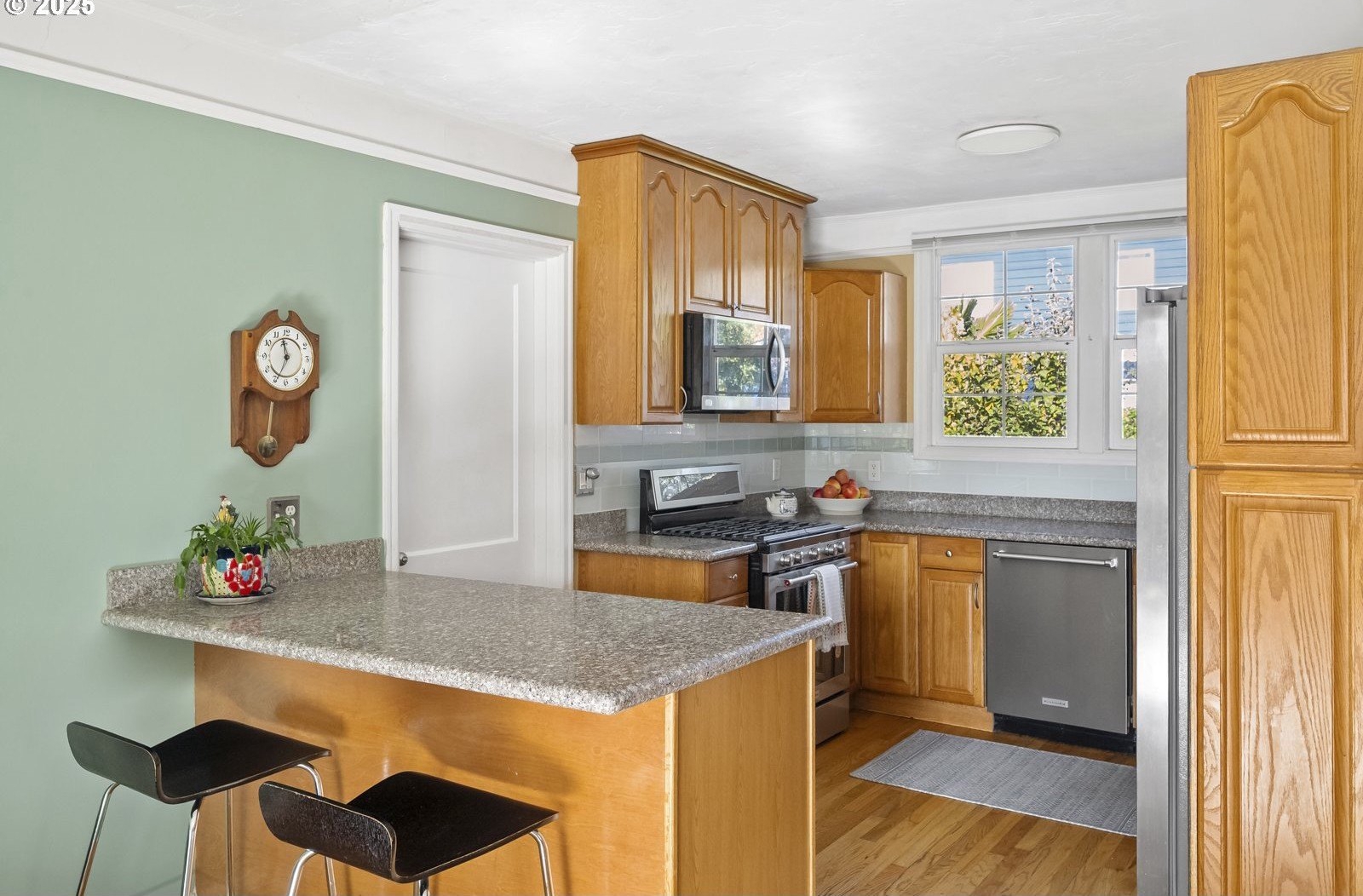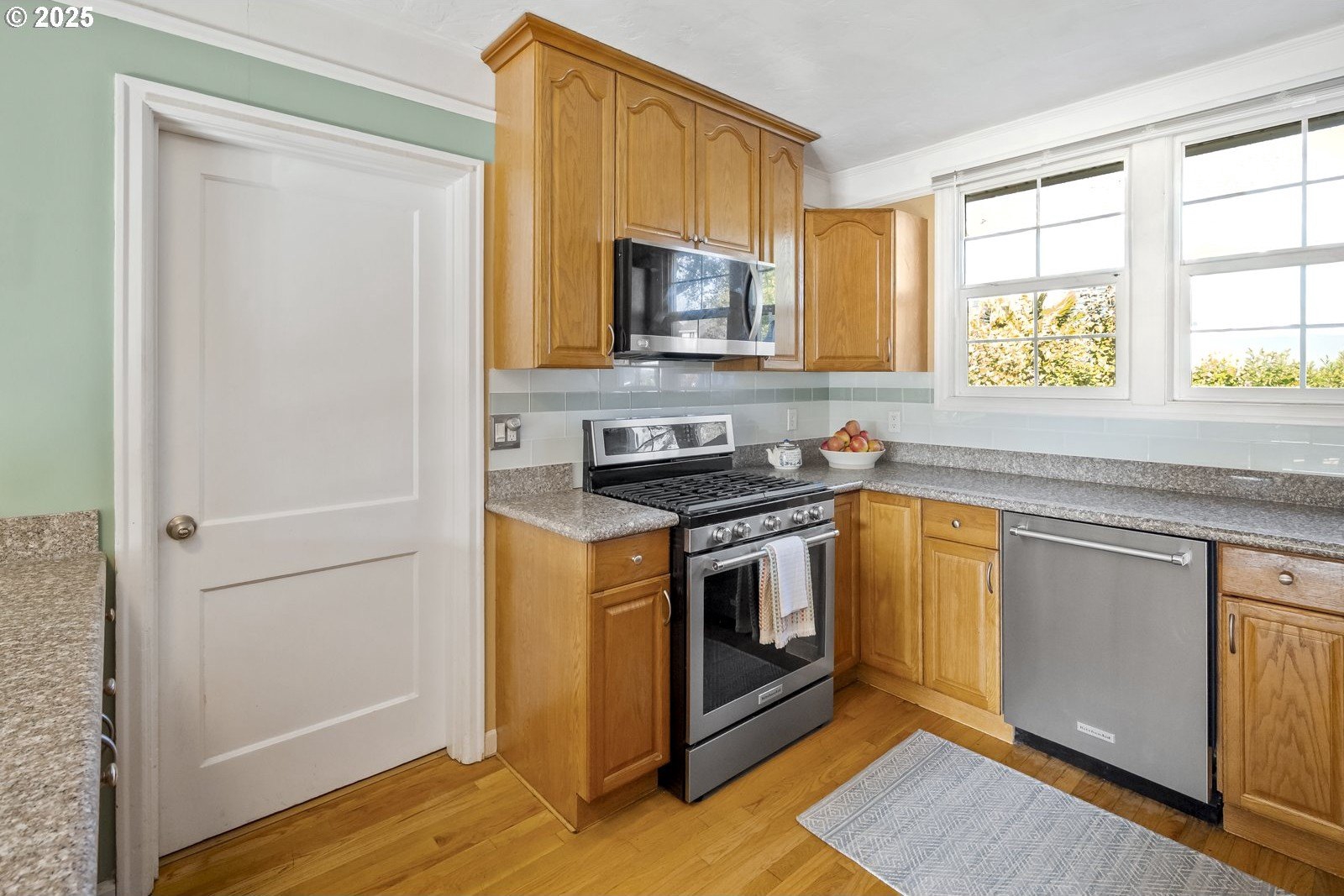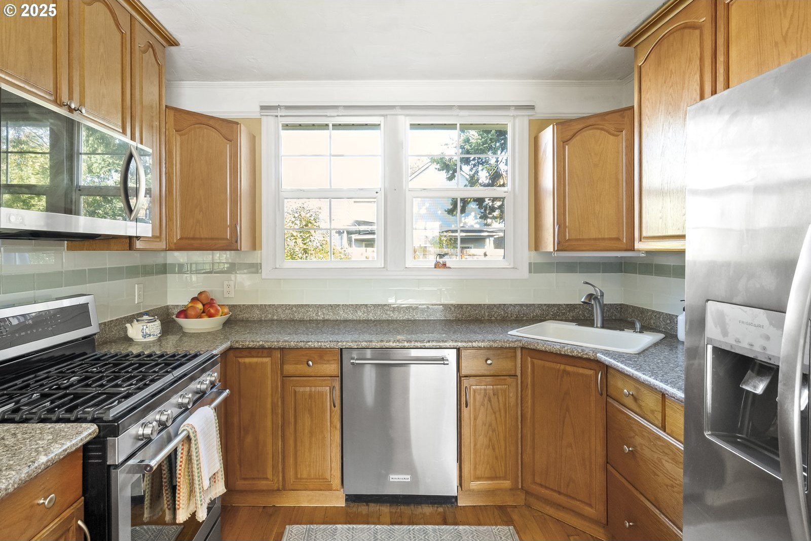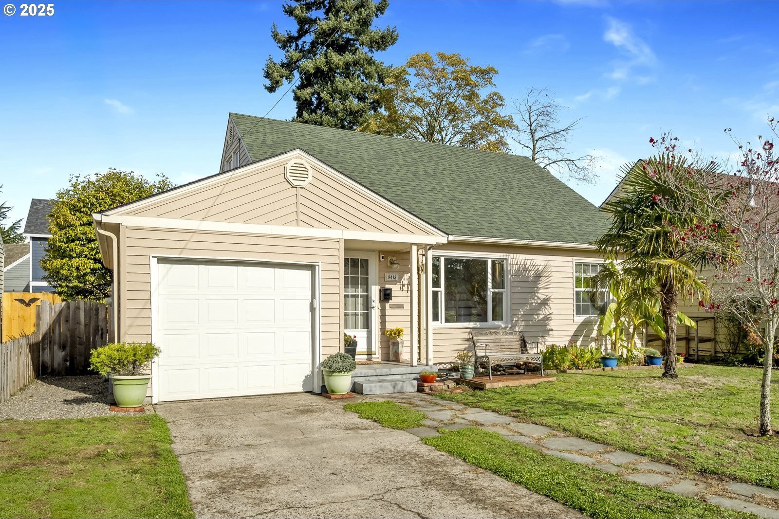 Effortlessly inviting with all the right updates, this Montavilla bungalow packs a surprising punch. This 4 bed, 1.5 bath home pairs thoughtful upgrades with a versatile layout for easy living. Original hardwoods and an open flow greet you at the door, leading to a roomy kitchen with a generous peninsula and eat bar—perfect for meal prep, morning coffee, or afternoon snacks. Newer stainless appliances (including a KitchenAid gas stove!), granite counters, crisp tile backsplash, and ample storage sweeten the deal. The first floor offers true one-level living with two bedrooms—one large enough for a king—plus a recently remodeled full bath with fresh tile, flooring and vanity. Upstairs, two more spacious bedrooms with ceiling fans and newer carpet, plus a convenient half bath offer more flexibility for your home offices, guest rooms, hobby hideouts - you get to choose. (Bonus: enjoy bonus storage in the easily accessible and clean attic crawlspaces). A roomy laundry/mudroom off the kitchen doubles as a pantry and connects to both the garage (with newer electric opener) and the massive, fully fenced backyard. Out back, enjoy outdoor living with a new cedar fence, tool shed, apple and fig trees, and dedicated dog run. Recent updates bring peace of mind: roof (2022), AC (2019), water heater (2020), sewer (2007). Set on a quiet, tree-lined street across from open sports fields buffered by a grassy knoll, this home flawlessly blends city convenience and neighborhood charm. Minutes to Mt. Tabor, Montavilla shops and eats, transit, and both I-205 and I-84. 97 bike score! [Home Energy Score = 1. HES Report at https://rpt.greenbuildingregistry.com/hes/OR10196636]