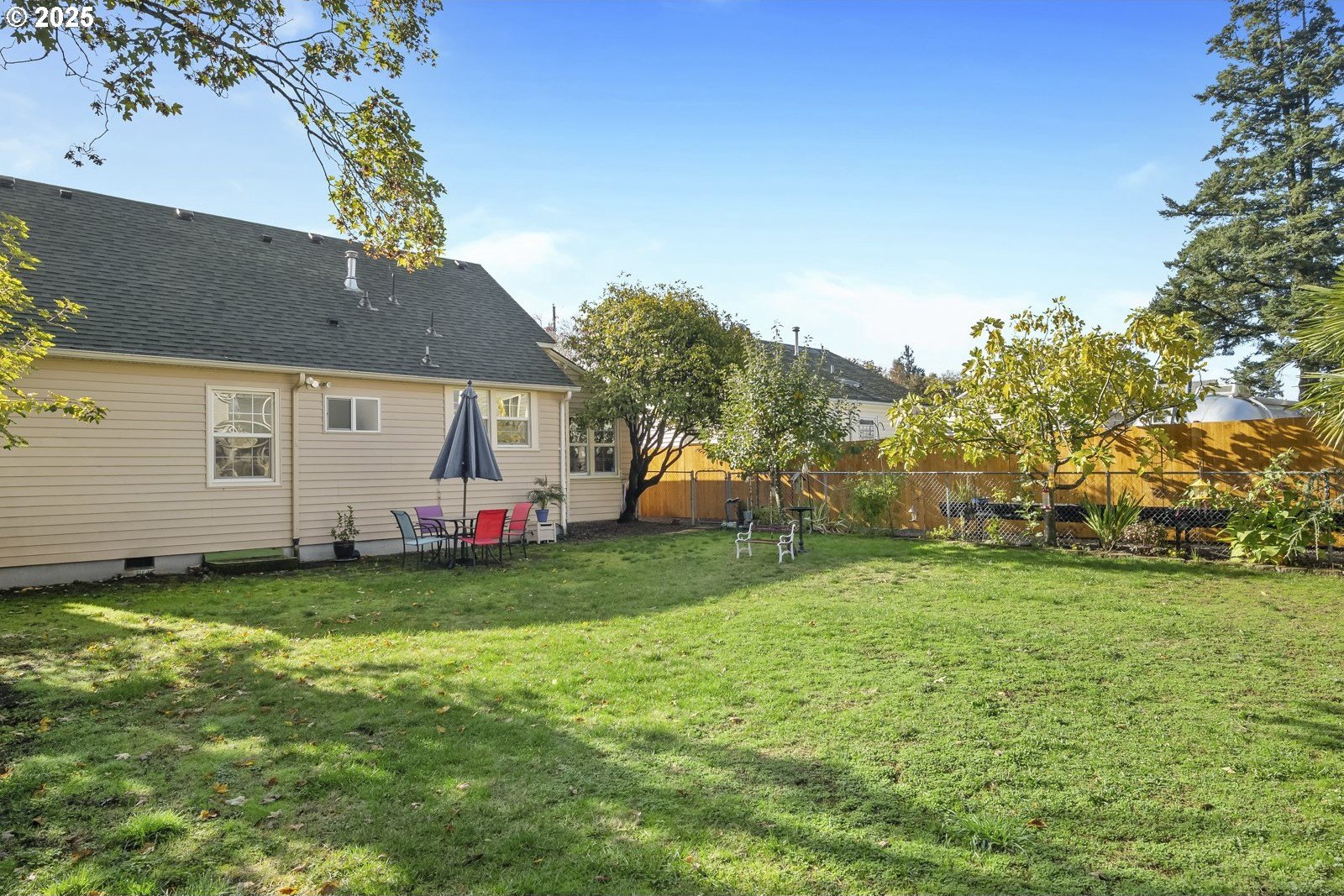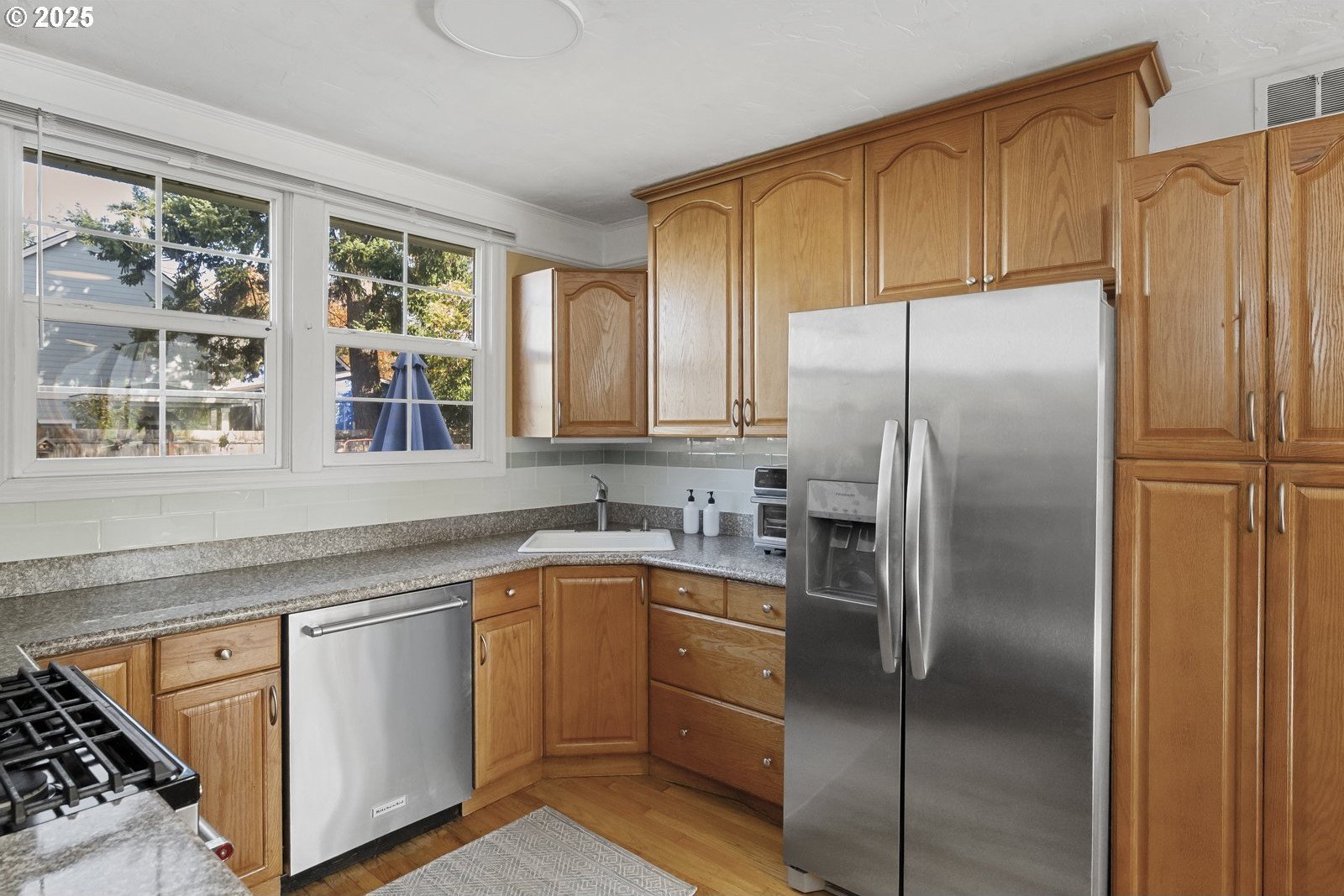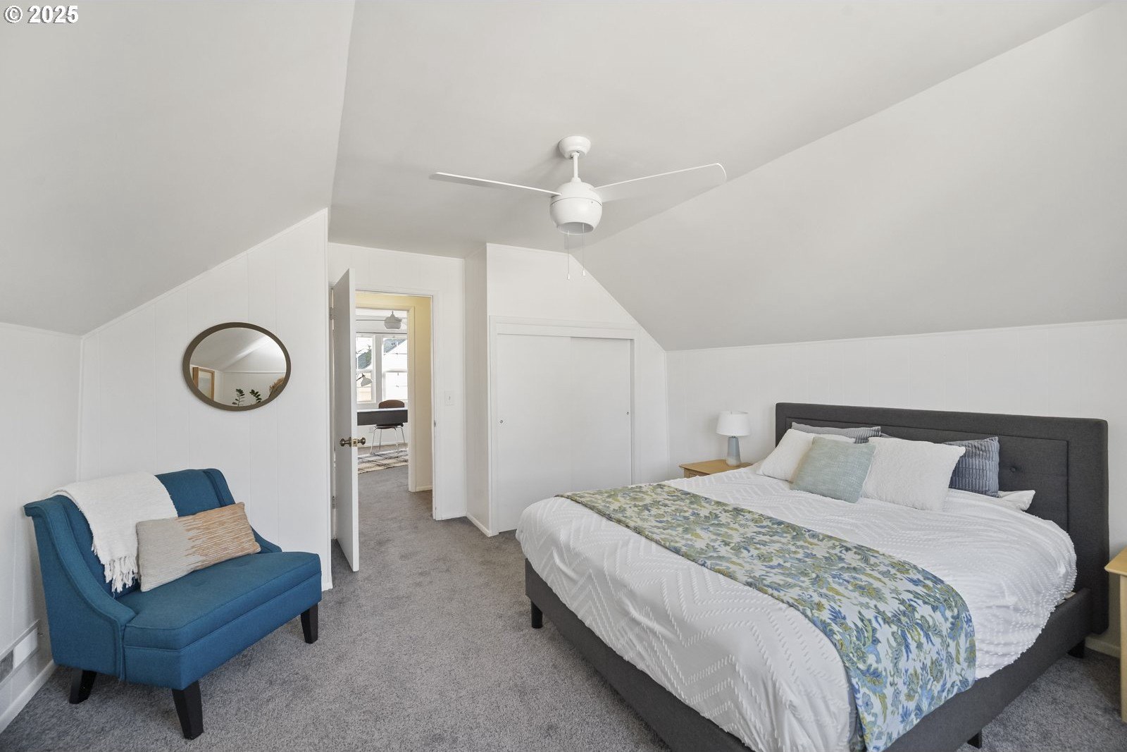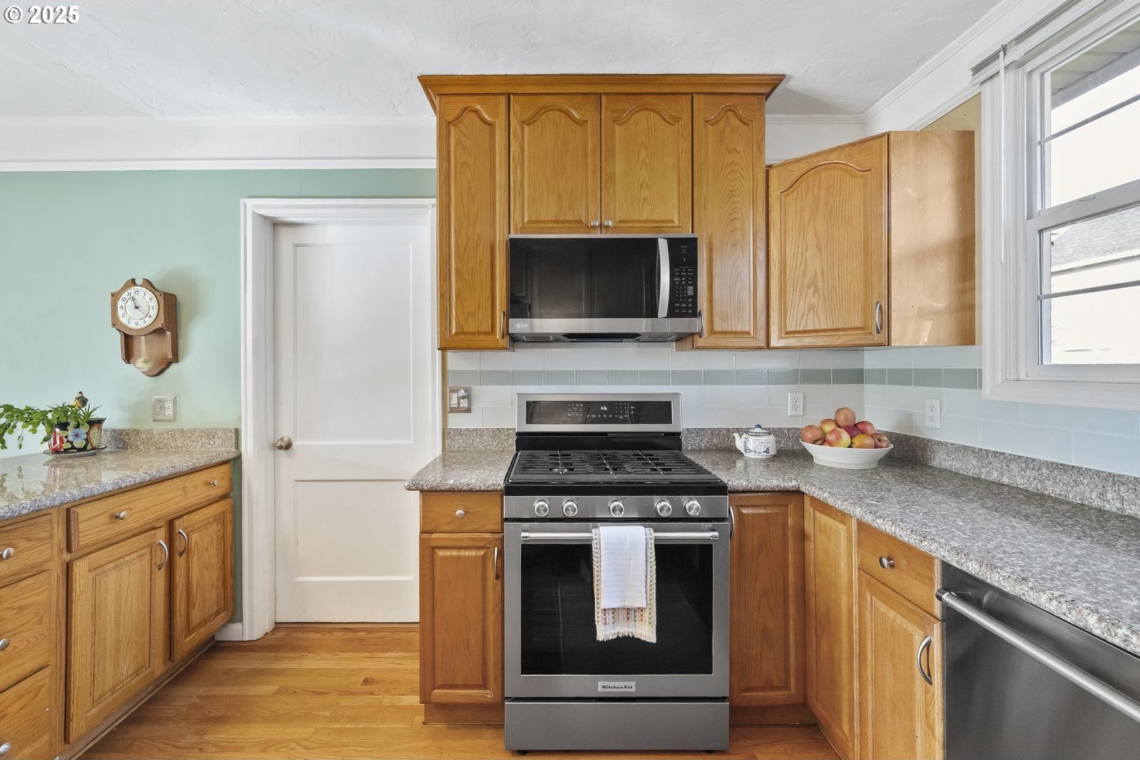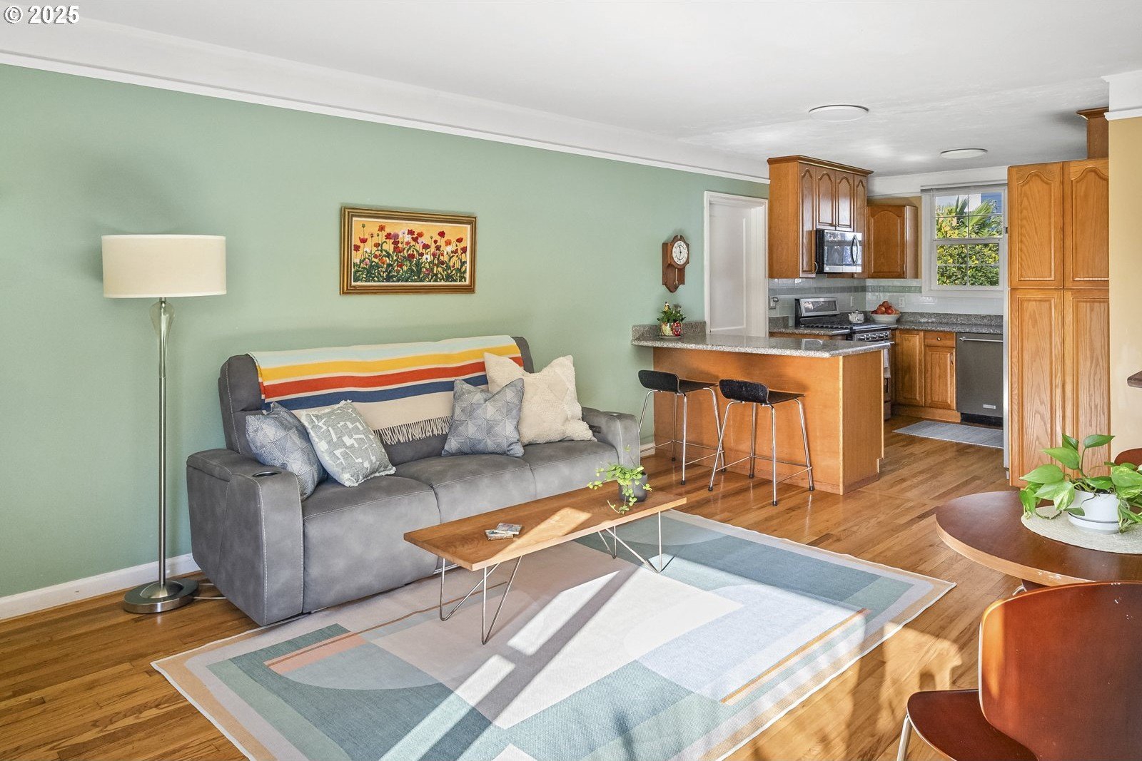 Effortlessly inviting with all the right updates, this Montavilla bungalow packs a surprising punch. This 4 bed, 1.5 bath home pairs thoughtful upgrades with a versatile layout for easy living. Original hardwoods and an open flow greet you at the door, leading to a roomy kitchen with a generous peninsula and eat bar—perfect for meal prep, morning coffee, or afternoon snacks. Newer stainless appliances (including a KitchenAid gas stove!), granite counters, crisp tile backsplash, and ample storage sweeten the deal. The first floor offers true one-level living with two bedrooms—one large enough for a king—plus a recently remodeled full bath with fresh tile, flooring and vanity. Upstairs, two more spacious bedrooms with ceiling fans and newer carpet, plus a convenient half bath offer more flexibility for your home offices, guest rooms, hobby hideouts - you get to choose. (Bonus: enjoy bonus storage in the easily accessible and clean attic crawlspaces). A roomy laundry/mudroom off the kitchen doubles as a pantry and connects to both the garage (with newer electric opener) and the massive, fully fenced backyard. Out back, enjoy outdoor living with a new cedar fence, tool shed, apple and fig trees, and dedicated dog run. Recent updates bring peace of mind: roof (2022), AC (2019), water heater (2020), sewer (2007). Set on a quiet, tree-lined street across from open sports fields buffered by a grassy knoll, this home flawlessly blends city convenience and neighborhood charm. Minutes to Mt. Tabor, Montavilla shops and eats, transit, and both I-205 and I-84. 97 bike score! [Home Energy Score = 1. HES Report at https://rpt.greenbuildingregistry.com/hes/OR10196636]