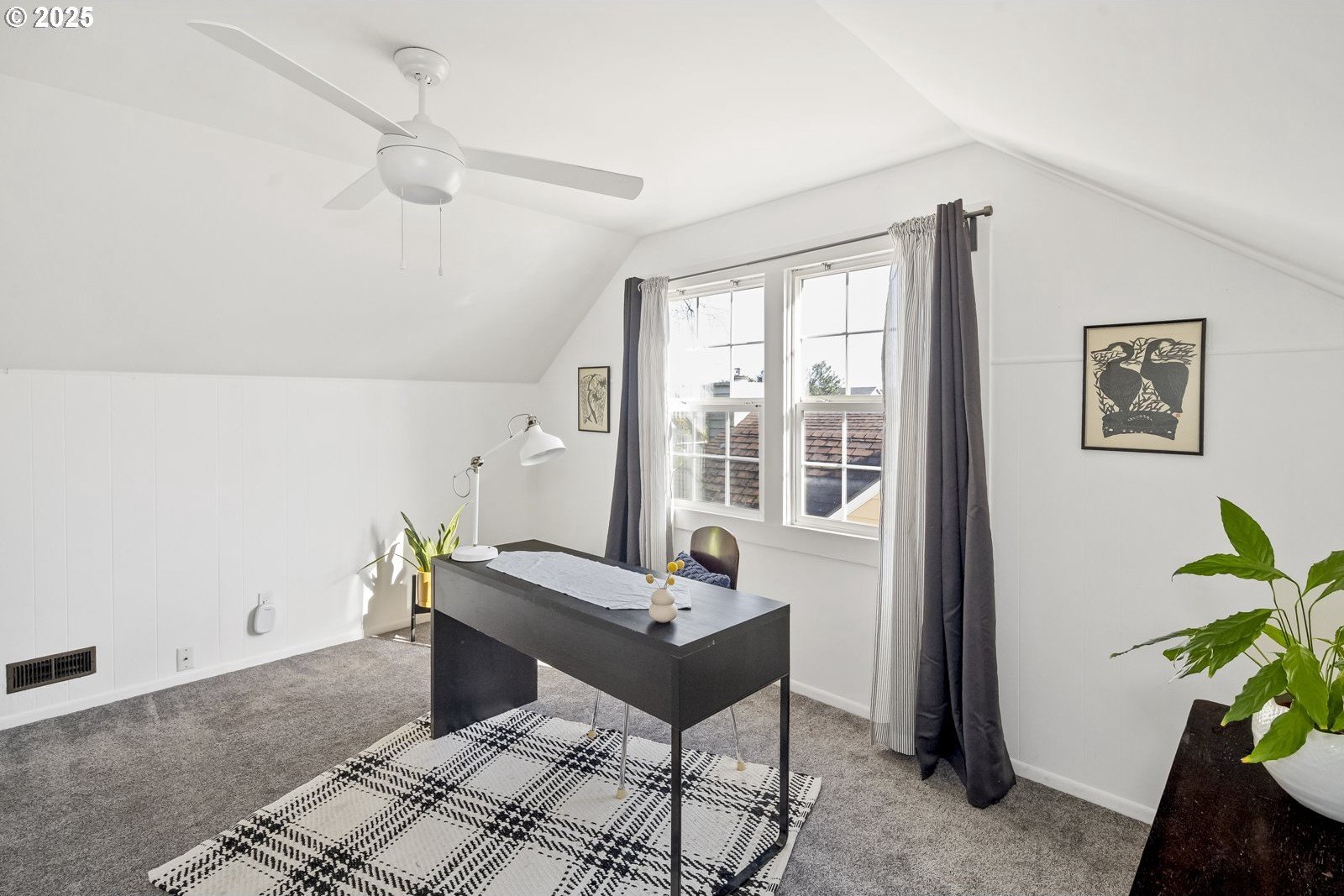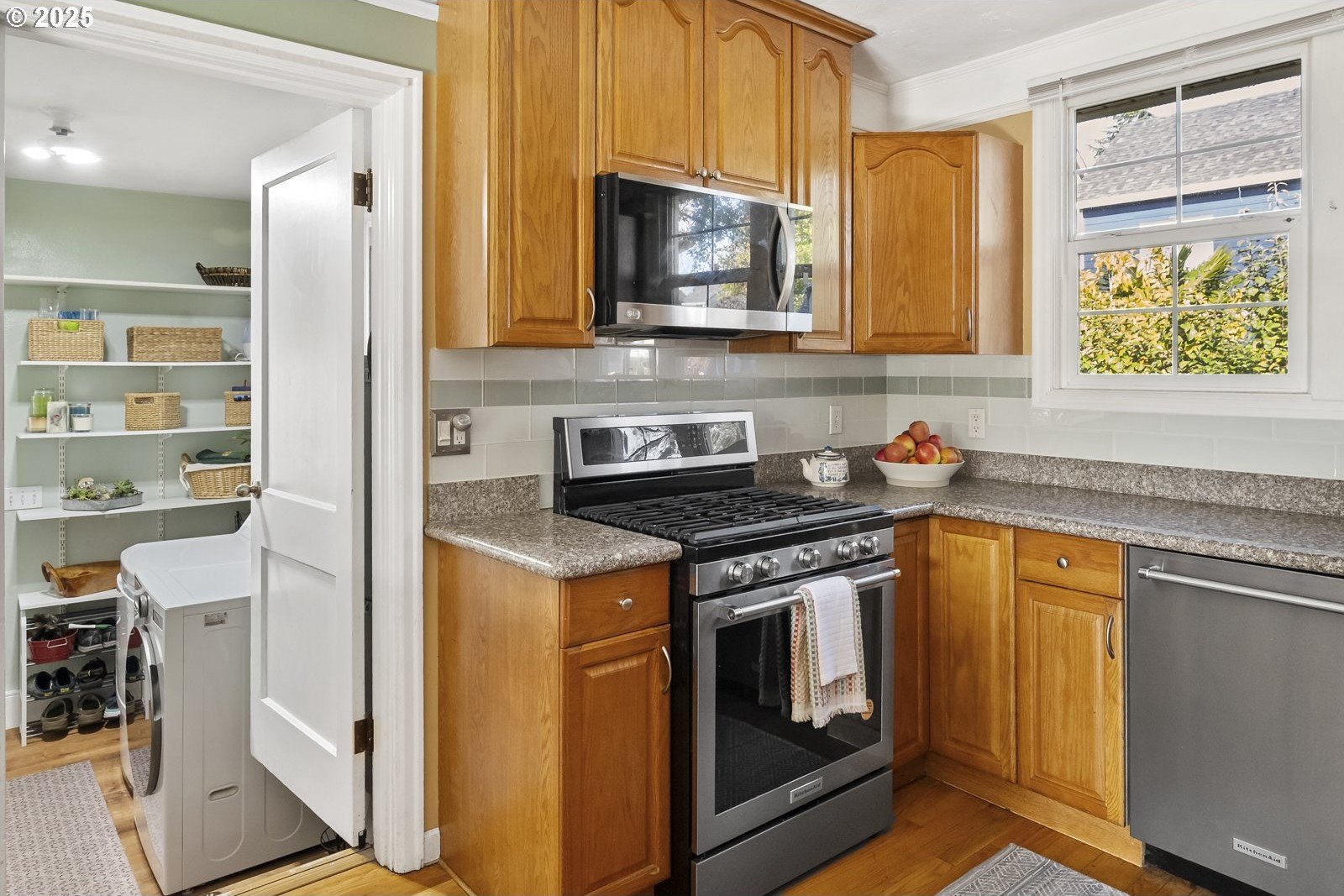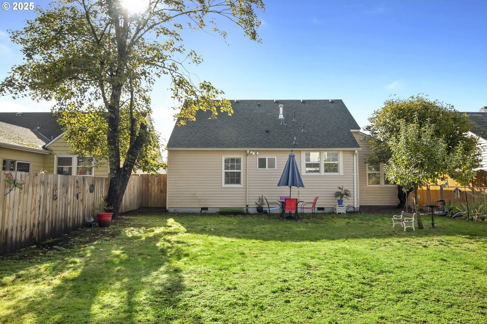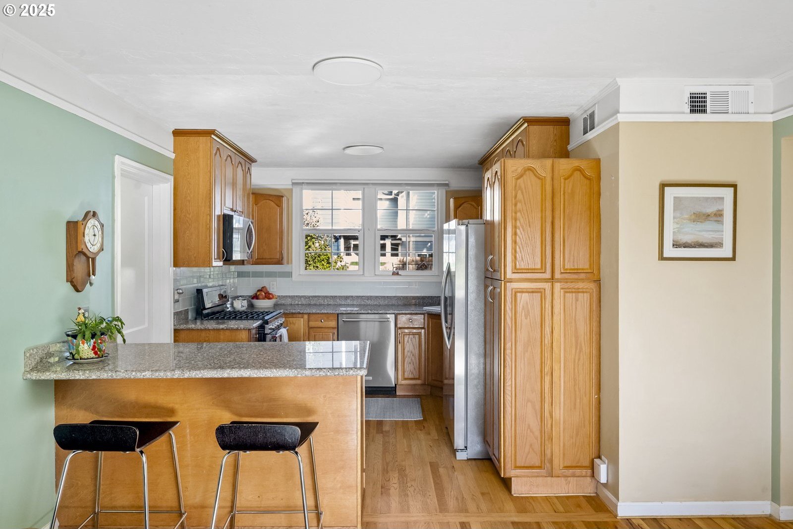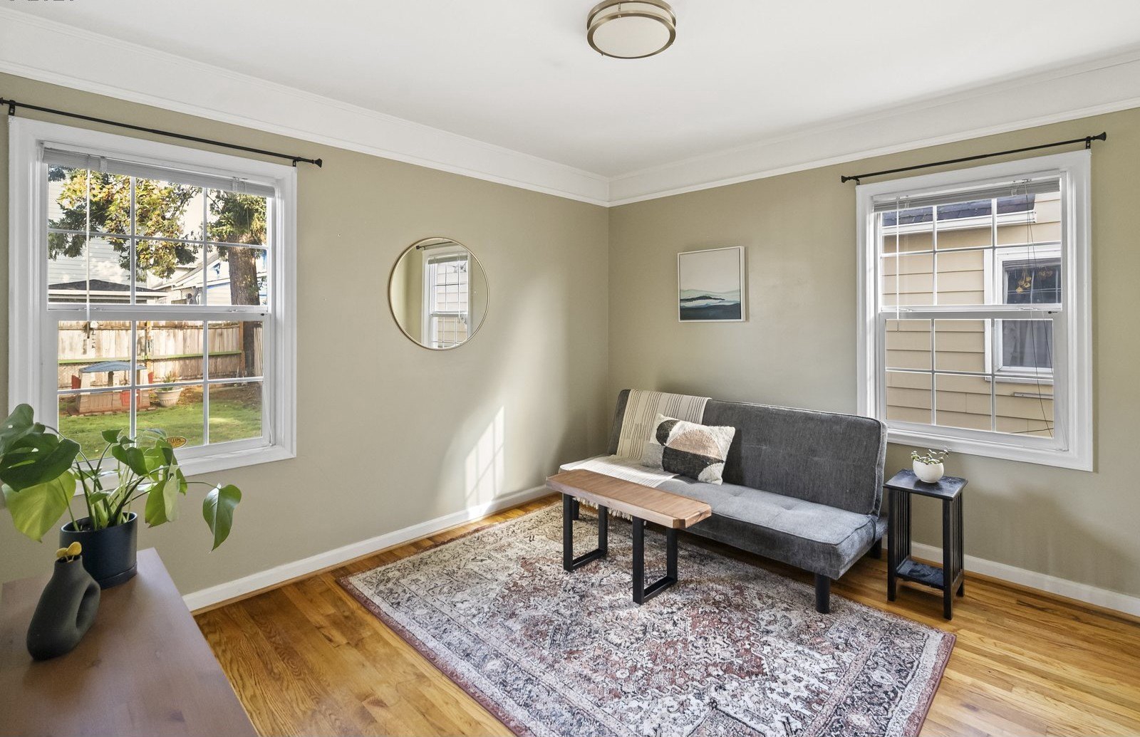 Effortlessly inviting with all the right updates, this Montavilla bungalow packs a surprising punch. This 4 bed, 1.5 bath home pairs thoughtful upgrades with a versatile layout for easy living. Original hardwoods and an open flow greet you at the door, leading to a roomy kitchen with a generous peninsula and eat bar—perfect for meal prep, morning coffee, or afternoon snacks. Newer stainless appliances (including a KitchenAid gas stove!), granite counters, crisp tile backsplash, and ample storage sweeten the deal. The first floor offers true one-level living with two bedrooms—one large enough for a king—plus a recently remodeled full bath with fresh tile, flooring and vanity. Upstairs, two more spacious bedrooms with ceiling fans and newer carpet, plus a convenient half bath offer more flexibility for your home offices, guest rooms, hobby hideouts - you get to choose. (Bonus: enjoy bonus storage in the easily accessible and clean attic crawlspaces). A roomy laundry/mudroom off the kitchen doubles as a pantry and connects to both the garage (with newer electric opener) and the massive, fully fenced backyard. Out back, enjoy outdoor living with a new cedar fence, tool shed, apple and fig trees, and dedicated dog run. Recent updates bring peace of mind: roof (2022), AC (2019), water heater (2020), sewer (2007). Set on a quiet, tree-lined street across from open sports fields buffered by a grassy knoll, this home flawlessly blends city convenience and neighborhood charm. Minutes to Mt. Tabor, Montavilla shops and eats, transit, and both I-205 and I-84. 97 bike score! [Home Energy Score = 1. HES Report at https://rpt.greenbuildingregistry.com/hes/OR10196636]