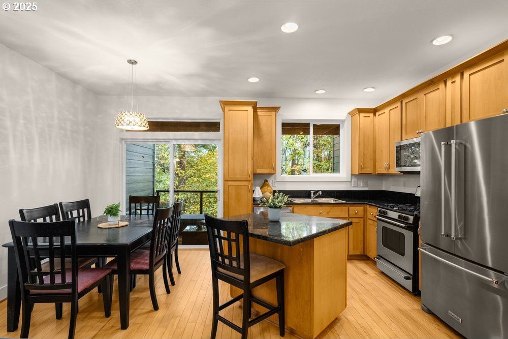Light-filled end-unit townhome with stunning territorial views and a lovingly maintained interior. The main level features hardwood floors, an inviting living area, and a deck off the dining room, perfect for morning coffee or summer dinners al fresco. Enjoy fresh paint, new carpet, and a large daylight basement offering flexible space for a home office, gym, or guest suite. The primary bedroom includes its own private deck, while the lower-level patio adds another outdoor retreat. The HOA is installing a brand-new Malarkey roof, ensuring years of worry-free living. With thoughtful updates, abundant natural light, and a peaceful setting close to parks, shopping, and commuter routes, this home stands out for its comfort, quality, and care.