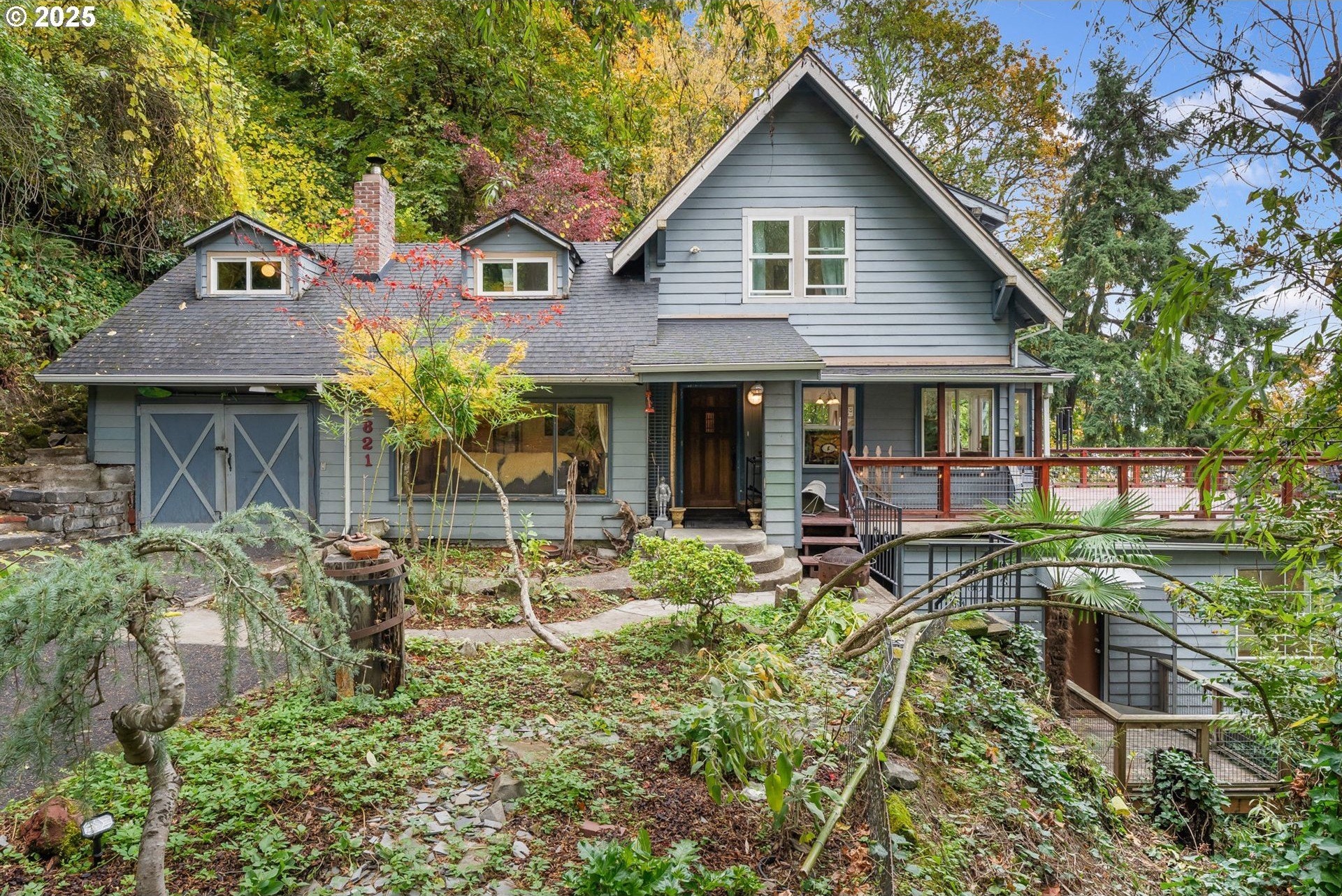 OPEN SUN 11/2 1-3PM! JUST LISTED! Unique 1910 farmhouse in a picturesque setting with a huge wrap-around deck to enjoy panoramic Willamette River and mountain views. Amazing location with Forest Park as your backyard, yet easily accessible to St Johns and downtown. This cozy retreat is truly one of a kind. Nicknamed "Happy Hollow", it has the period details and charm of 1910 with many of today's updates for easy living. The home features fir floors, intricate tile work, LVT flooring, and a chef's kitchen with a Viking 6 burner gas range and gorgeous butcher block counters. Almost the entire interior has been freshly painted. With a total of 3 bedrooms (one is non-conforming), a den, a couple bonus rooms and 2 full baths, this multi-level versatile floorplan works for many living configurations. It is ideal to live in and/or host multiple tenants, including the potential for a separate living area on the lower area that is plumbed for a 3rd bathroom and kitchenette and can be its own apartment for extra rental income. This home is light and bright and designed to enjoy the views. Not only do you have river views and can watch the tugboats go by, you also have glimpses of Mt Hood, Mt St Helens and Mt Adams. The expansive deck is nearly 1000sf, perfect for relaxing or entertaining. There is a pizza oven out back and a 1 car garage that could be an ideal shop as well. This home has plenty of storage options and many nooks and crannies on each level for all of your hobbies. Check out this amazing tree house today! Sold AS-IS, Seller to make no repairs.