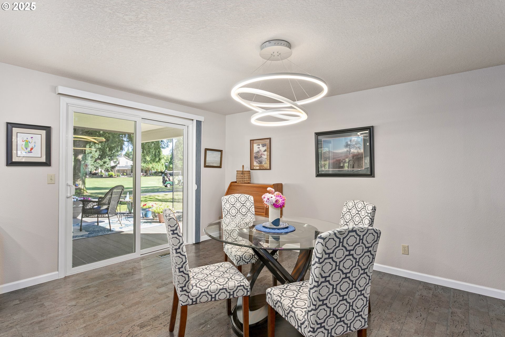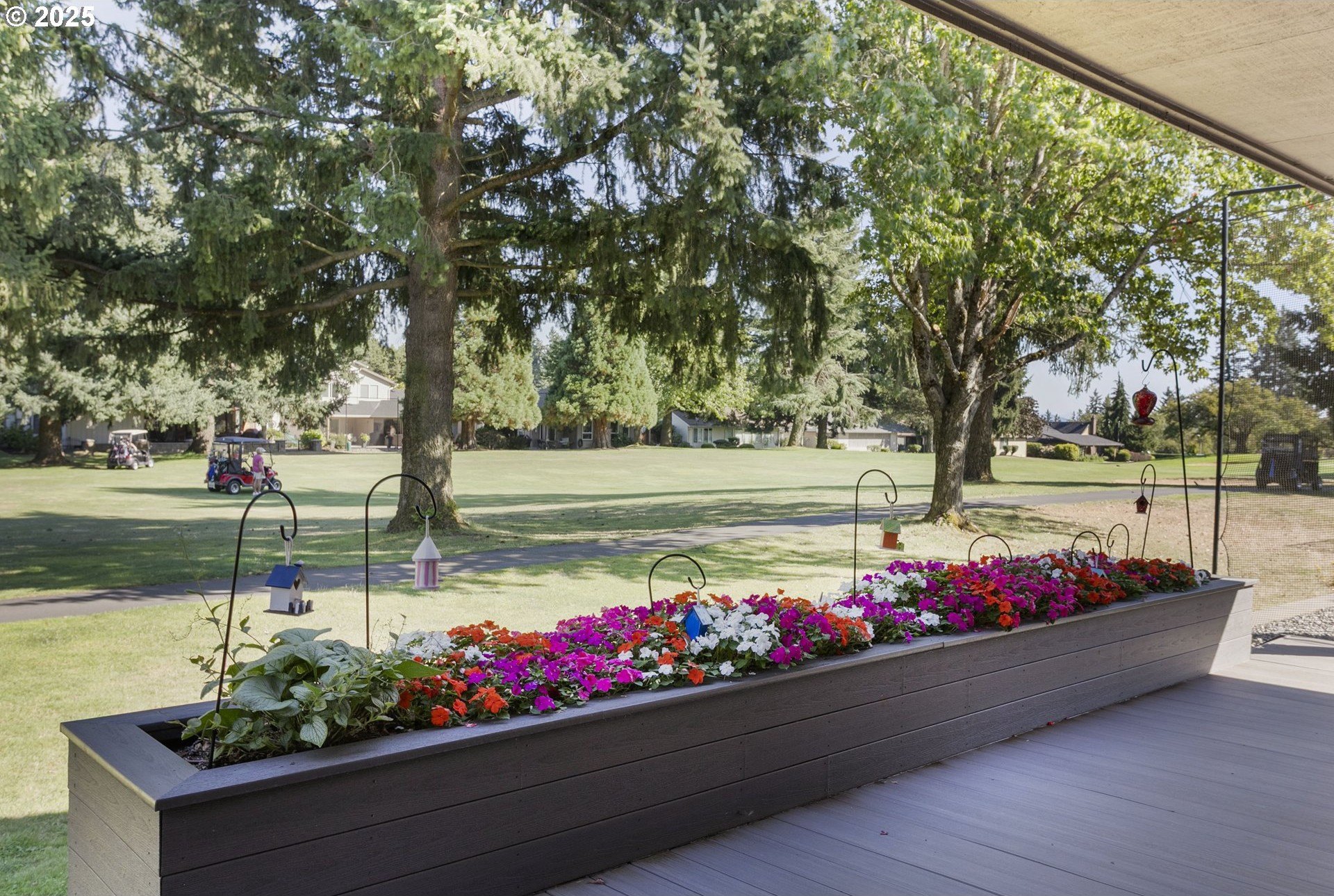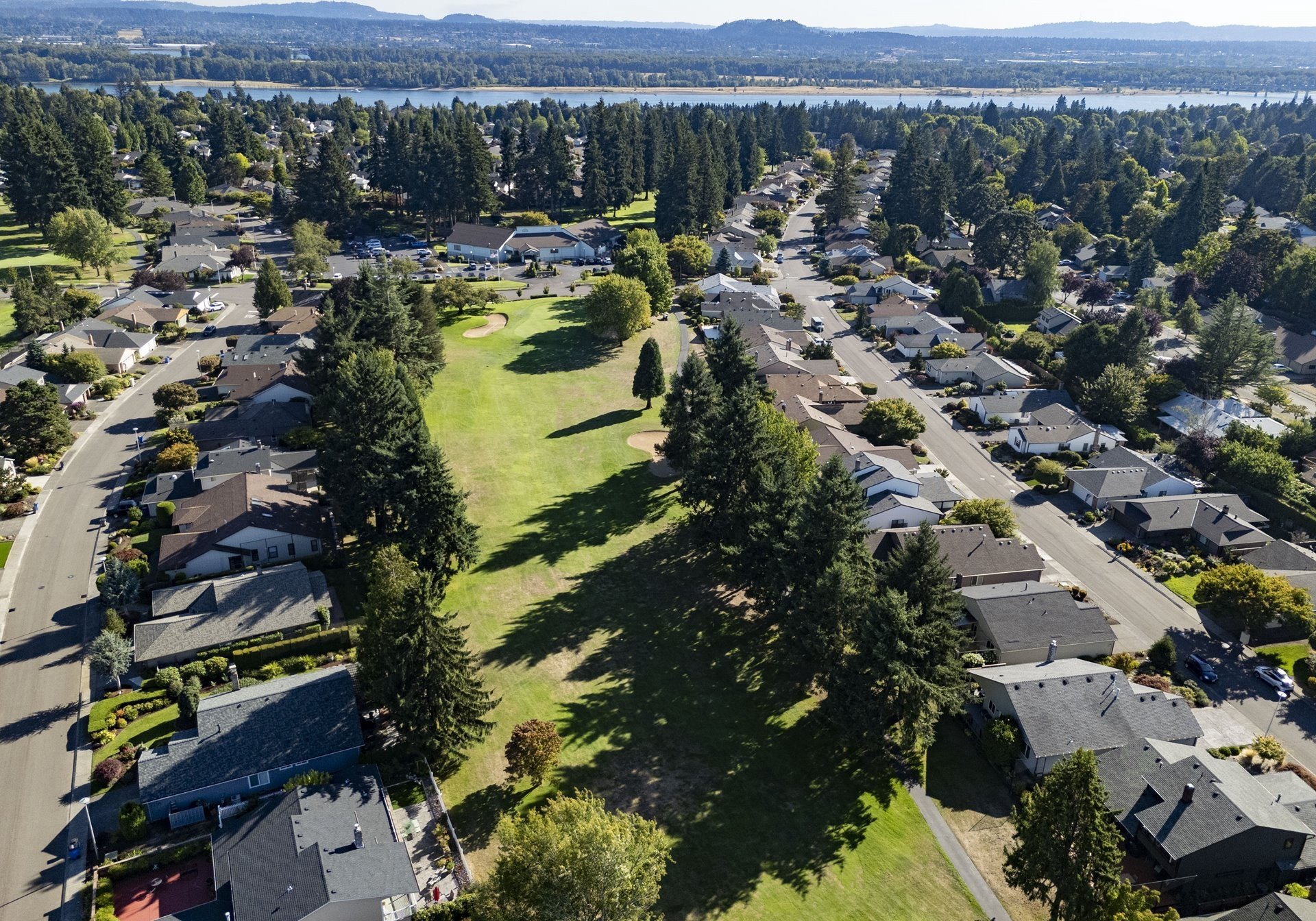 It's challenging to find a smaller house on the golf course with spectacular views and the clubhouse nearby. This popular Salishan model features a wall removal from the original plan, creating an open concept and an amazing, large designer island kitchen with a picture window overlooking the fairway. The kitchen features large drawers, roll-out shelves, a cabinet pantry, and an appliance shelf, as well as a Composite sink, Granite Counters, and a designer Hood, all of which are designed with many modern conveniences in mind. Relax in the front outdoor seating area to enjoy your favorite beverage and take in the sunsets. Imagine your morning cup of coffee on your covered patio overlooking the fairway. Enjoy those gloomy days or hot days under your large covered patio all year long! Vaulted ceilings as you enter this floor plan, with tall windows bringing abundant lighting. The wall removal provides a spacious, open setting. Enjoy the updates, including replaced windows, a new roof installed two years ago, composite decking, cork kitchen flooring, and new kitchen and bath countertops. A well-maintained and low-maintenance home is a must-see for your tours here in the village. A vibrant 55+ planned community featuring a clubhouse, a variety of scheduled activities, exercise facilities, a sauna, a swimming pool, billiards, ping-pong, an arts and crafts studio, a ballroom, a library, meeting and event rooms, and much more!