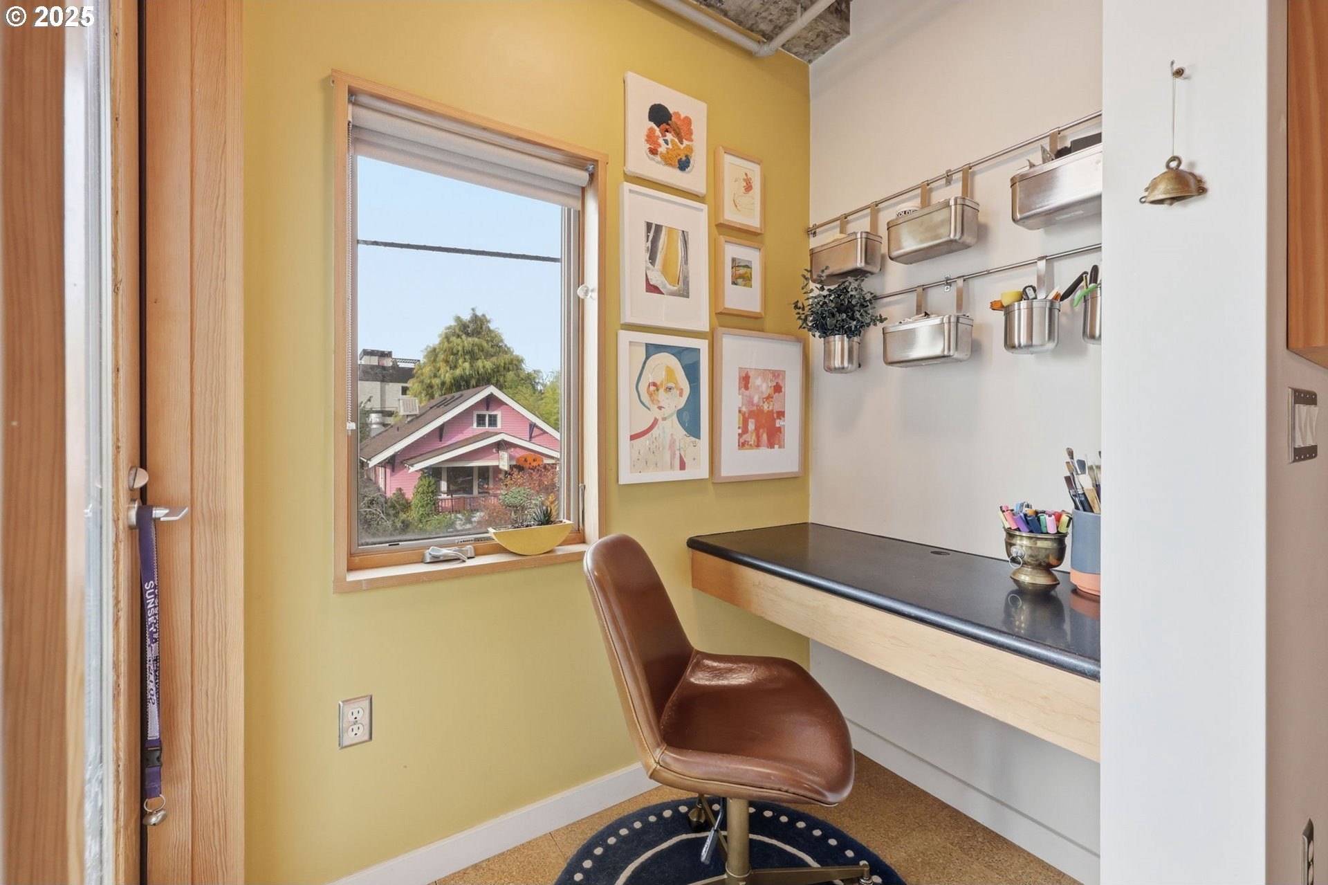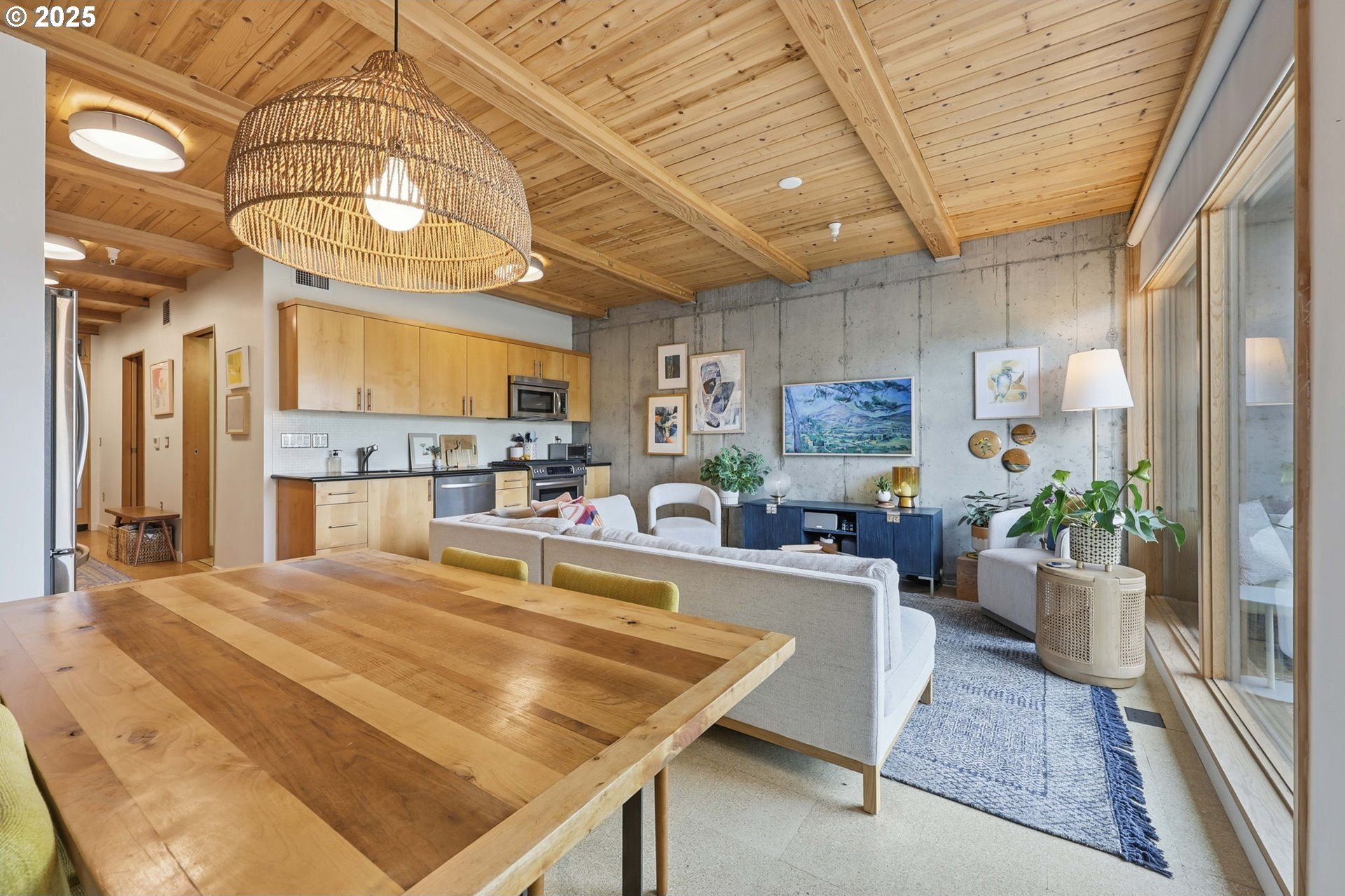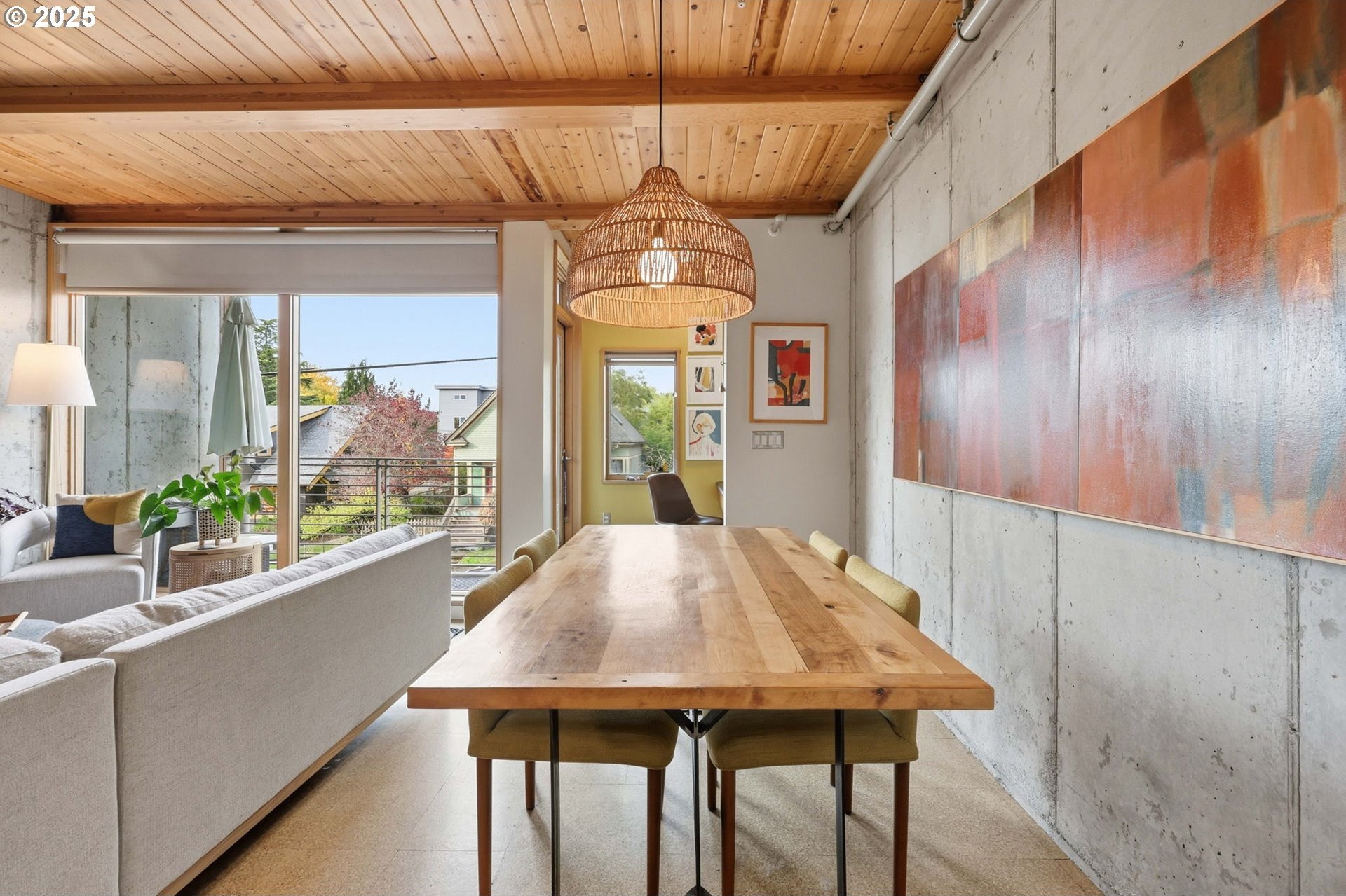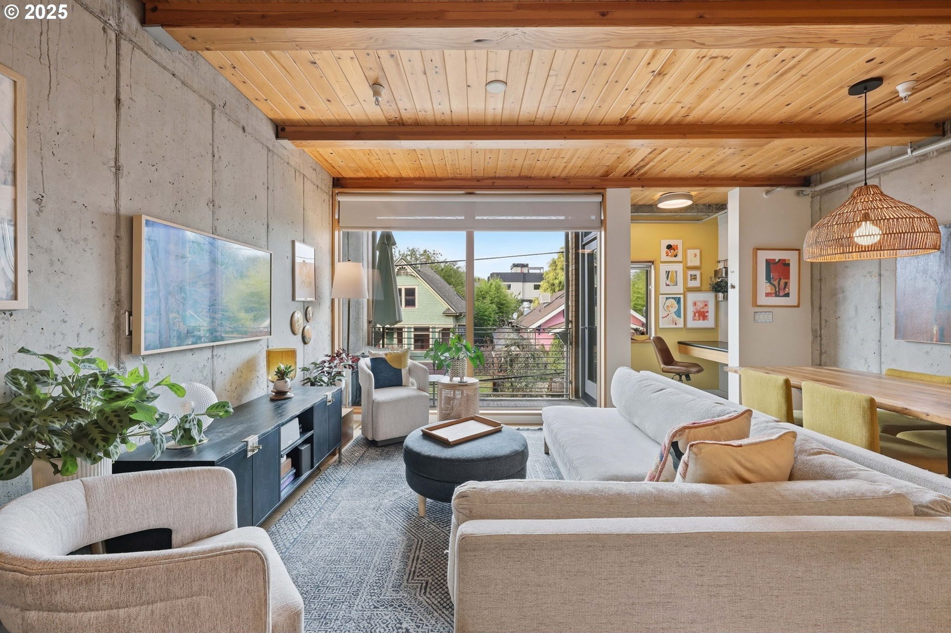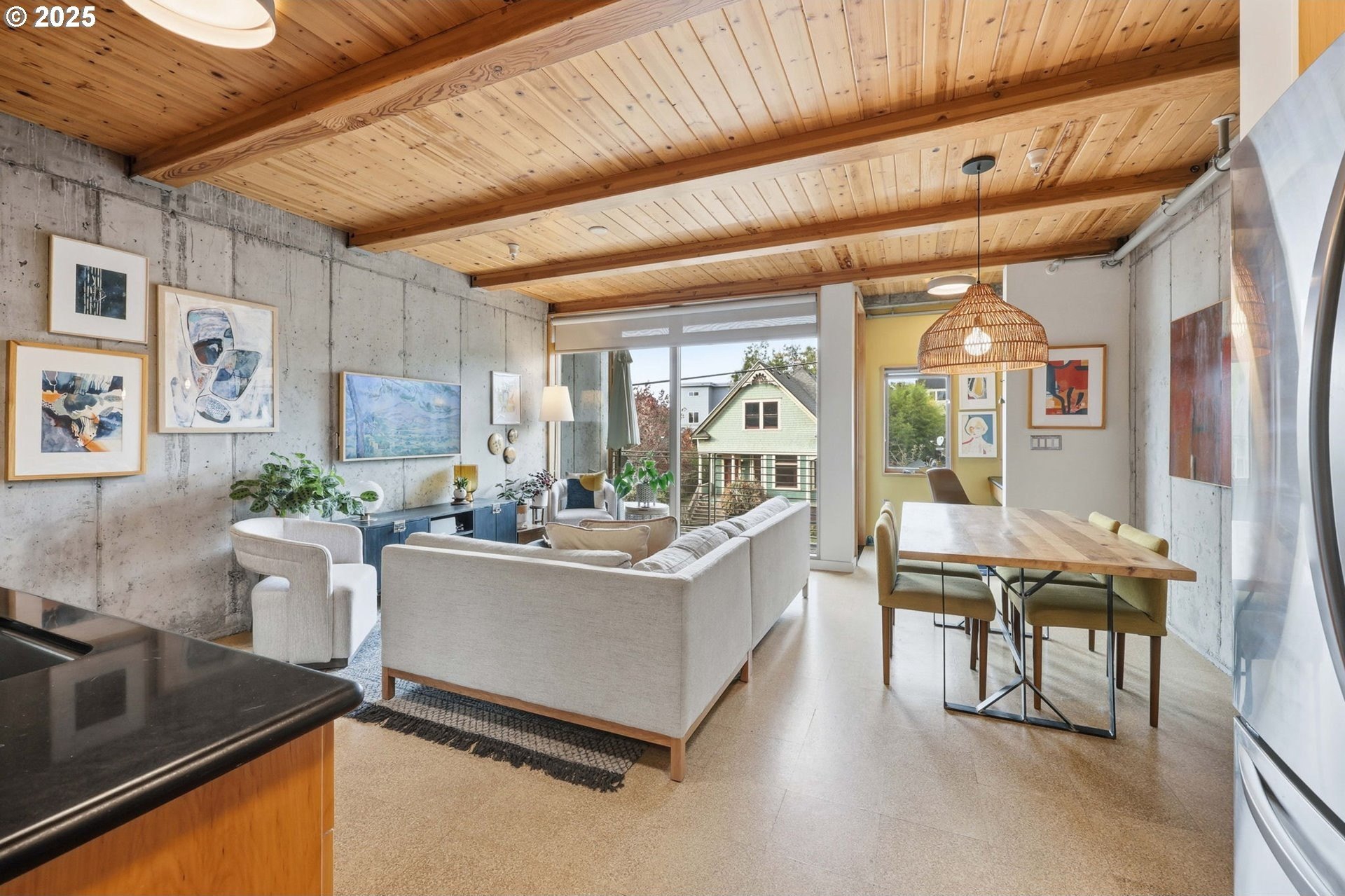 Don’t miss this rare opportunity to own one of only 32 Mississippi Avenue Loft Condos—ideally situated at the heart of one of Portland’s most vibrant neighborhoods. Just steps from renowned local favorites like Fifty Fifty, Prost!, Por Qué No, and Mississippi Studios/Bar Bar, this home places you within easy reach of food carts, microbreweries, coffee and ice cream shops. Constructed with heavy timber, concrete, and steel, the building offers exceptional privacy and sound insulation. Inside, you’ll find a modern, light-filled space featuring knotty pine ceilings, concrete walls, cork floors, an open floor plan, stainless steel appliances, gas cooking, and built-ins throughout. The bathroom showcases tile floors and a tiled shower surround. Additional highlights include an in-unit laundry area, a foyer with custom cabinetry, a built-in office nook, and a private balcony overlooking bustling Mississippi Avenue. This LEED Gold–certified building also offers air conditioning, a serene bamboo-filled courtyard, deeded secure parking, and optional storage available for purchase. Conveniently located near parks and freeways, this condo blends sustainable modern living with the best of Portland’s urban lifestyle. The HOA covers all but electricity! View the video walkthrough at:https://tinyurl.com/zmwb5jcn