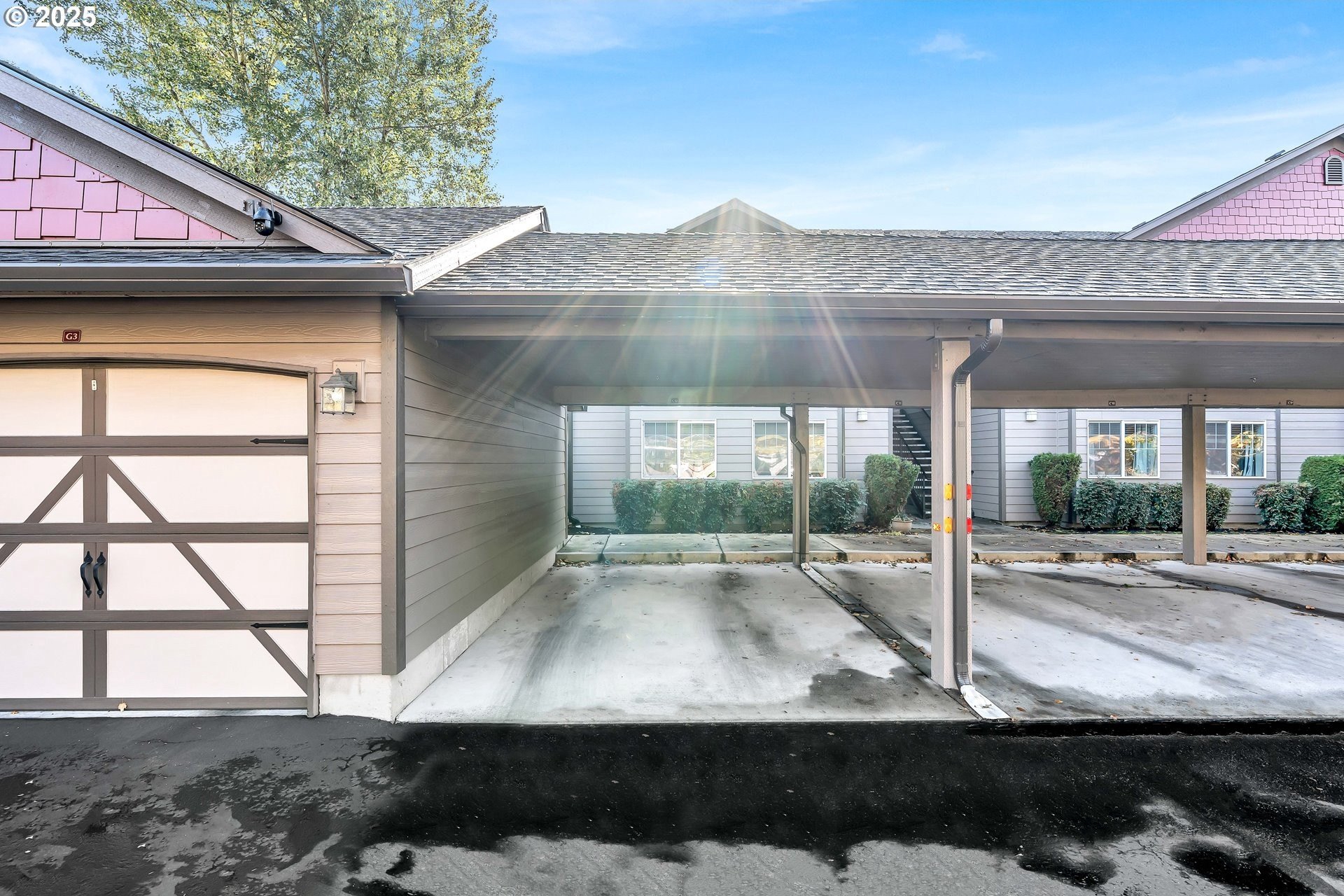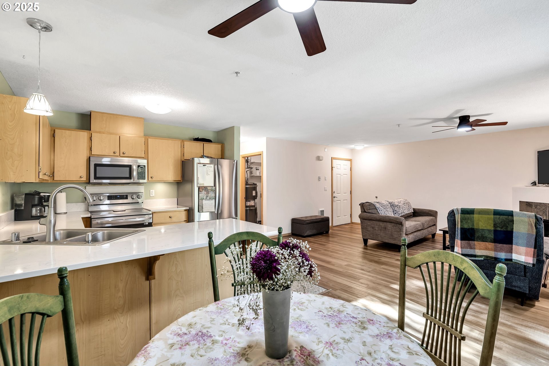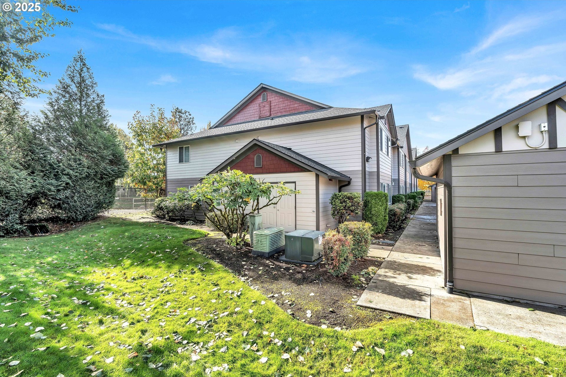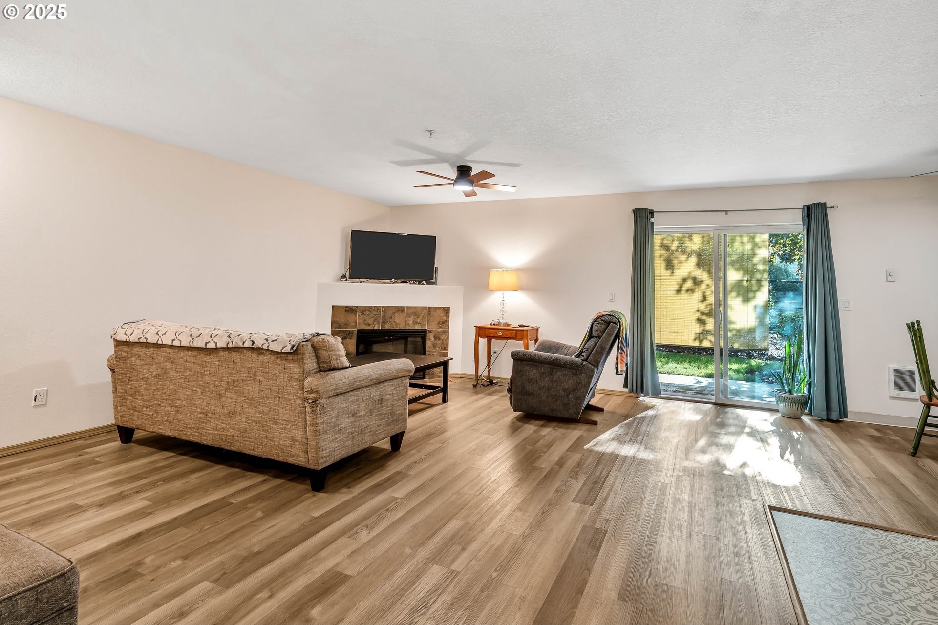 Beautifully maintained condo in excellent condition! Enjoy laminate flooring throughout and a spacious open layout connecting the kitchen, dining, and living areas. Sliding doors from the dining room open to a lovely backyard and large covered patio—perfect for relaxing or entertaining. Features include ceiling fans, a cozy faux fireplace with heat, stacked washer/dryer, refrigerator, stove, and a huge utility room. Covered parking is right outside your door, with plenty of guest parking nearby. Convenient location close to shopping, scenic trails, and Legacy Hospital (just ¼ mile away). HOA covers water, garbage, sewer, and landscaping, with strong reserves and well-kept grounds.