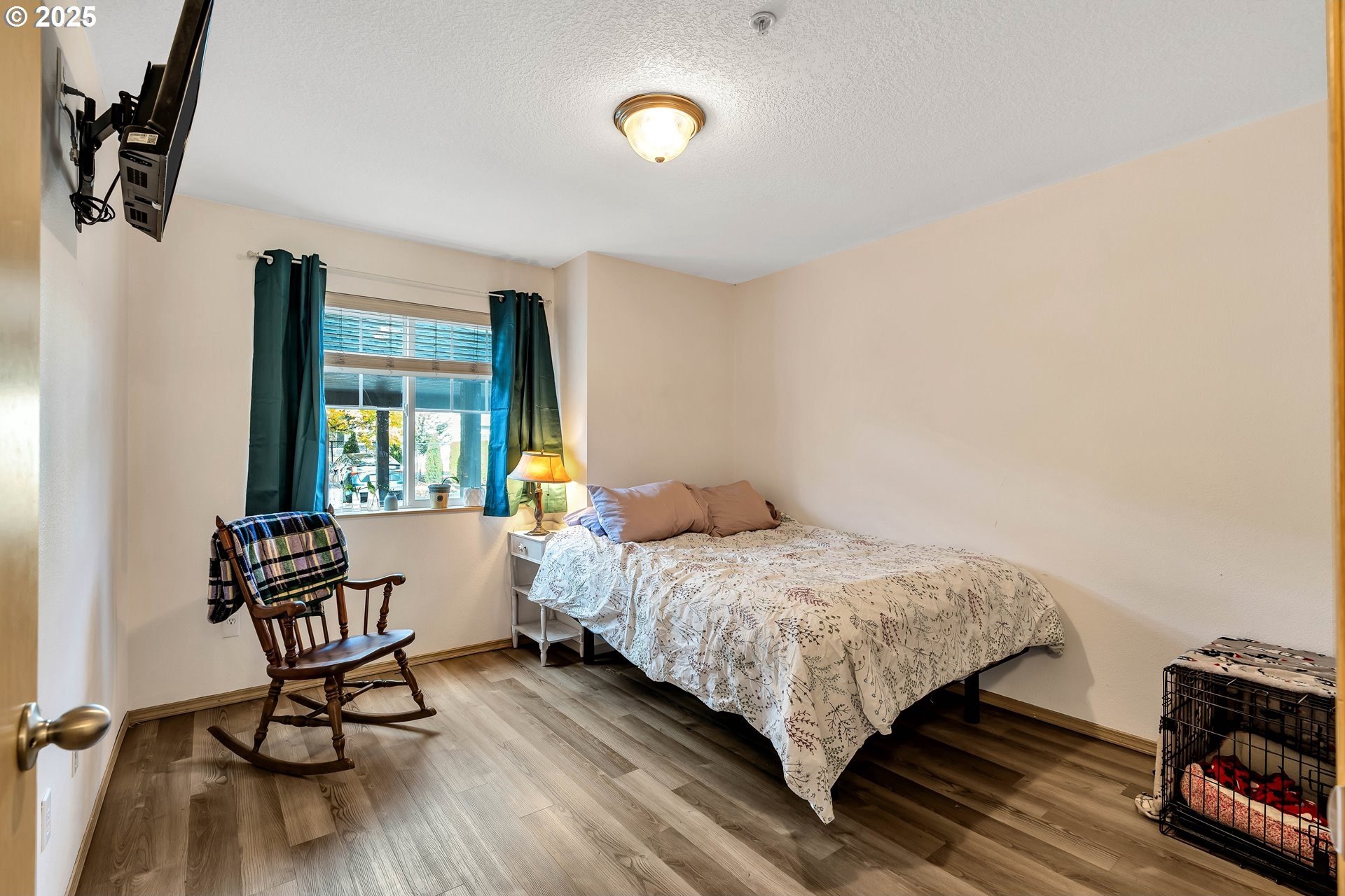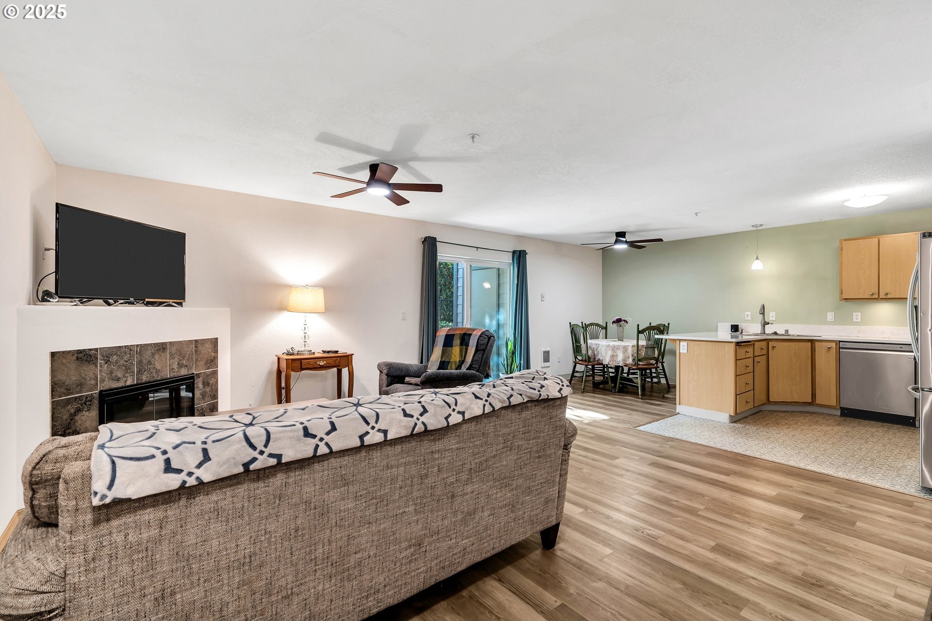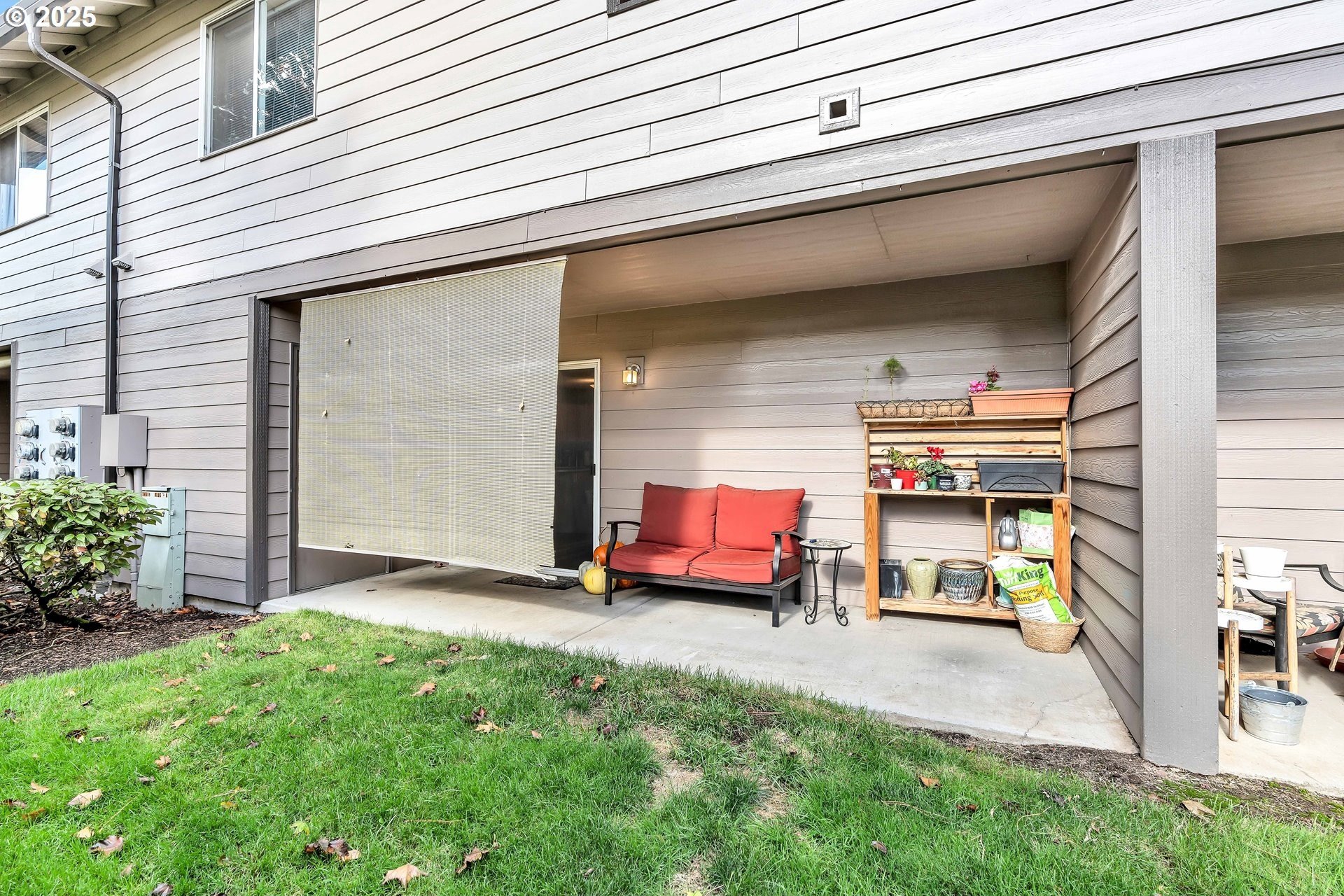 Beautifully maintained condo in excellent condition! Enjoy laminate flooring throughout and a spacious open layout connecting the kitchen, dining, and living areas. Sliding doors from the dining room open to a lovely backyard and large covered patio—perfect for relaxing or entertaining. Features include ceiling fans, a cozy faux fireplace with heat, stacked washer/dryer, refrigerator, stove, and a huge utility room. Covered parking is right outside your door, with plenty of guest parking nearby. Convenient location close to shopping, scenic trails, and Legacy Hospital (just ¼ mile away). HOA covers water, garbage, sewer, and landscaping, with strong reserves and well-kept grounds.