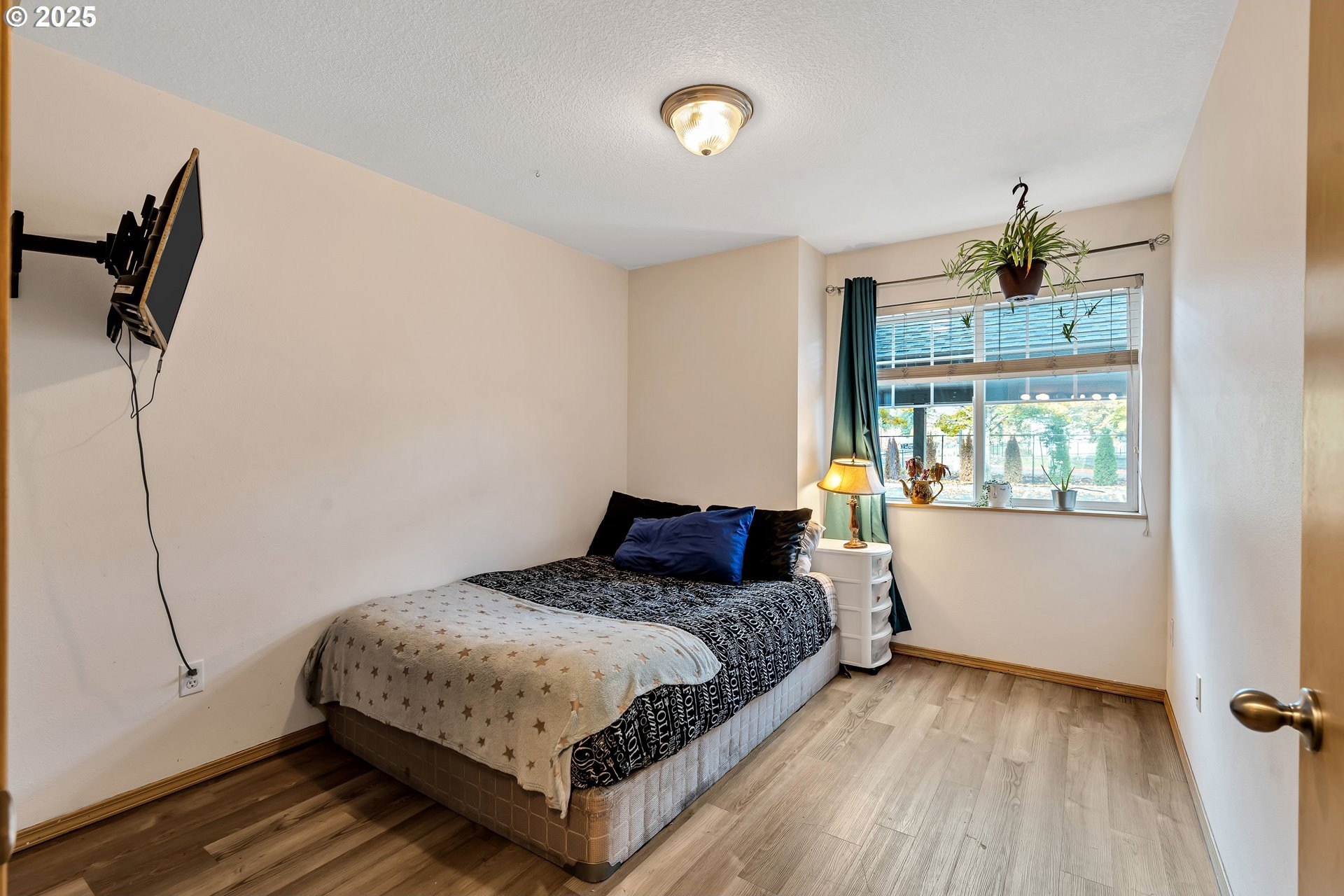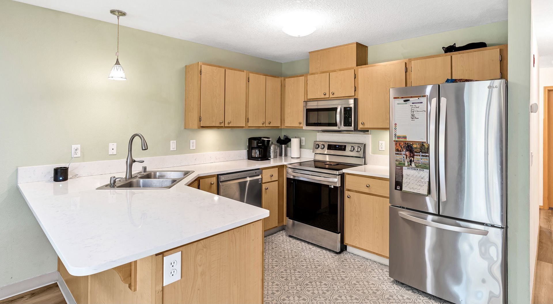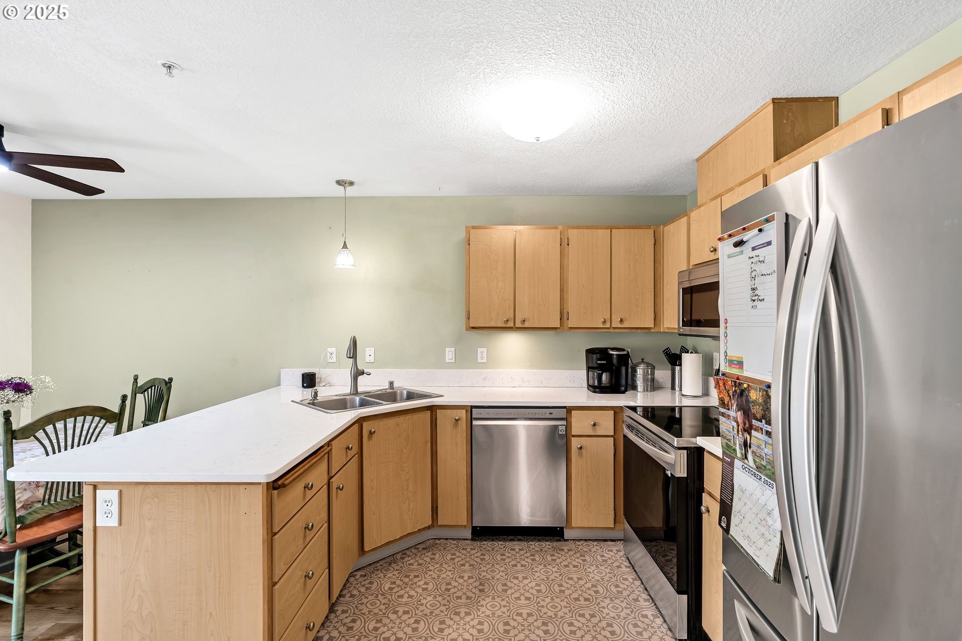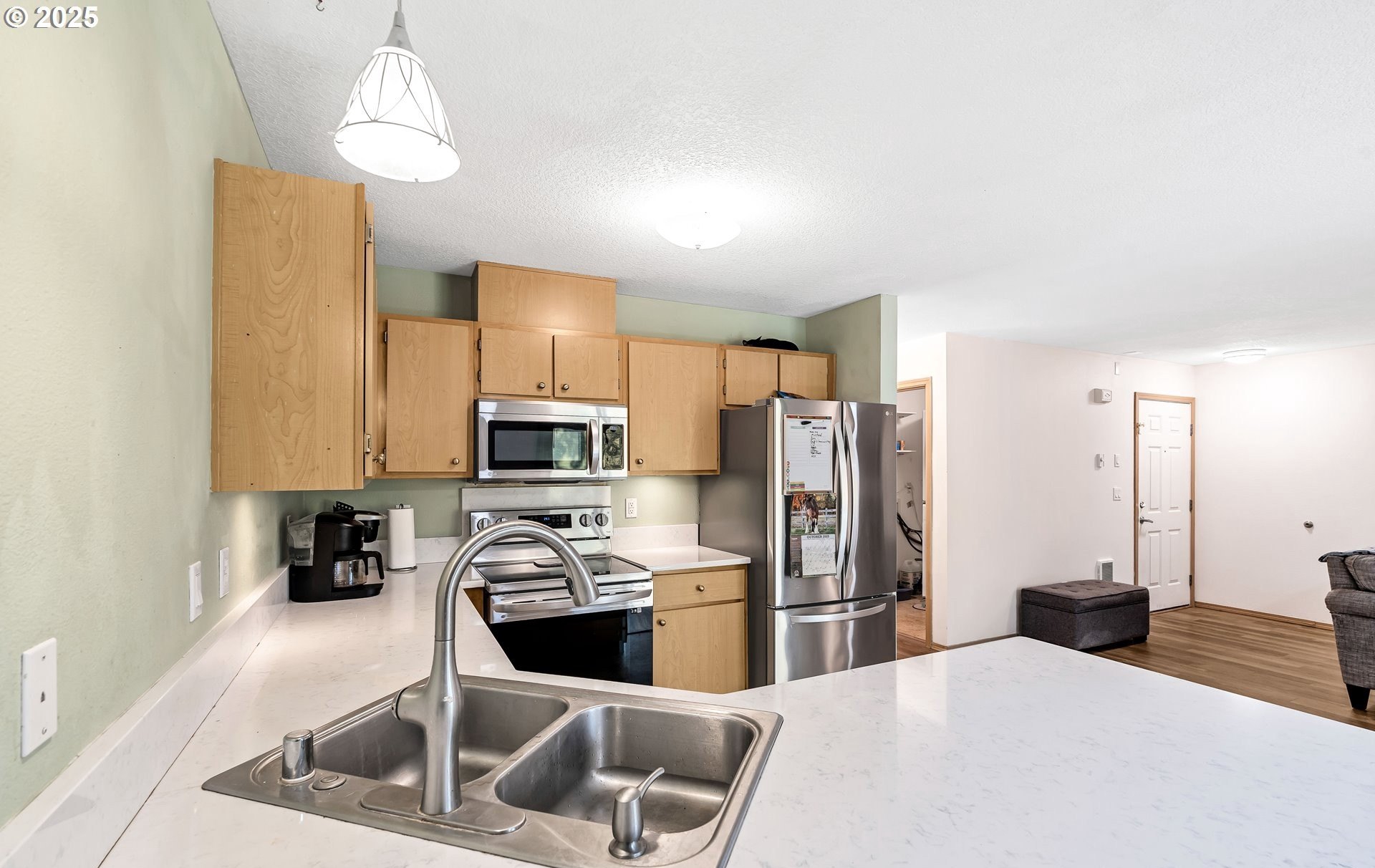 Beautifully maintained condo in excellent condition! Enjoy laminate flooring throughout and a spacious open layout connecting the kitchen, dining, and living areas. Sliding doors from the dining room open to a lovely backyard and large covered patio—perfect for relaxing or entertaining. Features include ceiling fans, a cozy faux fireplace with heat, stacked washer/dryer, refrigerator, stove, and a huge utility room. Covered parking is right outside your door, with plenty of guest parking nearby. Convenient location close to shopping, scenic trails, and Legacy Hospital (just ¼ mile away). HOA covers water, garbage, sewer, and landscaping, with strong reserves and well-kept grounds.