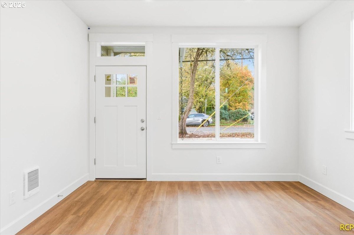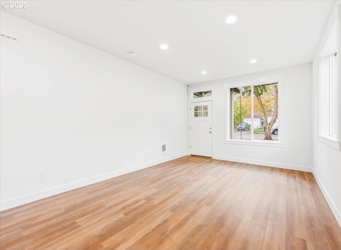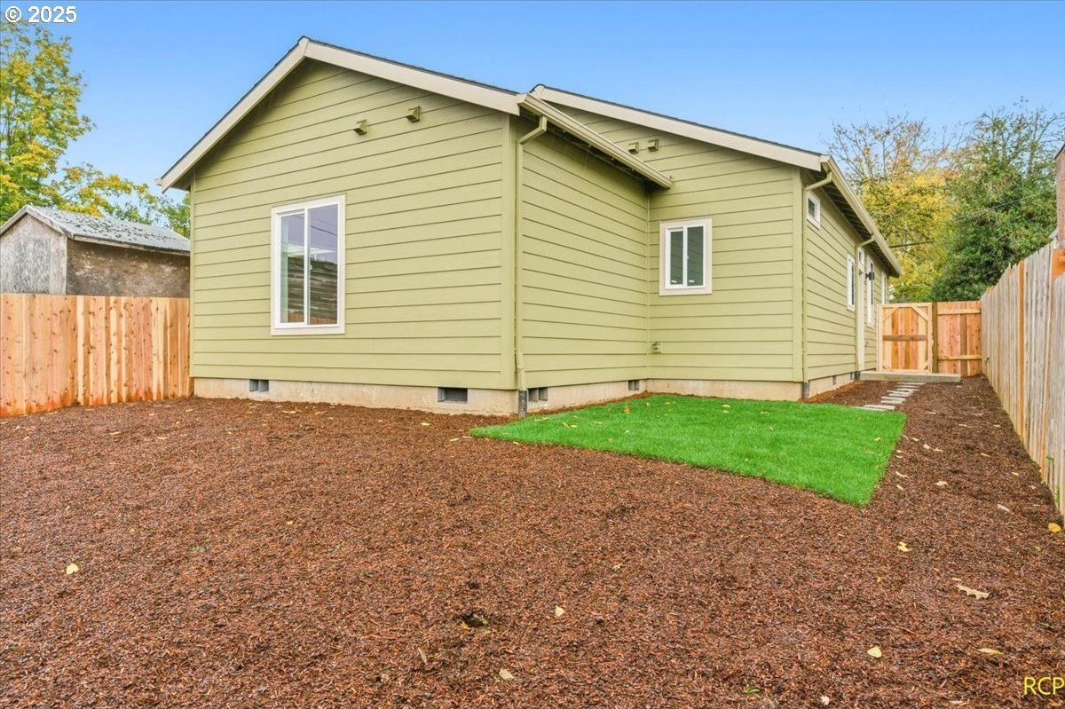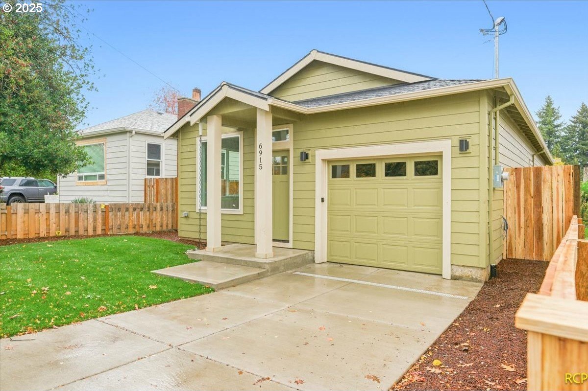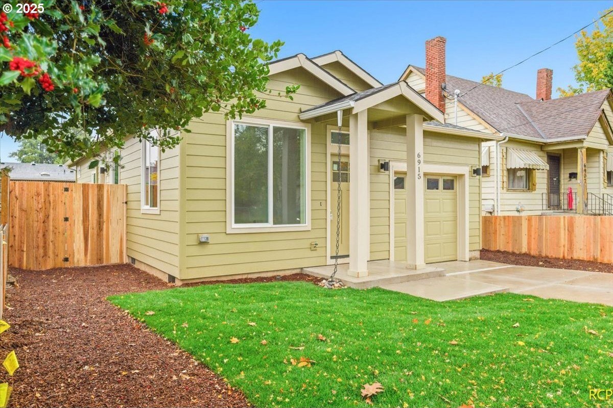 The impossible-to-find—brand-new, single-level ranch with a garage on its own lot in the heart of North Portland! This modern home blends clean, contemporary design with everyday functionality. A bright, open-concept layout connects the kitchen, dining, and living areas. The kitchen features white cabinetry, quartz countertops, stainless steel appliances and designer finishes. Expansive windows and high ceilings flood the home with natural light. Enjoy spacious bedrooms, a luxurious primary suite with a double closet, and a private, fully fenced backyard and professional landscaping. Just blocks from two parks, Roosevelt High School and neighborhood shops and eateries. Eligible for 10-year Property Tax Abatement. This price is subject to the Buyer qualifying for City of Portland SDC Waivers. [Home Energy Score = 8. HES Report at https://rpt.greenbuildingregistry.com/hes/OR10242678]