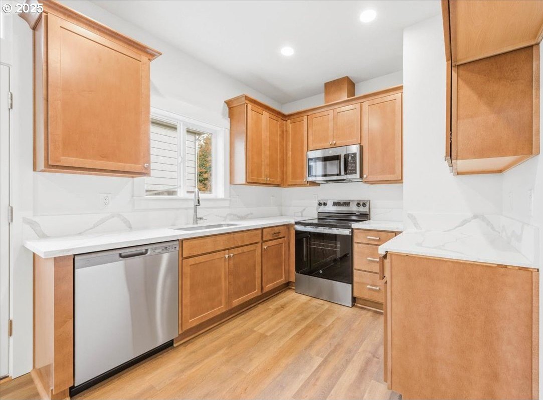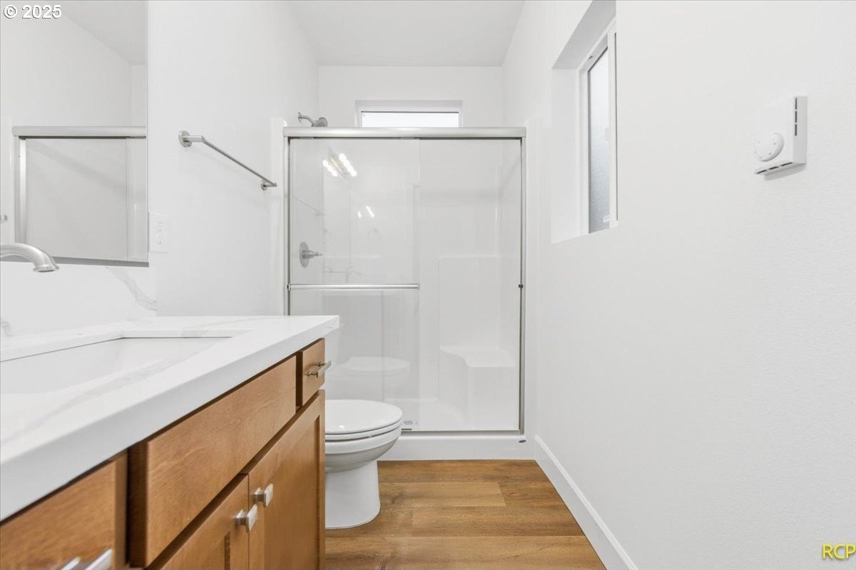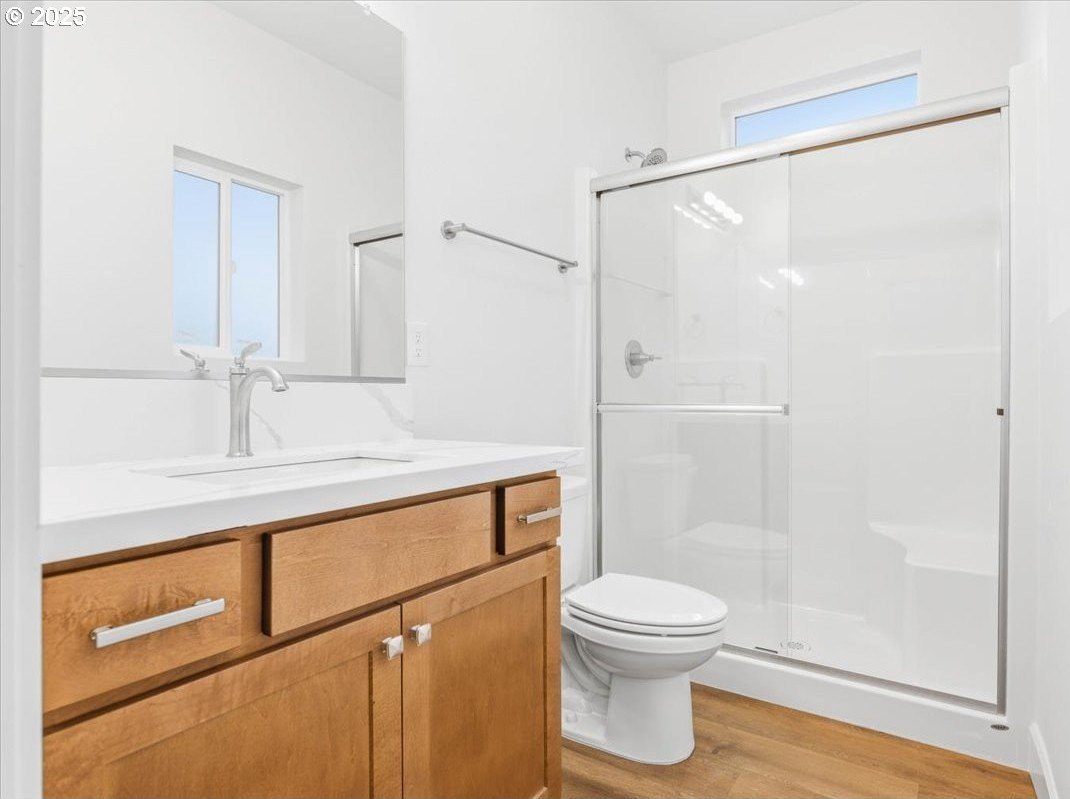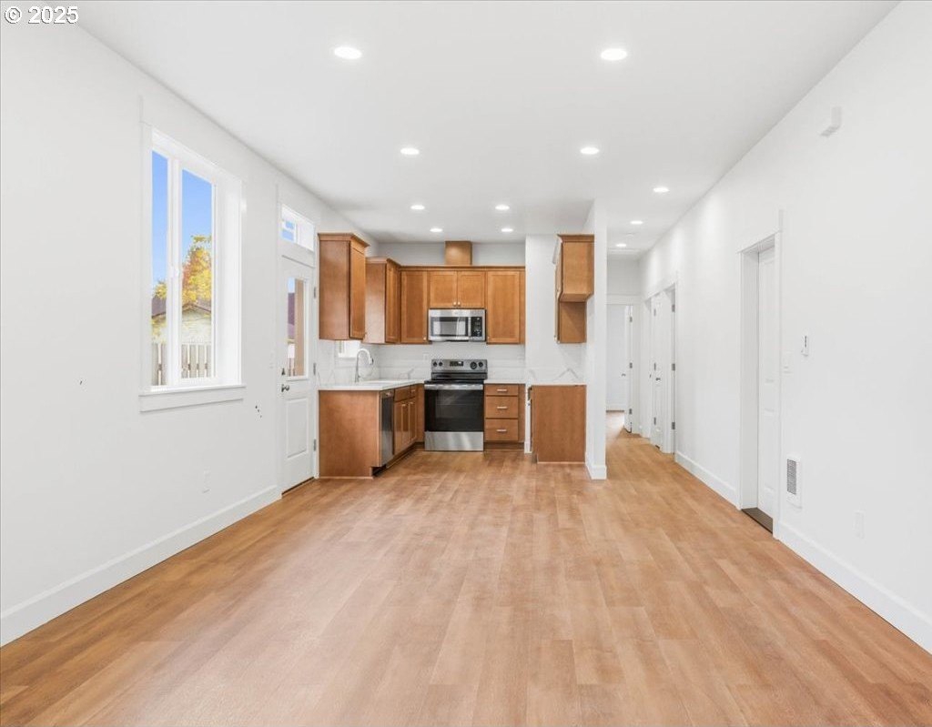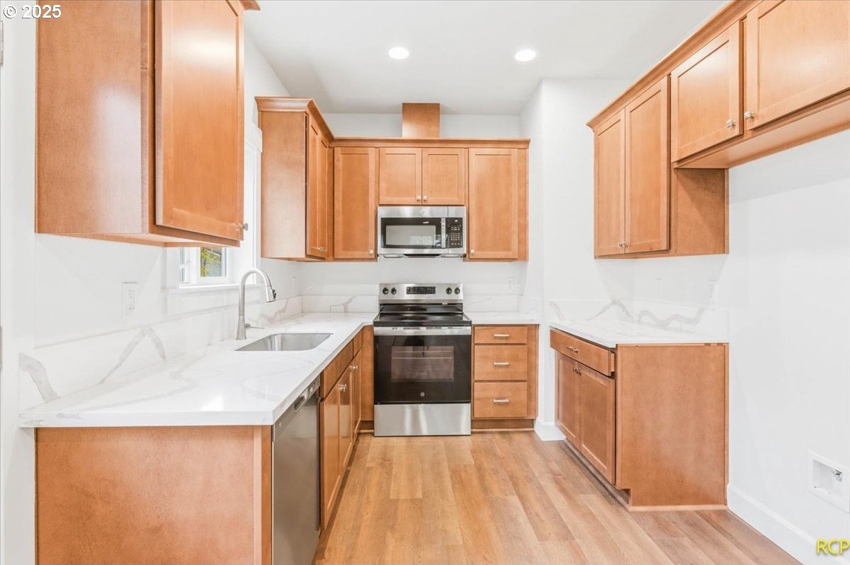 The impossible-to-find—brand-new, single-level ranch with a garage on its own lot in the heart of North Portland! This modern home blends clean, contemporary design with everyday functionality. A bright, open-concept layout connects the kitchen, dining, and living areas. The kitchen features white cabinetry, quartz countertops, stainless steel appliances and designer finishes. Expansive windows and high ceilings flood the home with natural light. Enjoy spacious bedrooms, a luxurious primary suite with a double closet, and a private, fully fenced backyard and professional landscaping. Just blocks from two parks, Roosevelt High School and neighborhood shops and eateries. Eligible for 10-year Property Tax Abatement. This price is subject to the Buyer qualifying for City of Portland SDC Waivers. [Home Energy Score = 8. HES Report at https://rpt.greenbuildingregistry.com/hes/OR10242678]