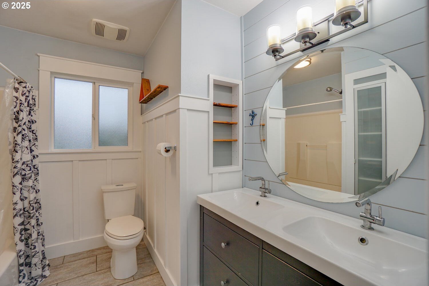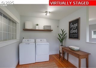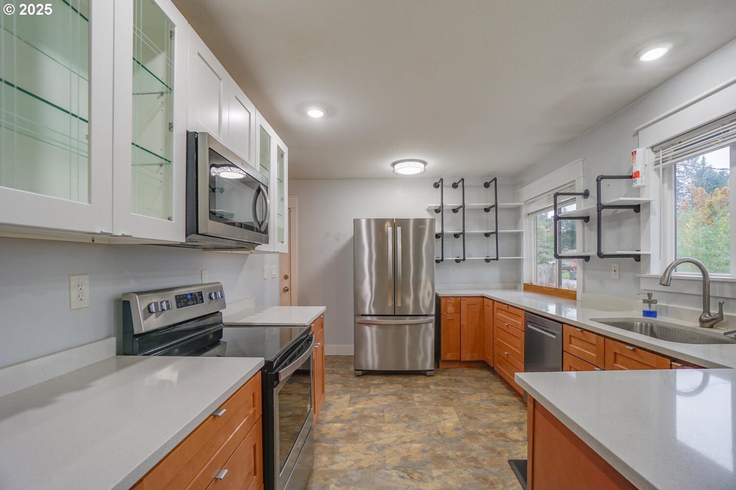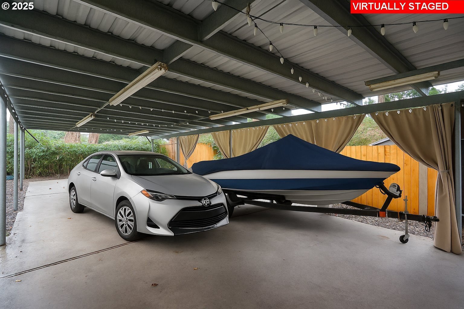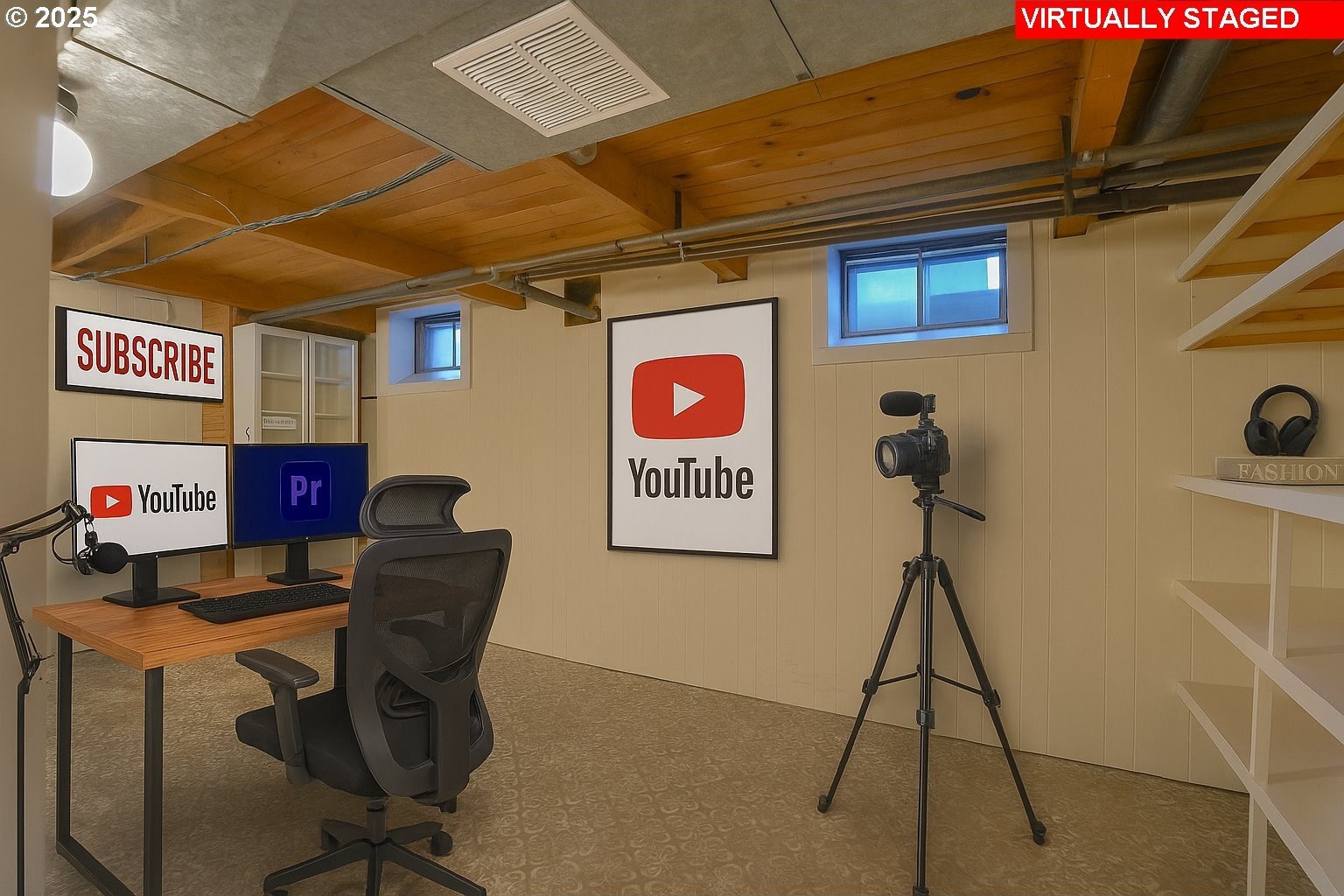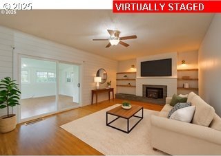 With 2,288 square feet of thoughtfully designed living space, this 3-bedroom, 2-bath home offers warmth, functionality, and a sense of calm from the moment you arrive.Step inside to find gleaming original hardwood floors, large windows that invite natural light, and a welcoming living room centered around a cozy fireplace with insert. The heart of the home is the custom kitchen—featuring quartz countertops, rich wood soft-close cabinetry, and stainless steel appliances, all included. The spacious primary bedroom is located on the main level and features a private ensuite bath with a beautiful custom-tiled walk-in shower.The home is equipped with a forced-air furnace and updated windows for year-round comfort and efficiency.The fully finished basement expands your living options with a second fireplace in the large family room—perfect for movie nights or entertaining guests. A separate den or office provides an ideal space for remote work, creative projects, or even a home library. This versatile lower level is also perfect for YouTube or content creators, offering plenty of room to design your own studio setup or workspace. Abundant storage adds even more functionality to this level.Off the back, a bright and inviting sunroom offers a relaxing space to enjoy morning coffee while overlooking the lush backyard. Sitting on over a quarter acre, the grounds are private, green, and full of character. A whimsical “Hobbit House” storage shed adds both charm and utility. The oversized two-car garage includes a convenient pull-through overhead door leading to a massive 48' x 18' covered patio area—ideal for outdoor dining, entertaining, or covered parking.Nestled in a quiet, established neighborhood, this home feels secluded yet remains close to I-5, shopping, dining, the I-5 Bridge, and PDX—making commuting a breeze. No HOA or CC&Rs, so you can enjoy your property your way.A rare find that perfectly blends mid-century charm, modern upgrades, and unmatched versatility